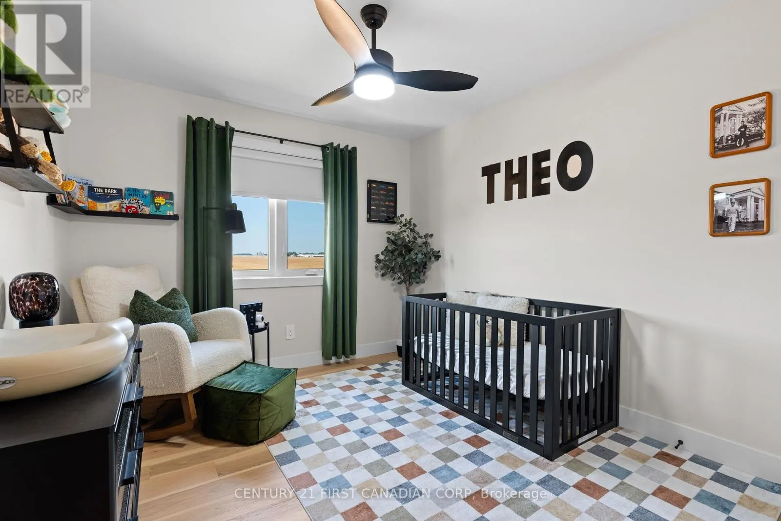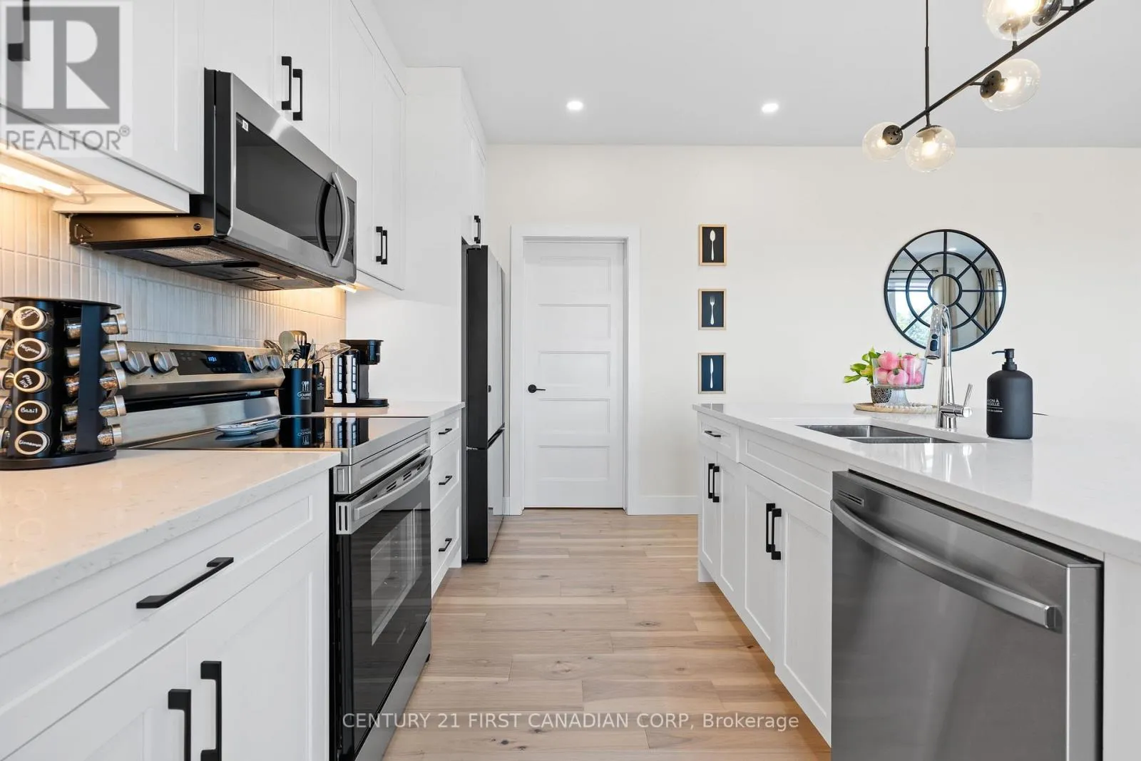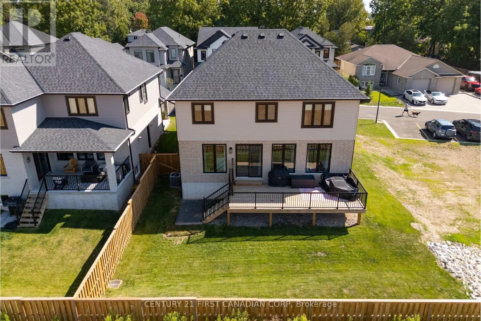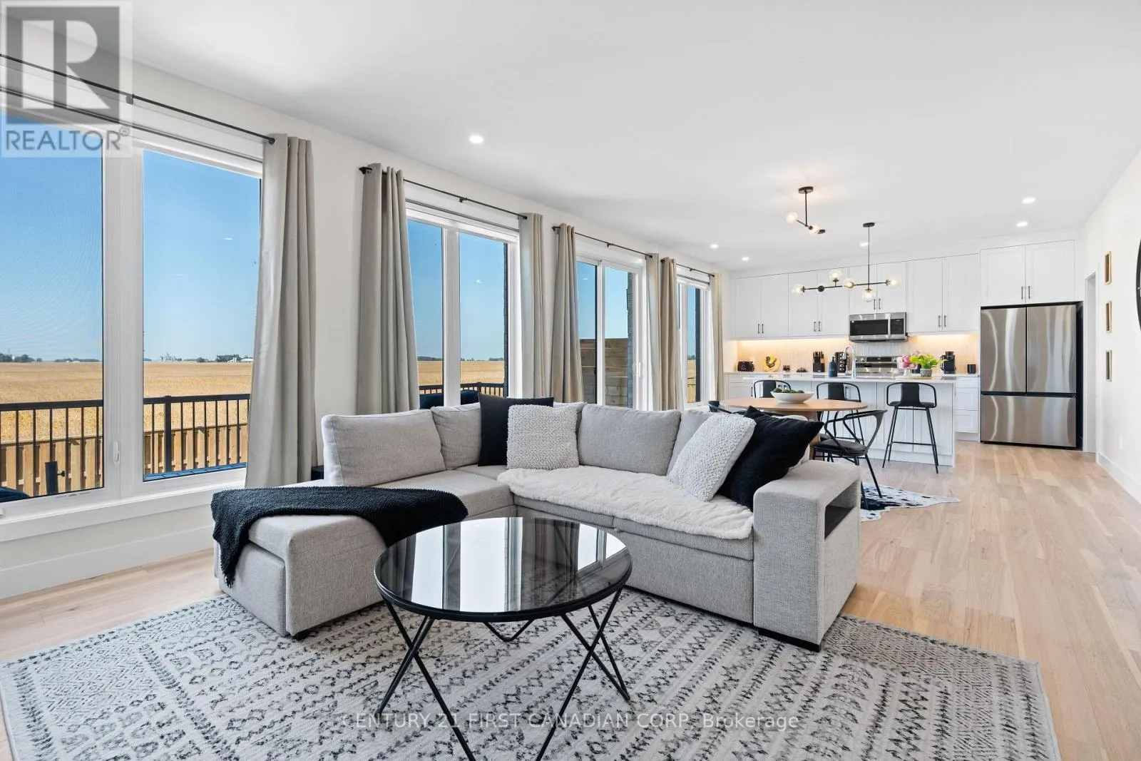 Cross Streets: Granton Line. ** Directions: From Granton Line turn West on Fallon Drive, then turn North into the Condo Complex. Modern living with small-town charm in this detached two-storey home in Granton! Built in 2024, this vacant land condo is perfectly set on a corner lot backing onto open farm fields. With 4 bedrooms and 2.5 bathrooms, this home features a two-car garage and a bright, open-concept design. The main floor is highlighted by a dedicated office, a great room with fireplace, and a dining area that flows into the sleek kitchen with large centre island and walk-in pantry. A two-piece powder room and a mudroom with garage access add convenience. Upstairs, are find four spacious bedrooms, including a primary retreat with walk-in closet and spa-like five-piece en-suite, plus a four-piece bath and a dedicated laundry room. Outside, a deck runs nearly the full width of the home, overlooking a private yard and wide-open views of the fields behind. Granton is a welcoming community just minutes from London and St. Marys, where you can enjoy peaceful living, friendly neighbours, and the charm of small-town life with easy access to city amenities. (id:27476)