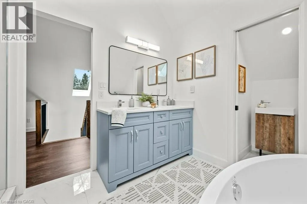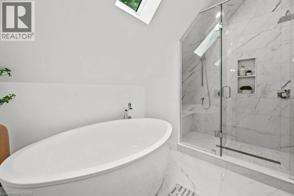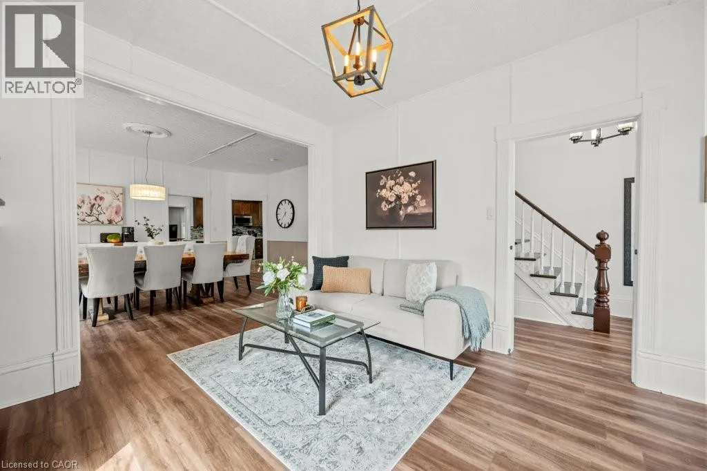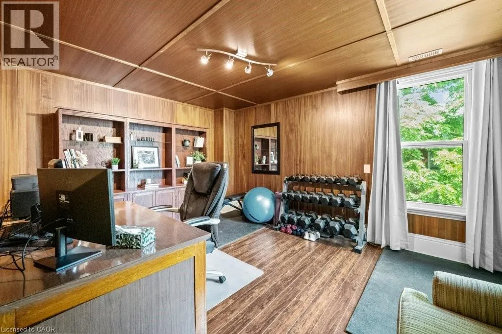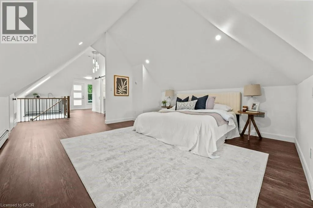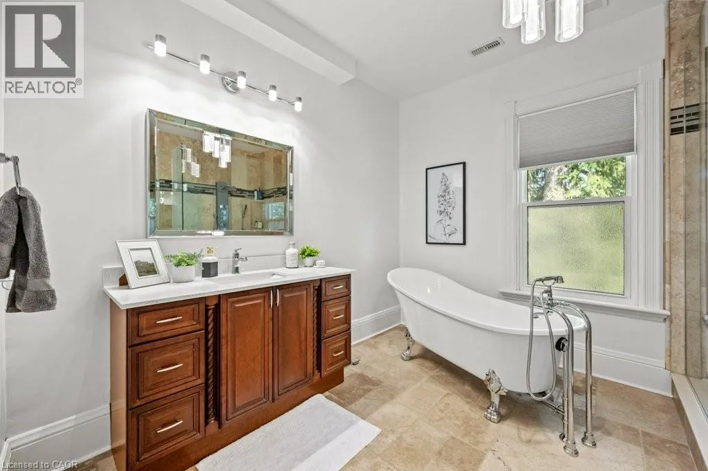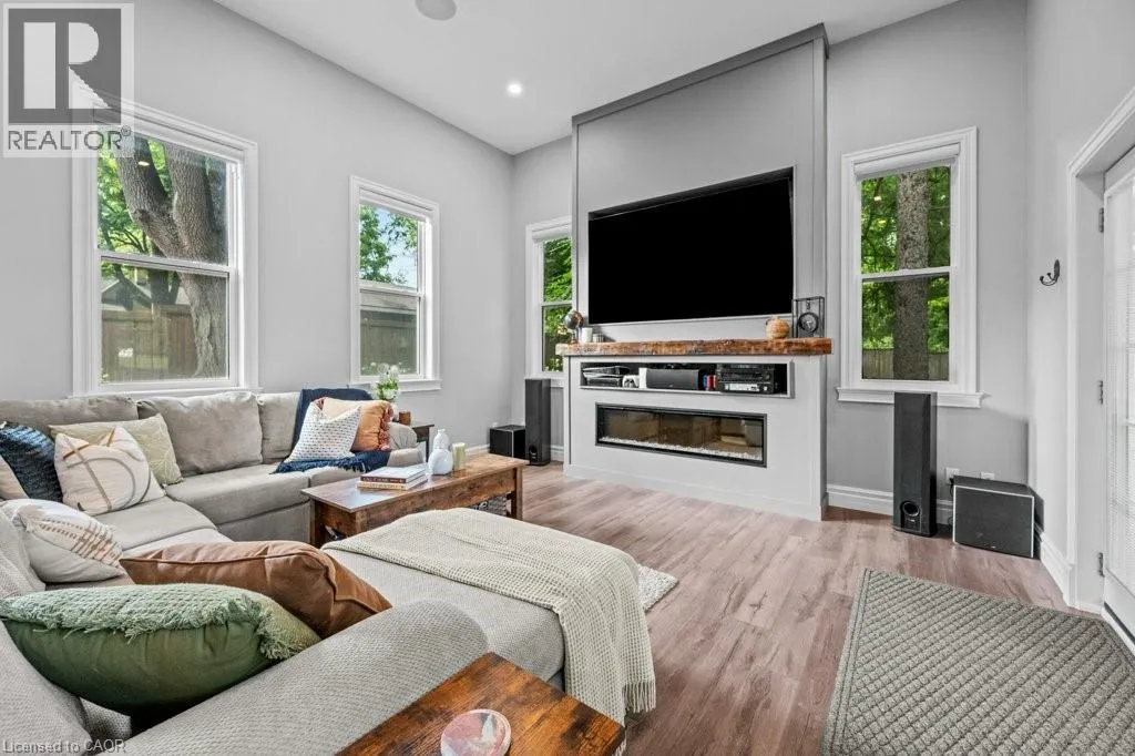 Governors Rd - North onto Lynden Rd village of Lynden. This 4-bed, 4-bath gem tastefully combines classic historic charm w contemporary luxury. It features high ceilings throughout,9.5-ft on the main floor, 12-ft in the family room, and 9-ft on the 2nd floor (except office/bedrm), carpet-free floors incl travertine, porcelain and luxury vinyl plank. Ground level family room equipped w radiant heated floor, auto Smart blinds, surround sound, 82 mounted TV, and a walkout o patio & beyond! Custom kitchen(15/16) w heated floor, high cabinets, Quartz, pendant lights & pantry, and a separate dining room w handy Butler bar. The 2nd floor offers 3 spacious bedrooms, access to the front balcony, a luxurious bathroom w claw-foot tub & glass shower w multi-function panel. Laundry room w a flex space, cabinets, folding area & w/o to rear deck. Oak stairs w wrought iron spindles lead to the skylit &spray-foam-insulated 3rd level primary retreat featuring a wet bar, its own balcony, reading nook, W/I closet and a sliding barn door to a 7-pceensuite w skylight, heated floor, water closet, slipper tub, double sink vanity & a double shower! The exterior boasts a 6-cardriveway('23),concrete walkway & porch('21/'22), a fully fenced stunning rock landscaped yard('23) appointed with a gazebo, gas BBQ hookup, firepit, 3 sheds including a 20'x12' bunkie/workshop, and a 17' year-round Swim Spa(23)! Modern conveniences include city water, natural gas, electrical service panel w 220-amp('23), Smart Home Features ie. thermostats, switches, locks & more, BellFibe Network, central A/C(23), and C/VAC throughout the home. Other features & updates include stained glass, transom windows, exterior doors, gutter guards('23), re-shingled roof('21), windows(2018/19), and complete re-plumbing & re-wiring (2016-2024). This home truly combines historic elegance with contemporary amenities. (id:27476)