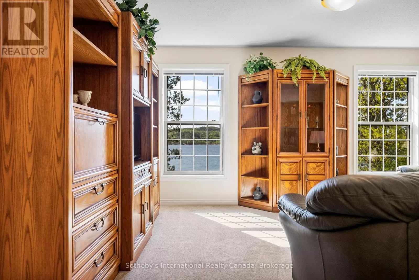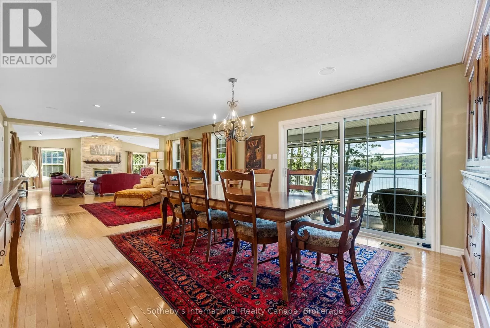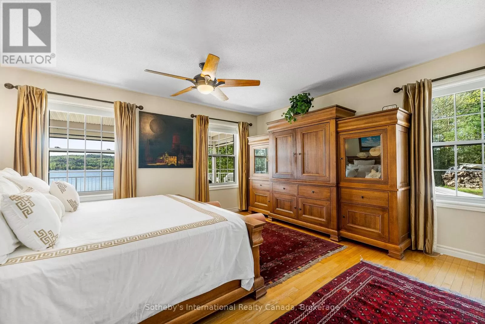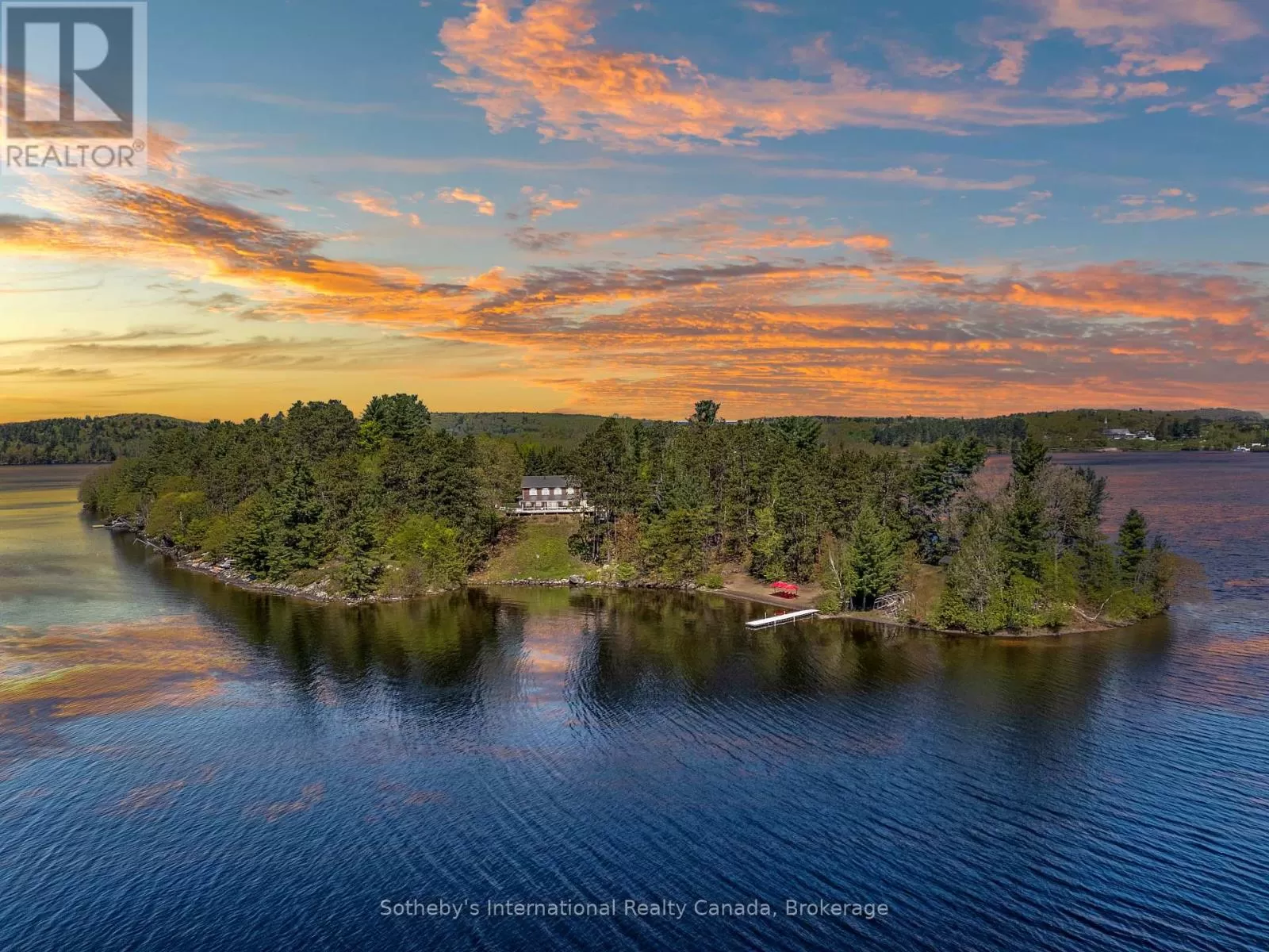 Cross Streets: Mask Island Dr & Lakeshore Dr. ** Directions: Lakeshore Dr. To Mask Island Dr. Accessed year-round via a privately maintained road! Positioned on a private peninsula with nearly 1,100 feet of pristine shoreline and just under 3 acres of land, this executive lakeside retreat offers a rare combination of seclusion, space, and timeless design on Kamaniskeg Lake. With southern exposure, enjoy all-day sun, which is ideal for lakeside entertaining, swimming, and relaxing in total privacy. The stately two-storey brick home is thoughtfully designed for elevated living. The main level features a chef-inspired custom kitchen outfitted with luxury granite countertops, built-in appliances, and extensive custom cabinetry. The kitchen features a six-burner gas range with grill and two gas ovens, topped by a high-capacity dual-motor range hood and complemented by a pot filler faucet, and much more! The open concept kitchen, dining and living area offers expansive lake views and walkout access to a large deck, complete with Phantom retractable screens providing a comfortable space for evening cocktails and chats. A fireplace insert anchors the main living space, adding comfort and ambiance year-round. The main-floor primary suite includes a large ensuite and generous layout with lake views. Upstairs offers four spacious bedrooms, a four-piece bath, a second living area, and a cozy reading nook perfect for guests or extended family. The walkout basement is partially above grade and tailored for both relaxation and recreation, featuring an exercise room with outside access to a stone patio, a moody, ambient entertainment space with a wet bar and woodstove, and a dedicated wood room. Two detached double garages provide versatile space for vehicles, recreational gear, or workshop needs. A rare offering with unmatched privacy, sunshine, and waterfront, ideal as an executive escape or forever lakeside estate. 5 minutes to all amenities, including a hospital. Ask your Realtor for a full list of features today! (id:27476)