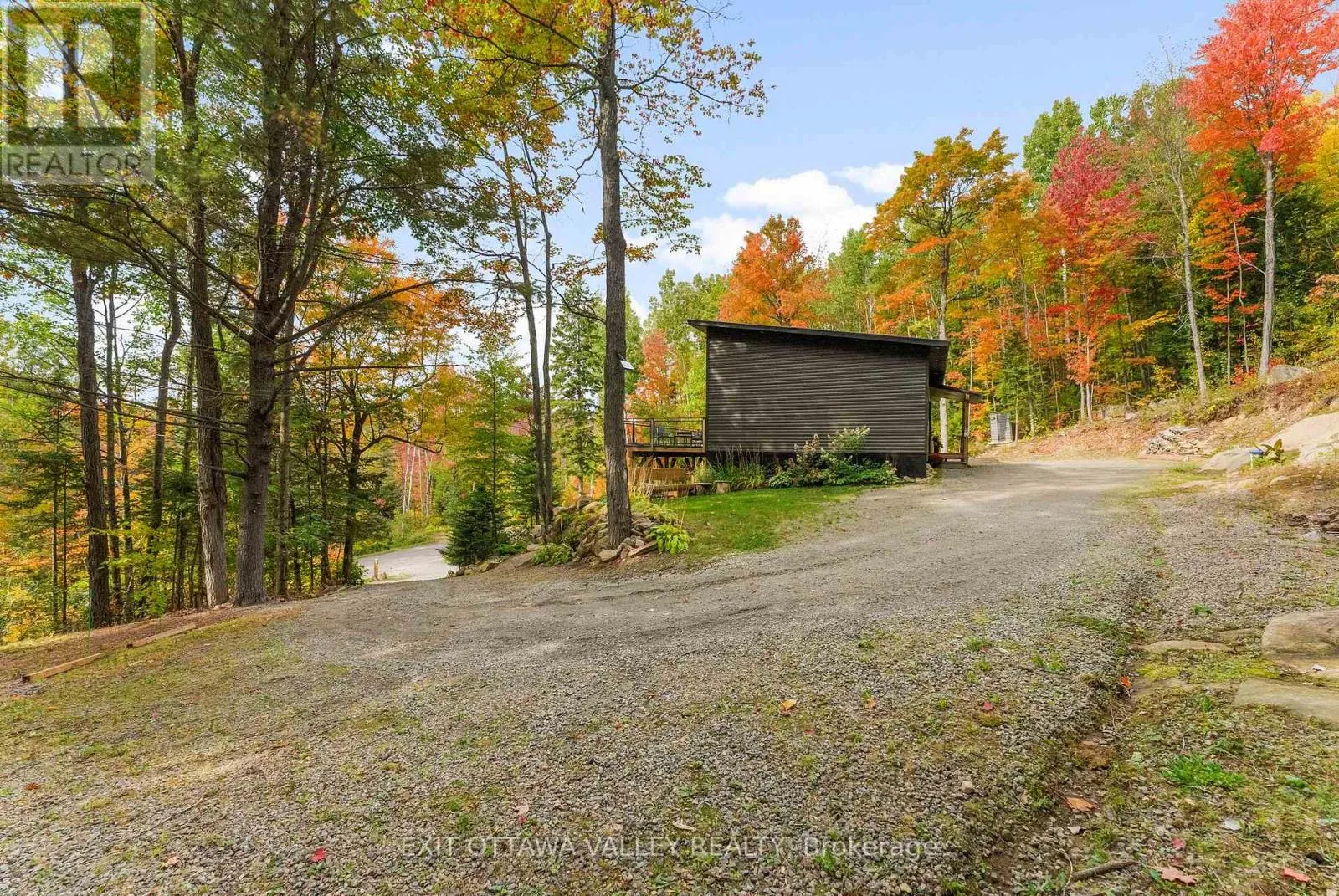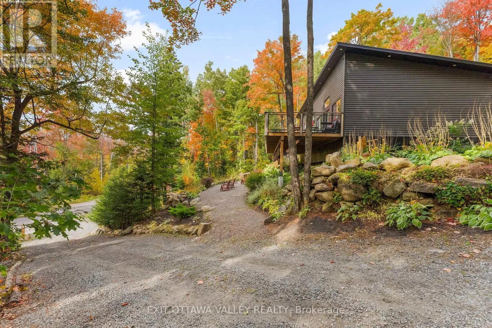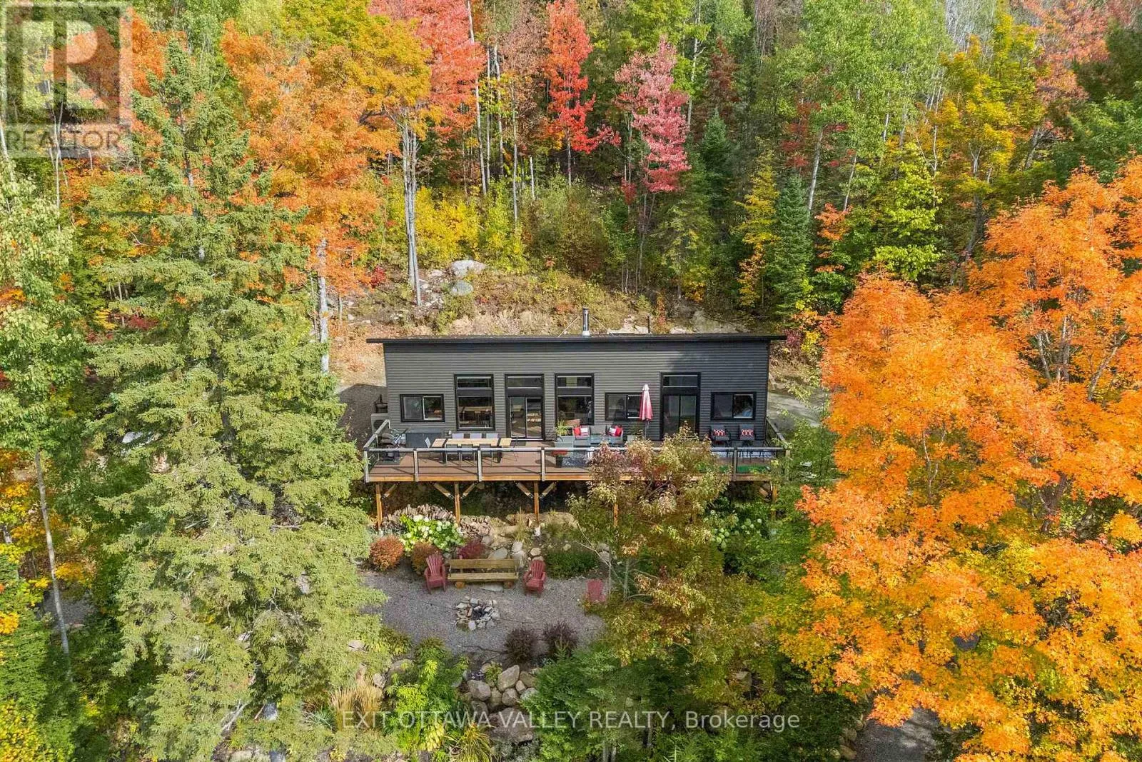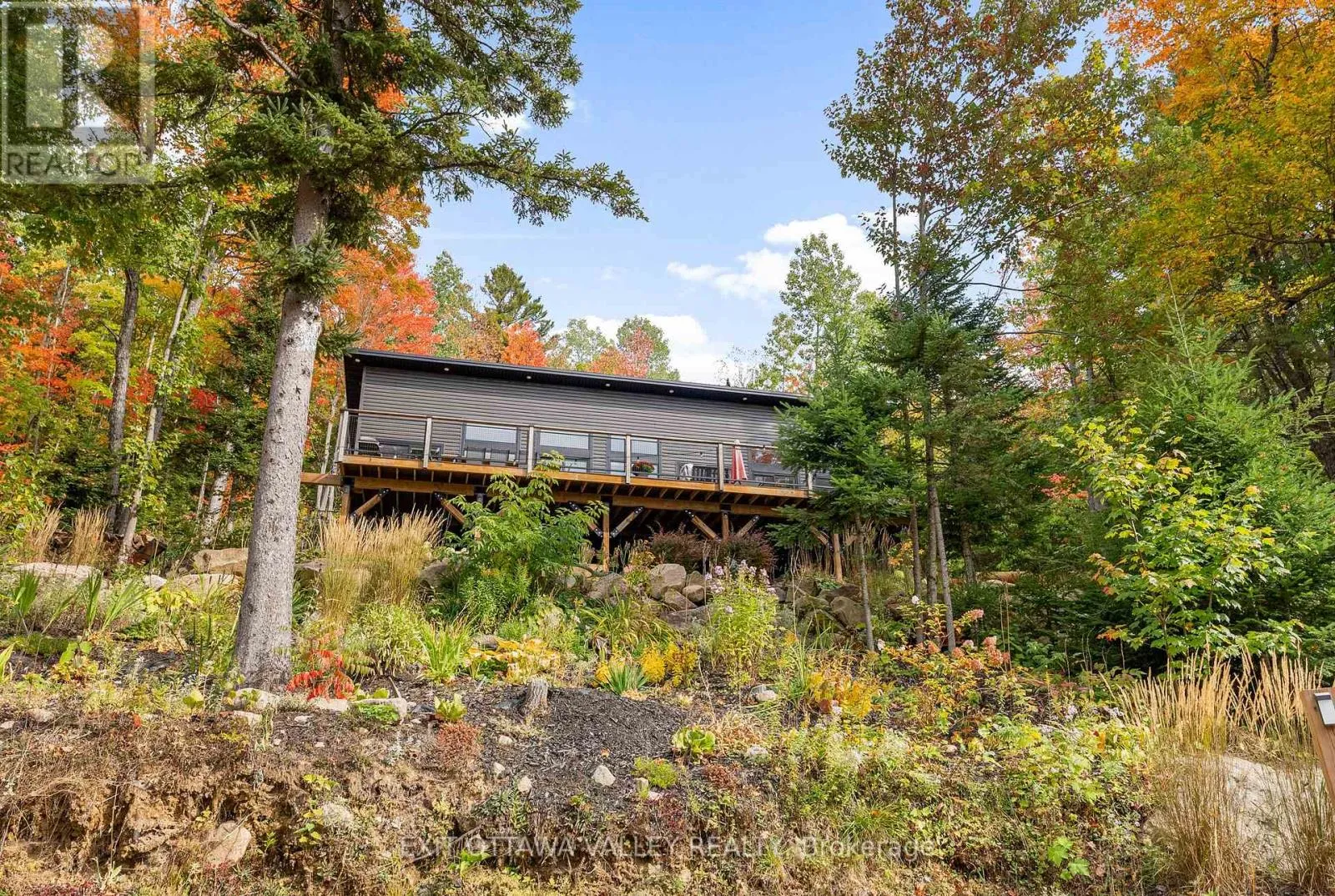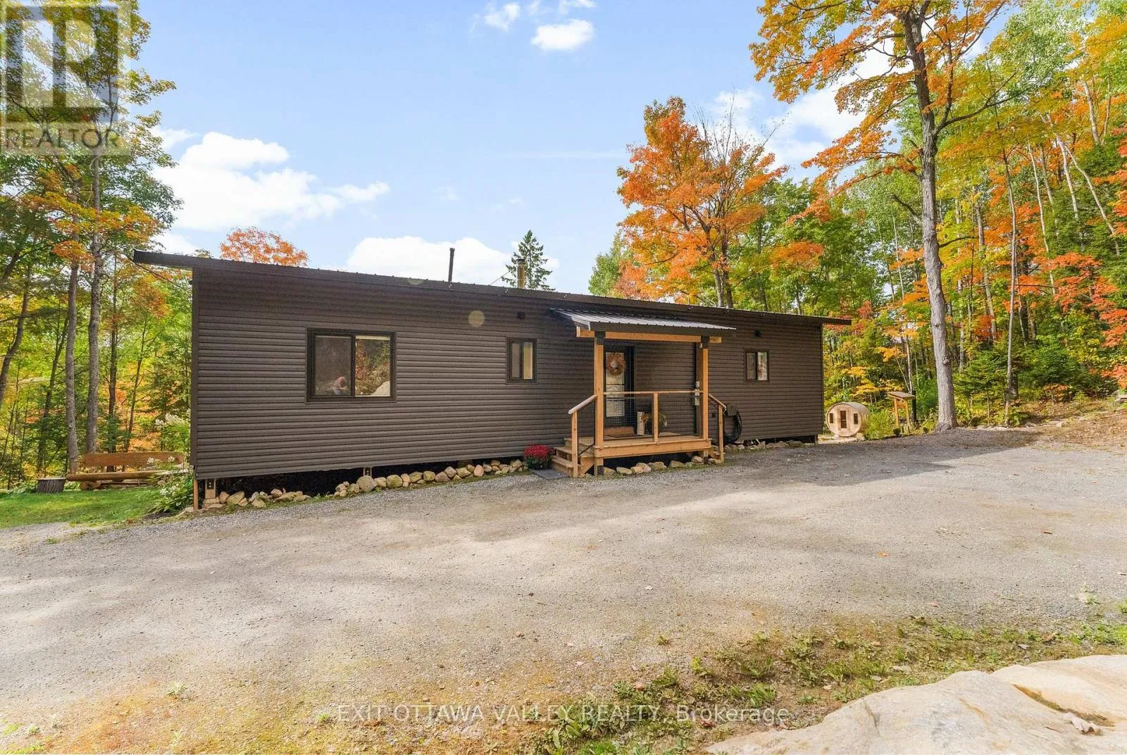 Cross Streets: Hopefield Road. ** Directions: From Hwy 60 in Wilno, Turn onto Wilno South road. In 5.4 km turn left onto Opeongo road. In 850 m, Turn right into Hopefield road. Property is on left in 2.2 km. Welcome to Maple Ridge. Built in 2021, this extraordinary hilltop retreat is the perfect blend of modern luxury and rustic charm. From the moment you arrive, the craftsmanship and attention to detail are impossible to miss. Every inch of this home is thoughtfully designed for both relaxation and style. Step onto the expansive 700 sq/ft deck and soak in the treetop views. Set on nearly 2 private acres, the property is surrounded by nature and offers complete privacy with no close neighbors-your own secluded escape. Inside, the home impresses with 12-foot ceilings, expansive windows, and an airy open layout that fills every room with natural light. Quartz countertops, a deep soaker tub, and sleek finishes bring a modern edge, while the warm textures and WETT-certified fireplace create the inviting, cozy atmosphere of a true retreat. Designed for four-season enjoyment, the outdoor spaces are equally exceptional. Unwind in the new sauna (2024) or hot tub (2025), refresh in the outdoor shower, or gather around the firepit under a canopy of stars. When summer calls, enjoy sandy beaches just five minutes away. A private trail winds through the property, leading to your own lookout with breathtaking views of the rolling hills. Practicality meets beauty with a low-maintenance metal roof, composite deck with metal railings, and a cleared space ready for a future garage. Oversized windows are fitted with fire-resistant, remote-controlled blackout blinds, while a full security system and interconnected smoke alarms provide peace of mind. Thoughtful landscaping enhances the natural surroundings and adds undeniable curb appeal. Currently an Airbnb favorite with a flawless 5-star rating, this property is where sleek, modern design meets the warmth of rustic living. A rare find whether you're seeking a private retreat, a turn-key investment, or both. (id:27476)