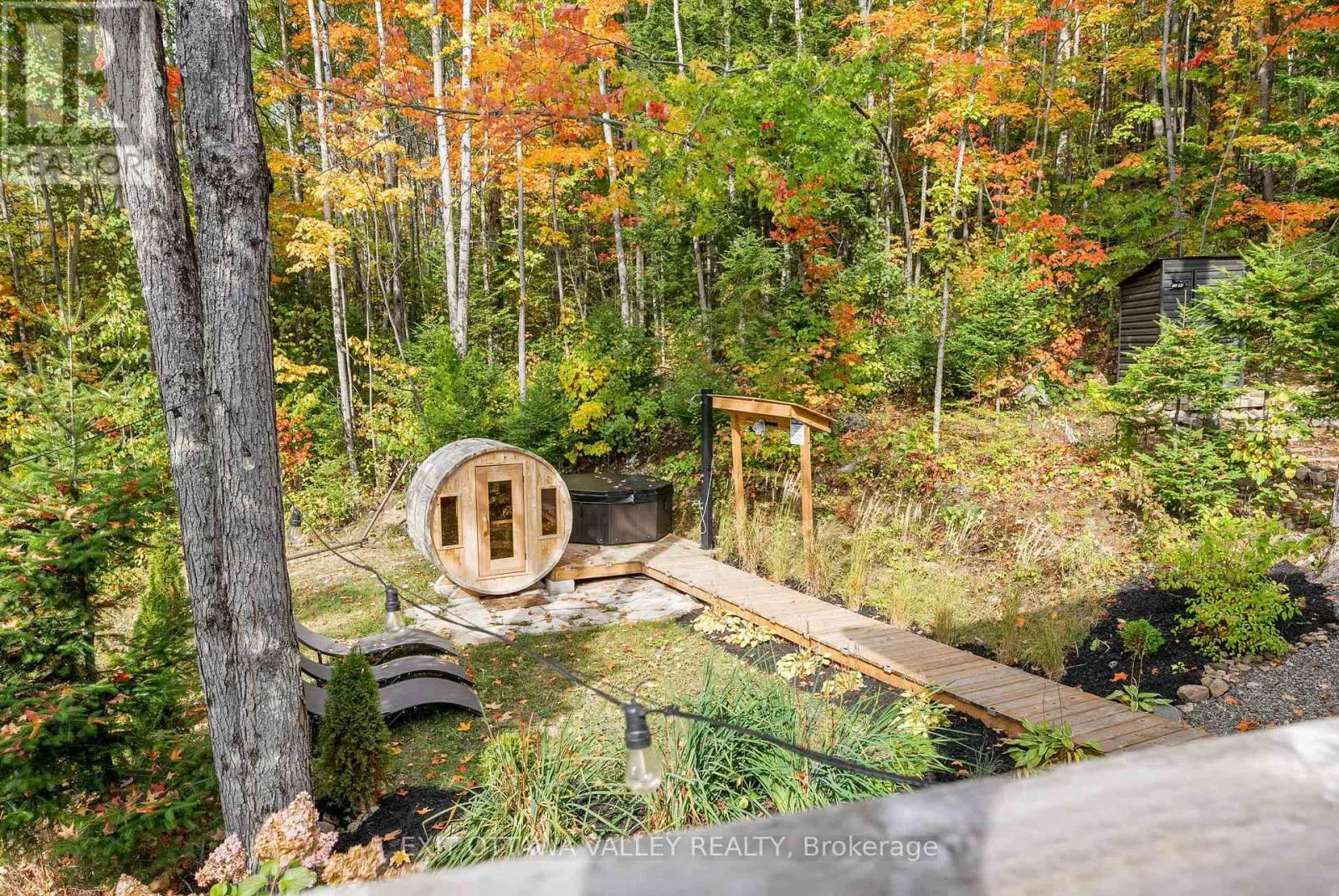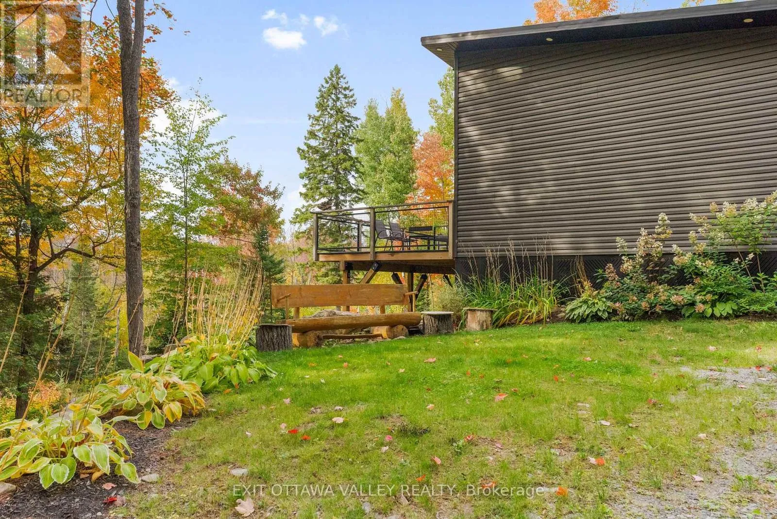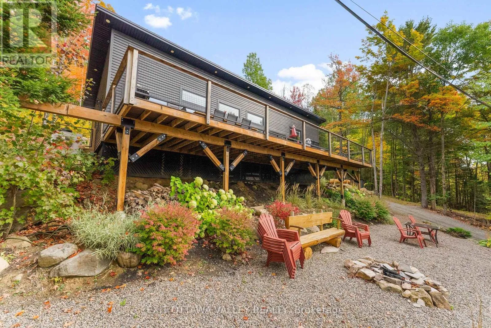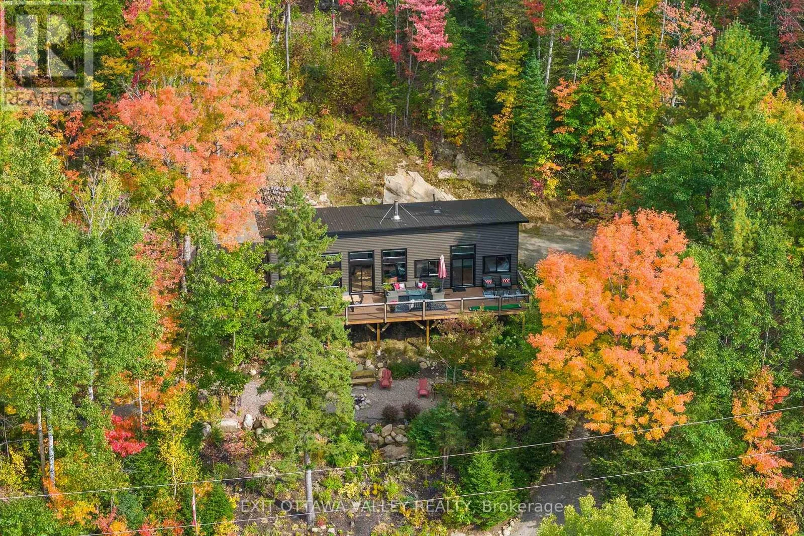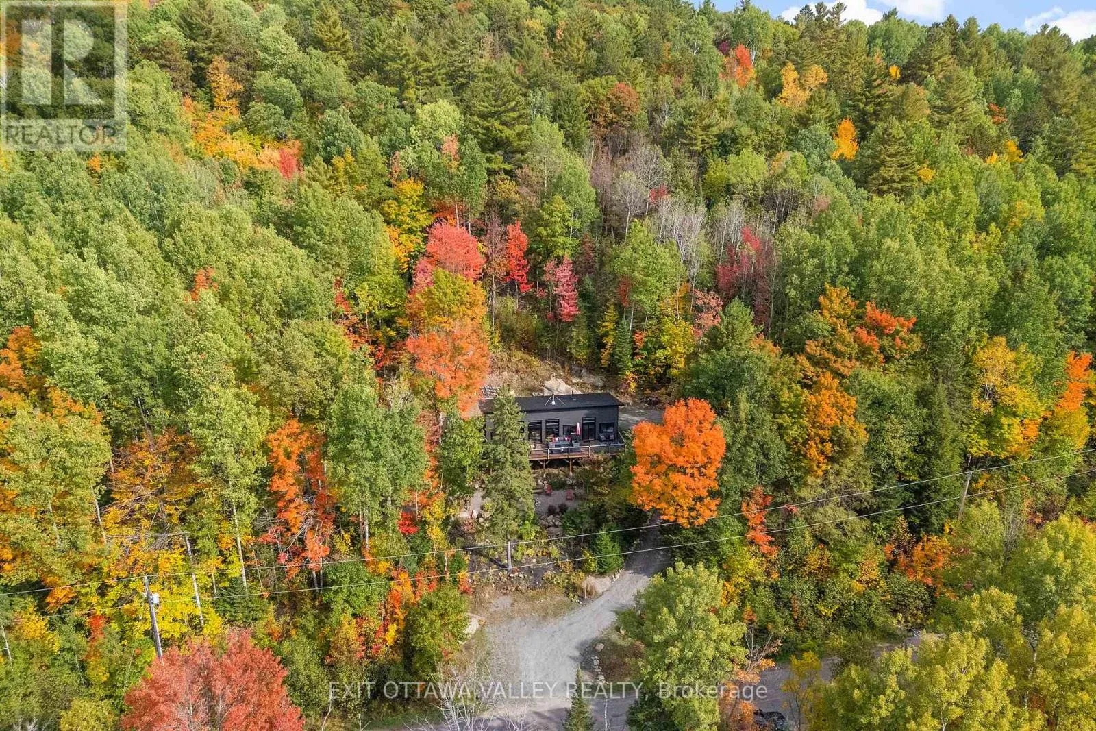 Cross Streets: Hopefield Road. ** Directions: From Hwy 60 in Wilno, Turn onto Wilno South road. In 5.4 km turn left onto Opeongo road. In 850 m, Turn right into Hopefield road. Property is on left in 2.2 km. Welcome to Maple Ridge. Built in 2021, this extraordinary hilltop retreat is the perfect blend of modern luxury and rustic charm. From the moment you arrive, the craftsmanship and attention to detail are impossible to miss. Every inch of this home is thoughtfully designed for both relaxation and style. Step onto the expansive 700 sq/ft deck and soak in the treetop views. Set on nearly 2 private acres, the property is surrounded by nature and offers complete privacy with no close neighbors-your own secluded escape. Inside, the home impresses with 12-foot ceilings, expansive windows, and an airy open layout that fills every room with natural light. Quartz countertops, a deep soaker tub, and sleek finishes bring a modern edge, while the warm textures and WETT-certified fireplace create the inviting, cozy atmosphere of a true retreat. Designed for four-season enjoyment, the outdoor spaces are equally exceptional. Unwind in the new sauna (2024) or hot tub (2025), refresh in the outdoor shower, or gather around the firepit under a canopy of stars. When summer calls, enjoy sandy beaches just five minutes away. A private trail winds through the property, leading to your own lookout with breathtaking views of the rolling hills. Practicality meets beauty with a low-maintenance metal roof, composite deck with metal railings, and a cleared space ready for a future garage. Oversized windows are fitted with fire-resistant, remote-controlled blackout blinds, while a full security system and interconnected smoke alarms provide peace of mind. Thoughtful landscaping enhances the natural surroundings and adds undeniable curb appeal. Currently an Airbnb favorite with a flawless 5-star rating, this property is where sleek, modern design meets the warmth of rustic living. A rare find whether you're seeking a private retreat, a turn-key investment, or both. (id:27476)