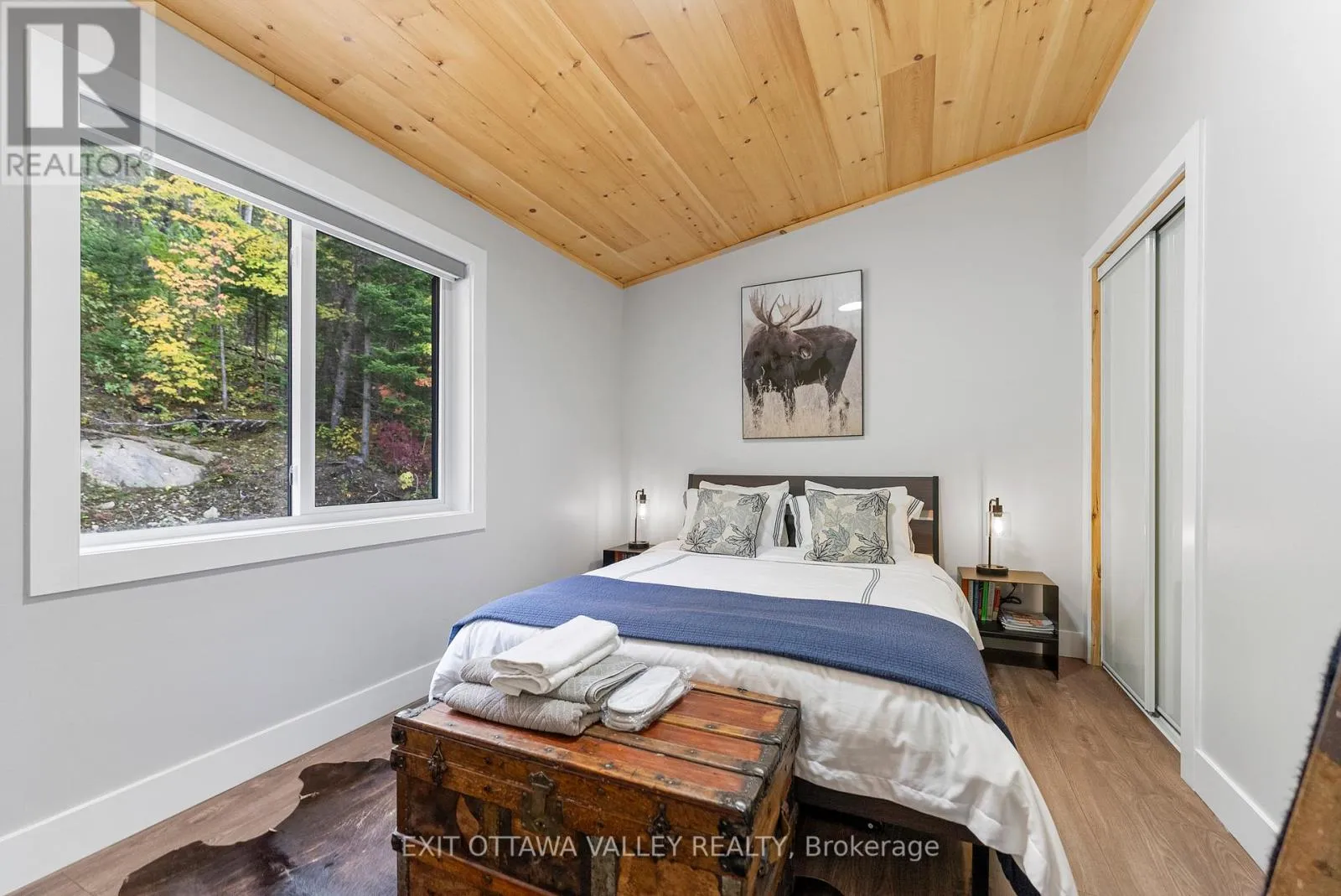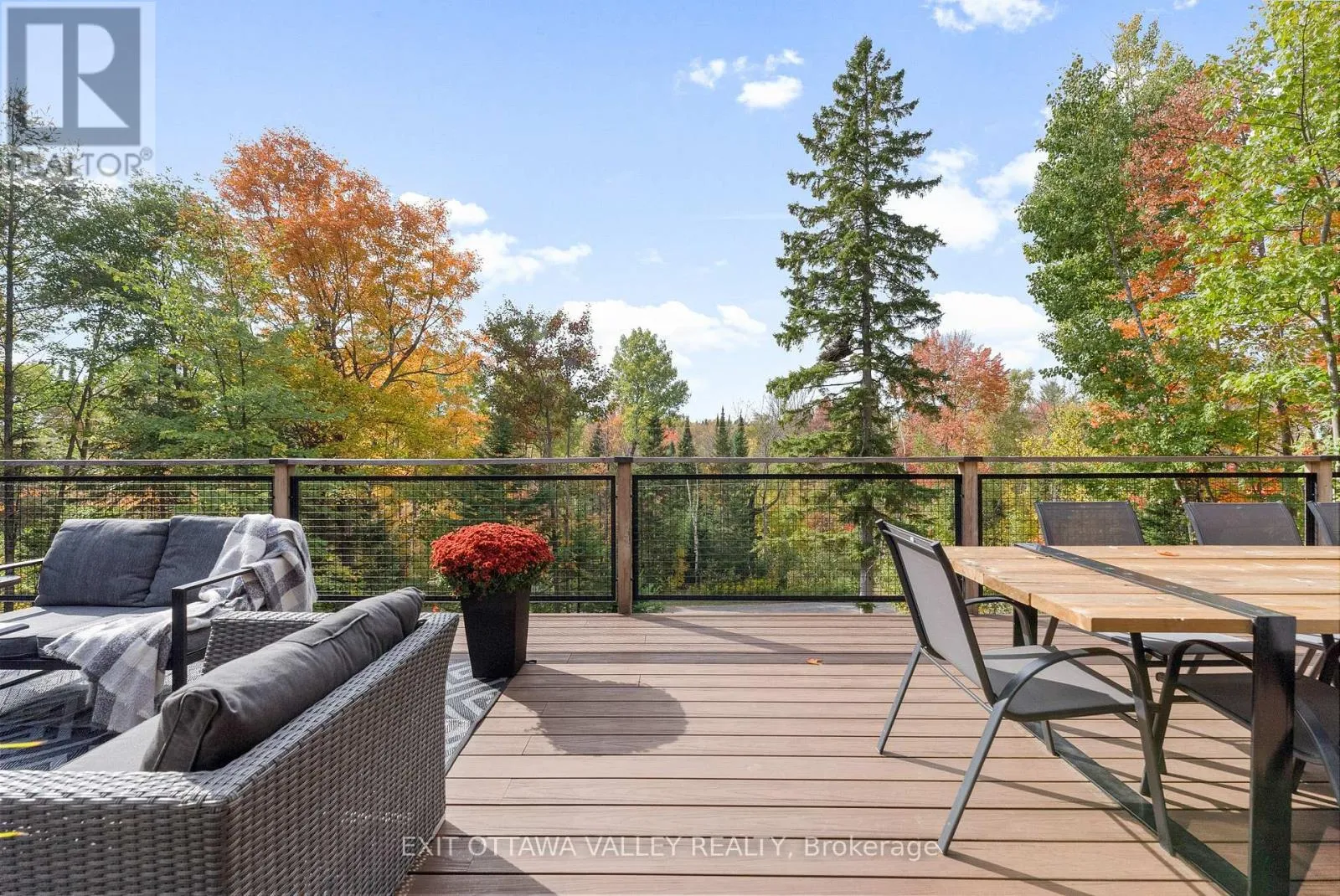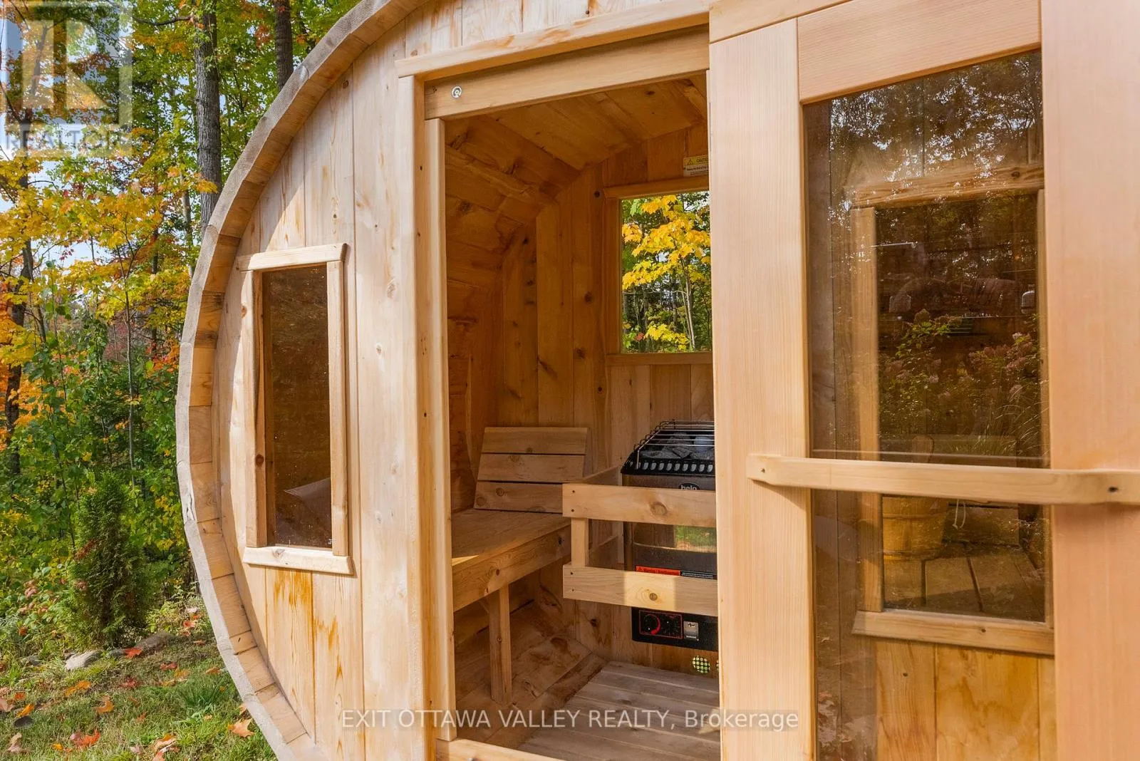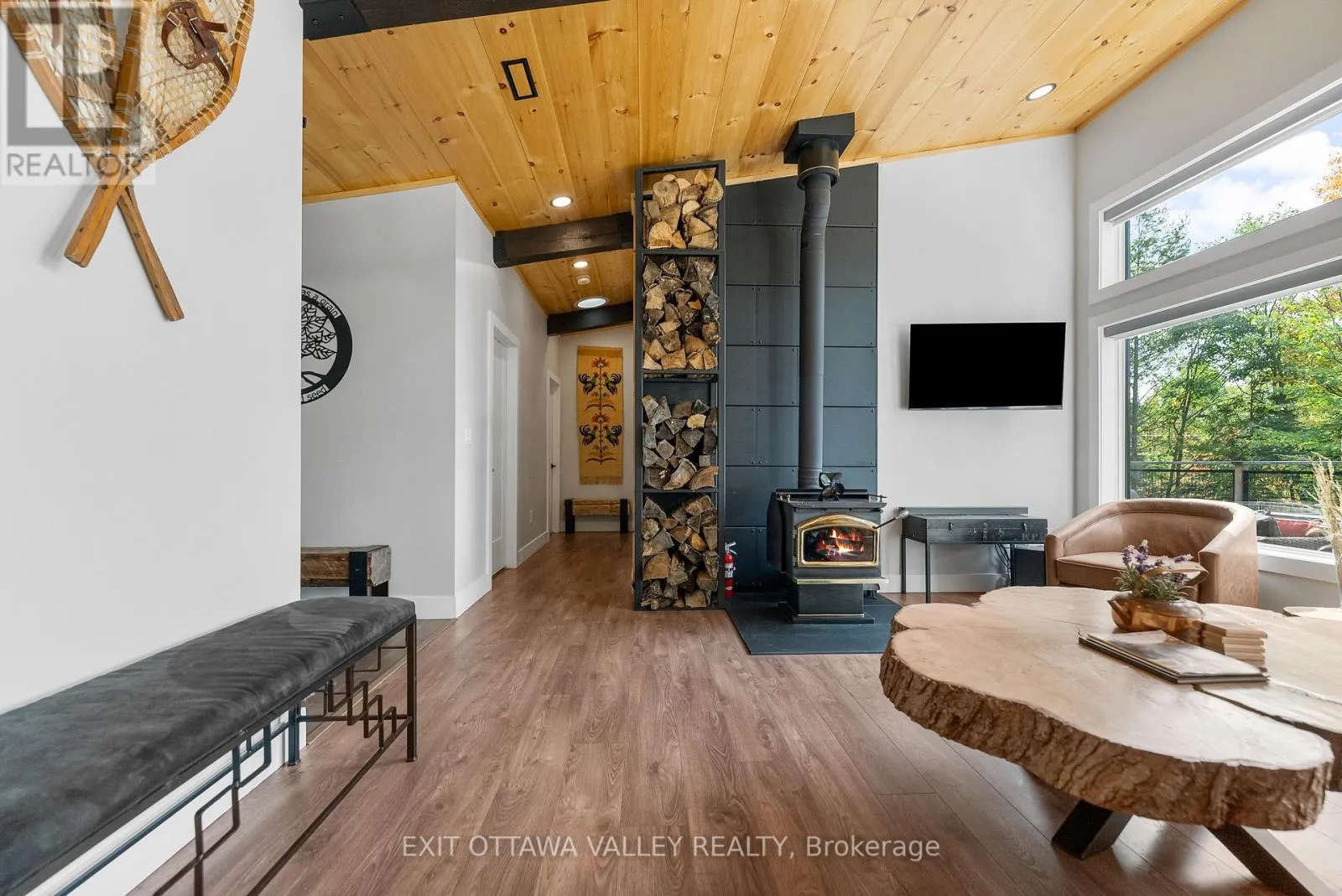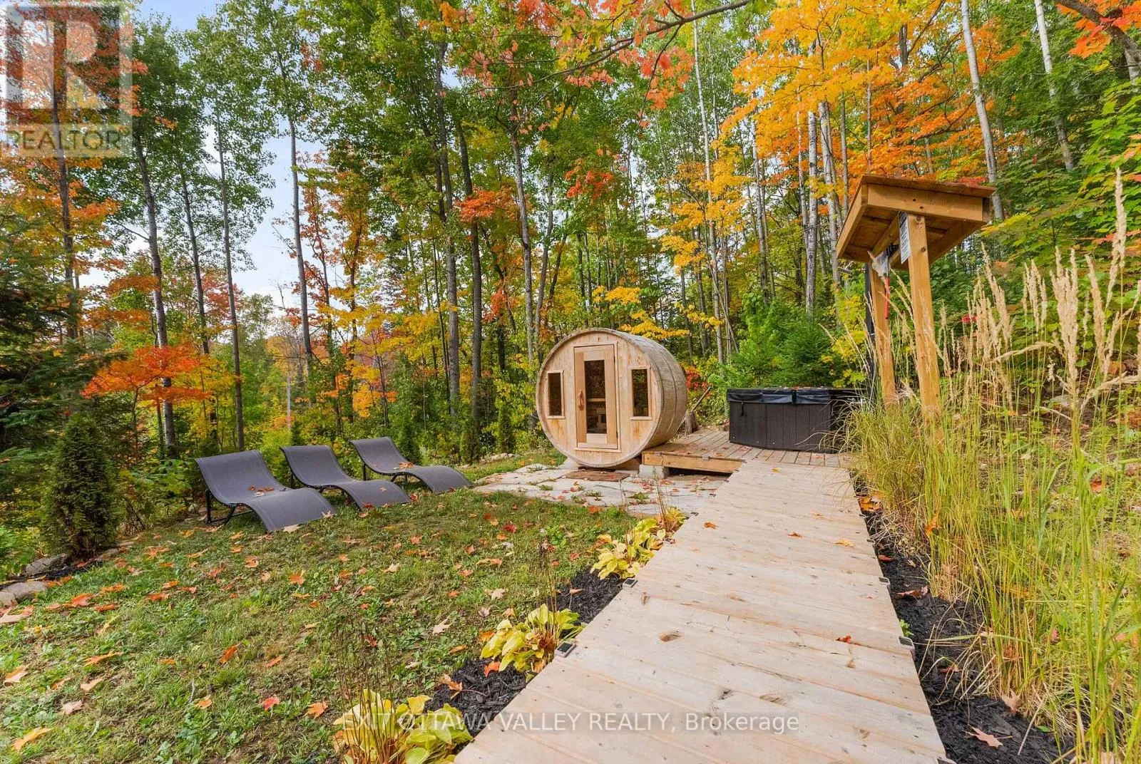 Cross Streets: Hopefield Road. ** Directions: From Hwy 60 in Wilno, Turn onto Wilno South road. In 5.4 km turn left onto Opeongo road. In 850 m, Turn right into Hopefield road. Property is on left in 2.2 km. Welcome to Maple Ridge. Built in 2021, this extraordinary hilltop retreat is the perfect blend of modern luxury and rustic charm. From the moment you arrive, the craftsmanship and attention to detail are impossible to miss. Every inch of this home is thoughtfully designed for both relaxation and style. Step onto the expansive 700 sq/ft deck and soak in the treetop views. Set on nearly 2 private acres, the property is surrounded by nature and offers complete privacy with no close neighbors-your own secluded escape. Inside, the home impresses with 12-foot ceilings, expansive windows, and an airy open layout that fills every room with natural light. Quartz countertops, a deep soaker tub, and sleek finishes bring a modern edge, while the warm textures and WETT-certified fireplace create the inviting, cozy atmosphere of a true retreat. Designed for four-season enjoyment, the outdoor spaces are equally exceptional. Unwind in the new sauna (2024) or hot tub (2025), refresh in the outdoor shower, or gather around the firepit under a canopy of stars. When summer calls, enjoy sandy beaches just five minutes away. A private trail winds through the property, leading to your own lookout with breathtaking views of the rolling hills. Practicality meets beauty with a low-maintenance metal roof, composite deck with metal railings, and a cleared space ready for a future garage. Oversized windows are fitted with fire-resistant, remote-controlled blackout blinds, while a full security system and interconnected smoke alarms provide peace of mind. Thoughtful landscaping enhances the natural surroundings and adds undeniable curb appeal. Currently an Airbnb favorite with a flawless 5-star rating, this property is where sleek, modern design meets the warmth of rustic living. A rare find whether you're seeking a private retreat, a turn-key investment, or both. (id:27476)