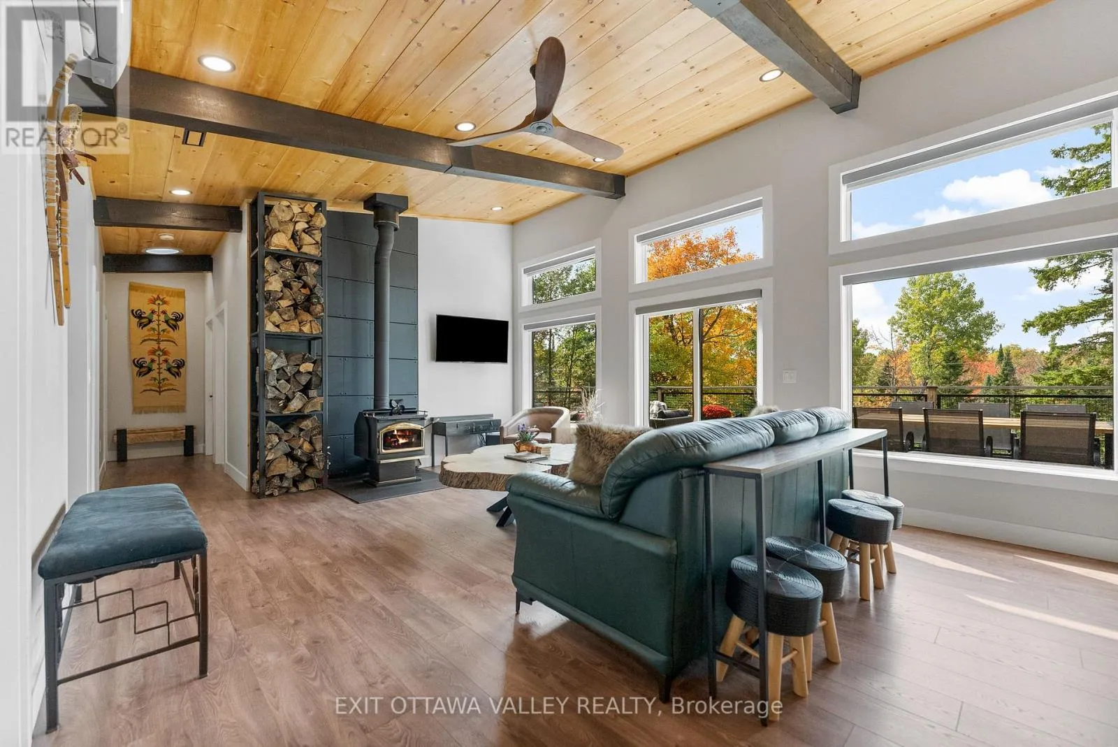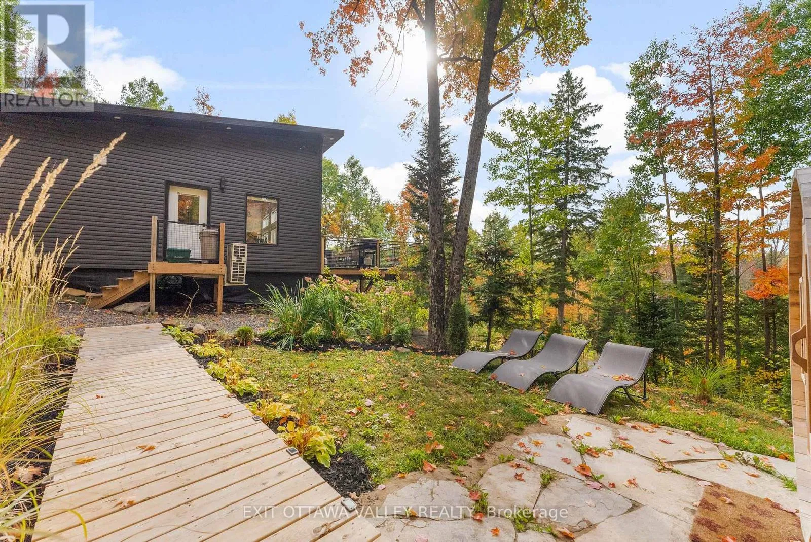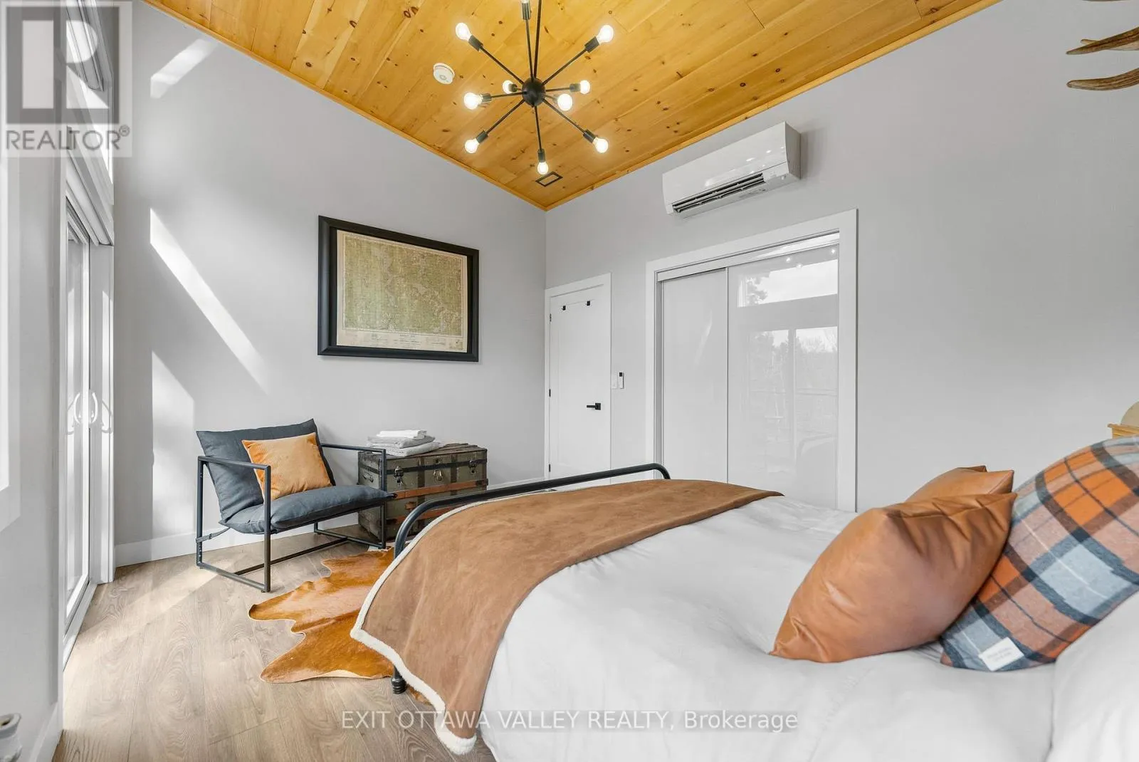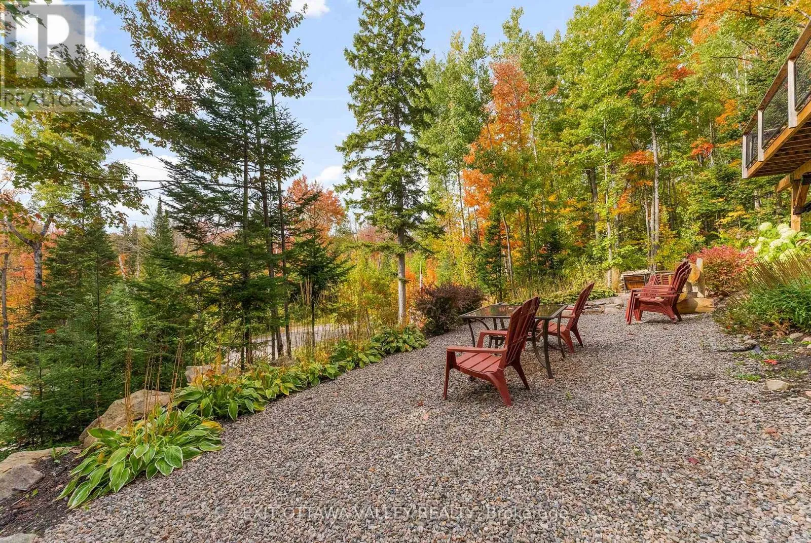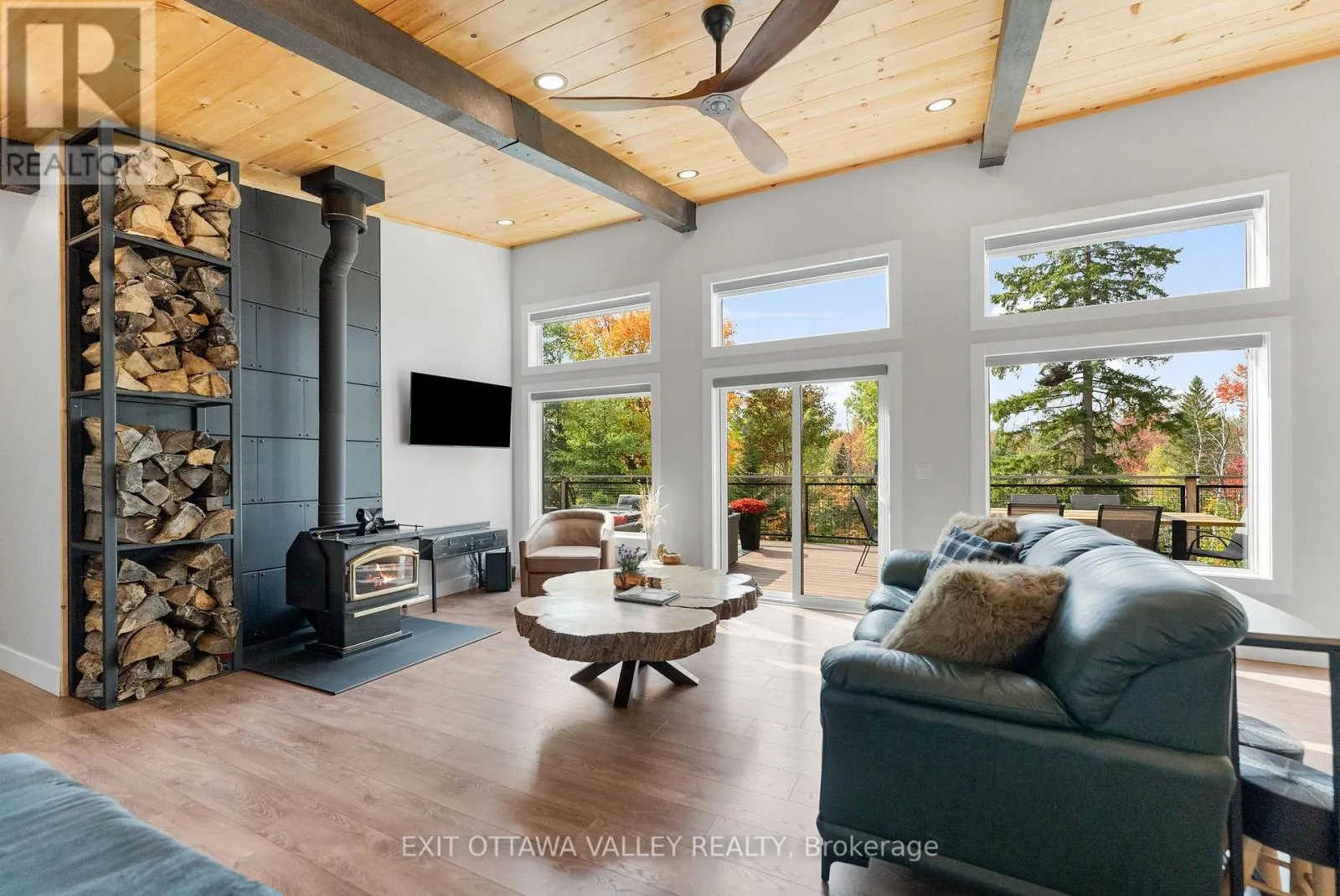 Cross Streets: Hopefield Road. ** Directions: From Hwy 60 in Wilno, Turn onto Wilno South road. In 5.4 km turn left onto Opeongo road. In 850 m, Turn right into Hopefield road. Property is on left in 2.2 km. Welcome to Maple Ridge. Built in 2021, this extraordinary hilltop retreat is the perfect blend of modern luxury and rustic charm. From the moment you arrive, the craftsmanship and attention to detail are impossible to miss. Every inch of this home is thoughtfully designed for both relaxation and style. Step onto the expansive 700 sq/ft deck and soak in the treetop views. Set on nearly 2 private acres, the property is surrounded by nature and offers complete privacy with no close neighbors-your own secluded escape. Inside, the home impresses with 12-foot ceilings, expansive windows, and an airy open layout that fills every room with natural light. Quartz countertops, a deep soaker tub, and sleek finishes bring a modern edge, while the warm textures and WETT-certified fireplace create the inviting, cozy atmosphere of a true retreat. Designed for four-season enjoyment, the outdoor spaces are equally exceptional. Unwind in the new sauna (2024) or hot tub (2025), refresh in the outdoor shower, or gather around the firepit under a canopy of stars. When summer calls, enjoy sandy beaches just five minutes away. A private trail winds through the property, leading to your own lookout with breathtaking views of the rolling hills. Practicality meets beauty with a low-maintenance metal roof, composite deck with metal railings, and a cleared space ready for a future garage. Oversized windows are fitted with fire-resistant, remote-controlled blackout blinds, while a full security system and interconnected smoke alarms provide peace of mind. Thoughtful landscaping enhances the natural surroundings and adds undeniable curb appeal. Currently an Airbnb favorite with a flawless 5-star rating, this property is where sleek, modern design meets the warmth of rustic living. A rare find whether you're seeking a private retreat, a turn-key investment, or both. (id:27476)