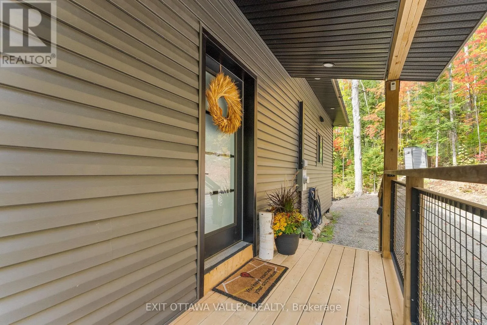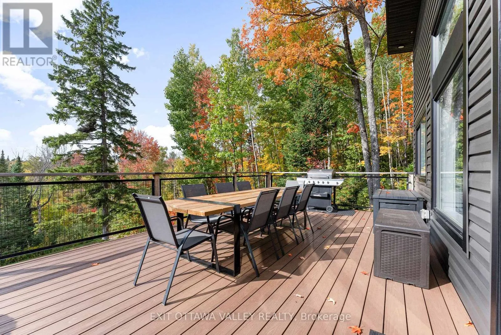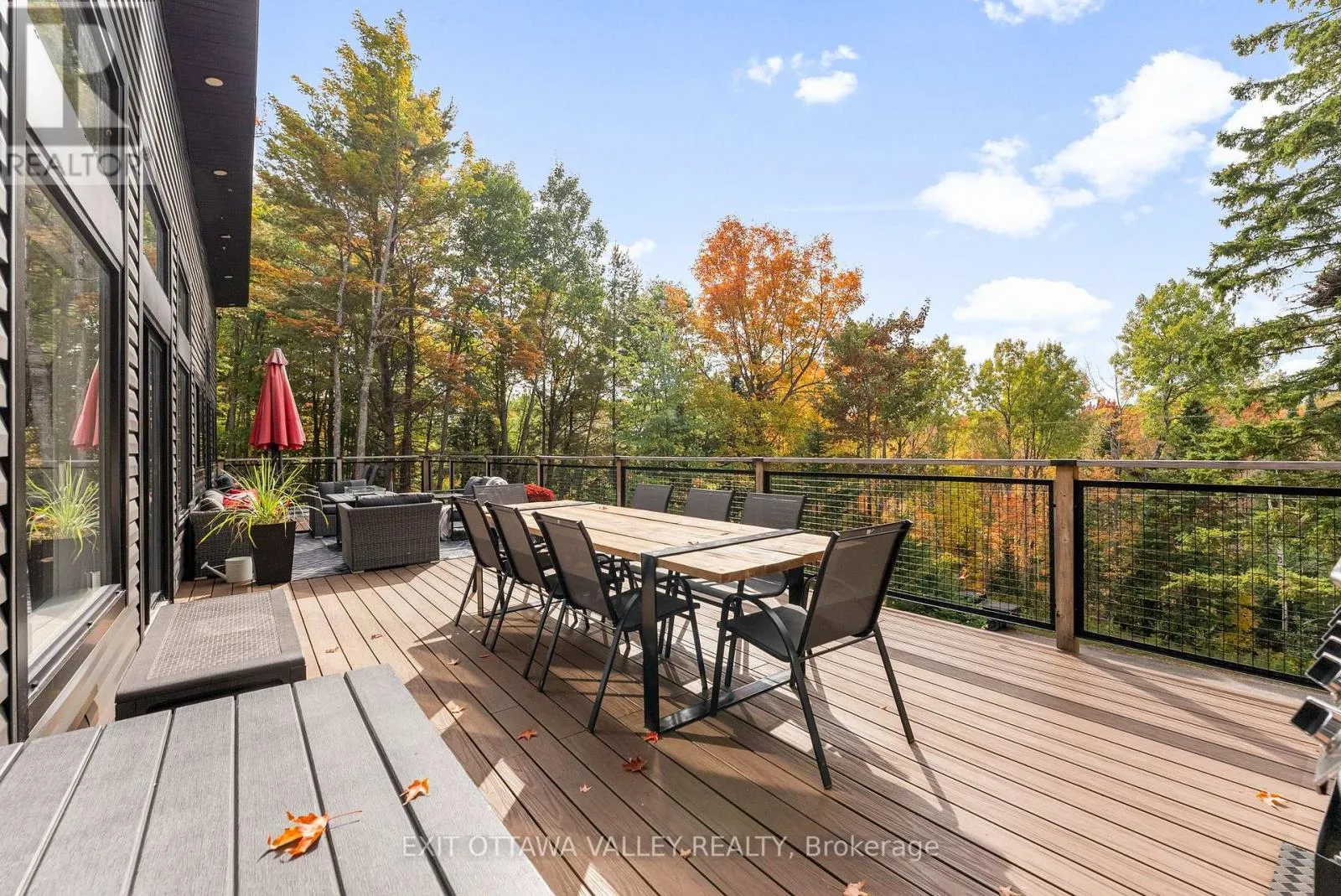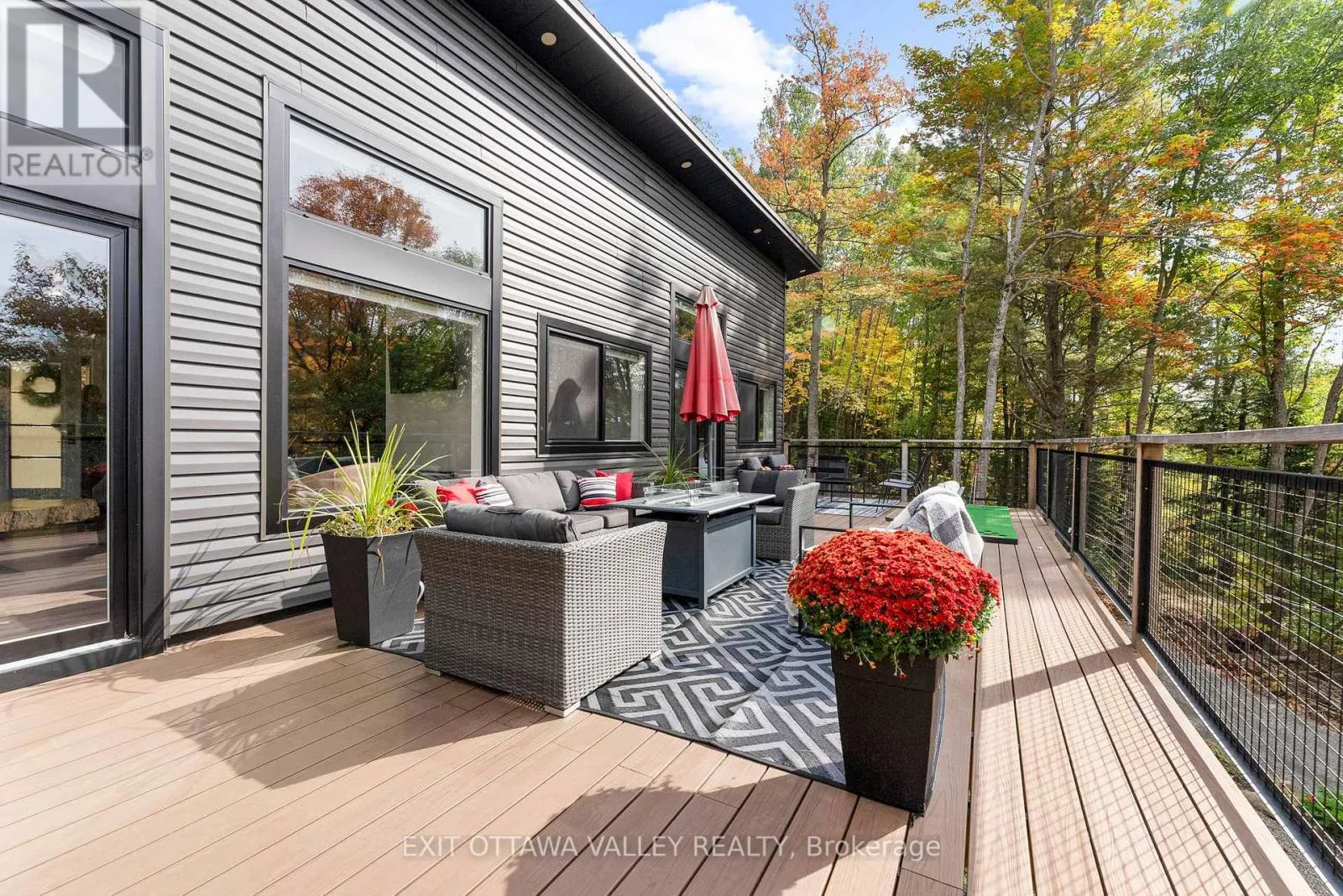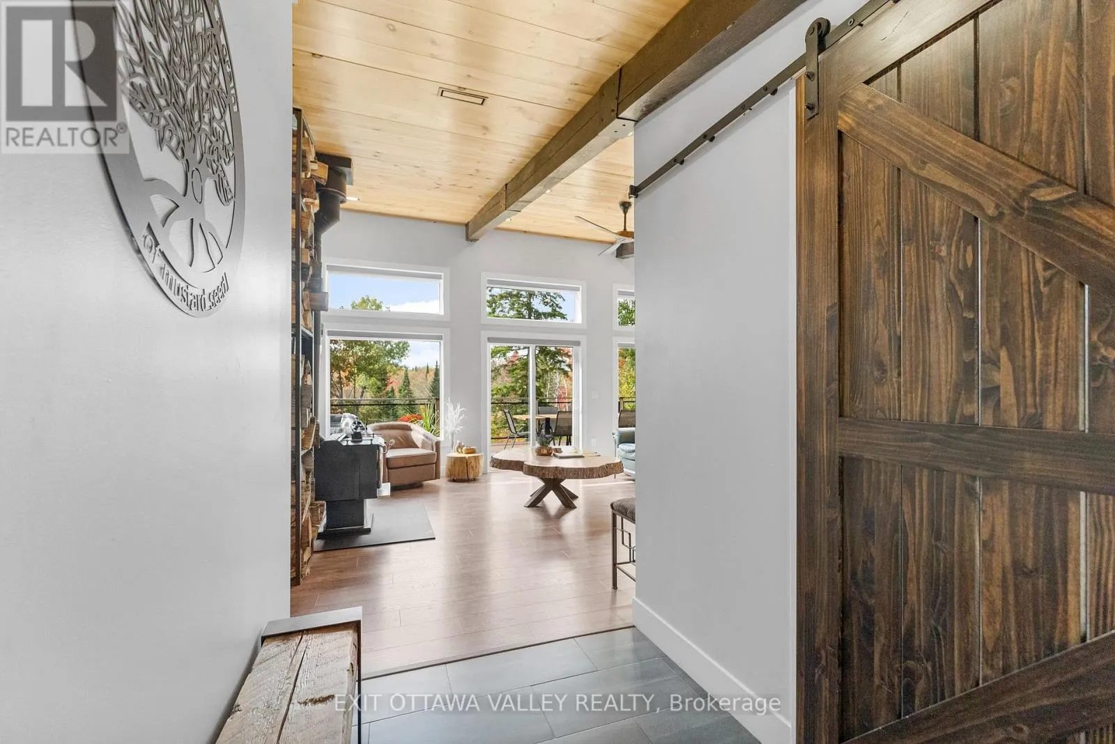 Cross Streets: Hopefield Road. ** Directions: From Hwy 60 in Wilno, Turn onto Wilno South road. In 5.4 km turn left onto Opeongo road. In 850 m, Turn right into Hopefield road. Property is on left in 2.2 km. Welcome to Maple Ridge. Built in 2021, this extraordinary hilltop retreat is the perfect blend of modern luxury and rustic charm. From the moment you arrive, the craftsmanship and attention to detail are impossible to miss. Every inch of this home is thoughtfully designed for both relaxation and style. Step onto the expansive 700 sq/ft deck and soak in the treetop views. Set on nearly 2 private acres, the property is surrounded by nature and offers complete privacy with no close neighbors-your own secluded escape. Inside, the home impresses with 12-foot ceilings, expansive windows, and an airy open layout that fills every room with natural light. Quartz countertops, a deep soaker tub, and sleek finishes bring a modern edge, while the warm textures and WETT-certified fireplace create the inviting, cozy atmosphere of a true retreat. Designed for four-season enjoyment, the outdoor spaces are equally exceptional. Unwind in the new sauna (2024) or hot tub (2025), refresh in the outdoor shower, or gather around the firepit under a canopy of stars. When summer calls, enjoy sandy beaches just five minutes away. A private trail winds through the property, leading to your own lookout with breathtaking views of the rolling hills. Practicality meets beauty with a low-maintenance metal roof, composite deck with metal railings, and a cleared space ready for a future garage. Oversized windows are fitted with fire-resistant, remote-controlled blackout blinds, while a full security system and interconnected smoke alarms provide peace of mind. Thoughtful landscaping enhances the natural surroundings and adds undeniable curb appeal. Currently an Airbnb favorite with a flawless 5-star rating, this property is where sleek, modern design meets the warmth of rustic living. A rare find whether you're seeking a private retreat, a turn-key investment, or both. (id:27476)