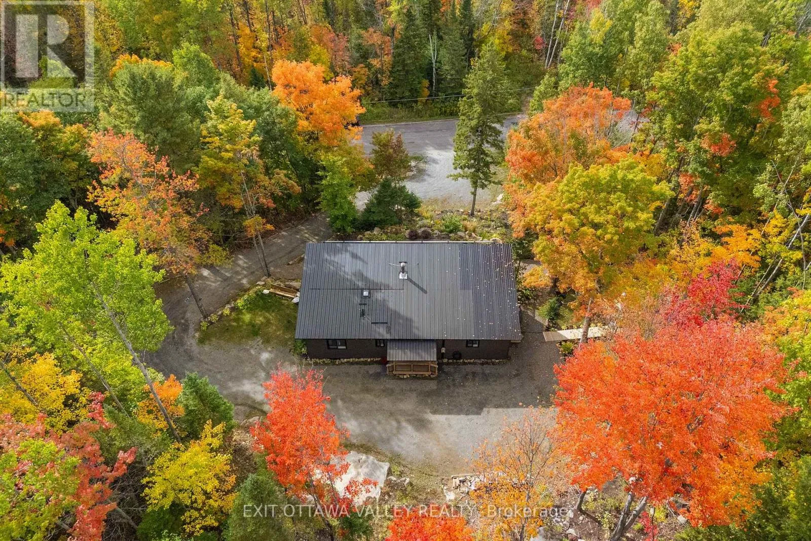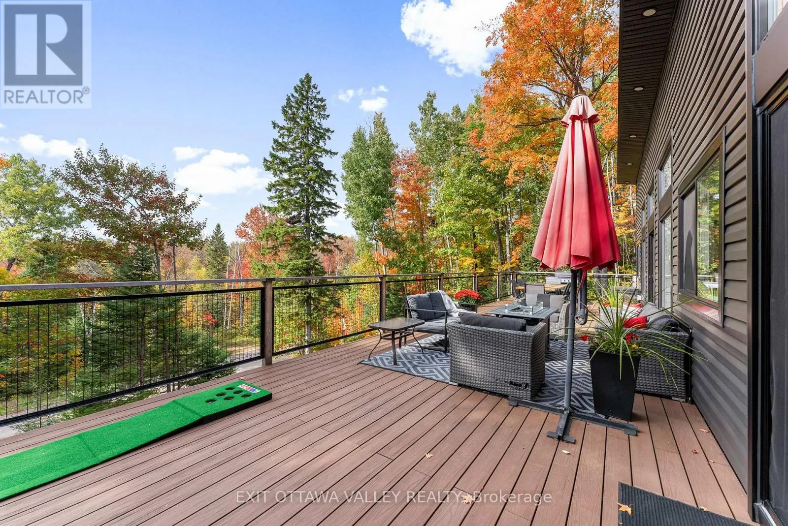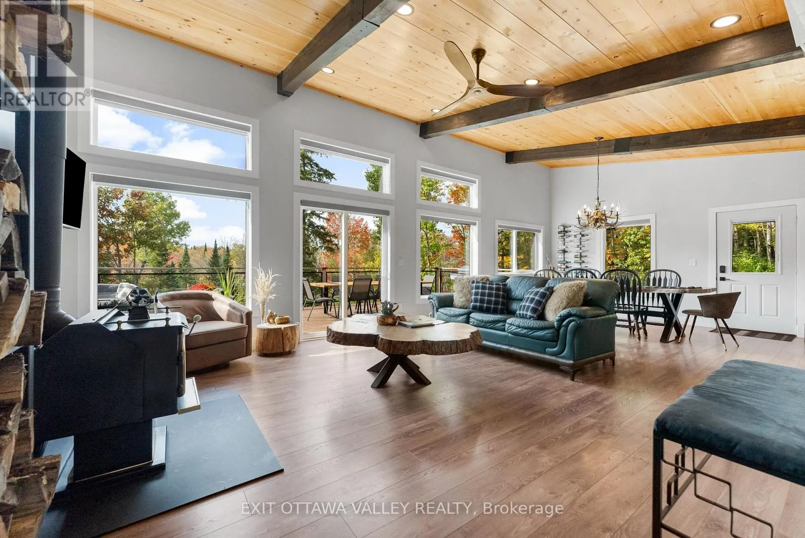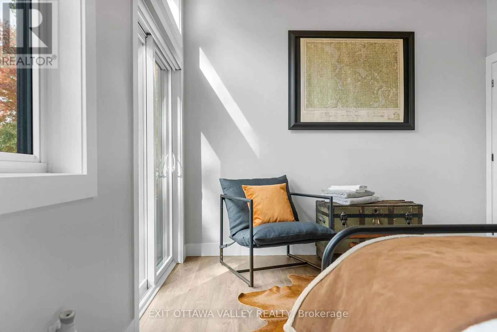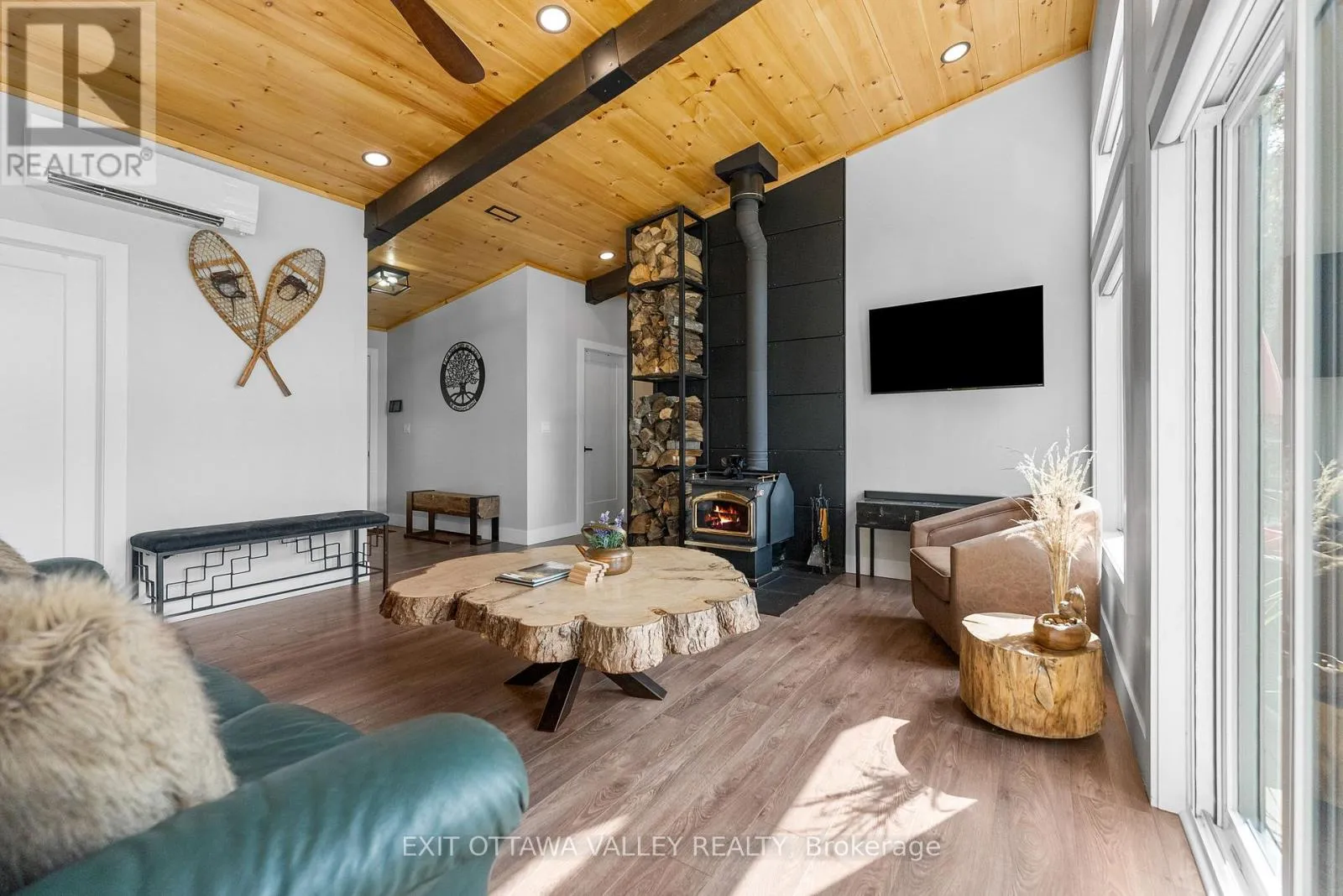 Cross Streets: Hopefield Road. ** Directions: From Hwy 60 in Wilno, Turn onto Wilno South road. In 5.4 km turn left onto Opeongo road. In 850 m, Turn right into Hopefield road. Property is on left in 2.2 km. Welcome to Maple Ridge. Built in 2021, this extraordinary hilltop retreat is the perfect blend of modern luxury and rustic charm. From the moment you arrive, the craftsmanship and attention to detail are impossible to miss. Every inch of this home is thoughtfully designed for both relaxation and style. Step onto the expansive 700 sq/ft deck and soak in the treetop views. Set on nearly 2 private acres, the property is surrounded by nature and offers complete privacy with no close neighbors-your own secluded escape. Inside, the home impresses with 12-foot ceilings, expansive windows, and an airy open layout that fills every room with natural light. Quartz countertops, a deep soaker tub, and sleek finishes bring a modern edge, while the warm textures and WETT-certified fireplace create the inviting, cozy atmosphere of a true retreat. Designed for four-season enjoyment, the outdoor spaces are equally exceptional. Unwind in the new sauna (2024) or hot tub (2025), refresh in the outdoor shower, or gather around the firepit under a canopy of stars. When summer calls, enjoy sandy beaches just five minutes away. A private trail winds through the property, leading to your own lookout with breathtaking views of the rolling hills. Practicality meets beauty with a low-maintenance metal roof, composite deck with metal railings, and a cleared space ready for a future garage. Oversized windows are fitted with fire-resistant, remote-controlled blackout blinds, while a full security system and interconnected smoke alarms provide peace of mind. Thoughtful landscaping enhances the natural surroundings and adds undeniable curb appeal. Currently an Airbnb favorite with a flawless 5-star rating, this property is where sleek, modern design meets the warmth of rustic living. A rare find whether you're seeking a private retreat, a turn-key investment, or both. (id:27476)