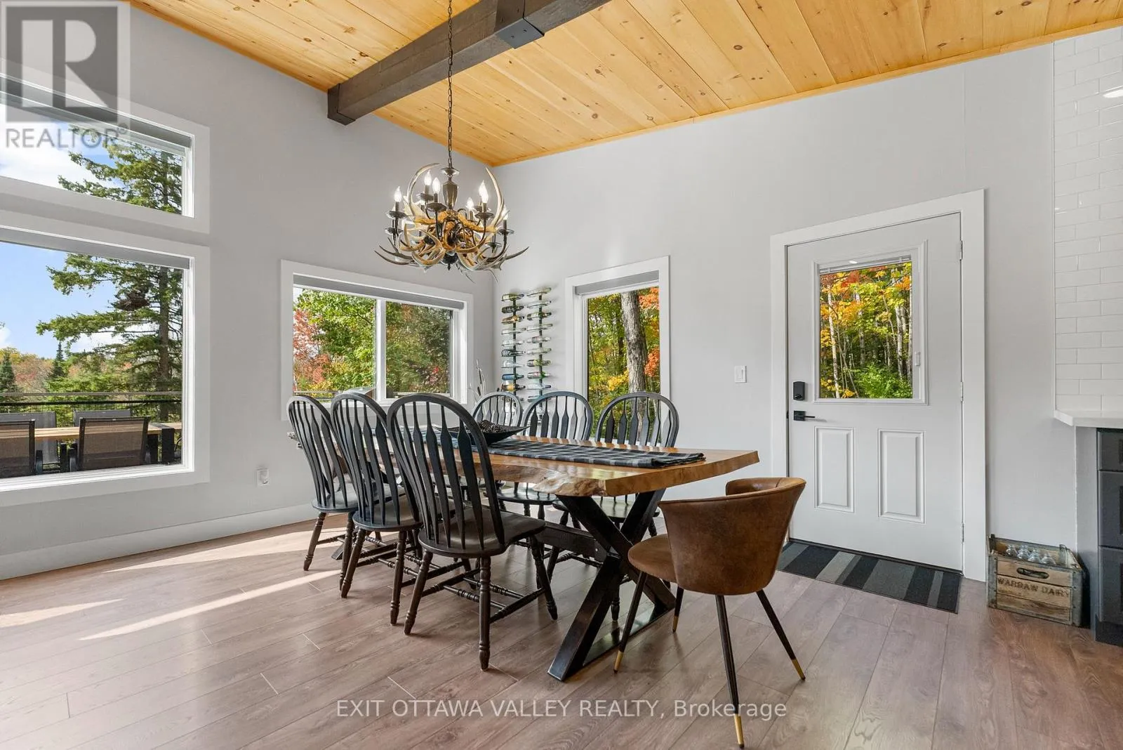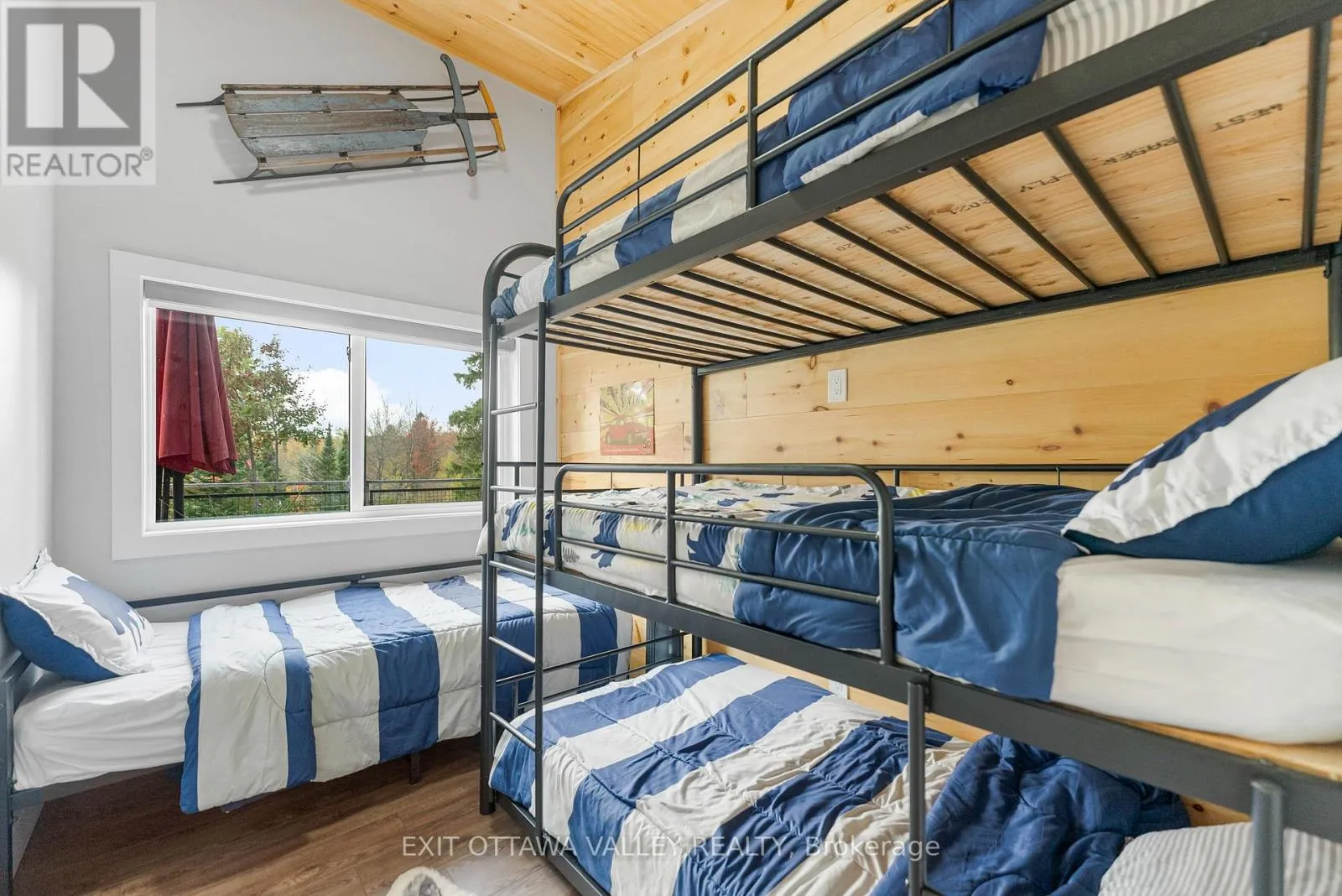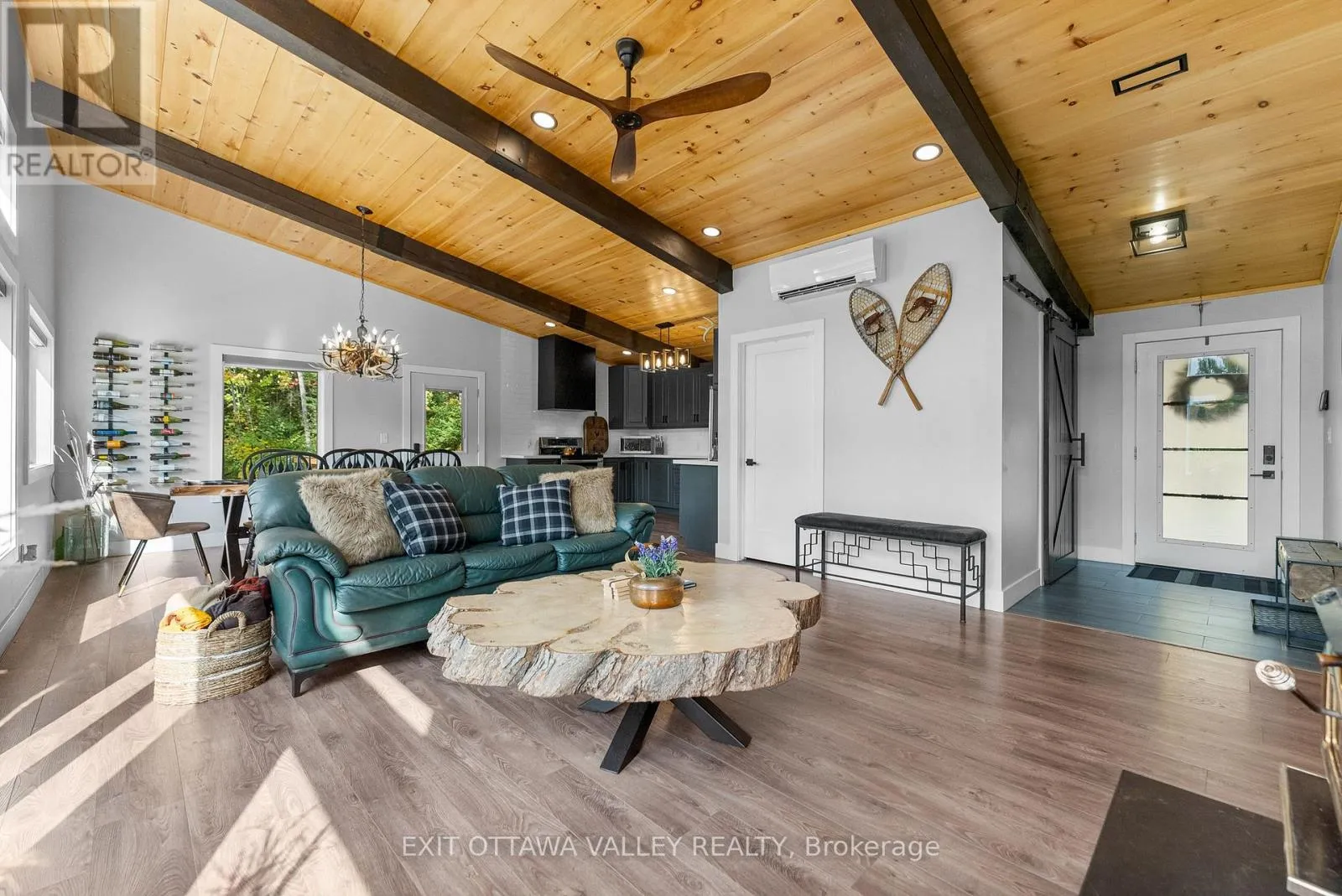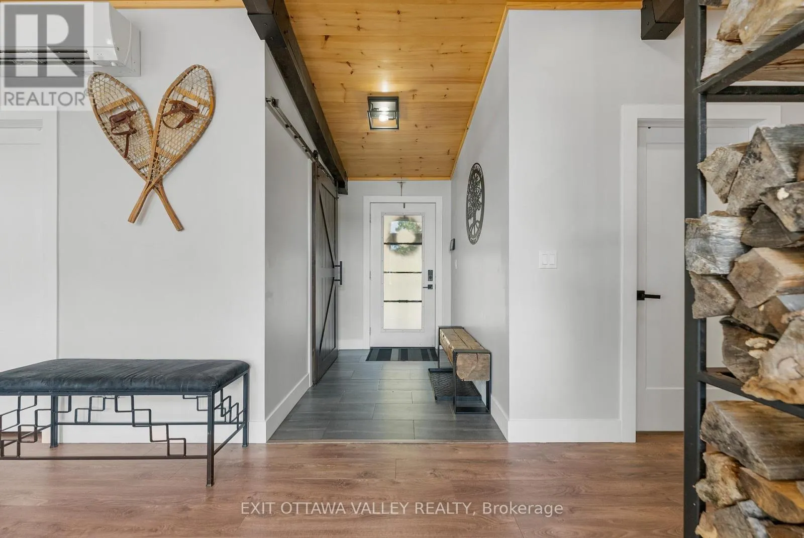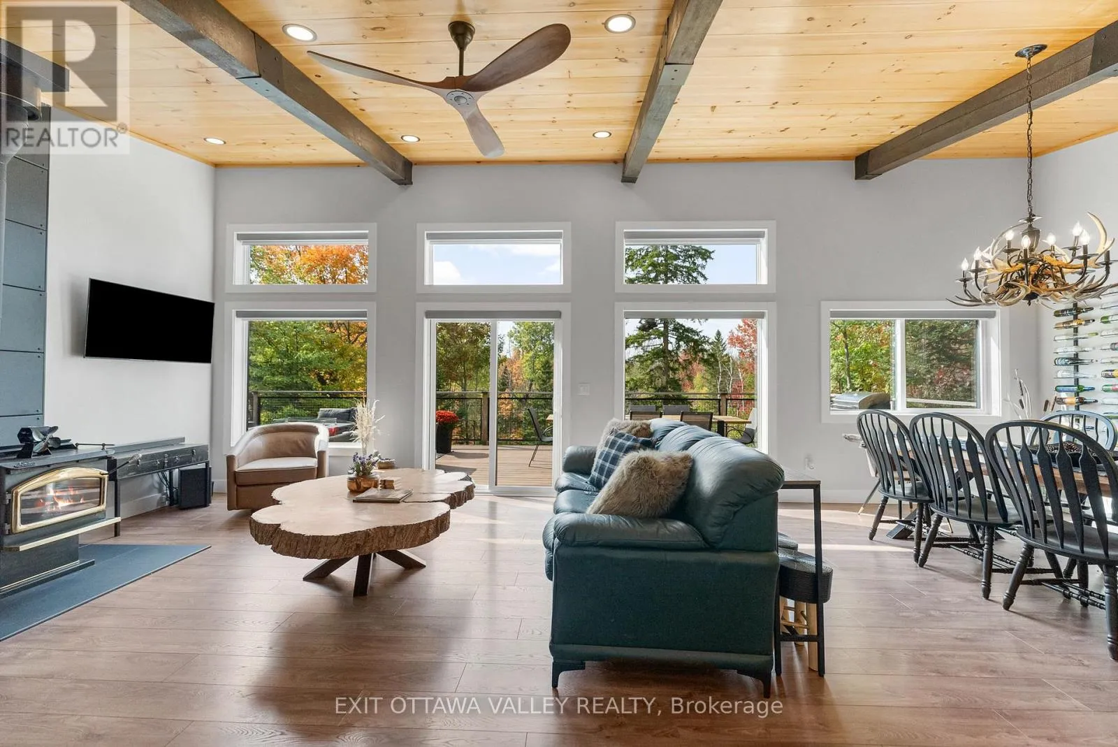 Cross Streets: Hopefield Road. ** Directions: From Hwy 60 in Wilno, Turn onto Wilno South road. In 5.4 km turn left onto Opeongo road. In 850 m, Turn right into Hopefield road. Property is on left in 2.2 km. Welcome to Maple Ridge. Built in 2021, this extraordinary hilltop retreat is the perfect blend of modern luxury and rustic charm. From the moment you arrive, the craftsmanship and attention to detail are impossible to miss. Every inch of this home is thoughtfully designed for both relaxation and style. Step onto the expansive 700 sq/ft deck and soak in the treetop views. Set on nearly 2 private acres, the property is surrounded by nature and offers complete privacy with no close neighbors-your own secluded escape. Inside, the home impresses with 12-foot ceilings, expansive windows, and an airy open layout that fills every room with natural light. Quartz countertops, a deep soaker tub, and sleek finishes bring a modern edge, while the warm textures and WETT-certified fireplace create the inviting, cozy atmosphere of a true retreat. Designed for four-season enjoyment, the outdoor spaces are equally exceptional. Unwind in the new sauna (2024) or hot tub (2025), refresh in the outdoor shower, or gather around the firepit under a canopy of stars. When summer calls, enjoy sandy beaches just five minutes away. A private trail winds through the property, leading to your own lookout with breathtaking views of the rolling hills. Practicality meets beauty with a low-maintenance metal roof, composite deck with metal railings, and a cleared space ready for a future garage. Oversized windows are fitted with fire-resistant, remote-controlled blackout blinds, while a full security system and interconnected smoke alarms provide peace of mind. Thoughtful landscaping enhances the natural surroundings and adds undeniable curb appeal. Currently an Airbnb favorite with a flawless 5-star rating, this property is where sleek, modern design meets the warmth of rustic living. A rare find whether you're seeking a private retreat, a turn-key investment, or both. (id:27476)