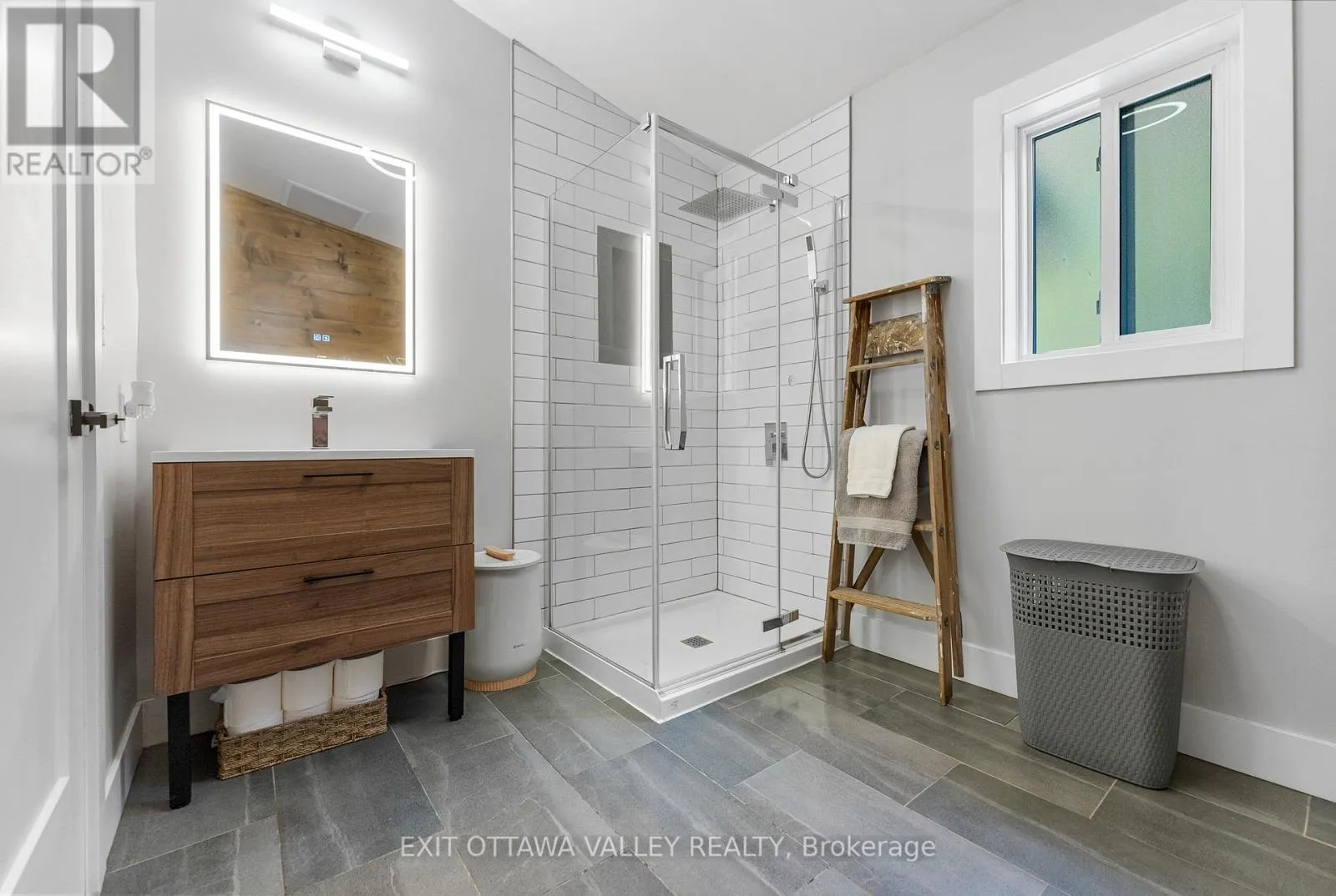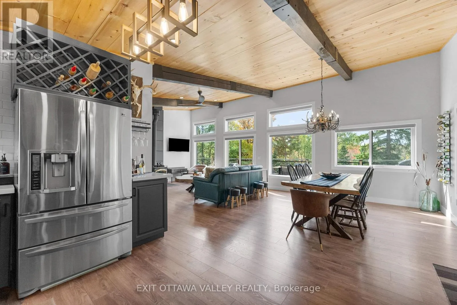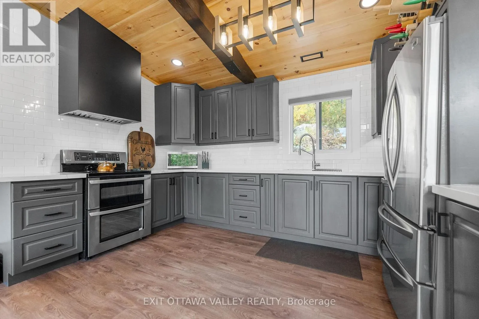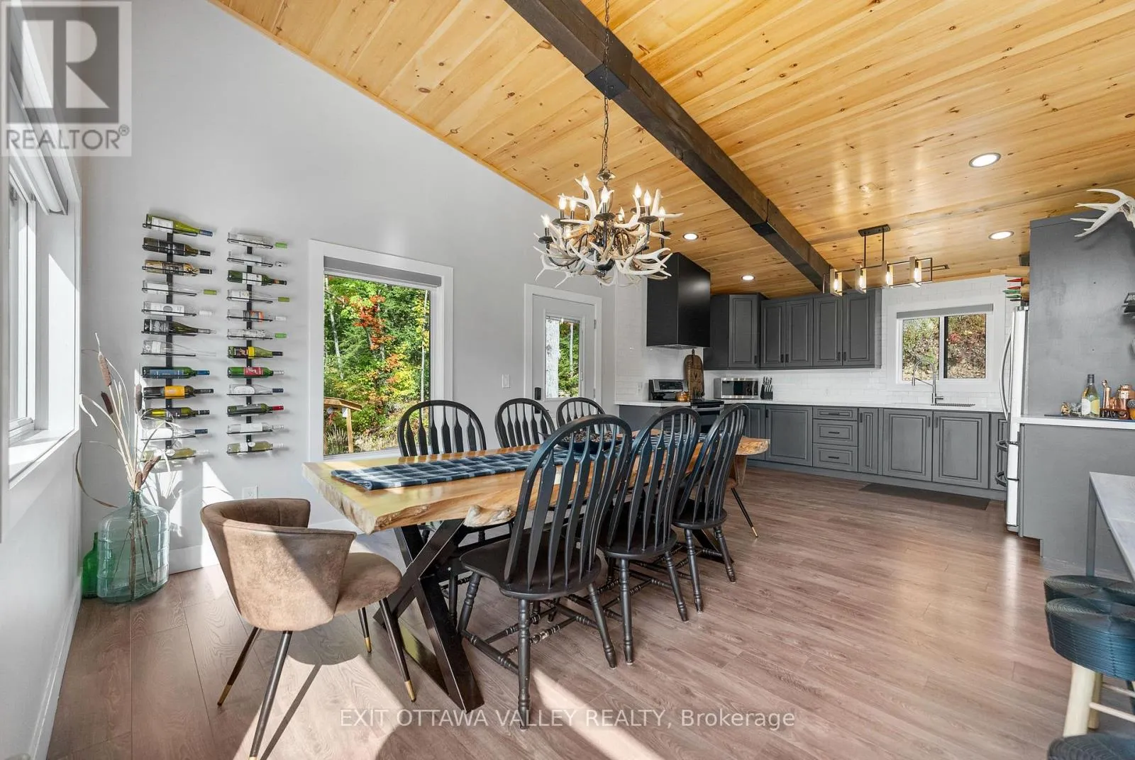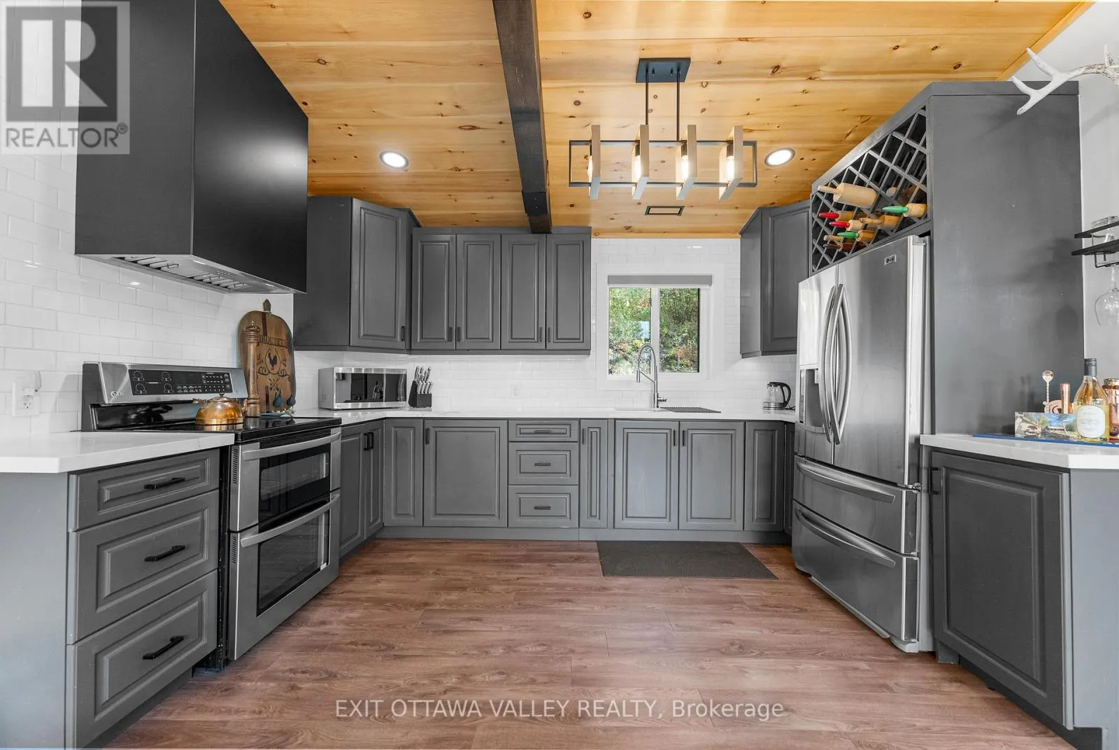 Cross Streets: Hopefield Road. ** Directions: From Hwy 60 in Wilno, Turn onto Wilno South road. In 5.4 km turn left onto Opeongo road. In 850 m, Turn right into Hopefield road. Property is on left in 2.2 km. Welcome to Maple Ridge. Built in 2021, this extraordinary hilltop retreat is the perfect blend of modern luxury and rustic charm. From the moment you arrive, the craftsmanship and attention to detail are impossible to miss. Every inch of this home is thoughtfully designed for both relaxation and style. Step onto the expansive 700 sq/ft deck and soak in the treetop views. Set on nearly 2 private acres, the property is surrounded by nature and offers complete privacy with no close neighbors-your own secluded escape. Inside, the home impresses with 12-foot ceilings, expansive windows, and an airy open layout that fills every room with natural light. Quartz countertops, a deep soaker tub, and sleek finishes bring a modern edge, while the warm textures and WETT-certified fireplace create the inviting, cozy atmosphere of a true retreat. Designed for four-season enjoyment, the outdoor spaces are equally exceptional. Unwind in the new sauna (2024) or hot tub (2025), refresh in the outdoor shower, or gather around the firepit under a canopy of stars. When summer calls, enjoy sandy beaches just five minutes away. A private trail winds through the property, leading to your own lookout with breathtaking views of the rolling hills. Practicality meets beauty with a low-maintenance metal roof, composite deck with metal railings, and a cleared space ready for a future garage. Oversized windows are fitted with fire-resistant, remote-controlled blackout blinds, while a full security system and interconnected smoke alarms provide peace of mind. Thoughtful landscaping enhances the natural surroundings and adds undeniable curb appeal. Currently an Airbnb favorite with a flawless 5-star rating, this property is where sleek, modern design meets the warmth of rustic living. A rare find whether you're seeking a private retreat, a turn-key investment, or both. (id:27476)