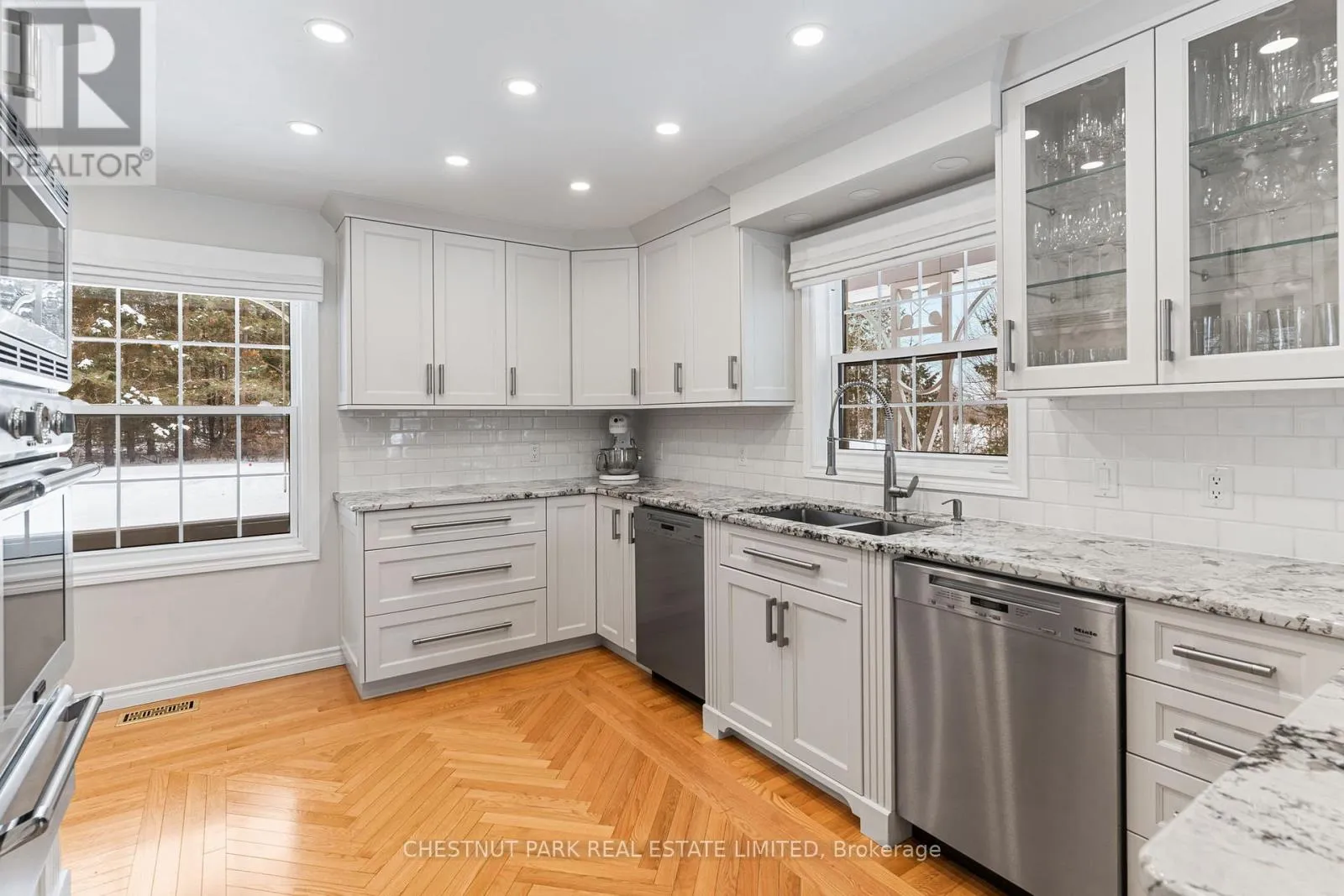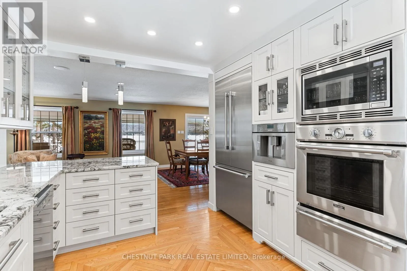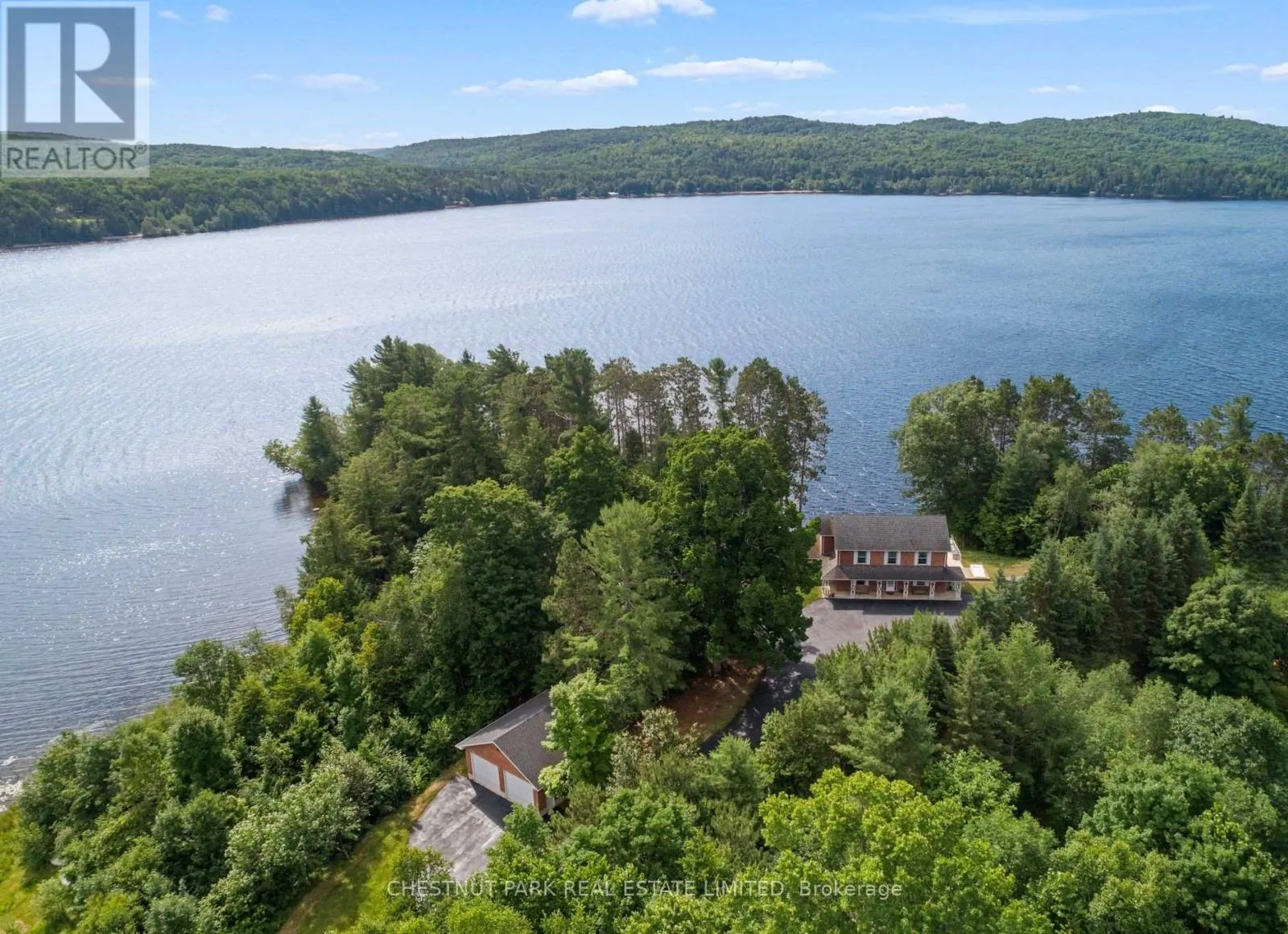 Cross Streets: Mask Island Drive & Lakeshore. ** Directions: Lakeshore Drive to Mask Island. Privately positioned on a peninsula lot with nearly 1,100 feet of shoreline and just under 3 acres, this is a rare Kamaniskeg Lake offering defined by scale, sun, and exceptional privacy. With ideal southern exposure and a private sand beach, the setting delivers all-day light, expansive water views, and the kind of seclusion seldom found on today's waterfront market. Designed for true four-season living, the two-storey brick home offers an open-concept main level that balances comfort and function. The custom kitchen is thoughtfully appointed with granite surfaces, extensive cabinetry, built-in appliances, dual dishwashers, automatic coffee maker, and a professional six-burner gas range with grill and dual ovens, additional oven and microwave. Generous bar seating anchors the space for effortless entertaining. The adjoining living area features vaulted ceilings, light oak floors, in-ceiling speakers, and a gas fireplace, with patio doors opening to both the lakeside deck and a covered porch equipped with four Phantom retractable screens-extending enjoyment beyond the summer season. The main-floor primary suite captures peaceful lake views and includes a spacious ensuite. Upstairs, 4 additional bedrooms, a full bath, secondary lounge, and reading nook provide flexibility for family and guests. The walk-out lower level adds valuable living space with a fitness area opening to a stone patio, an inviting entertainment zone with wet bar and woodstove, and a dedicated wood room with exterior access. Landscaped grounds include an in-ground sprinkler system drawing from the lake, beach toy storage, and power to the shoreline for a boat lift and beach outlet. Two detached double garages offer outstanding storage and versatility, including space for vehicles, recreational equipment, and a 21-foot boat with drive-through access. A substantial, private waterfront property with year-round access-just minutes to Barry's Bay and essential amenities, including hospital. (id:27476)