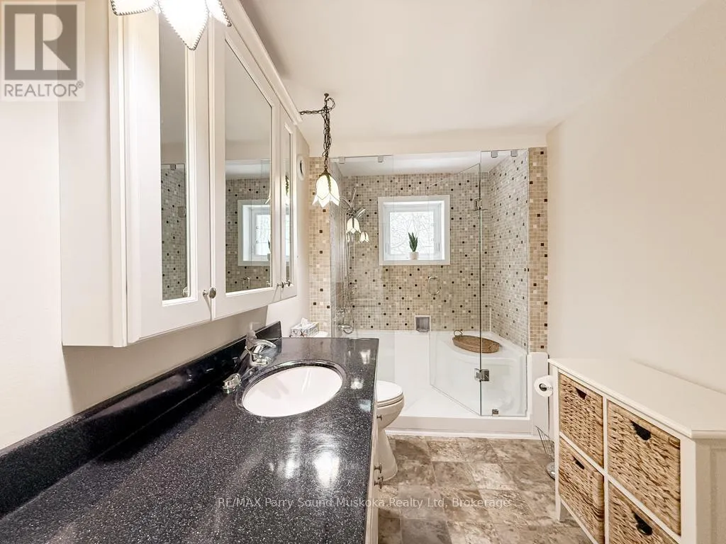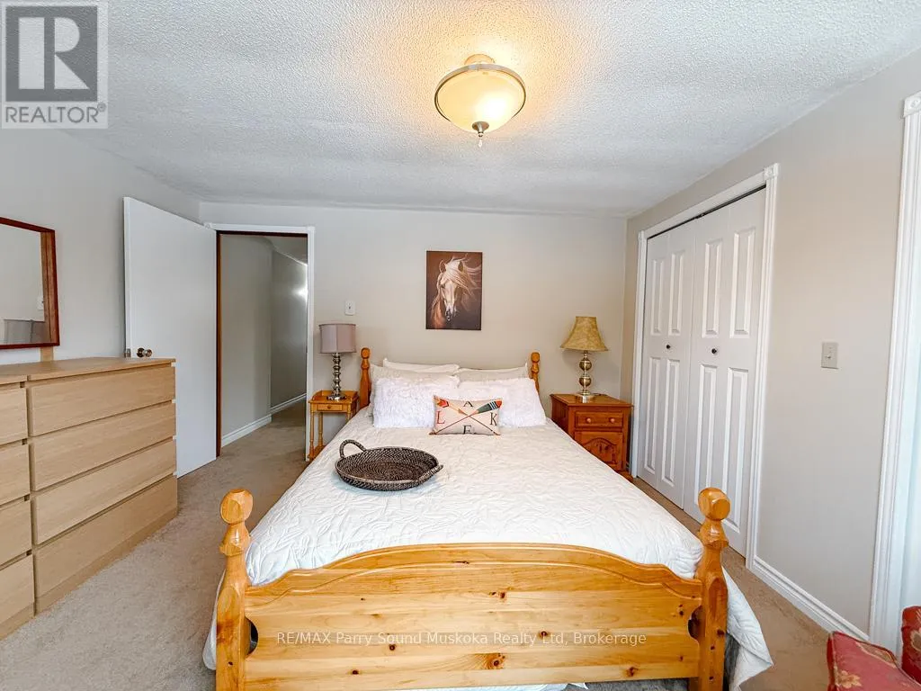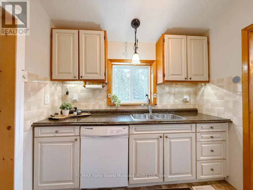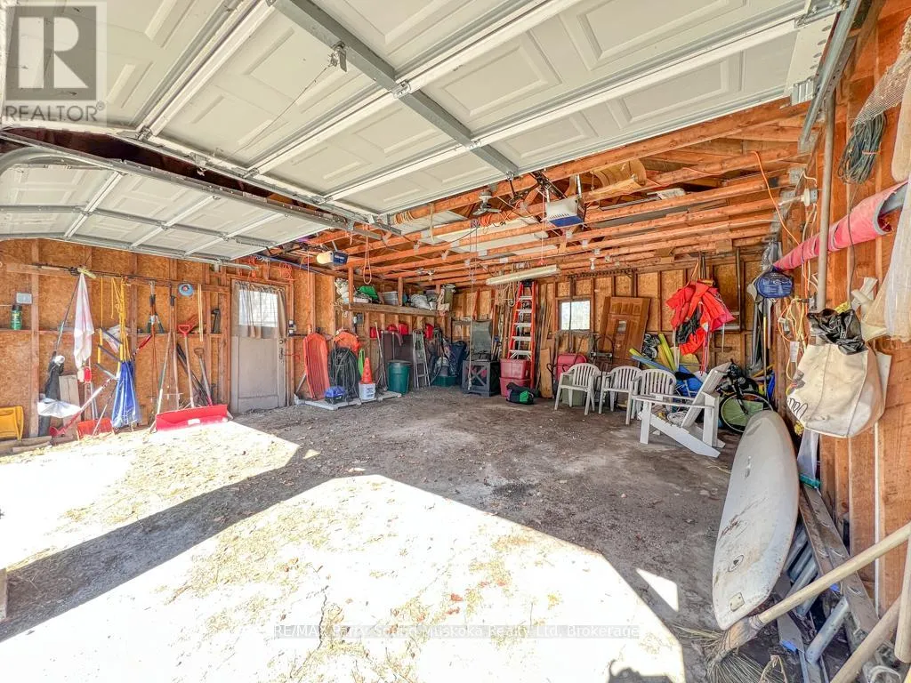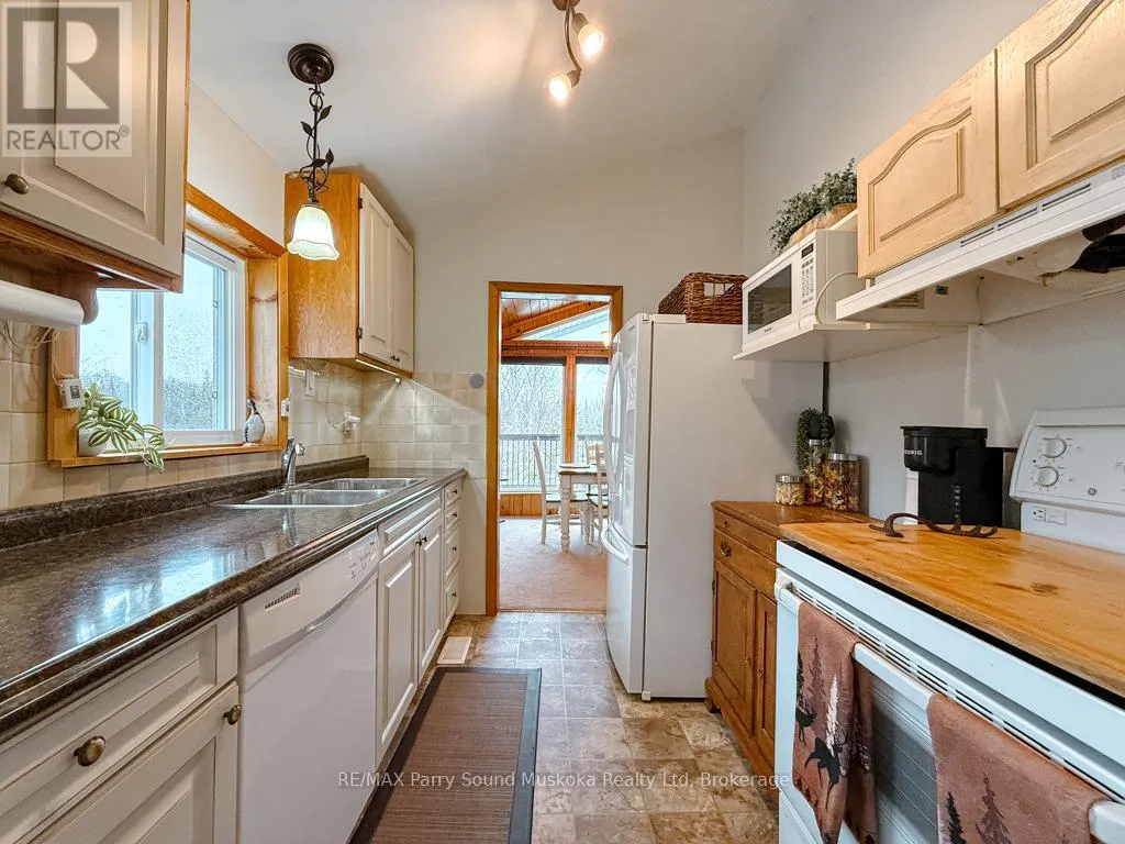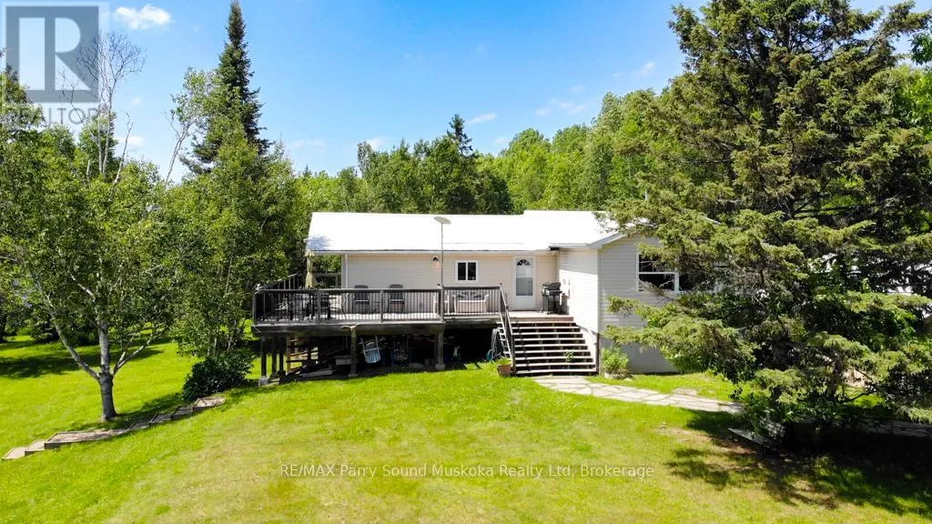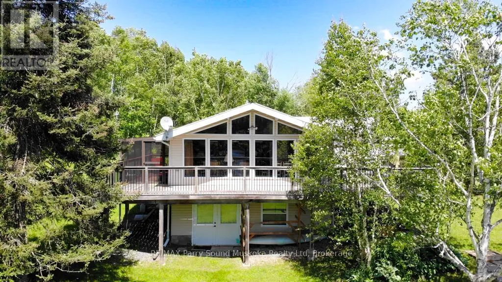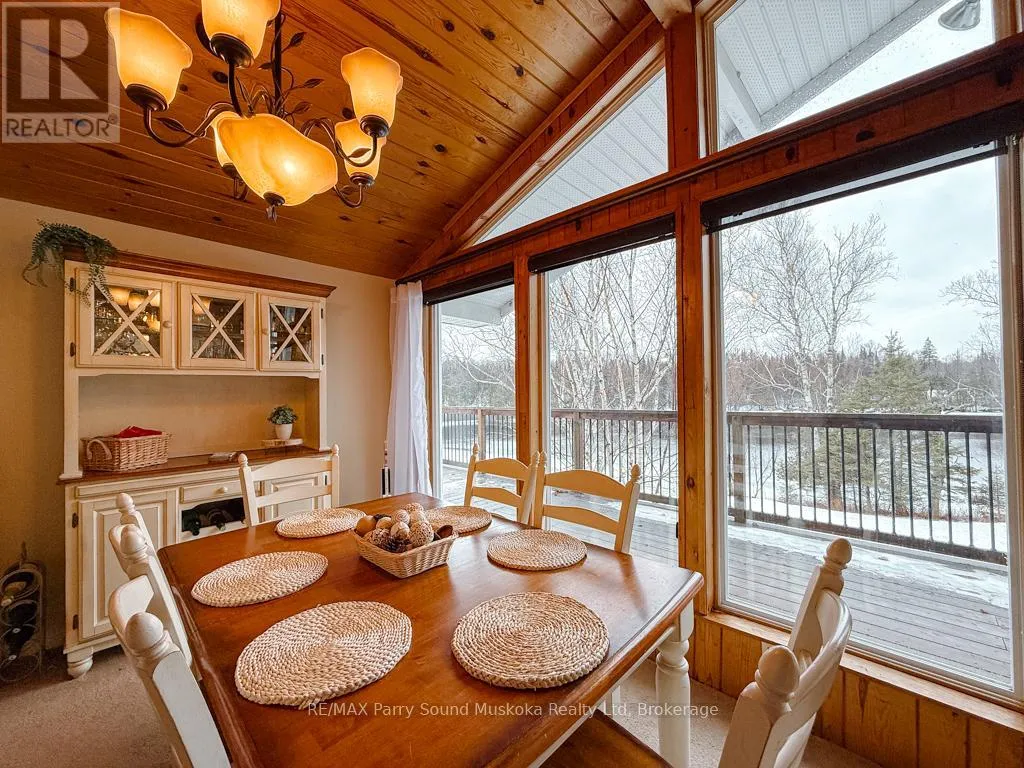 Cross Streets: Poverty Bay and Magnet. ** Directions: Hwy 124 to Old Hwy Rd to Poverty Bay Rd to Magnet. Incredible opportunity to own a four-season waterfront retreat on a quiet, scenic stretch of the Magnetawan River, offering approximately 6 miles of boating in a peaceful setting. Set on approx. an acre with 176 feet of shoreline, the property features a gentle slope to a sandy beach, ideal for swimming, along with southwest exposure providing beautiful afternoon sun and sunset views. Directly across the road, the landscape remains open with additional river frontage, enhancing privacy and space. Wraparound deck includes fully screened in sunroom and BBQ attached to propane hook up. Located on a municipally maintained cul-de-sac, this property offers quiet enjoyment with minimal traffic. Inside, the main level features an open-concept living and dining area with vaulted ceilings, a gas fireplace, and large windows that capture the views and natural light. The main floor includes three bedrooms, a 3-piece bath, and convenient laundry. Full walkout lower level with 9-foot ceilings and a block foundation, ideal for storage with double door access. Upgrades include furnace/AC, LifeBreath system, on-demand hot water. Enjoy heated exterior steps for easy winter access. Outdoors, enjoy a newer dock, private boat launch, and a detached two-car garage with ample storage. A short drive to the village of Magnetawan for local shops and dining, this property offers year-round access and recreation including boating, swimming, fishing, and snowmobiling, making it a perfect home or cottage getaway. Boat launch to larger lakes less than 10 minutes away. (id:27476)