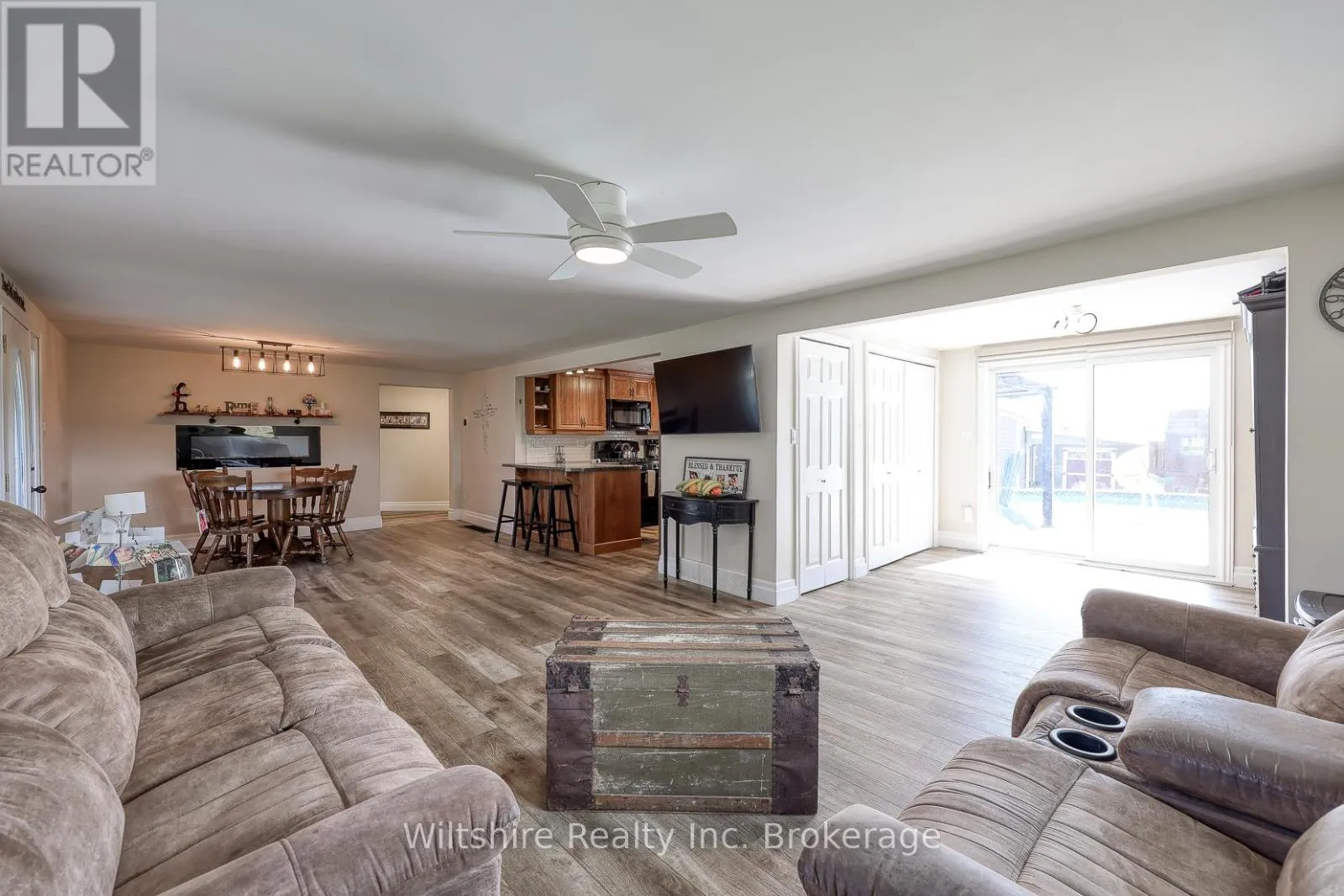 Cross Streets: Springwater Road. ** Directions: From Springwater Rd, head west on highway 3, house on the left. Set on almost half an acre and surrounded by a corn field, this 3-bedroom, 2-bathroom home offers privacy, space, and modern updates. This home is move-in ready and designed for comfortable country living. The main floor features an open-concept living and dining area with a built-in electric fireplace. A den with sliding doors opens to the south-facing deck and above-ground pool, while a convenient washer/dryer combo is neatly tucked into the closet. Luxury vinyl flooring (2022) runs throughout the home. The primary bedroom includes pot lighting, two windows, a large walk-in glass shower, and a good sized dressing room. The lower-level offers a finished living space with a bedroom that sports a gas fireplace and ledgestone facade (2022). Additional features include a double-wide detached heated garage with insulated door (2013), vinyl-clad exterior (2018), metal roof and screened gutters (2009), plus built-in cabinetry and an attached shed. A quiet, well-maintained property with approximately 15 minutes from the 401, an ideal blend of rural living and modern convenience. (id:27476)