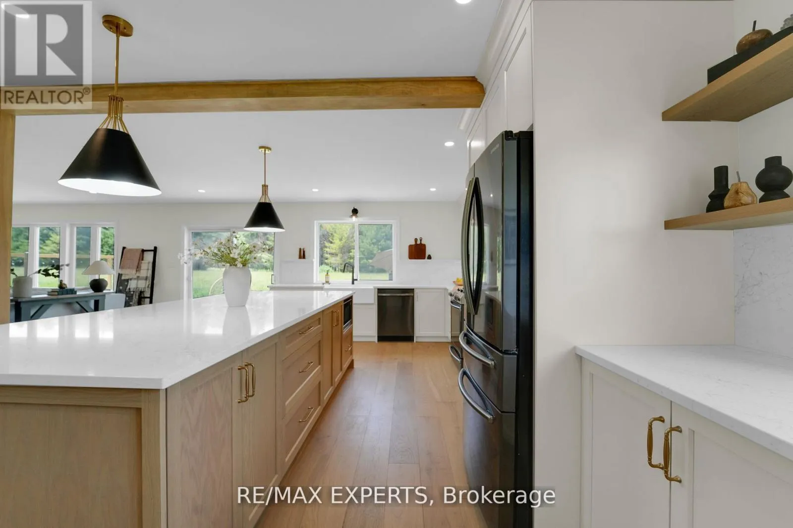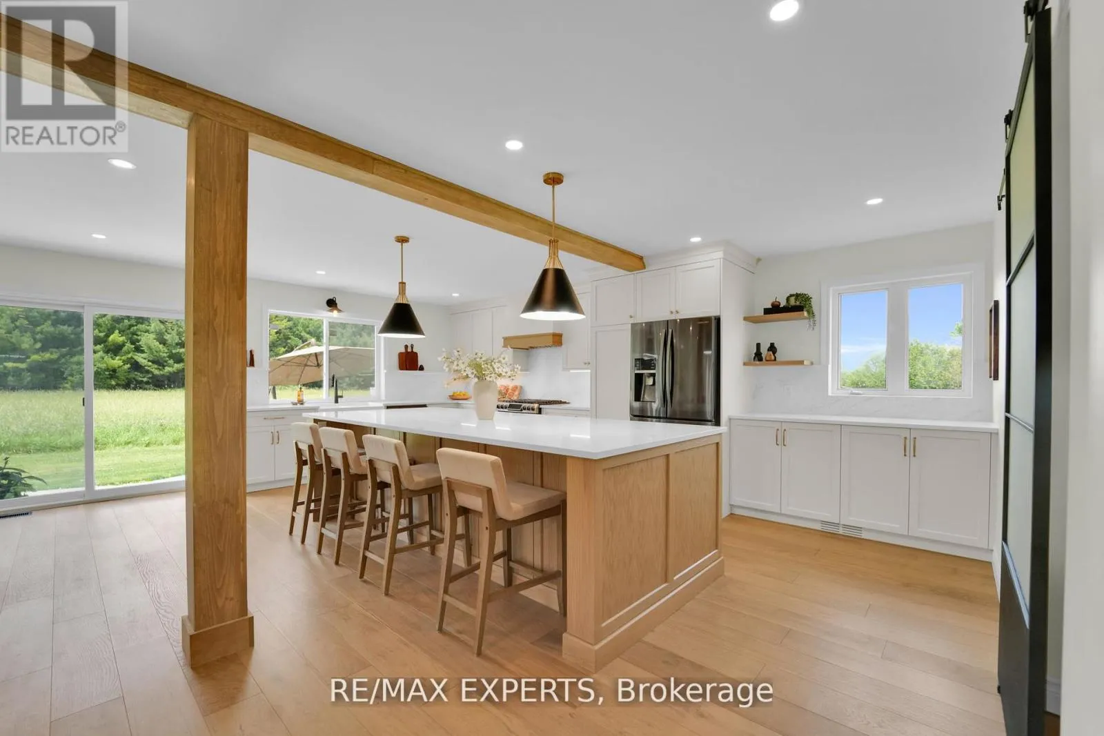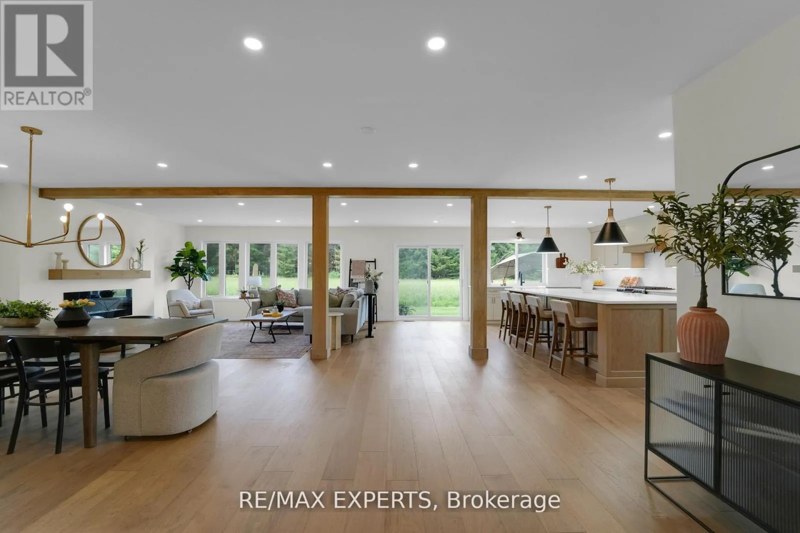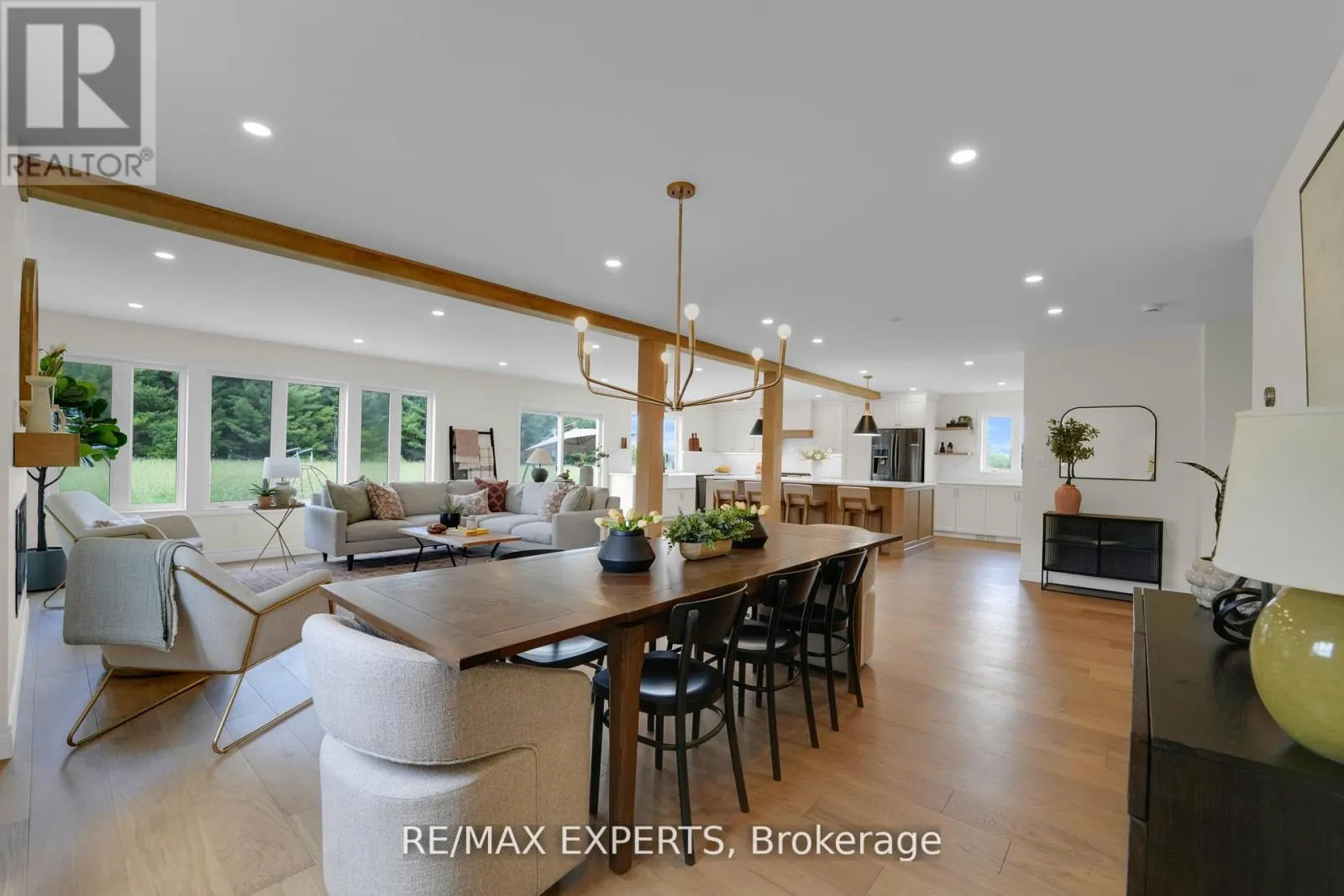 Main Street & Wellington Street North Welcome to 46 Scenic Drive! Where timeless craftsmanship meets modern country elegance in the heart of Drayton. Situated on a stunning 100x150 ft lot, this newly renovated custom home offers approx. 5,300 sq ft of beautifully finished living space across three levels. The open-concept main floor is enhanced by engineered hardwood, pot lights, and a striking exposed wooden beam that ties the space together. The designer kitchen is a showstopper featuring quartz countertops, custom cabinetry, an oversized centre island, a uniquely crafted hood, and a walk-in pantry for optimal functionality. Large picture windows flood the home with natural light and frame peaceful views of the lush backyard. With 7 bedrooms and 5 bathrooms, this home blends comfort and sophistication effortlessly. The oak staircase with sleek iron spindles leads to a second floor that boasts a luxurious primary retreat with a spa-like ensuite, double vanities, freestanding tub, glass shower, and his & her closets. The fully finished basement includes pot lights, a spacious bedroom with ensuite, and a custom wet bar with a gleaming granite countertop, perfect for entertaining. Step outside to your stamped concrete patio with outdoor fire-pit, or unwind on the charming front veranda. Located in Drayton, a close-knit community known for its scenic beauty and small-town charm, this home is a true masterpiece of luxury living. (id:27476)