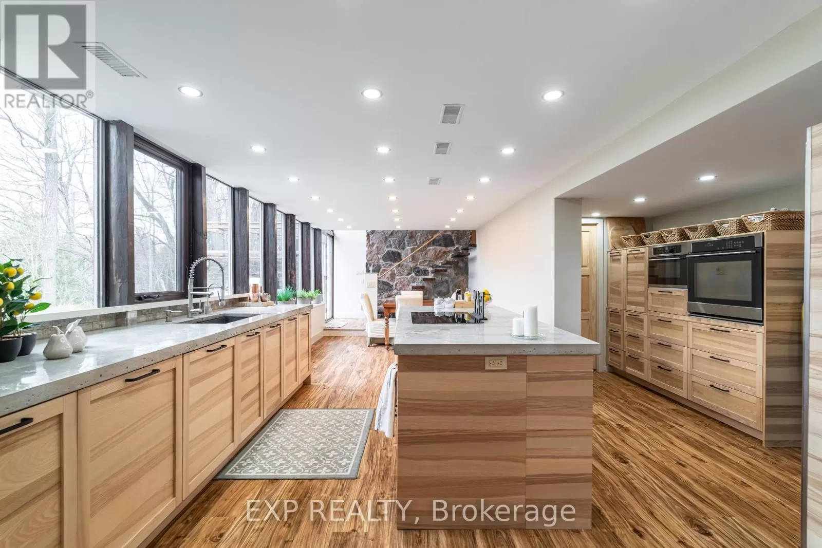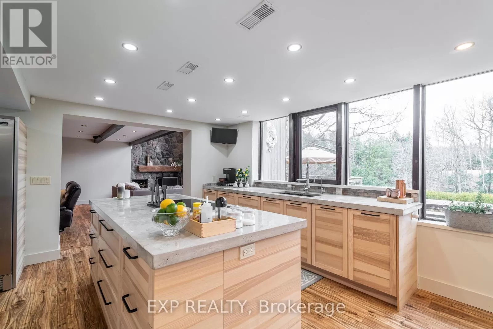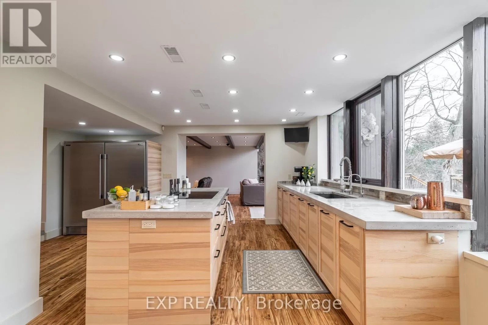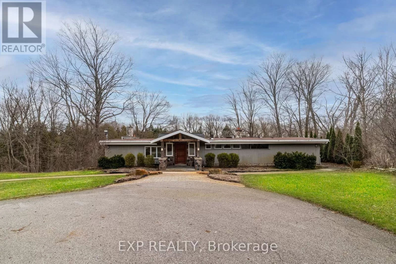 Cross Streets: Hwy 48 & 19th. ** Directions: North on Hwy 48 Turn East on 19th Ave, follow the jog in the road, and find the property on the south side. Welcome to 6165 19th Ave., Markham a truly unique country estate offering the best of both worlds: ultimate privacy and serene natural surroundings, all within minutes to modern conveniences. This warm and inviting 4-bedroom, 4-bathroom bungalow inspired by Frank Lloyd Wrights signature style is thoughtfully integrated into the landscape. Floor-to-ceiling windows along the back of the home flood the interior with natural light and provide breathtaking views of the wooded rolling lot and creek. The recently updated kitchen features poured-in-place concrete countertops and rich wood cabinetry. A built-in wall oven and a spacious walk-in pantry make it both beautiful and functional. And the kitchen boasts stunning views of the property including wildlife such as deer, foxes, turkeys, and a great heron. The great room is a showstopper, with soaring 20+ ft ceilings, exposed wooden beams and a natural granite stone wood-burning fireplace perfect for family gatherings or quiet romantic evenings in. The primary suite is a tranquil retreat, complete with a steam feature and jetted soaking tub in the ensuite and a wood burning fireplace. The home is fully wired with CAT-5 making it ideal for modern living. With two wood-burning fireplaces and an additional gas fireplace, warmth and comfort are never far away. Outside, the detached three-car garage with workshop and loft is a dream for hobbyists or those seeking extra space. With utilities already in place, the loft offers untapped potential and can be transformed into a games room, home office, or garden suite. The oversized patio and deck are perfect for entertaining including summer nights around the built-in gas firepit. Natural gas service, a rare feature for a country property, adds value and efficiency. Whether you're seeking a forever family home or a weekend escape, this one-of-a-kind property delivers charm, character, and lifestyle. Dont miss your chance to own this exceptional gem in Markham's countryside. (id:27476)