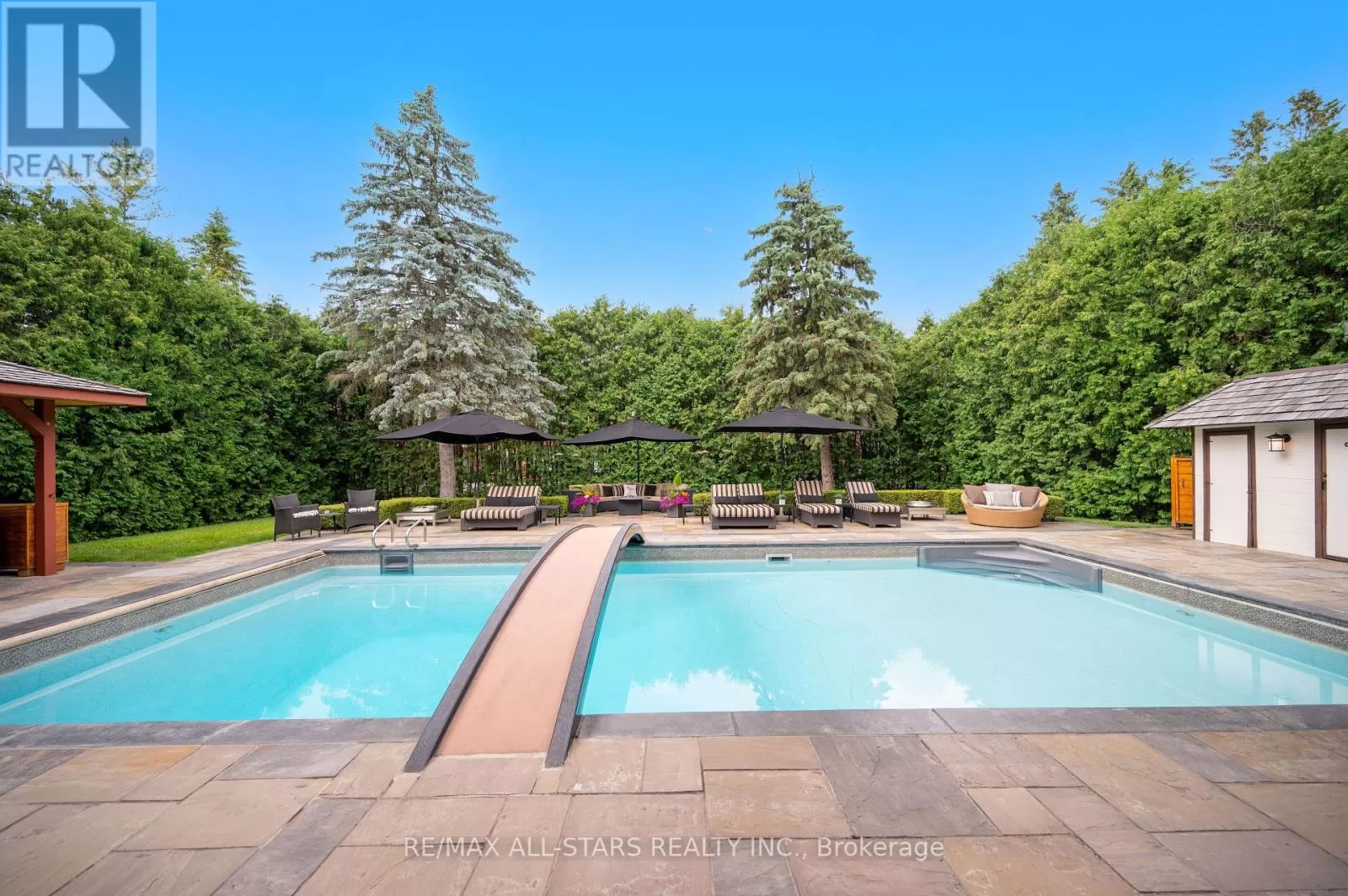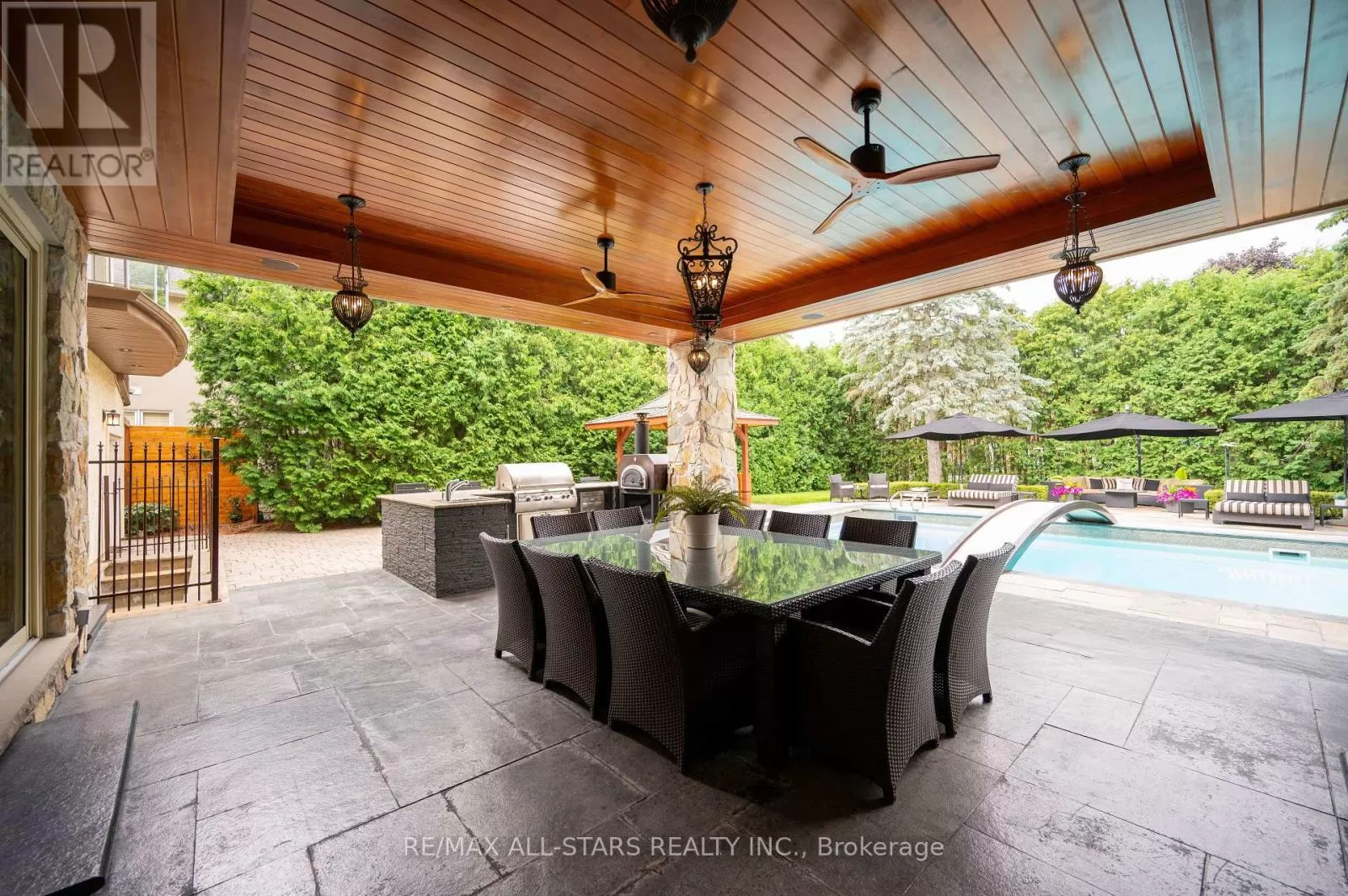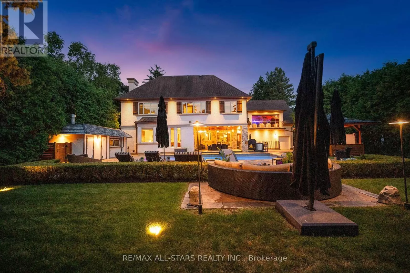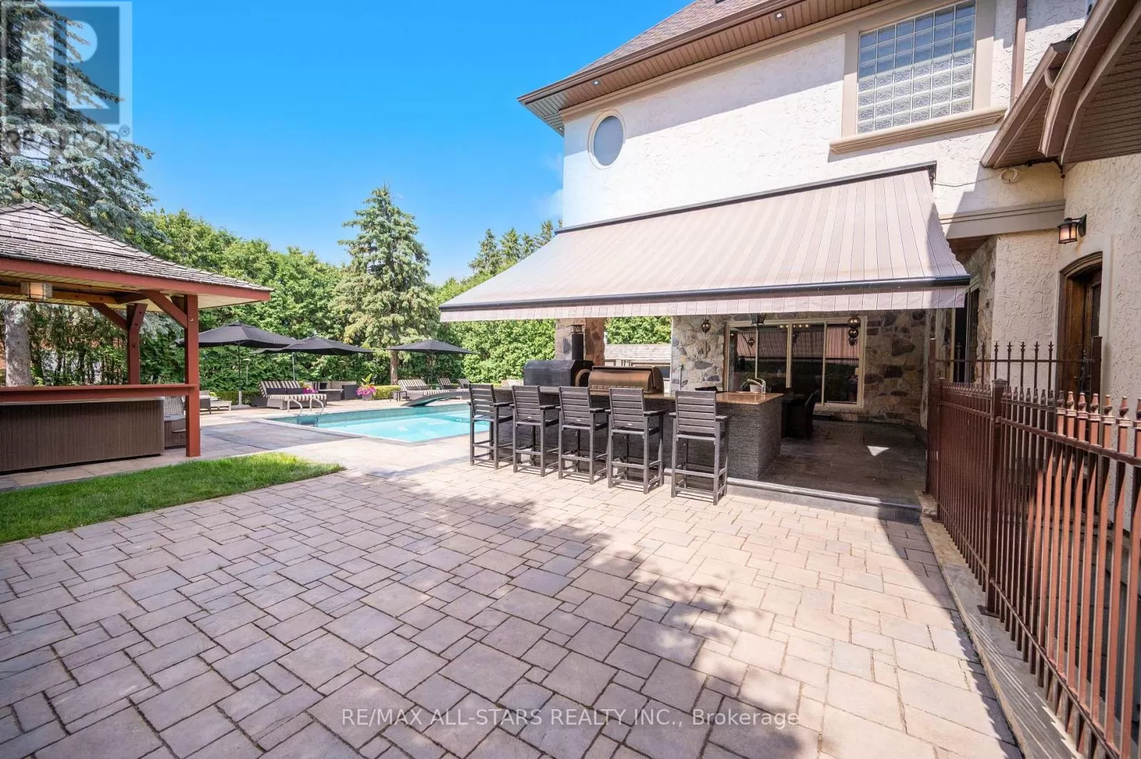 Cross Streets: Kennedy & Highway 7. ** Directions: West of Main Street Unionville (Aprox 5 Minute Walk). Welcome home to 32 Wembley Avenue, a crown jewel within the prestigious and highly sought-after Unionville community that perfectly blends luxury, lifestyle & location. This architecturally refined French Chateau-inspired custom residence is nestled on an ultra-private 100 ft x 232 ft lot and is ideally located just steps to Toogood Pond and the enchanting shops & restaurants of charming Main Street. Proudly offered by it's original owners, this meticulously kept and inviting family home was designed for longevity, style & comfort. It was selected as the cover feature article in The Good Life Magazine, titled "Practical elegance in Old Unionville". This spectacular residence showcases timeless elegance blended w/modern touches. The exterior boasts a natural stone and stucco façade with copper accents and artisan-crafted oak & walnut doors as well as a 3-car garage. The pristine grounds feature professional landscaping including an oversized limestone waterfall, a large covered terrace with cedar ceilings, a large extra-deep pool with walk-over arch, an outdoor kitchenette and bar, a gazebo with a jacuzzi tub, a cabana bathroom, an outdoor shower+++ True resort-style living at it's best! Step inside this impeccably crafted home to find an inviting cathedral foyer and grand living spaces with soaring, beamed and custom-detailed ceilings including a sun-flooded and airy family room with custom built-ins & a sleek gas fireplace overlooking the backyard; A gourmet, modern, family-sized eat-in kitchen w/top of the line appliances; 5 +1 generous-sized bedrooms including a primary suite with vaulted & beamed ceilings as well as a jaw-dropping modern ensuite; A one-of-a-kind, ultimate entertainment loft w/private entrance, dramatic16-ft vaulted ceilings w/architectural & barn-wood accents, a retractable glass garage door, a glass balcony, a built-in DJ booth, pro party lighting, a custom wet bar w/a keg tap & bar seating for 8++ See https://32wembleyave.com/nb/! (id:27476)