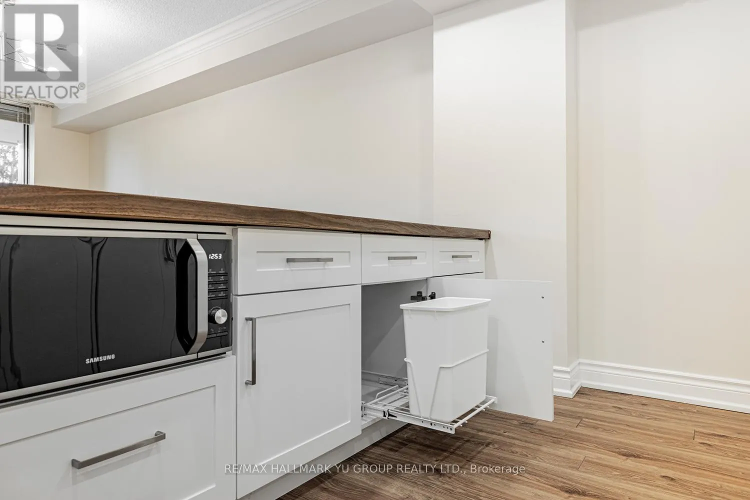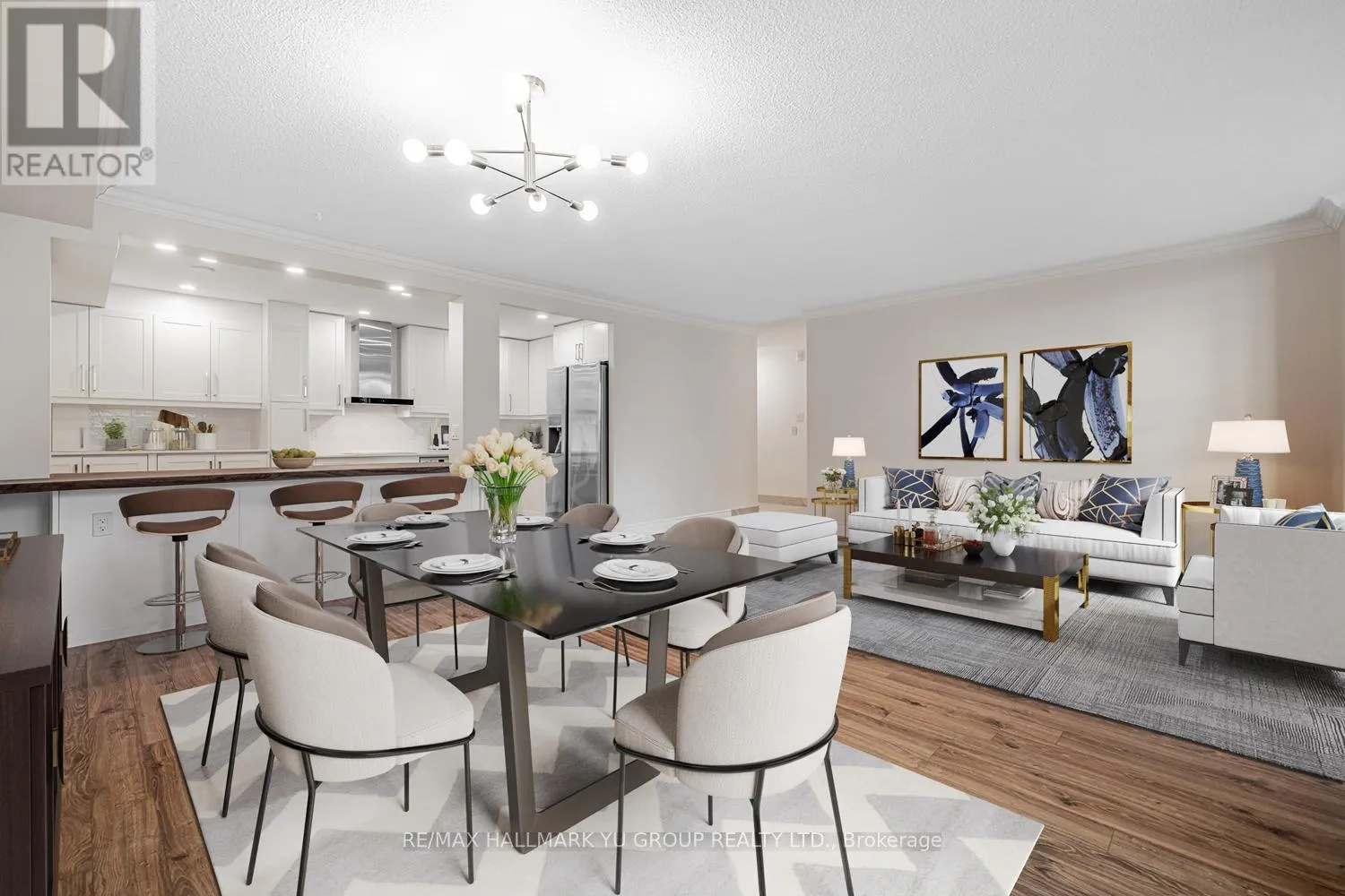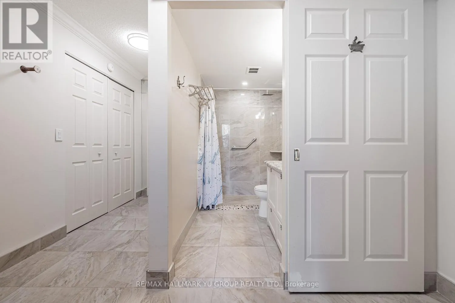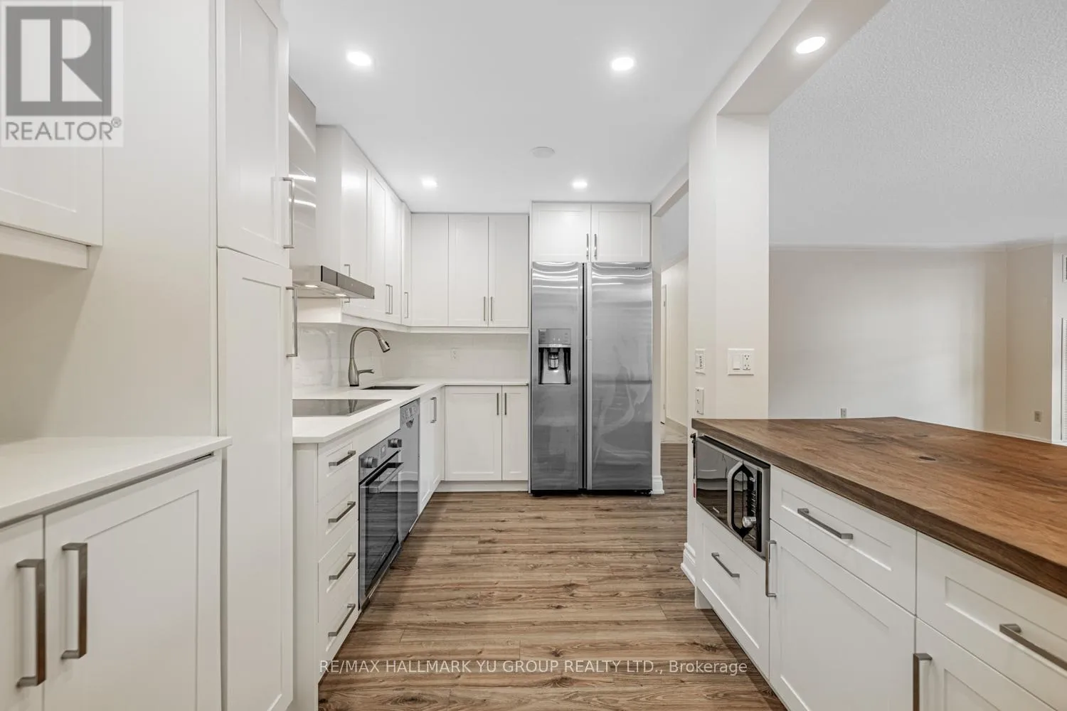 Cross Streets: Yonge & Royal Orchard. ** Directions: E of Yonge & S of Royal Orchard. Beautifully updated 2-bedroom, 1.5 bathroom suite designed with comfortable, barrier-free living in mind. The bright, white, modern kitchen features stainless steel appliances and rare side-by-side laundry, pull-out drawers and a magic corner for easy reach, with a wide pass-through that opens directly to the living/dining area for an airy, open-concept feel. This suite was purposefully designed for wheelchair-friendly living: widened door frames, sliding barn doors, support handles, smooth transitions between rooms, and accessibility-enhanced bathrooms. Storage is exceptional, including 2 custom walk-in closets - a beautifully finished closet off the foyer with full millwork and pull-down rods, plus an upgraded walk-in closet in the primary bedroom with organizers and pull-down hardware. Residents enjoy the building's billiards, table tennis, and hobby rooms, along with access to the nearby Orchard Club for an indoor pool, fitness room, and additional shared amenities. Includes 1 parking space and the converted ensuite locker (now the custom walk-in closet off the foyer). A unique, well-updated suite in a quiet Thornhill community, steps to Yonge St, close to parks, transit, and everyday essentials. Don't miss the cinematic video to see the barrier-free features in action. (id:27476)