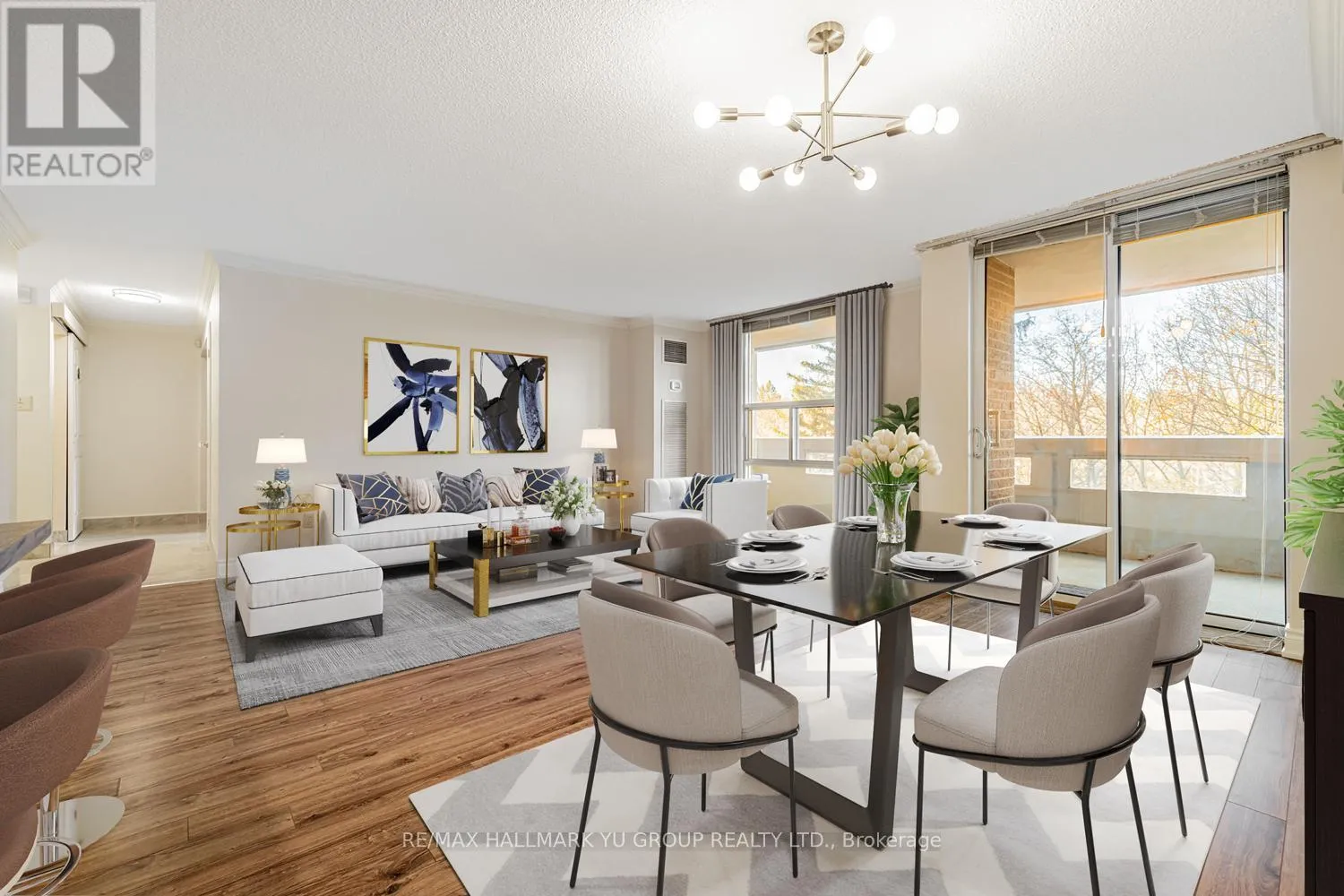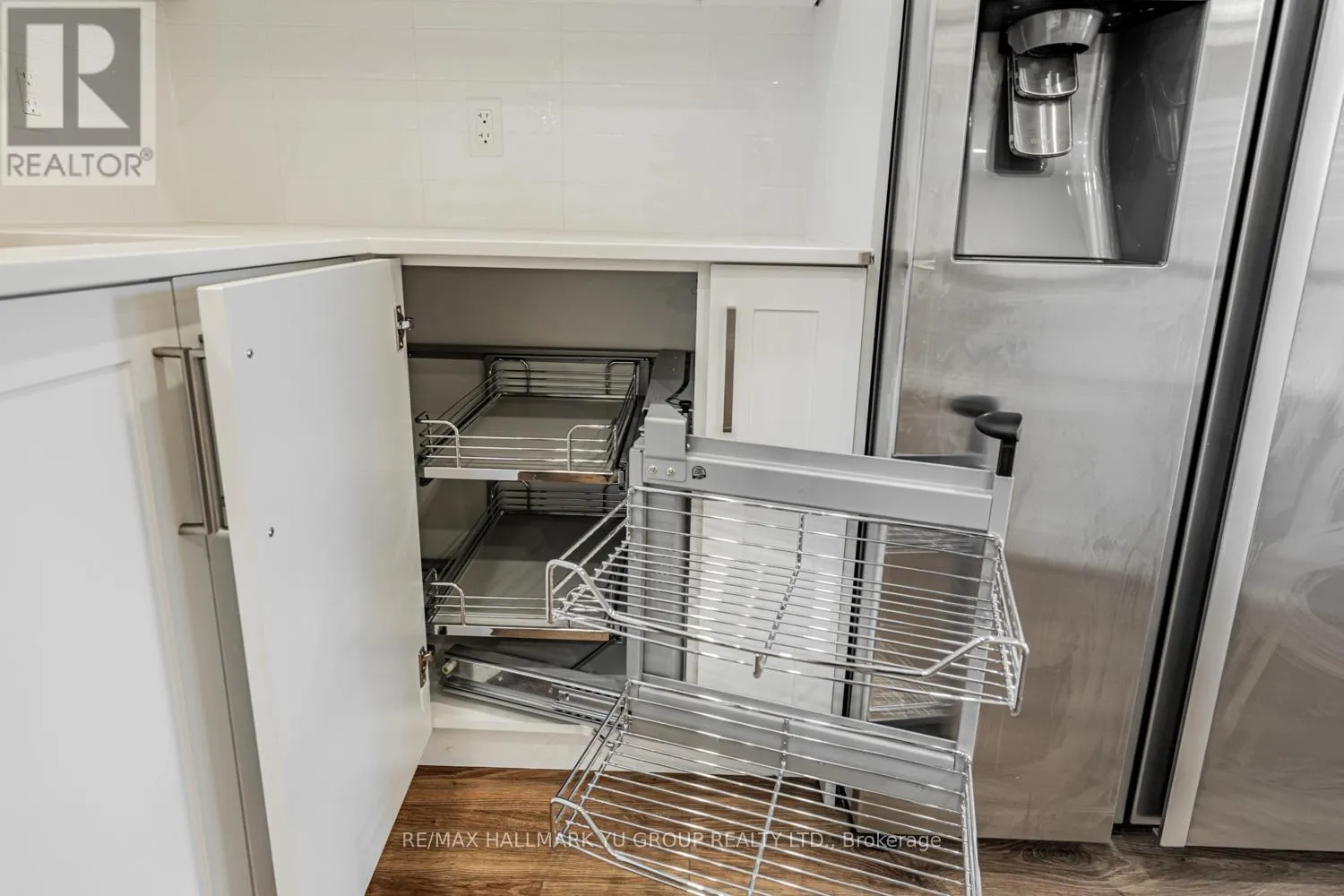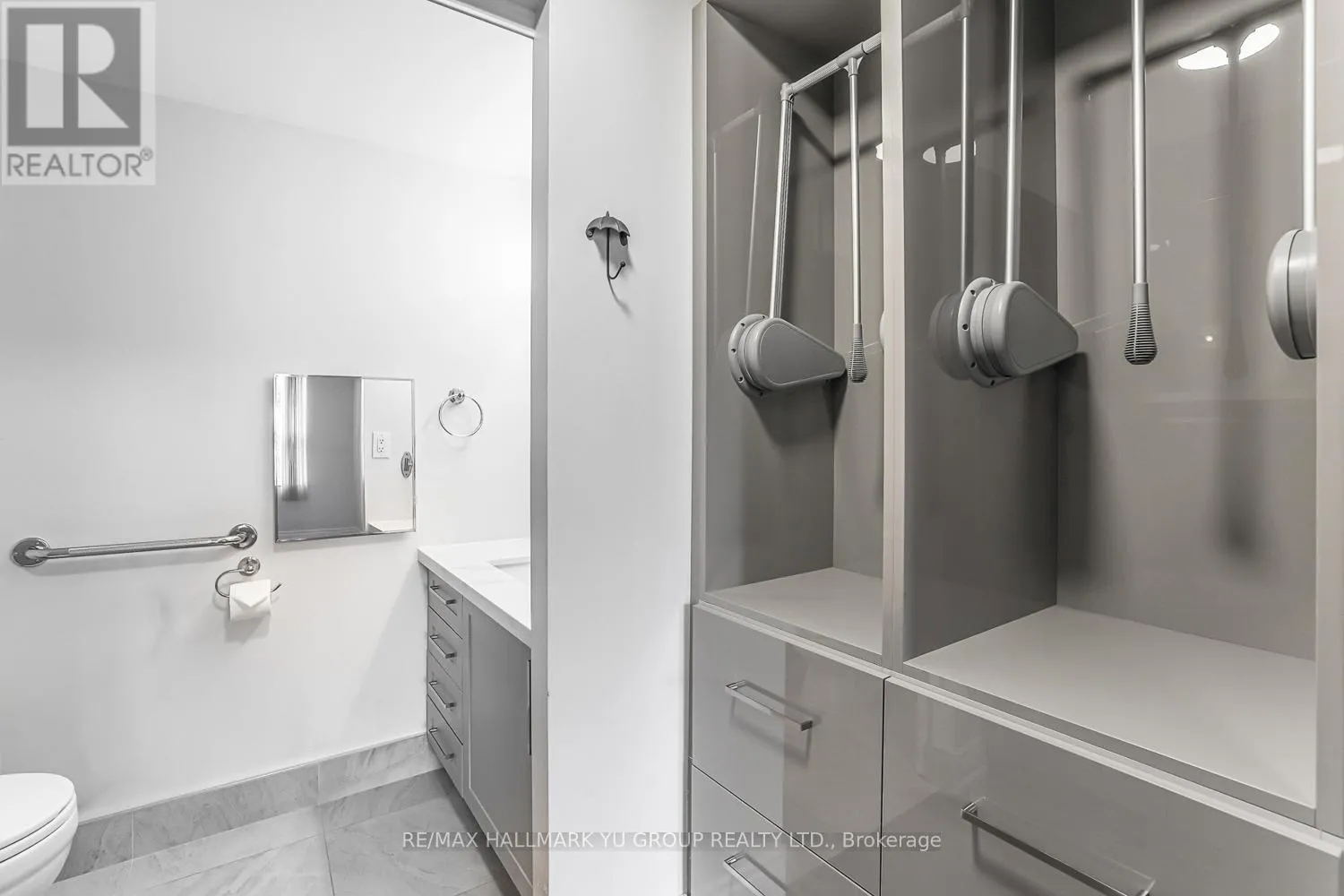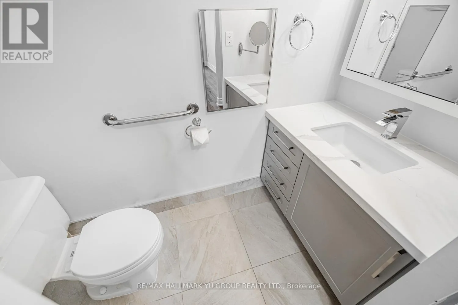 Cross Streets: Yonge & Royal Orchard. ** Directions: E of Yonge & S of Royal Orchard. Beautifully updated 2-bedroom, 1.5 bathroom suite designed with comfortable, barrier-free living in mind. The bright, white, modern kitchen features stainless steel appliances and rare side-by-side laundry, pull-out drawers and a magic corner for easy reach, with a wide pass-through that opens directly to the living/dining area for an airy, open-concept feel. This suite was purposefully designed for wheelchair-friendly living: widened door frames, sliding barn doors, support handles, smooth transitions between rooms, and accessibility-enhanced bathrooms. Storage is exceptional, including 2 custom walk-in closets - a beautifully finished closet off the foyer with full millwork and pull-down rods, plus an upgraded walk-in closet in the primary bedroom with organizers and pull-down hardware. Residents enjoy the building's billiards, table tennis, and hobby rooms, along with access to the nearby Orchard Club for an indoor pool, fitness room, and additional shared amenities. Includes 1 parking space and the converted ensuite locker (now the custom walk-in closet off the foyer). A unique, well-updated suite in a quiet Thornhill community, steps to Yonge St, close to parks, transit, and everyday essentials. Don't miss the cinematic video to see the barrier-free features in action. (id:27476)