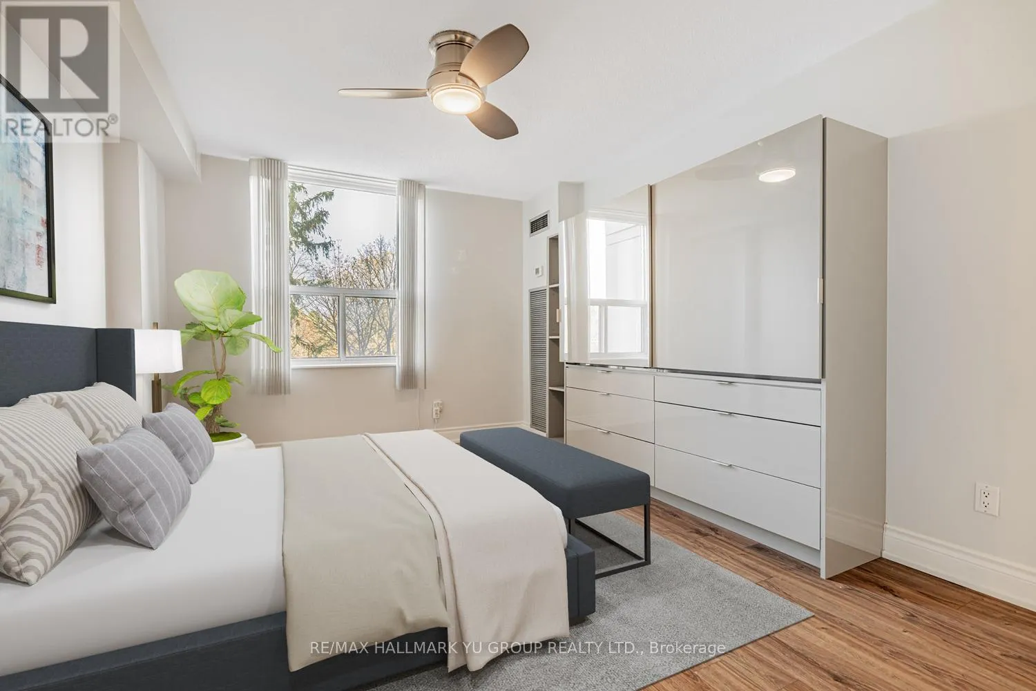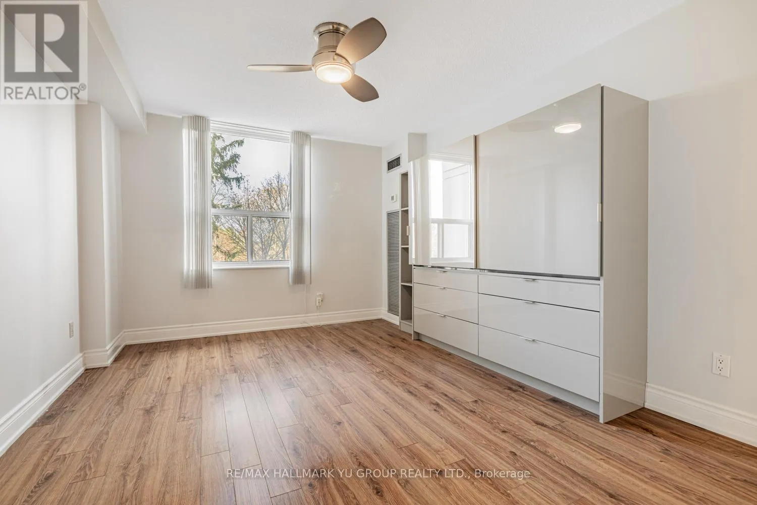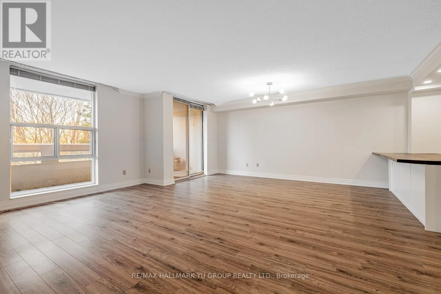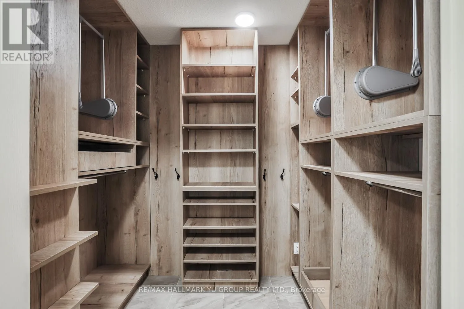Cross Streets: Yonge & Royal Orchard. ** Directions: E of Yonge & S of Royal Orchard. Beautifully updated 2-bedroom, 1.5 bathroom suite designed with comfortable, barrier-free living in mind. The bright, white, modern kitchen features stainless steel appliances and rare side-by-side laundry, pull-out drawers and a magic corner for easy reach, with a wide pass-through that opens directly to the living/dining area for an airy, open-concept feel. This suite was purposefully designed for wheelchair-friendly living: widened door frames, sliding barn doors, support handles, smooth transitions between rooms, and accessibility-enhanced bathrooms. Storage is exceptional, including 2 custom walk-in closets - a beautifully finished closet off the foyer with full millwork and pull-down rods, plus an upgraded walk-in closet in the primary bedroom with organizers and pull-down hardware. Residents enjoy the building's billiards, table tennis, and hobby rooms, along with access to the nearby Orchard Club for an indoor pool, fitness room, and additional shared amenities. Includes 1 parking space and the converted ensuite locker (now the custom walk-in closet off the foyer). A unique, well-updated suite in a quiet Thornhill community, steps to Yonge St, close to parks, transit, and everyday essentials. Don't miss the cinematic video to see the barrier-free features in action. (id:27476)