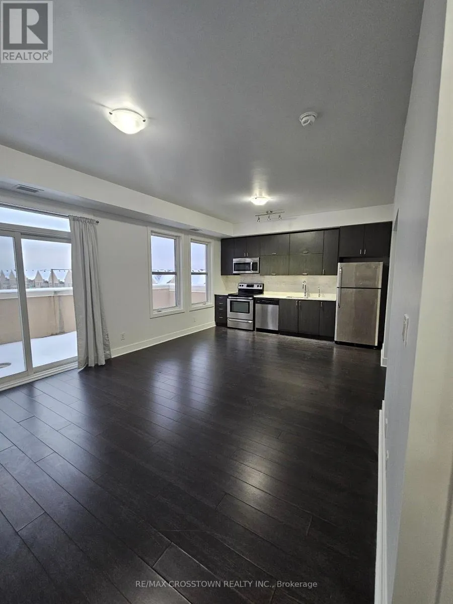 Woodbine & Major Mackenzie Welcome to this highly sought-after Garden Court condominium in the prestigious Cathedraltown community of Markham. This bright and spacious penthouse offers over 850 square feet of thoughtfully designed living space, featuring two generously sized bedrooms, each with extra-large closets. The unit boasts a beautifully upgraded modern kitchen with stainless steel appliances and granite countertops, along with a stylishly renovated bathroom. Quality laminate flooring throughout and soaring 9-foot ceilings create an open, airy ambiance. The convenience of ensuite laundry adds everyday comfort. Step out onto the impressive private terrace, offering over 200 square feet of outdoor living space with breathtaking, unobstructed views-ideal for relaxing or entertaining. The unit also includes one underground parking spot and a large storage locker. Residents enjoy premium building amenities including concierge security, an on-site car wash, a party/meeting room, and a community BBQ area. Ideally located just minutes from Highways 404 and 407, and close to parks, shopping, and all essential amenities. (id:27476)