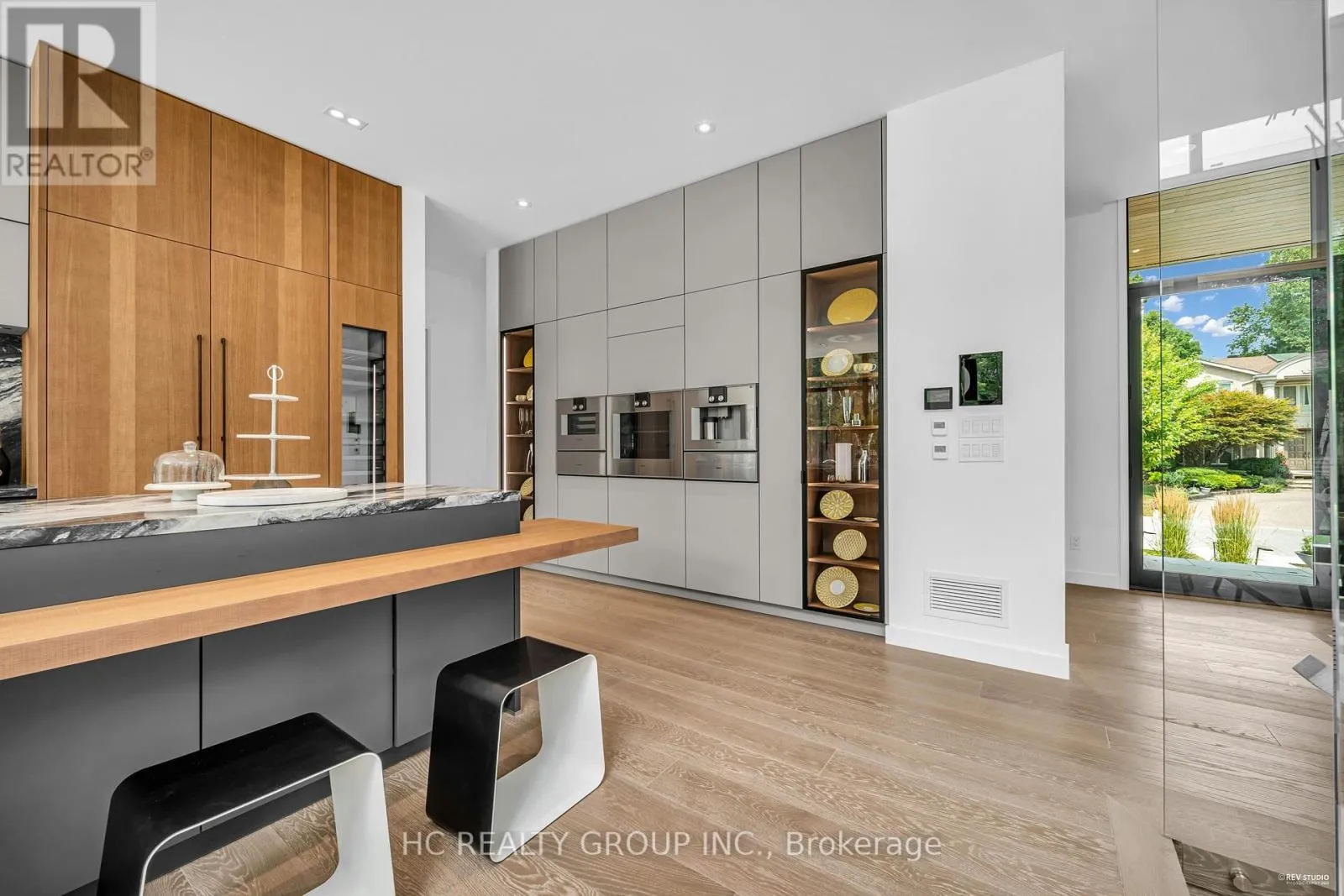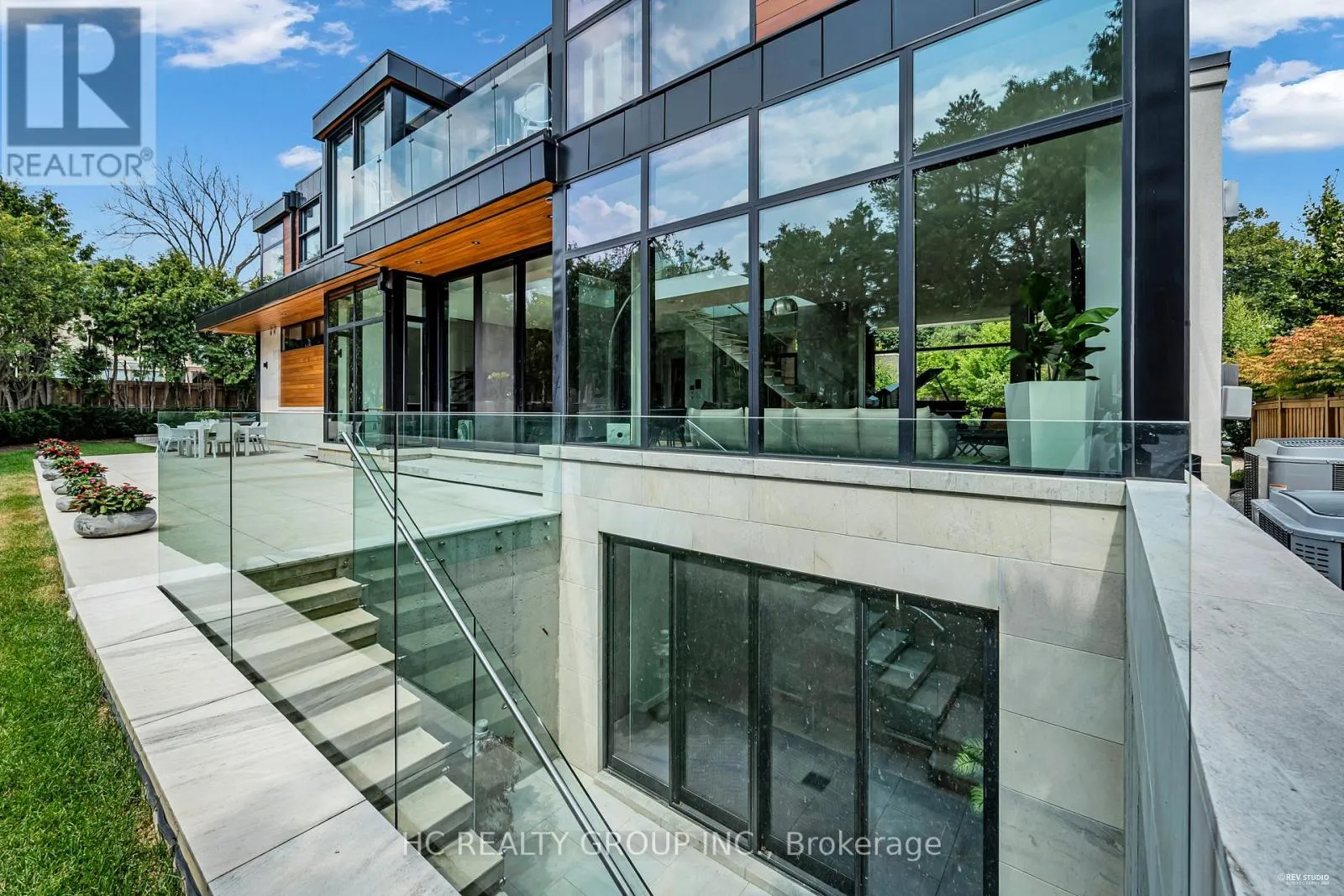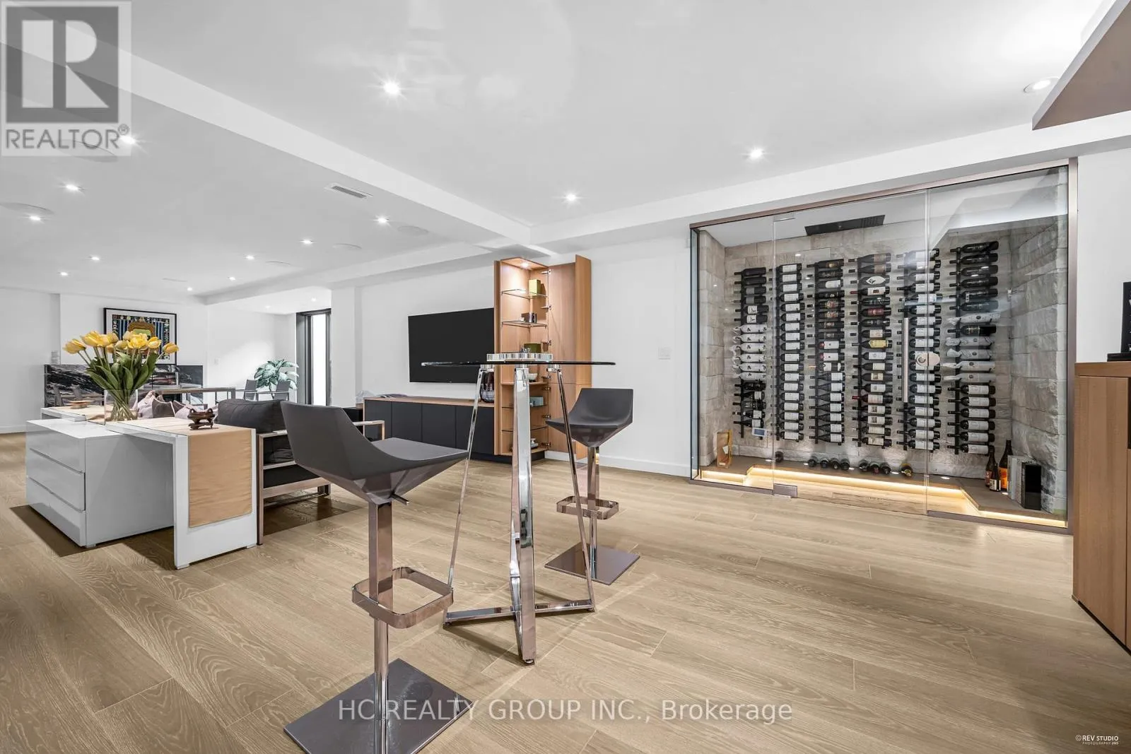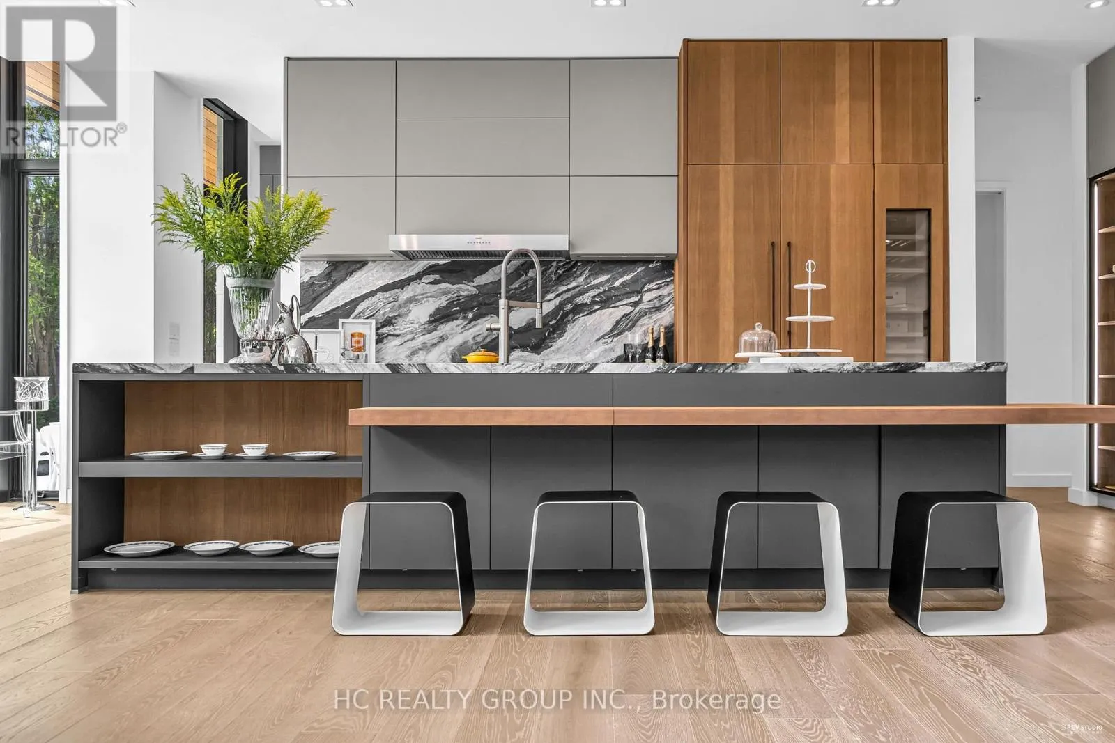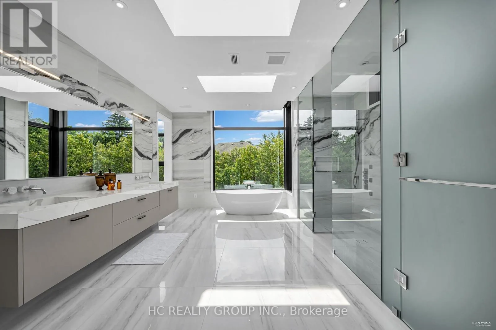 Cross Streets: Bayview Ave/ Steeles Ave E. ** Directions: google Map. An extraordinary modern estate of distinction, privately set on a tranquil cul-de-sac on a rare 107.34 foot frontage lot, showcasing a refined interplay of glass, stone, and light. Designed by award-winning architect David Small, the residence features polished Ontario white marble, European aluminum-clad wood windows, and professionally landscaped grounds with mature evergreens, integrated outdoor elements, and a full irrigation system. A generous three-car garage with extra-high ceilings accommodates vehicle lifts. The main level offers a guest bedroom and a gourmet kitchen with top-tier appliances and a walk-in pantry, complemented by radiant heated floors, wide-plank European white oak, floor-to-ceiling windows, and a striking 23-foot dining room ceiling with sculptural chandelier. Floating stairs with sleek glass railings elegantly connect all levels. The upper level presents a lounge, office, and four ensuite bedrooms, including a luxurious primary retreat with a spa-inspired ensuite featuring heated floors, dual custom marble-lite floating sinks, and an expansive dressing room with premium custom cabinetry and integrated LED lighting. The lower level is designed for elevated living, featuring a recreation room, climate-controlled wine cellar, nanny suite, and fitness room. Over $500,000 in premium custom German cabinetry throughout the home unifies the interiors with exceptional craftsmanship, modern elegance, and refined luxury. (id:27476)
