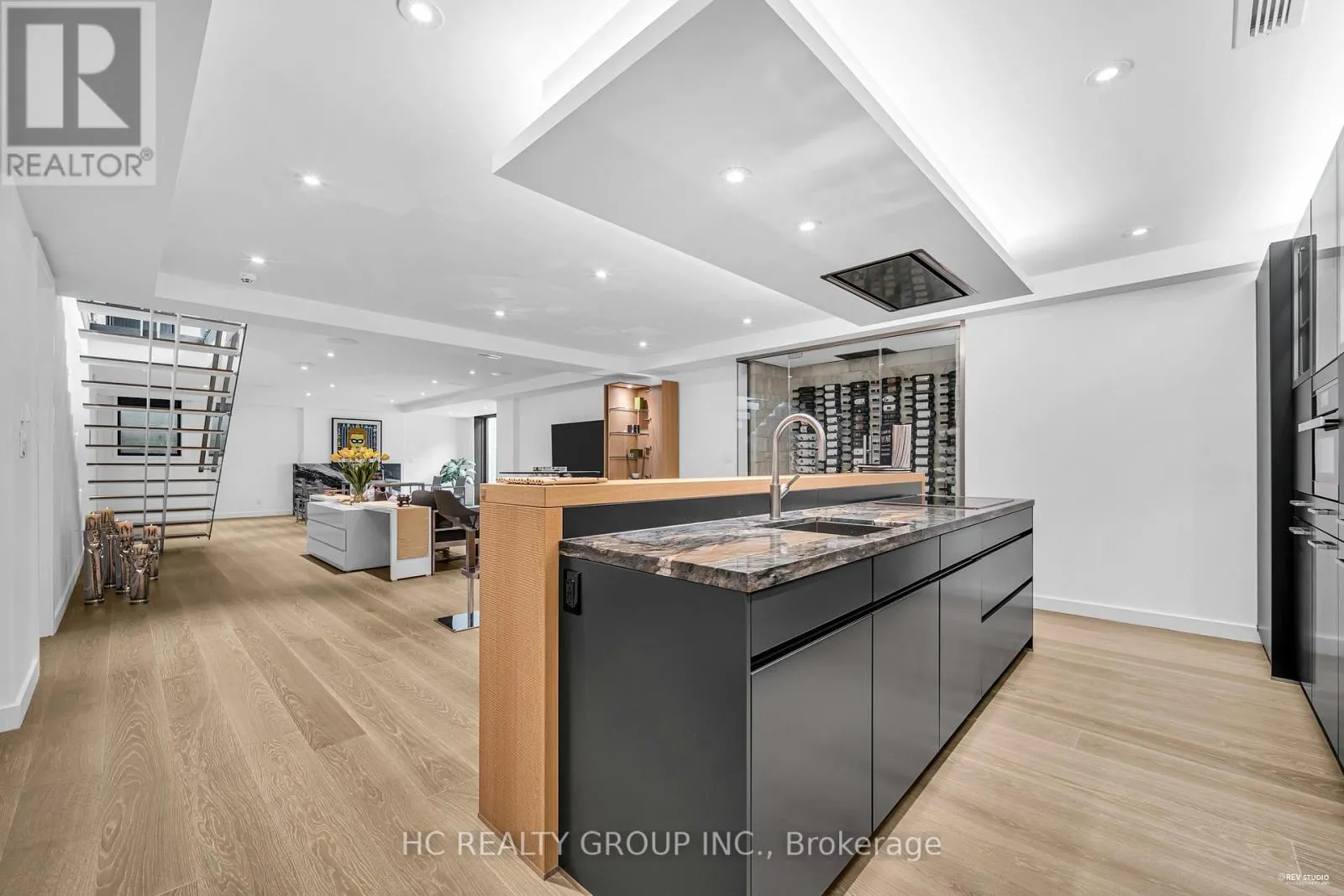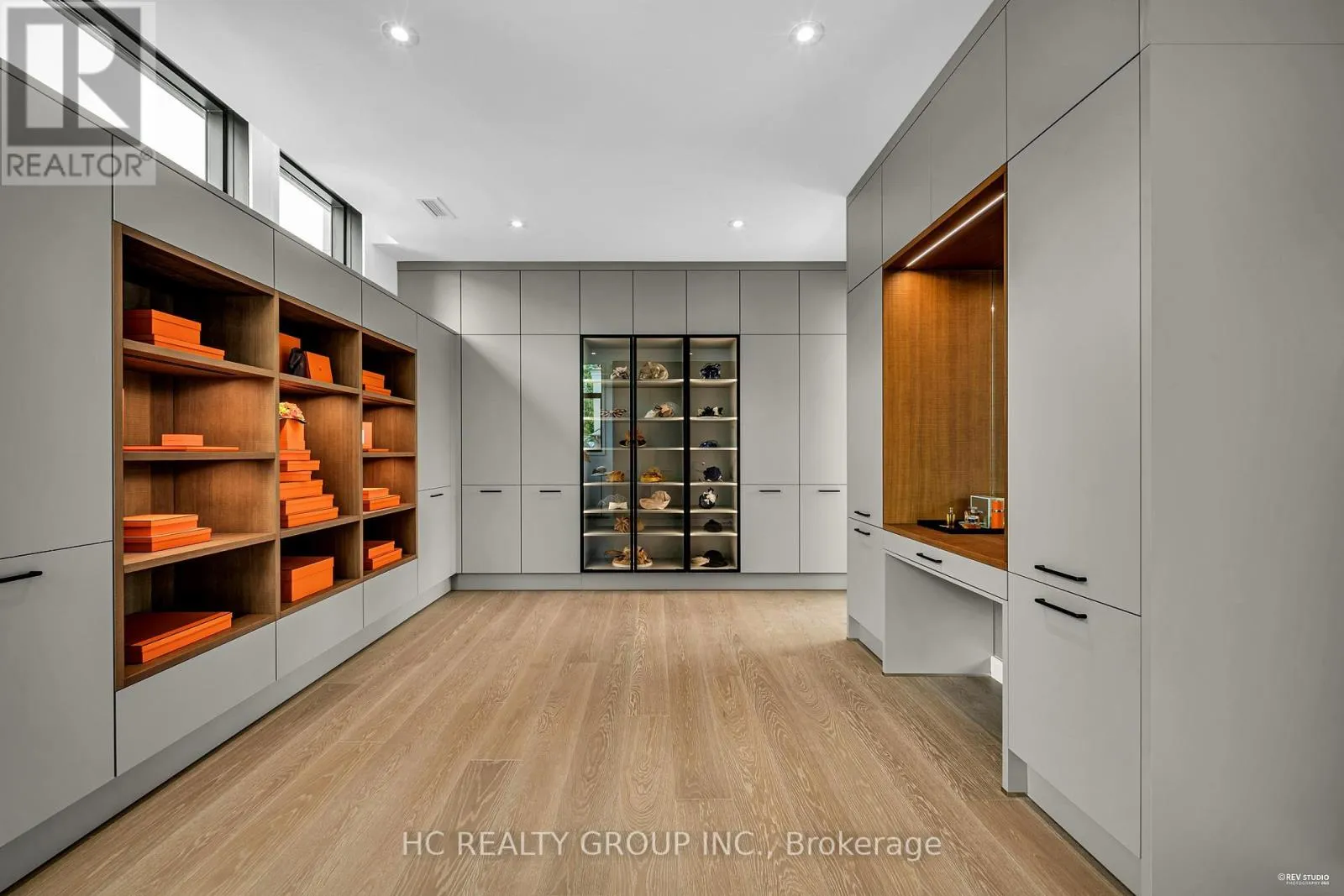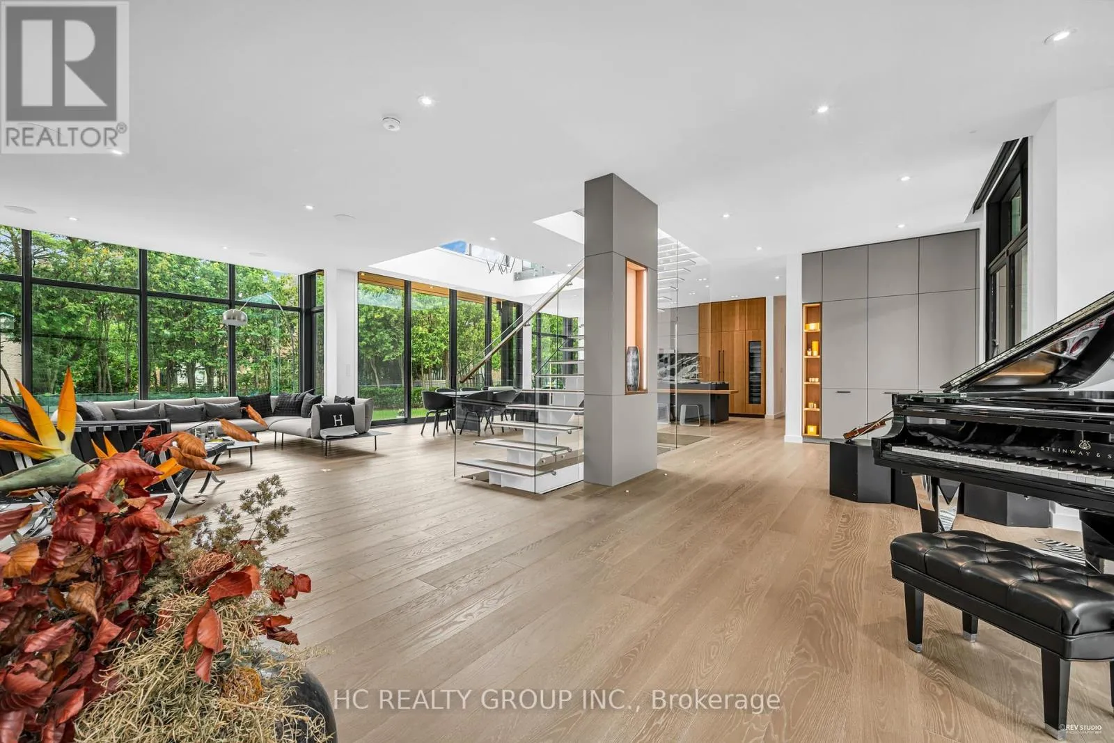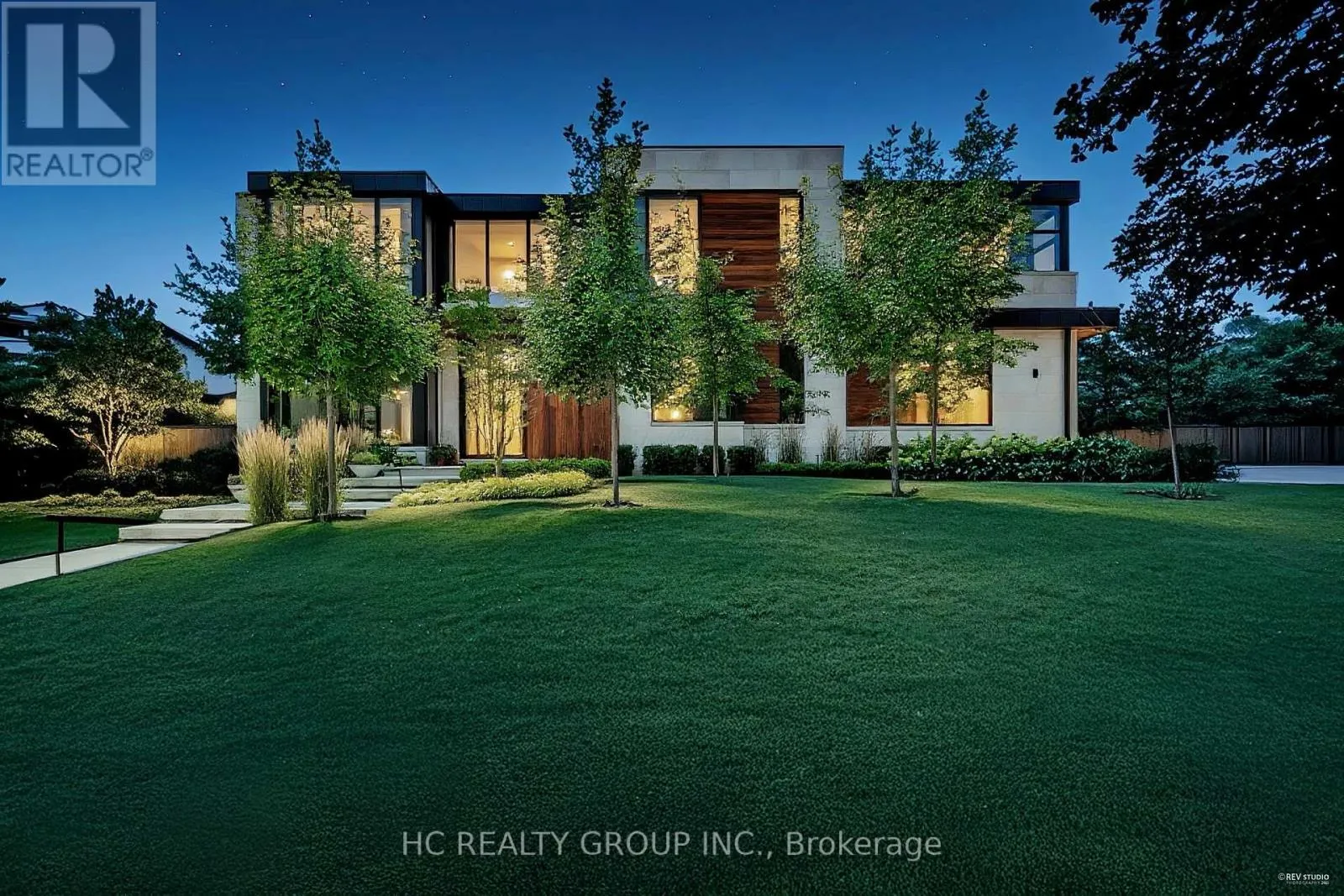 Cross Streets: Bayview Ave/ Steeles Ave E. ** Directions: google Map. An extraordinary modern estate of distinction, privately set on a tranquil cul-de-sac on a rare 107.34 foot frontage lot, showcasing a refined interplay of glass, stone, and light. Designed by award-winning architect David Small, the residence features polished Ontario white marble, European aluminum-clad wood windows, and professionally landscaped grounds with mature evergreens, integrated outdoor elements, and a full irrigation system. A generous three-car garage with extra-high ceilings accommodates vehicle lifts. The main level offers a guest bedroom and a gourmet kitchen with top-tier appliances and a walk-in pantry, complemented by radiant heated floors, wide-plank European white oak, floor-to-ceiling windows, and a striking 23-foot dining room ceiling with sculptural chandelier. Floating stairs with sleek glass railings elegantly connect all levels. The upper level presents a lounge, office, and four ensuite bedrooms, including a luxurious primary retreat with a spa-inspired ensuite featuring heated floors, dual custom marble-lite floating sinks, and an expansive dressing room with premium custom cabinetry and integrated LED lighting. The lower level is designed for elevated living, featuring a recreation room, climate-controlled wine cellar, nanny suite, and fitness room. Over $500,000 in premium custom German cabinetry throughout the home unifies the interiors with exceptional craftsmanship, modern elegance, and refined luxury. (id:27476)