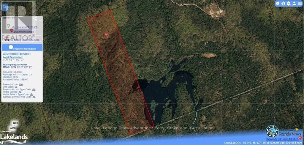 McDougall Rd, right on Hurdville Rd, right on Blackwater Rd, right on Fishers Rd. Park @ roundabout, follow unopened road allowance approx. 3km. Trail rough in spots. Walk in/offroad vehicle. Trail does not follow road allowance in some places. Calling all nature lovers, hunters and outdoor enthusiasts! Picturesque rural 49.7 acre lot off an unopened road allowance near the Seguin River in the Township of McKellar. Heavily forested, mature mixed wood lot with desirable topography and rural zoning. A pond/marsh on a small portion of the property offers a prime opportunity to view wildlife and a serene setting to relax and enjoy. Build your own oasis in the woods. Ideal for an isolated, natural getaway or for recreational use. A great area for hunting. Numerous signs of game on and around the property including; moose, deer and bear. Several inland lakes and Crown land within close proximity of property. Parry Sound is not far away for groceries and supplies. Access is located off of Fishers Road about 3km down unassumed trail over unopened road allowance. This beautiful forested lot is ready for hunting or your secluded, natural getaway. Call today for details. (id:27476)