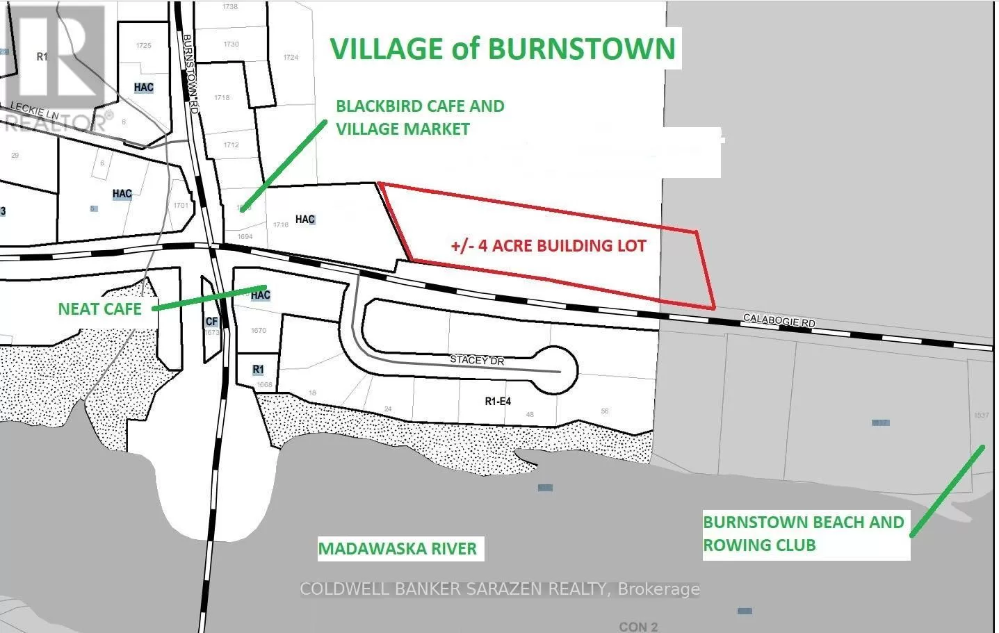 Head West on ON-417 and heading towards North Bay, Bear right onto ON-17 W, Take the ramp on the right for County Rd-54 and head towards Braeside/Glasgow Station, turn left onto Calabogie Rd. Drive for around 8Km. The Lot will be on the Right. Awaiting your imagination! This oversized lot has tons of potential and has limitless possibilities. With a stones throw away from so many amazing and unique amenities. Across the road is your choice of the ever so popular Burnstown Beach and or the very cool eatery the Neat Cafe. The property butts up to Cafe Laurent where in the summer you can enjoy some premium ice cream or just enjoy a Good cup of coffee. The Village Market is a short walk away featuring local food products and giftware from local artisans. Located beside the market you'll find casual fine dining at the popular Blackbird cafe. The lot is currently going to be zoned residential but this tiny little community would definitely consider turning this into a commercial spot. Please do not walk this property without booking a showing first. But the Seller has not only marked it super well but has also marked a trail where you can walk the majority of the lot. (id:27476)