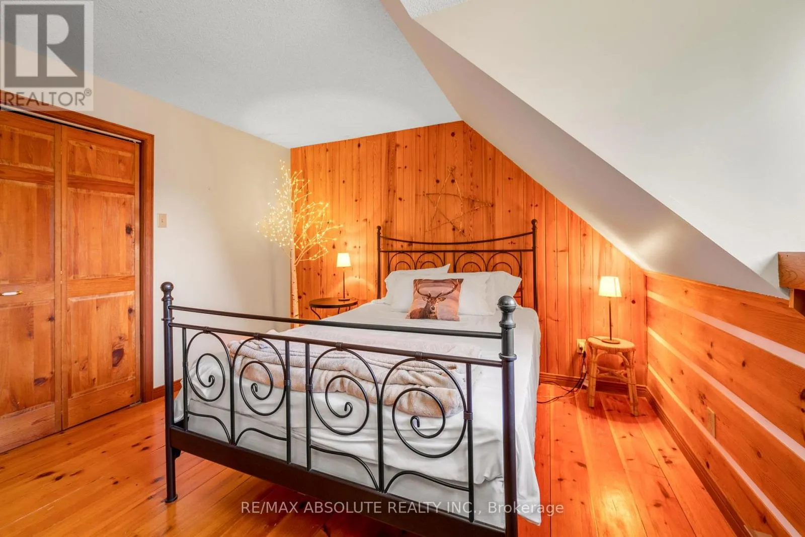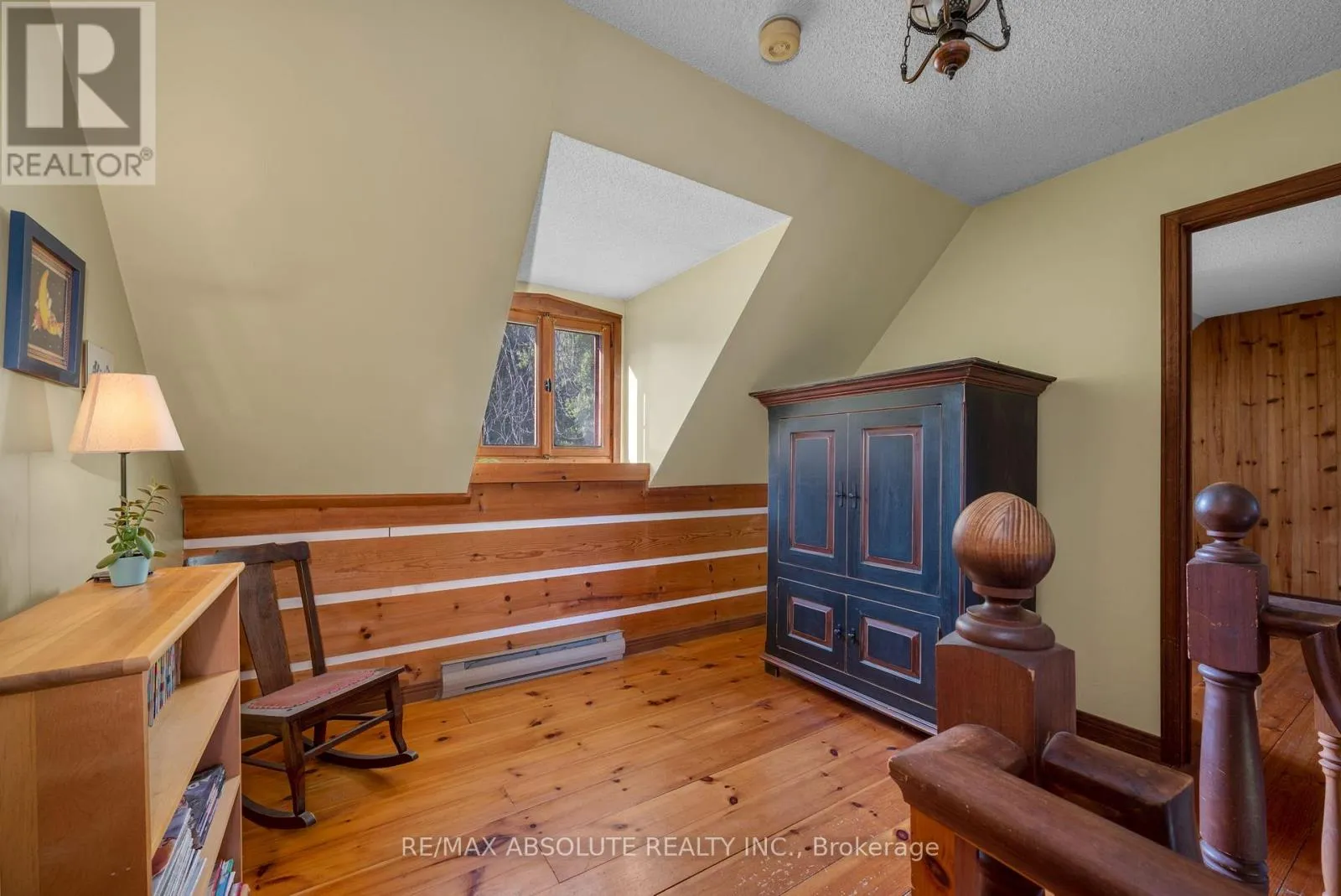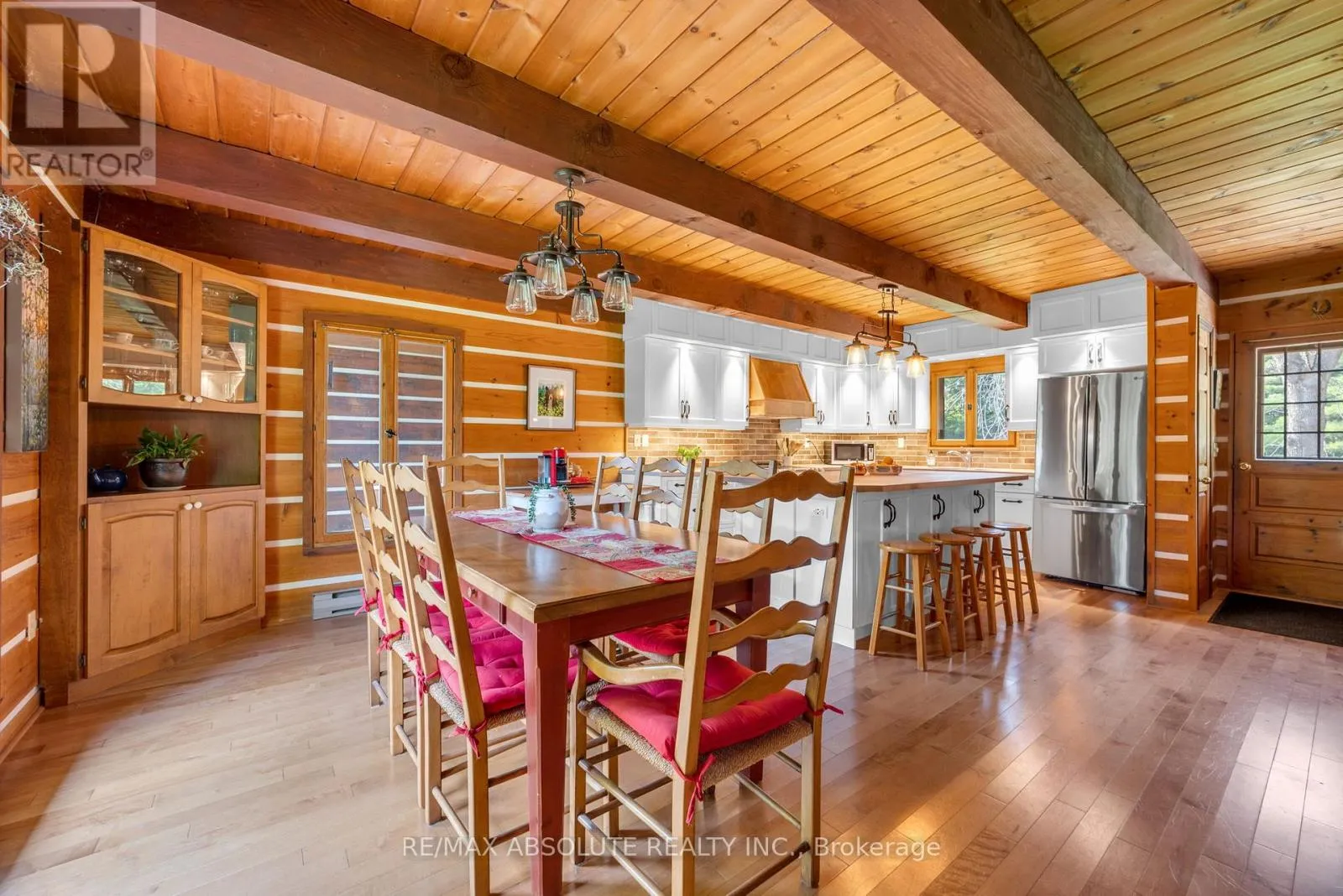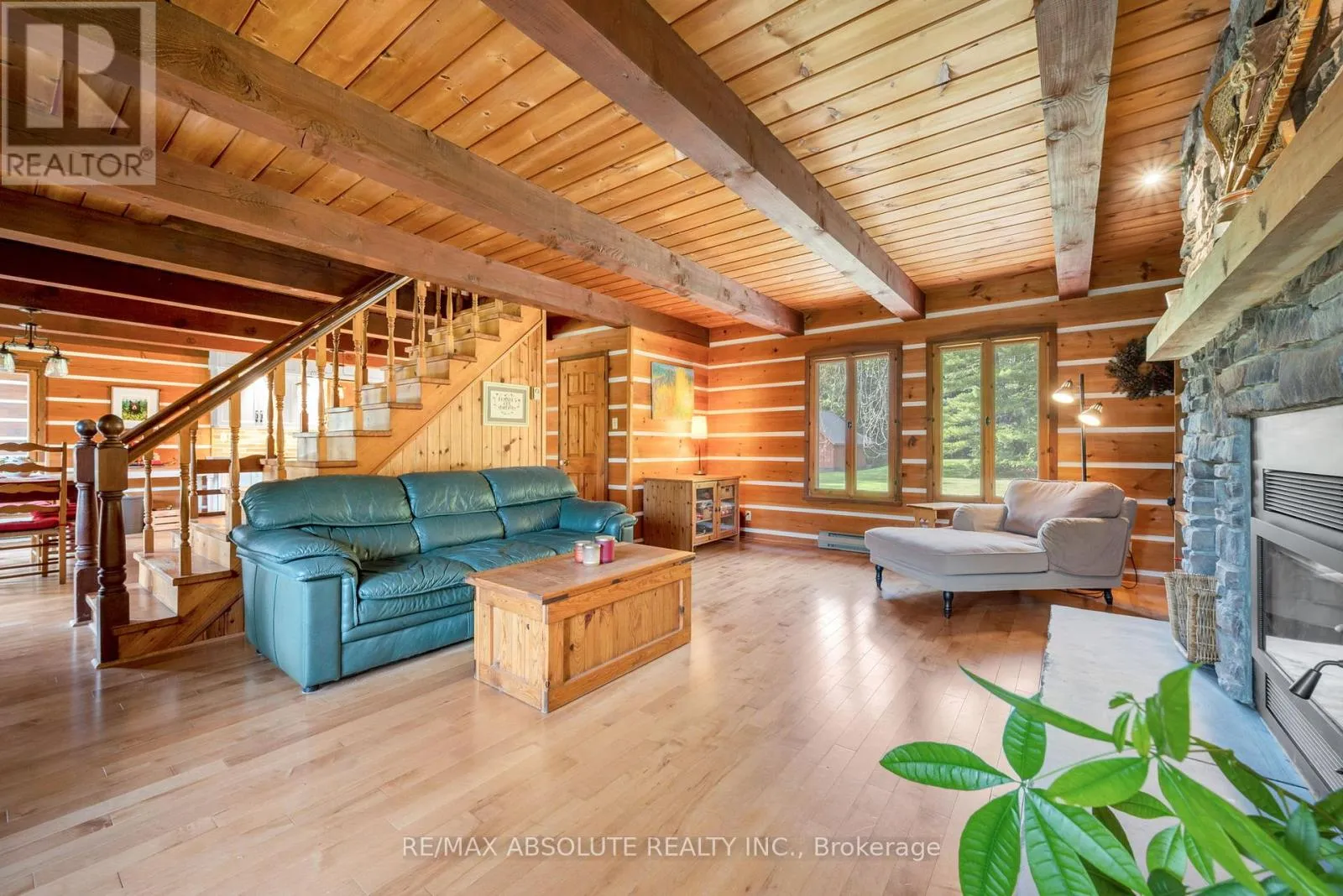 Hwy 417 West to Arnprior, exit Madawaska Blvd, Madawaska Blvd becomes Elgin St which becomes River Road-Once in Braeside turn left on Dochart St. make first right on Burns. Home on right hand side Charming log home on 1.99 acres in Braeside offering 3 bedrooms, 2.5 bathrooms, a versatile bonus room above the garage, a large barn, and a lean-to, with a balance of mature trees and cleared space; enter through a foyer with coat closet leading to a spacious living room with wood-burning stove, newly updated kitchen with ample cabinetry, quartz counters, large island with bar seating for four, pot and pan drawers, undermount sink at window, and adjoining dining room with space for family table and buffet; main floor powder room; upstairs features a primary bedroom with ample closet space and ensuite with vanity, toilet, and tub/shower with ceramic surround plus additional closet space; two secondary bedrooms with ample closets share a full bathroom with tub/shower, ceramic surround and toilet, which also connects to a laundry room with utility sink and storage; the bonus room above the garage provides flexibility for a family room, home office, hobby space or extra bedroom with inside access to the garage; finished basement includes a large family room with wood stove, bar area, and storage/utility room; wood heat throughout creates a cozy ambiance; outside enjoy the barn, lean-to, and generous acreage offering privacy and endless possibilities. 24hrs irrevocable on all offers. (id:27476)