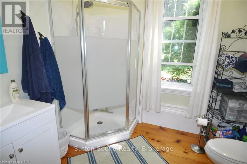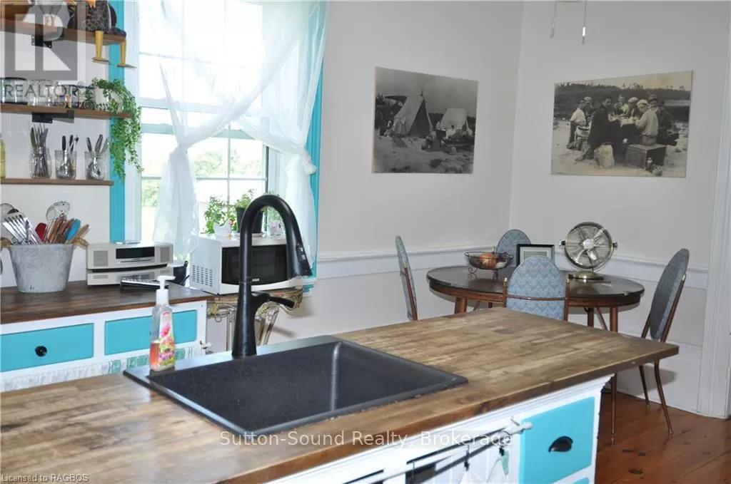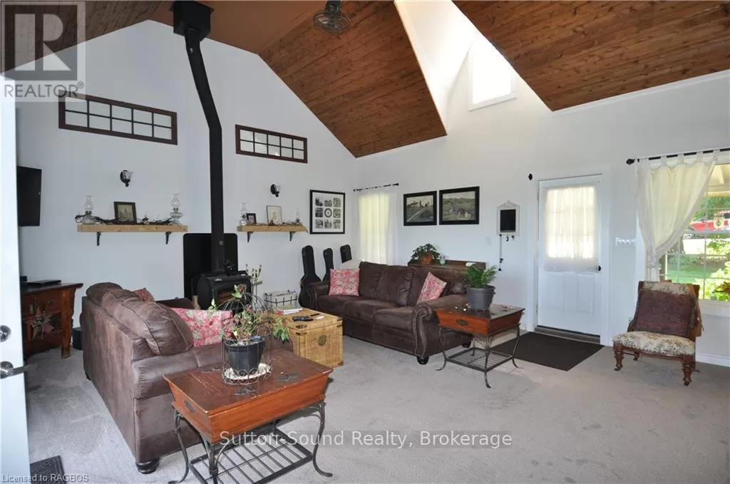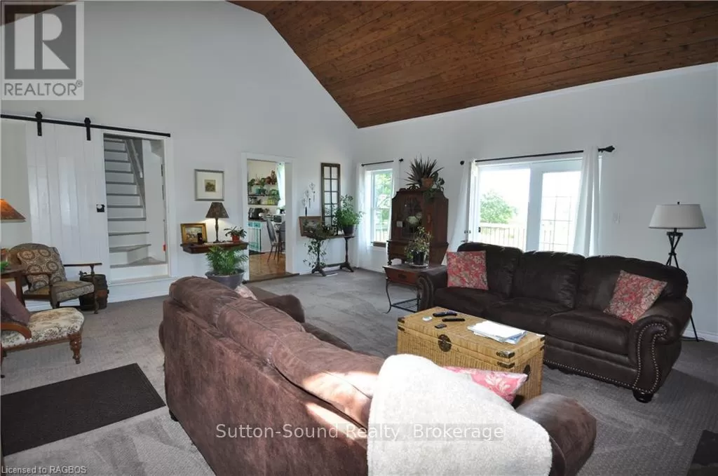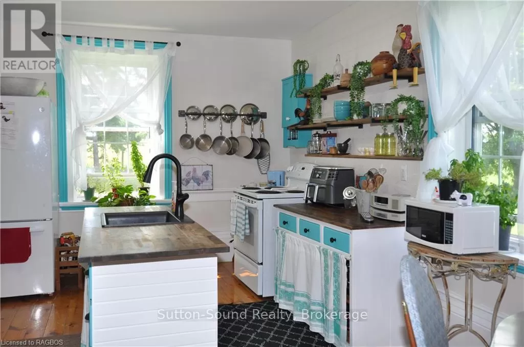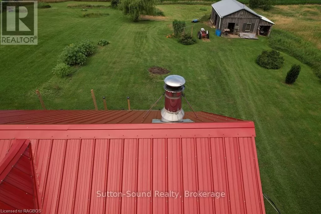 From Meaford Harbour on Georgian Bay, head North on Skykes Street. Continue onto Highway 26 West. Turn Right, following the signs for Coffin Ridge Vineyards & Winery, onto Concession Road 2 North. Farmhouse will be on your Left with the red roof. Discover serenity in this meticulously restored century farmhouse nestled on nearly 4 acres of picturesque countryside, with the majestic Niagara Escarpment as your backdrop and Coffin Ridge Vineyards & Boutique Winery as your esteemed neighbor. Perfectly blending rustic charm with modern elegance, this property is a haven for both relaxation and hobby farming enthusiasts. Settle into the warmth of a fully restored farmhouse, where a striking cedar tongue-and-groove cathedral ceiling in the great room frames a cozy wood-burning fireplace and French doors open onto a sun-drenched deck. The kitchen beckons with contemporary butcher block countertops, industrial accents, and a spacious pantry alongside a charming breakfast nook. Retreat to the tranquility of a main-floor master suite offering privacy and comfort with its own ensuite bathroom. Upstairs, four additional bedrooms and a full bath provide ample space for family and guests, each room offering sweeping views of the expansive landscape. Outdoor enthusiasts will delight in the property's amenities, including a 20x30 barn with hydro service, that at one time had 2 horse stalls, and frost-free hydrant (currently not working), upper and lower pastures, and vibrant perennial gardens. Revel in breathtaking sunset views over Georgian Bay from the deck, or explore the nearby natural beauty atop the Niagara Escarpment. This property offers a secluded retreat while being conveniently near the charming towns of Meaford, Owen Sound skiing at Blue Mountain. Just a short drive away from essential amenities and an easy commute to Kitchener-Waterloo and Toronto, it blends privacy with accessibility. Embrace the essence of the Georgian Bay lifestyle with this extraordinary country estate, where modern comfort meets timeless natural beauty. Don't miss the opportunity to make this dream property your retreat from the everyday hustle and bustle. Seller works all kinds of hours would appreciate 48 hours notice for a showing. (id:27476)