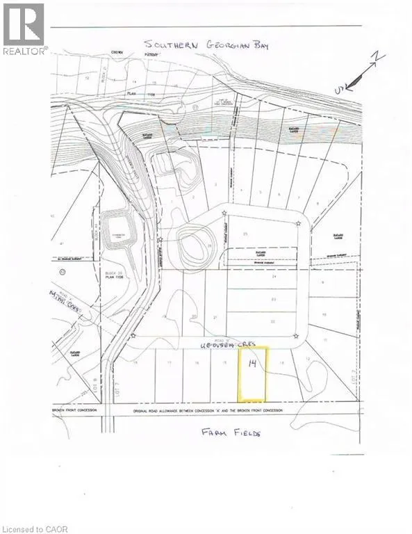 From Meaford: Concession Rd 2 N off Hwy 26, becomes Side road 8, Left on Queen's Bush Drive. From Owen Sound: Grey Rd 15 off Hwy 26, Left onto Side road 8, Left onto Queen's Bush Drive. For more information, please click Brochure button. Lot 14 is situated on a secluded paved crescent within the Municipality of Meaford. Steps to Southern Georgian Bay access and trout fishing on Waterton Creek. Comprising 0.97 acres with 148 ft frontage by 287 ft depth, and a large, slightly elevated building plate. Unobstructed views of hay fields ending with the Escarpment, immerse the owner into quiet nature. Hydro and Bell are buried to preserve the natural beauty of this uniquely modern Scandinavian style community; Rockcliffe Estates. Registered protective covenants on land title. You may use your own builder. 15 minutes to Owen Sound Regional Hospital. 5 minutes to Coffin Ridge Winery. (id:27476)