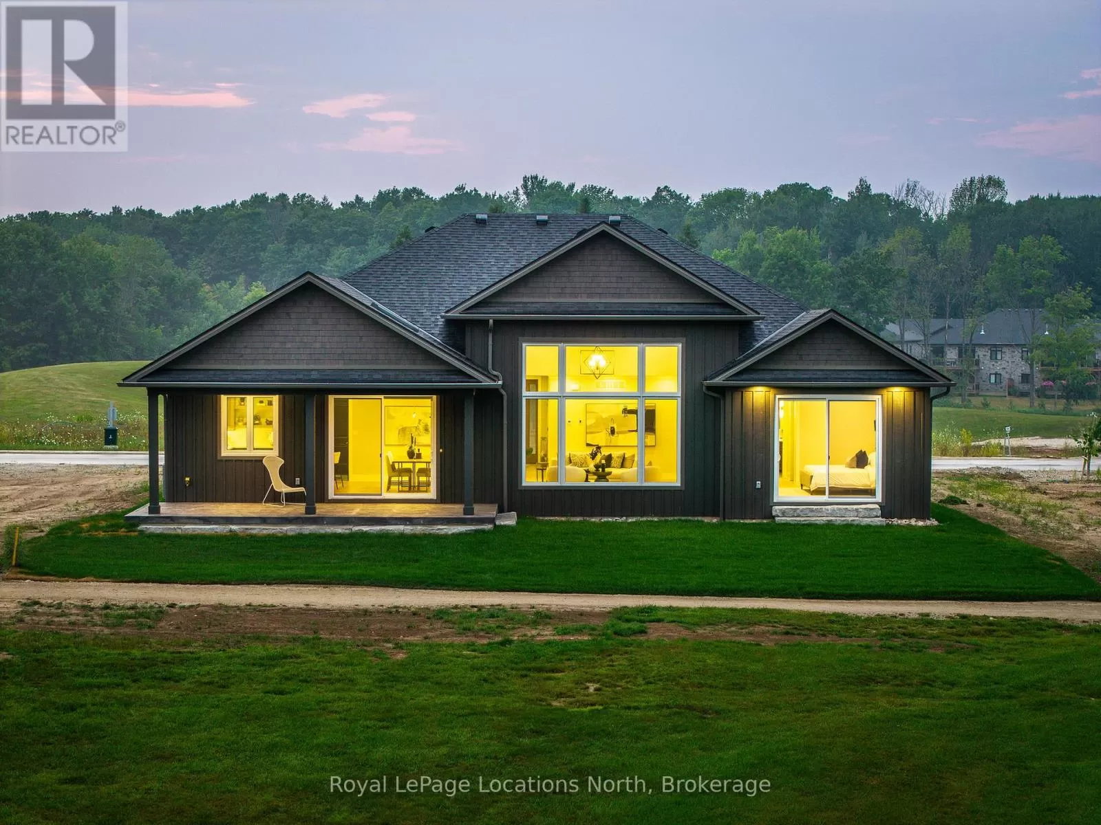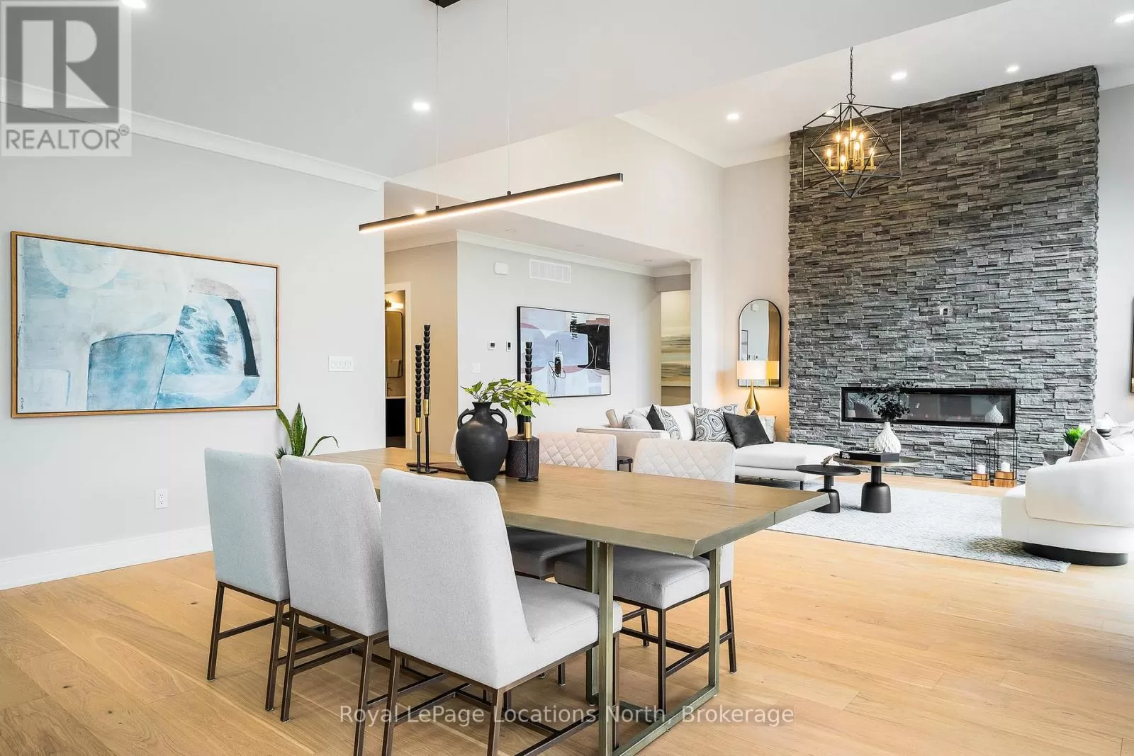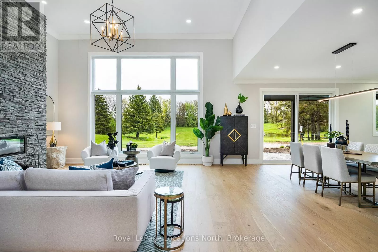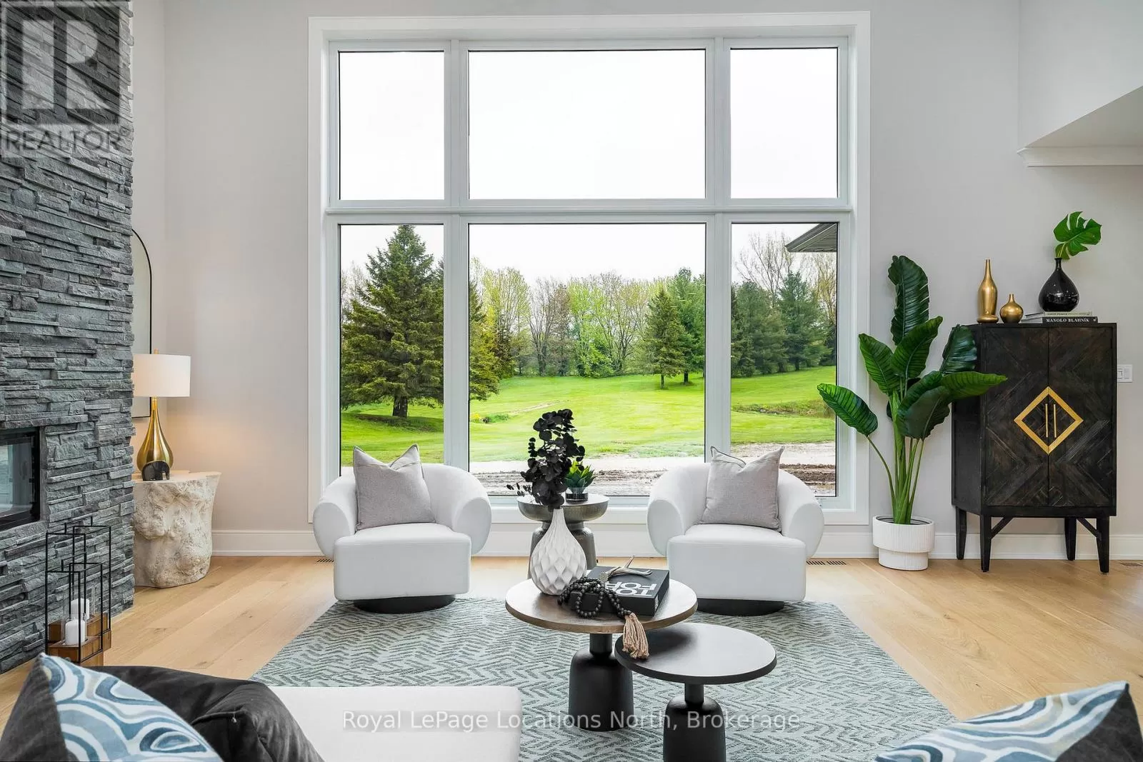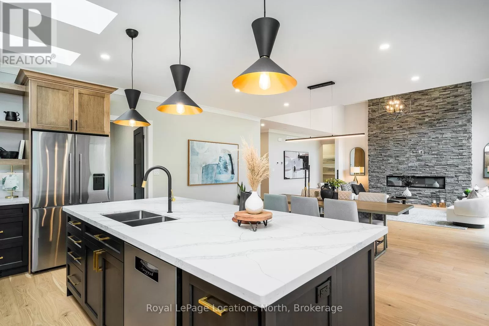 Cross Streets: Ridge Road. ** Directions: Hwy 26/Sykes Street North to Ridge Road to Hilton Lane. Experience the charm of a unique floor plan that makes this golf course bungalow both welcoming and exceptional. With over 2,200 square feet of thoughtfully designed living space, the home feels even more expansive thanks to its spacious front entrance and breathtaking great room. A stunning 14-foot-high stone feature wall anchors the open-concept living area, complemented by an elegant linear fireplace that adds warmth and drama. Many of the design details have been carefully curated by an interior designer to create a warm, earthy palette, featuring two-tone kitchen cabinetry, white oak flooring, and Benjamin Moore paint throughout. Stylish, modern lighting selections further elevate the home's custom aesthetic. The great room opens to a covered backyard retreat -- an ideal space to relax and take in the tranquil views of the manicured greens and mature trees of the Meaford Golf Course. Solid wood, three-panel interior doors -- extra tall and painted black -- are paired with upgraded gold-tone hardware, adding a refined touch throughout. The generous primary bedroom offers sliding door access to the backyard and golf course views. Two additional bedrooms -- both bright and spacious -- share a sleek four-piece bathroom. One of these rooms is perfectly suited for use as a home office or cozy den. All bathrooms feature high-end, contemporary finishes. Skylights in the kitchen bring in additional natural light, while pot lights throughout ensure a bright and welcoming atmosphere. A custom mudroom off the garage offers practical, organized storage. The exterior showcases a striking blend of wood and cultured stone, with a stamped concrete driveway leading to modern windowed garage doors. Comfort is top of mind with hydronic in-floor heating in both the garage and lower level. (id:27476)