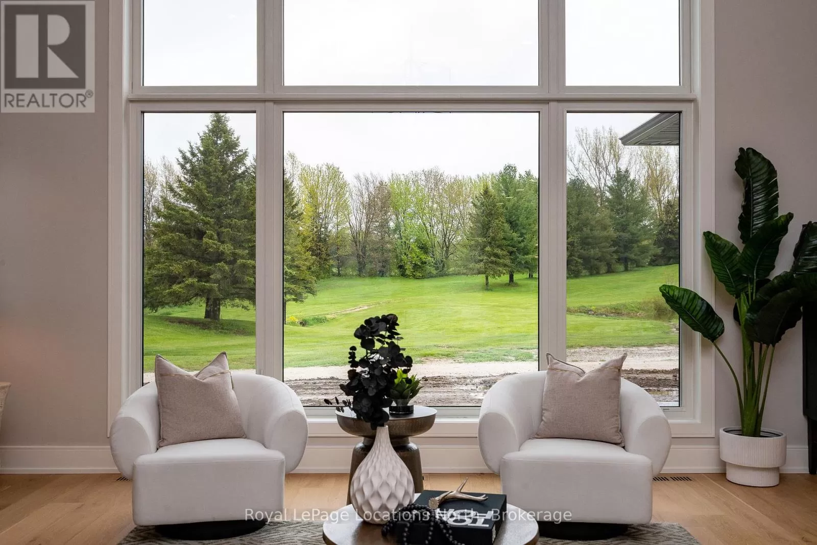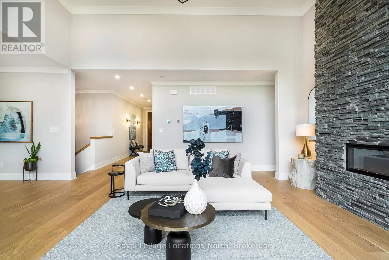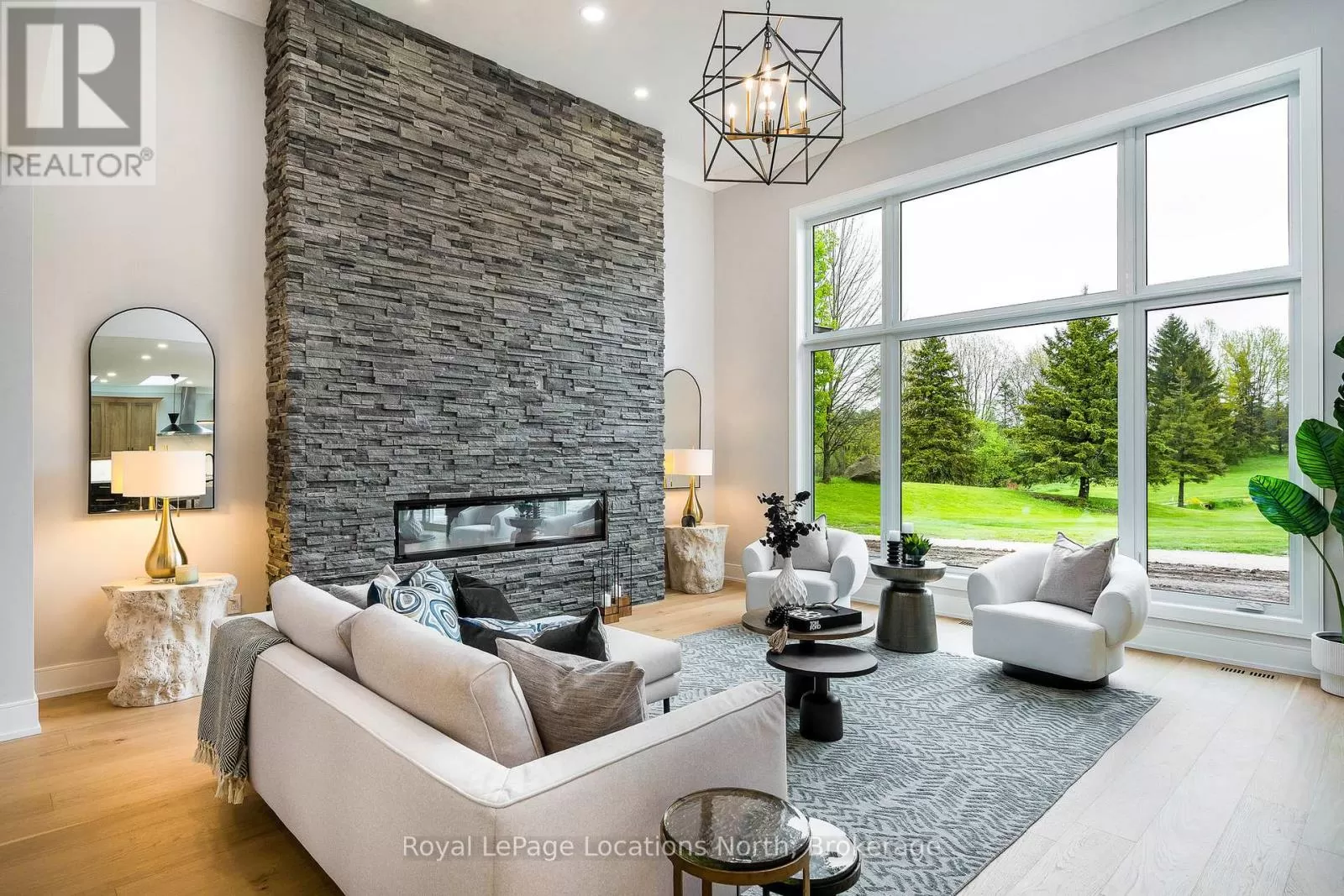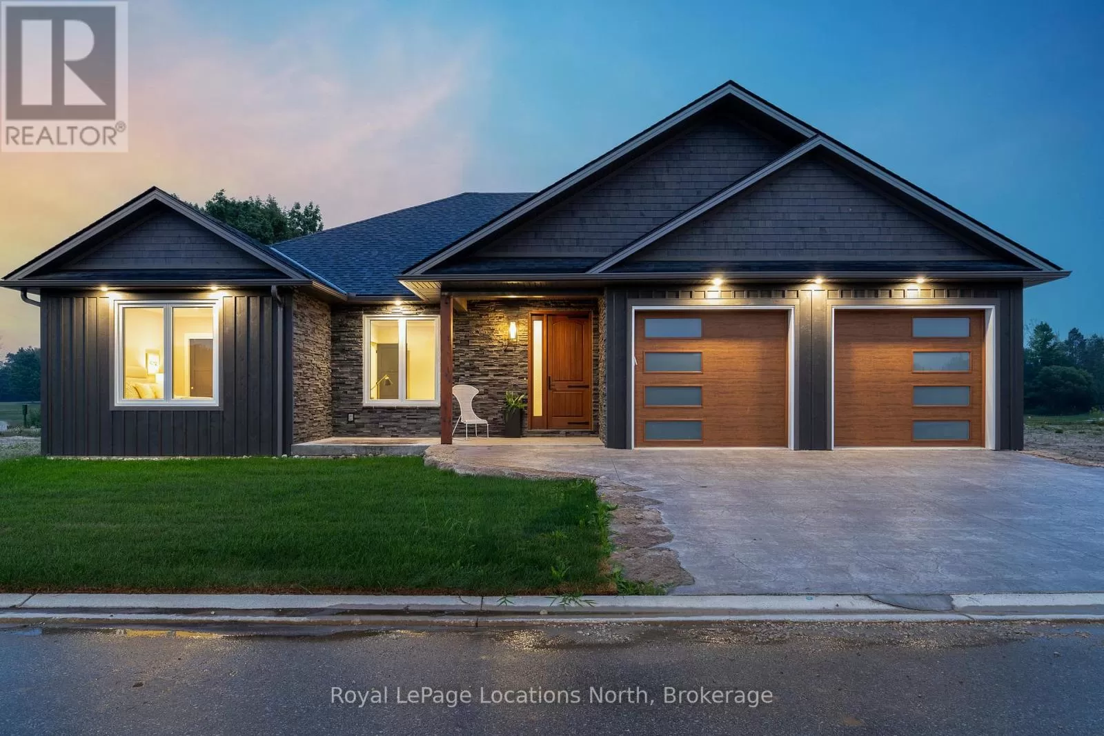 Cross Streets: Ridge Road. ** Directions: Hwy 26/Sykes Street North to Ridge Road to Hilton Lane. Experience the charm of a unique floor plan that makes this golf course bungalow both welcoming and exceptional. With over 2,200 square feet of thoughtfully designed living space, the home feels even more expansive thanks to its spacious front entrance and breathtaking great room. A stunning 14-foot-high stone feature wall anchors the open-concept living area, complemented by an elegant linear fireplace that adds warmth and drama. Many of the design details have been carefully curated by an interior designer to create a warm, earthy palette, featuring two-tone kitchen cabinetry, white oak flooring, and Benjamin Moore paint throughout. Stylish, modern lighting selections further elevate the home's custom aesthetic. The great room opens to a covered backyard retreat -- an ideal space to relax and take in the tranquil views of the manicured greens and mature trees of the Meaford Golf Course. Solid wood, three-panel interior doors -- extra tall and painted black -- are paired with upgraded gold-tone hardware, adding a refined touch throughout. The generous primary bedroom offers sliding door access to the backyard and golf course views. Two additional bedrooms -- both bright and spacious -- share a sleek four-piece bathroom. One of these rooms is perfectly suited for use as a home office or cozy den. All bathrooms feature high-end, contemporary finishes. Skylights in the kitchen bring in additional natural light, while pot lights throughout ensure a bright and welcoming atmosphere. A custom mudroom off the garage offers practical, organized storage. The exterior showcases a striking blend of wood and cultured stone, with a stamped concrete driveway leading to modern windowed garage doors. Comfort is top of mind with hydronic in-floor heating in both the garage and lower level. (id:27476)
