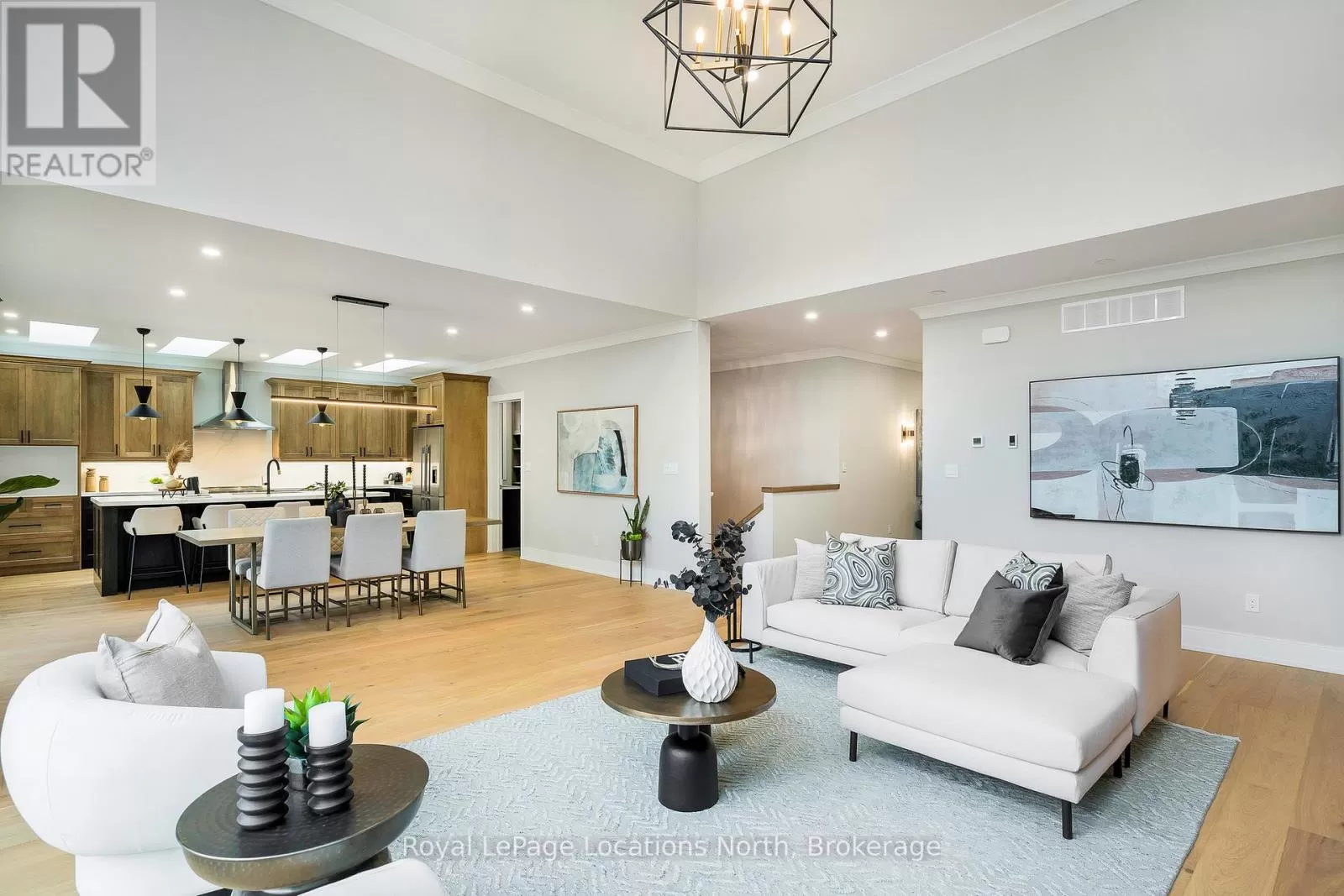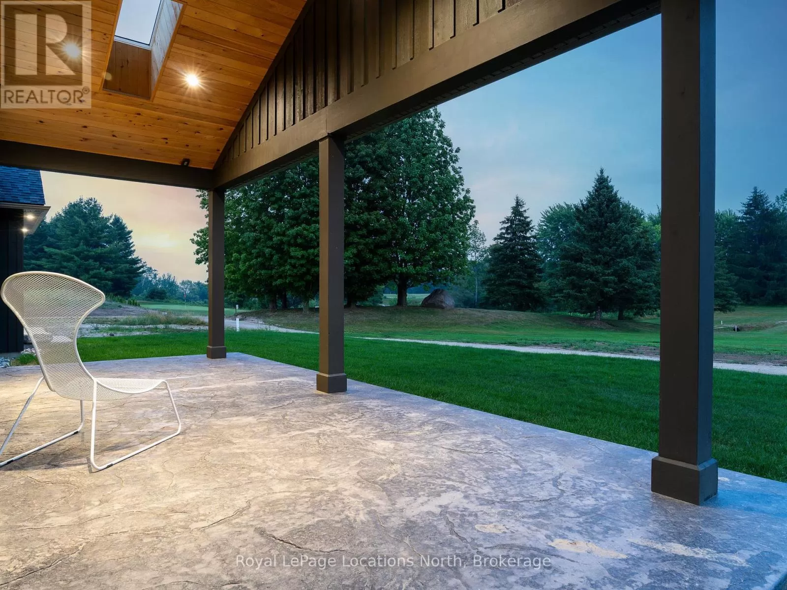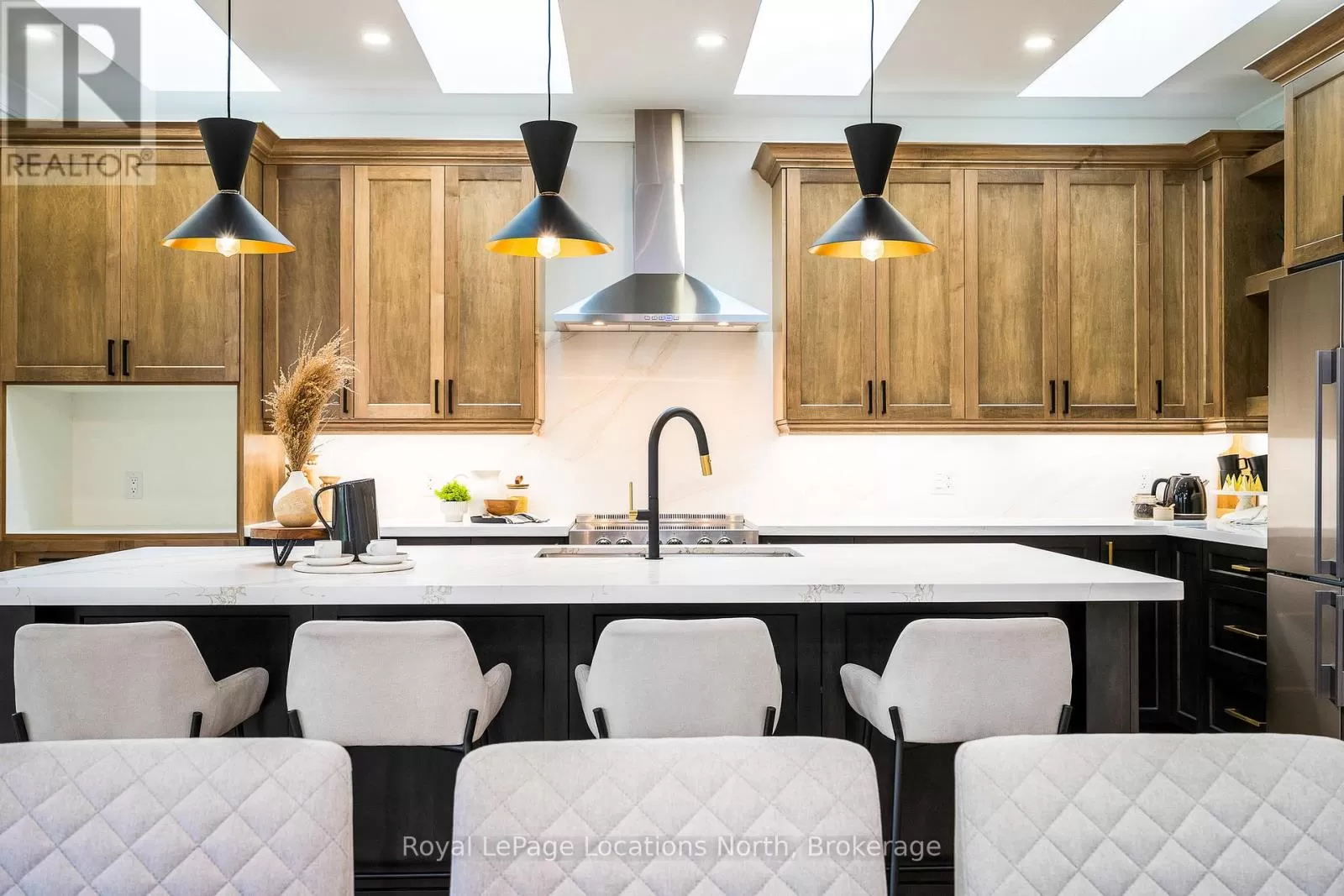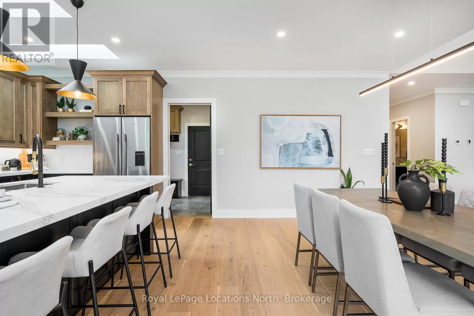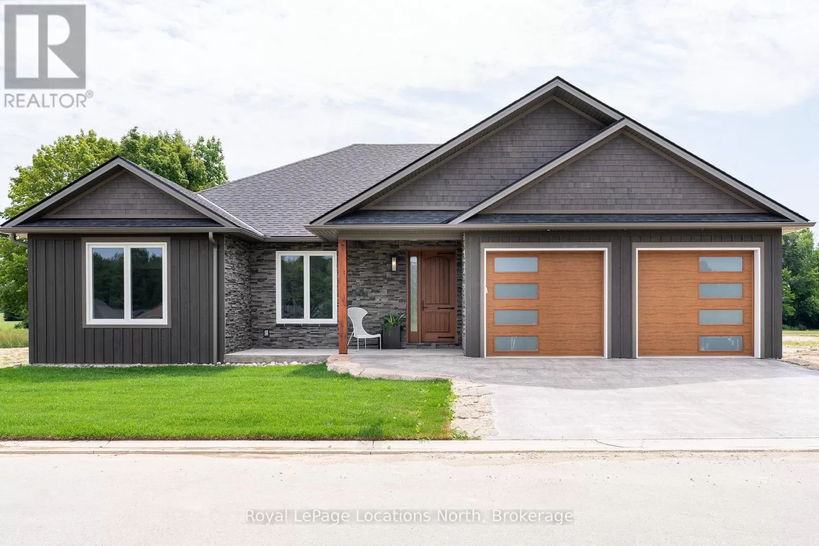 Cross Streets: Ridge Road. ** Directions: Hwy 26/Sykes Street North to Ridge Road to Hilton Lane. Experience the charm of a unique floor plan that makes this golf course bungalow both welcoming and exceptional. With over 2,200 square feet of thoughtfully designed living space, the home feels even more expansive thanks to its spacious front entrance and breathtaking great room. A stunning 14-foot-high stone feature wall anchors the open-concept living area, complemented by an elegant linear fireplace that adds warmth and drama. Many of the design details have been carefully curated by an interior designer to create a warm, earthy palette, featuring two-tone kitchen cabinetry, white oak flooring, and Benjamin Moore paint throughout. Stylish, modern lighting selections further elevate the home's custom aesthetic. The great room opens to a covered backyard retreat -- an ideal space to relax and take in the tranquil views of the manicured greens and mature trees of the Meaford Golf Course. Solid wood, three-panel interior doors -- extra tall and painted black -- are paired with upgraded gold-tone hardware, adding a refined touch throughout. The generous primary bedroom offers sliding door access to the backyard and golf course views. Two additional bedrooms -- both bright and spacious -- share a sleek four-piece bathroom. One of these rooms is perfectly suited for use as a home office or cozy den. All bathrooms feature high-end, contemporary finishes. Skylights in the kitchen bring in additional natural light, while pot lights throughout ensure a bright and welcoming atmosphere. A custom mudroom off the garage offers practical, organized storage. The exterior showcases a striking blend of wood and cultured stone, with a stamped concrete driveway leading to modern windowed garage doors. Comfort is top of mind with hydronic in-floor heating in both the garage and lower level. (id:27476)