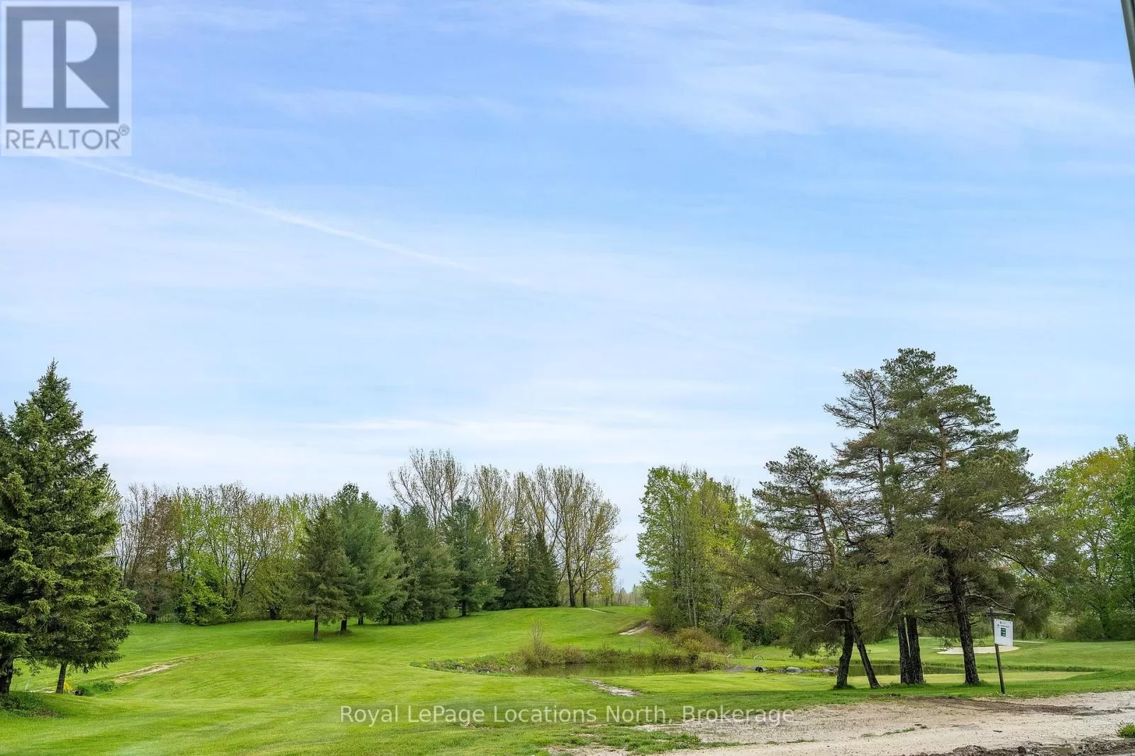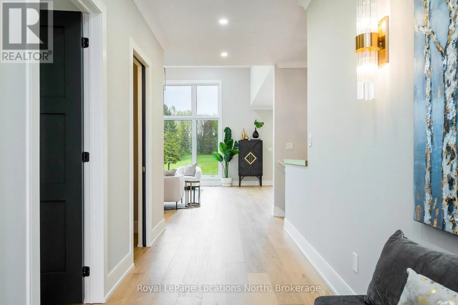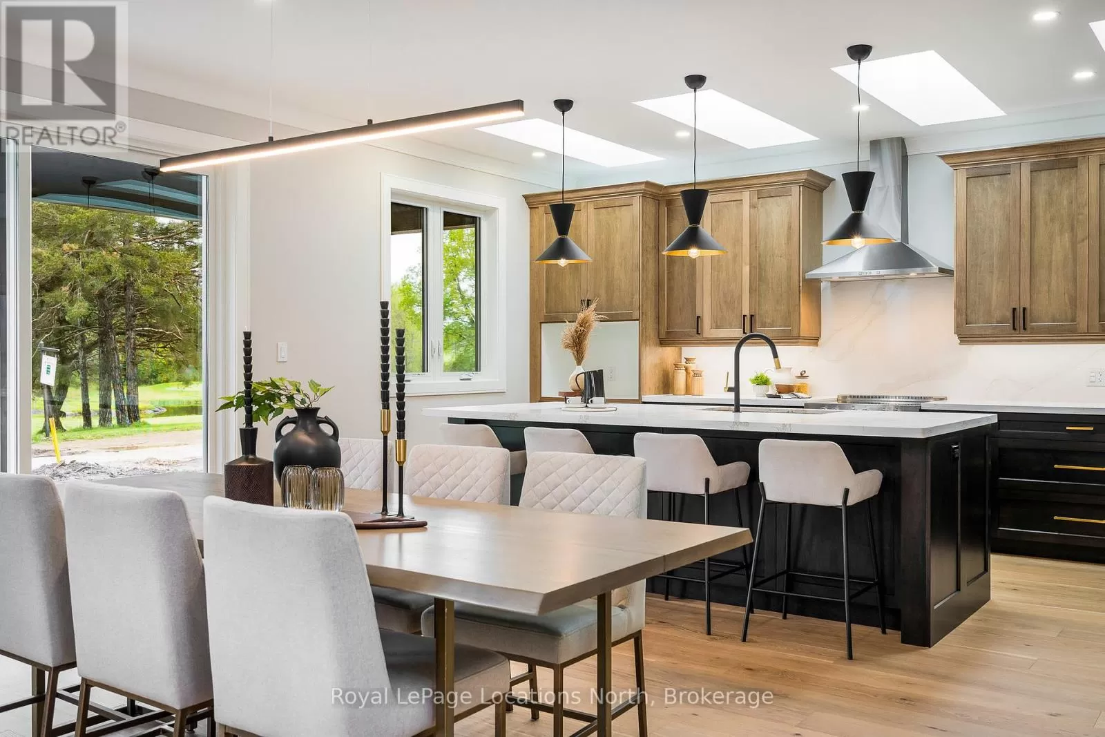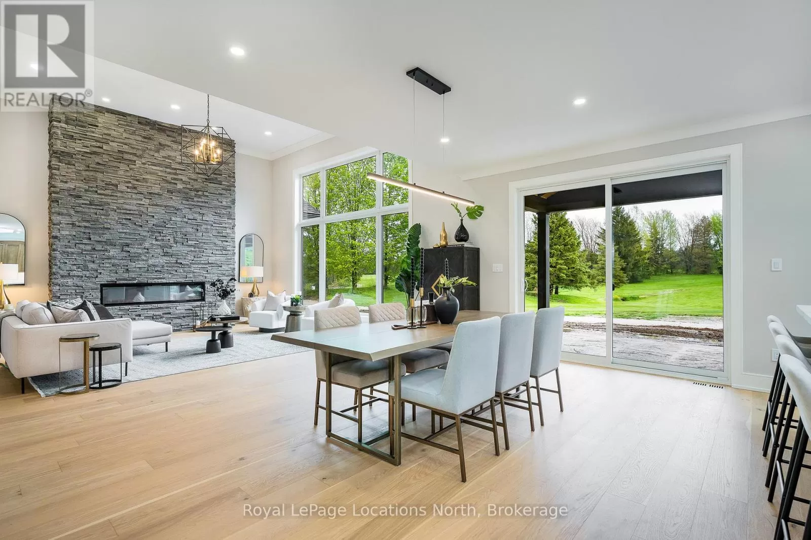 Cross Streets: Ridge Road. ** Directions: Hwy 26/Sykes Street North to Ridge Road to Hilton Lane. Experience the charm of a unique floor plan that makes this golf course bungalow both welcoming and exceptional. With over 2,200 square feet of thoughtfully designed living space, the home feels even more expansive thanks to its spacious front entrance and breathtaking great room. A stunning 14-foot-high stone feature wall anchors the open-concept living area, complemented by an elegant linear fireplace that adds warmth and drama. Many of the design details have been carefully curated by an interior designer to create a warm, earthy palette, featuring two-tone kitchen cabinetry, white oak flooring, and Benjamin Moore paint throughout. Stylish, modern lighting selections further elevate the home's custom aesthetic. The great room opens to a covered backyard retreat -- an ideal space to relax and take in the tranquil views of the manicured greens and mature trees of the Meaford Golf Course. Solid wood, three-panel interior doors -- extra tall and painted black -- are paired with upgraded gold-tone hardware, adding a refined touch throughout. The generous primary bedroom offers sliding door access to the backyard and golf course views. Two additional bedrooms -- both bright and spacious -- share a sleek four-piece bathroom. One of these rooms is perfectly suited for use as a home office or cozy den. All bathrooms feature high-end, contemporary finishes. Skylights in the kitchen bring in additional natural light, while pot lights throughout ensure a bright and welcoming atmosphere. A custom mudroom off the garage offers practical, organized storage. The exterior showcases a striking blend of wood and cultured stone, with a stamped concrete driveway leading to modern windowed garage doors. Comfort is top of mind with hydronic in-floor heating in both the garage and lower level. (id:27476)