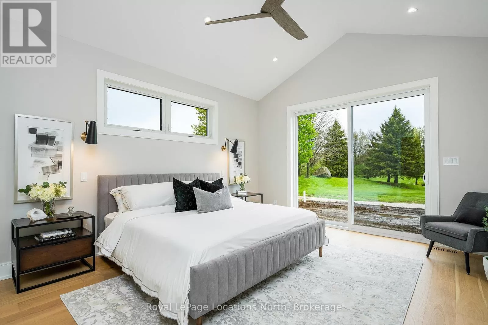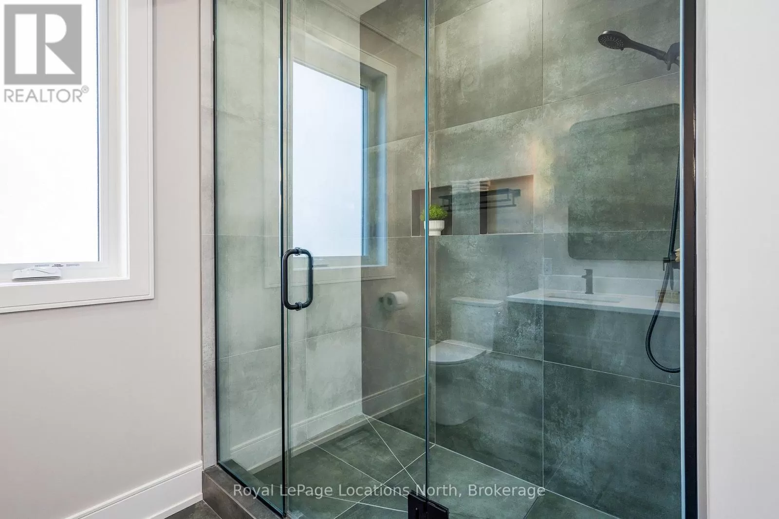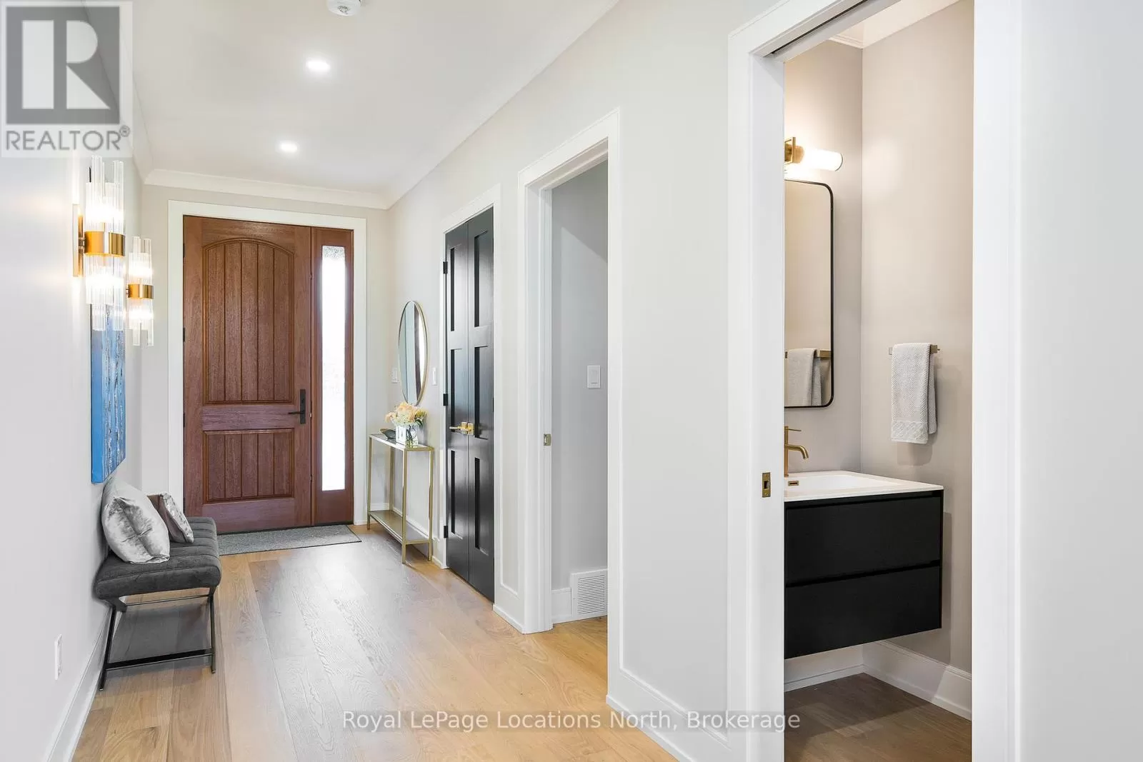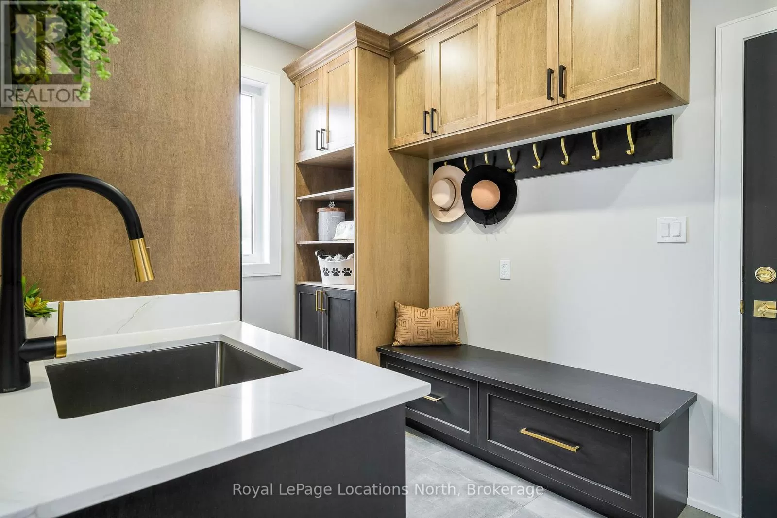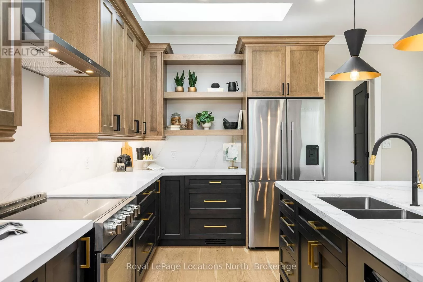 Cross Streets: Ridge Road. ** Directions: Hwy 26/Sykes Street North to Ridge Road to Hilton Lane. Experience the charm of a unique floor plan that makes this golf course bungalow both welcoming and exceptional. With over 2,200 square feet of thoughtfully designed living space, the home feels even more expansive thanks to its spacious front entrance and breathtaking great room. A stunning 14-foot-high stone feature wall anchors the open-concept living area, complemented by an elegant linear fireplace that adds warmth and drama. Many of the design details have been carefully curated by an interior designer to create a warm, earthy palette, featuring two-tone kitchen cabinetry, white oak flooring, and Benjamin Moore paint throughout. Stylish, modern lighting selections further elevate the home's custom aesthetic. The great room opens to a covered backyard retreat -- an ideal space to relax and take in the tranquil views of the manicured greens and mature trees of the Meaford Golf Course. Solid wood, three-panel interior doors -- extra tall and painted black -- are paired with upgraded gold-tone hardware, adding a refined touch throughout. The generous primary bedroom offers sliding door access to the backyard and golf course views. Two additional bedrooms -- both bright and spacious -- share a sleek four-piece bathroom. One of these rooms is perfectly suited for use as a home office or cozy den. All bathrooms feature high-end, contemporary finishes. Skylights in the kitchen bring in additional natural light, while pot lights throughout ensure a bright and welcoming atmosphere. A custom mudroom off the garage offers practical, organized storage. The exterior showcases a striking blend of wood and cultured stone, with a stamped concrete driveway leading to modern windowed garage doors. Comfort is top of mind with hydronic in-floor heating in both the garage and lower level. (id:27476)