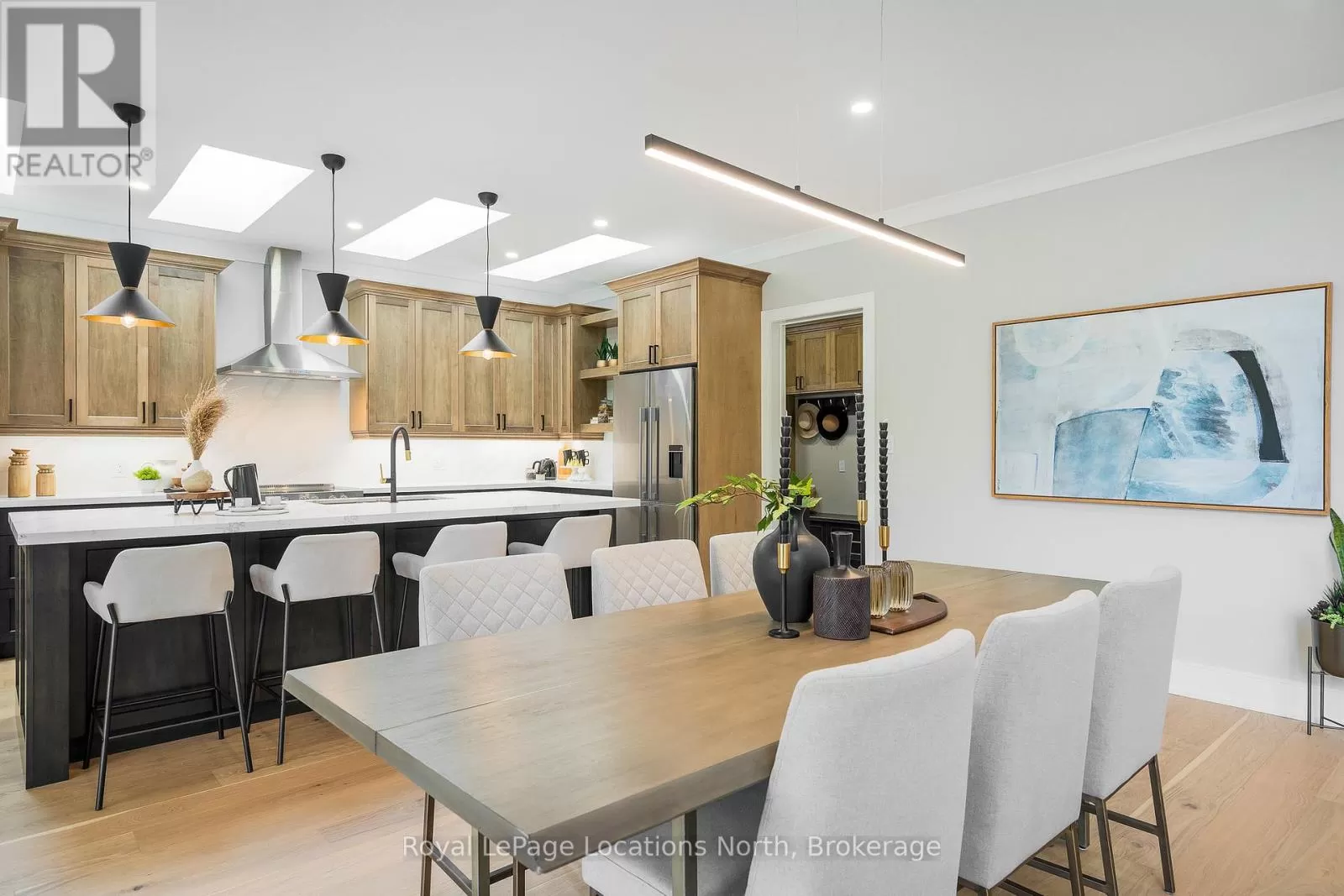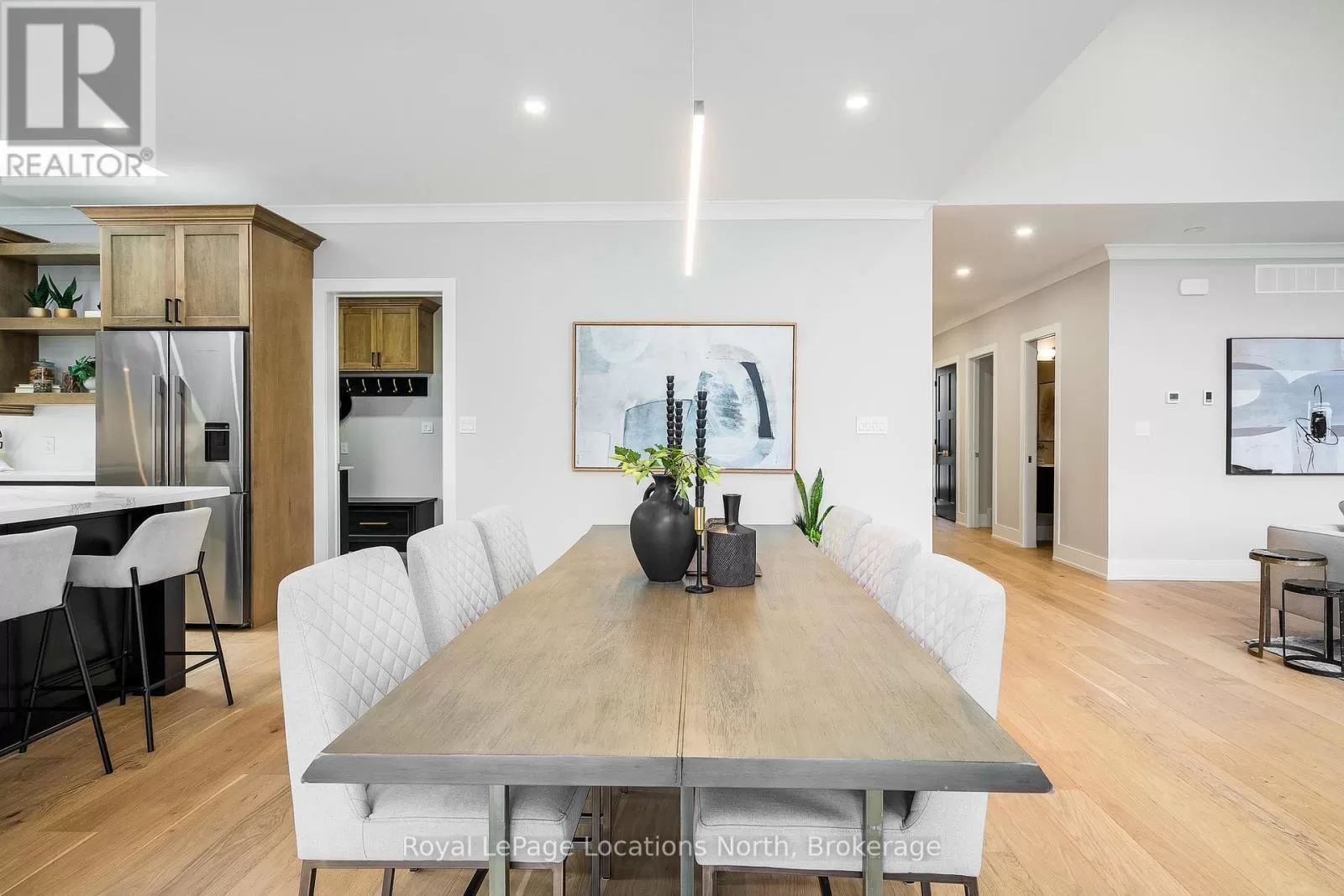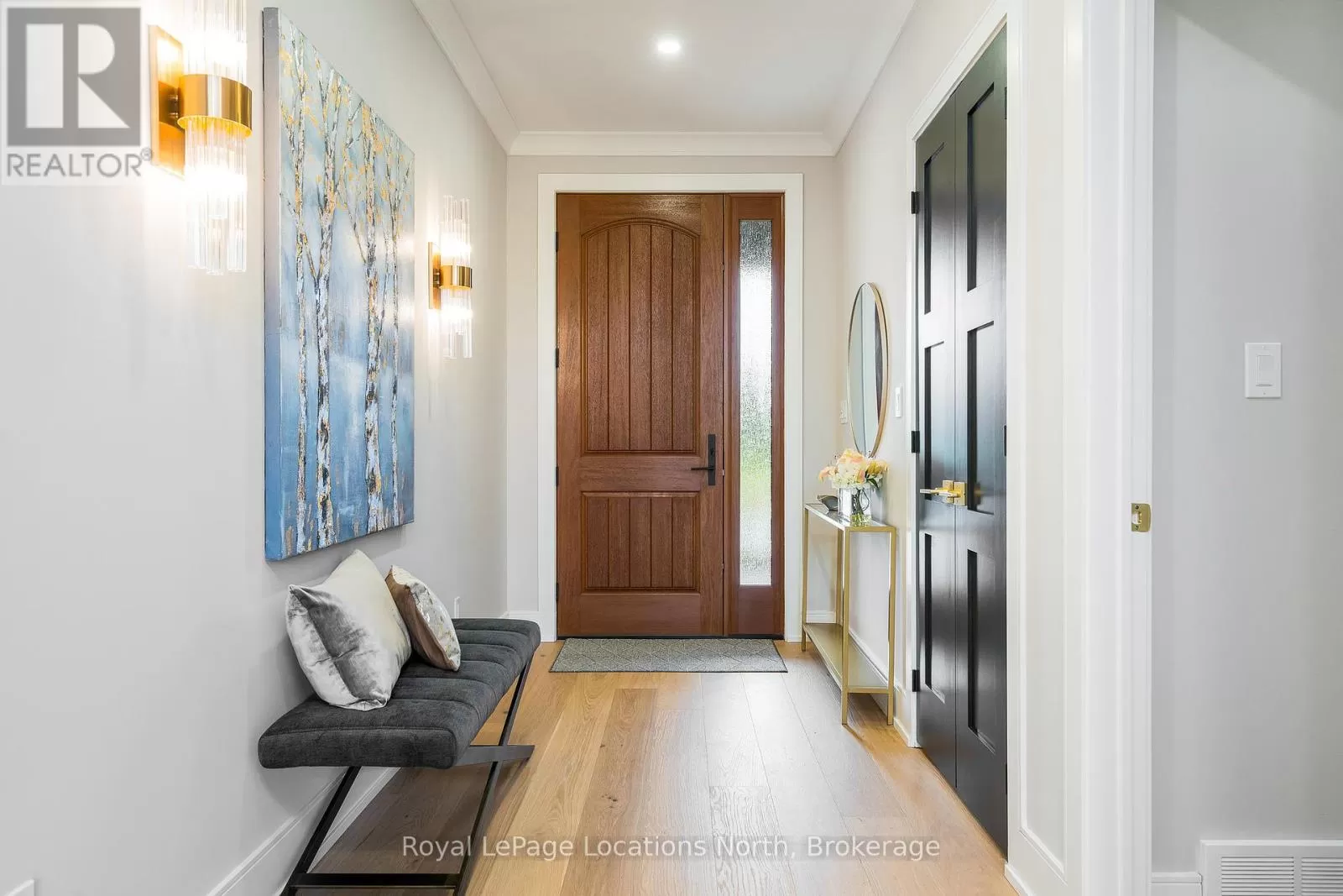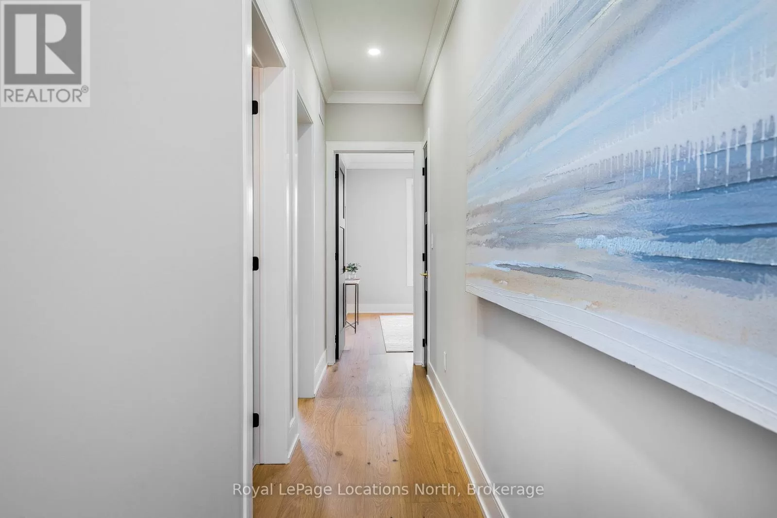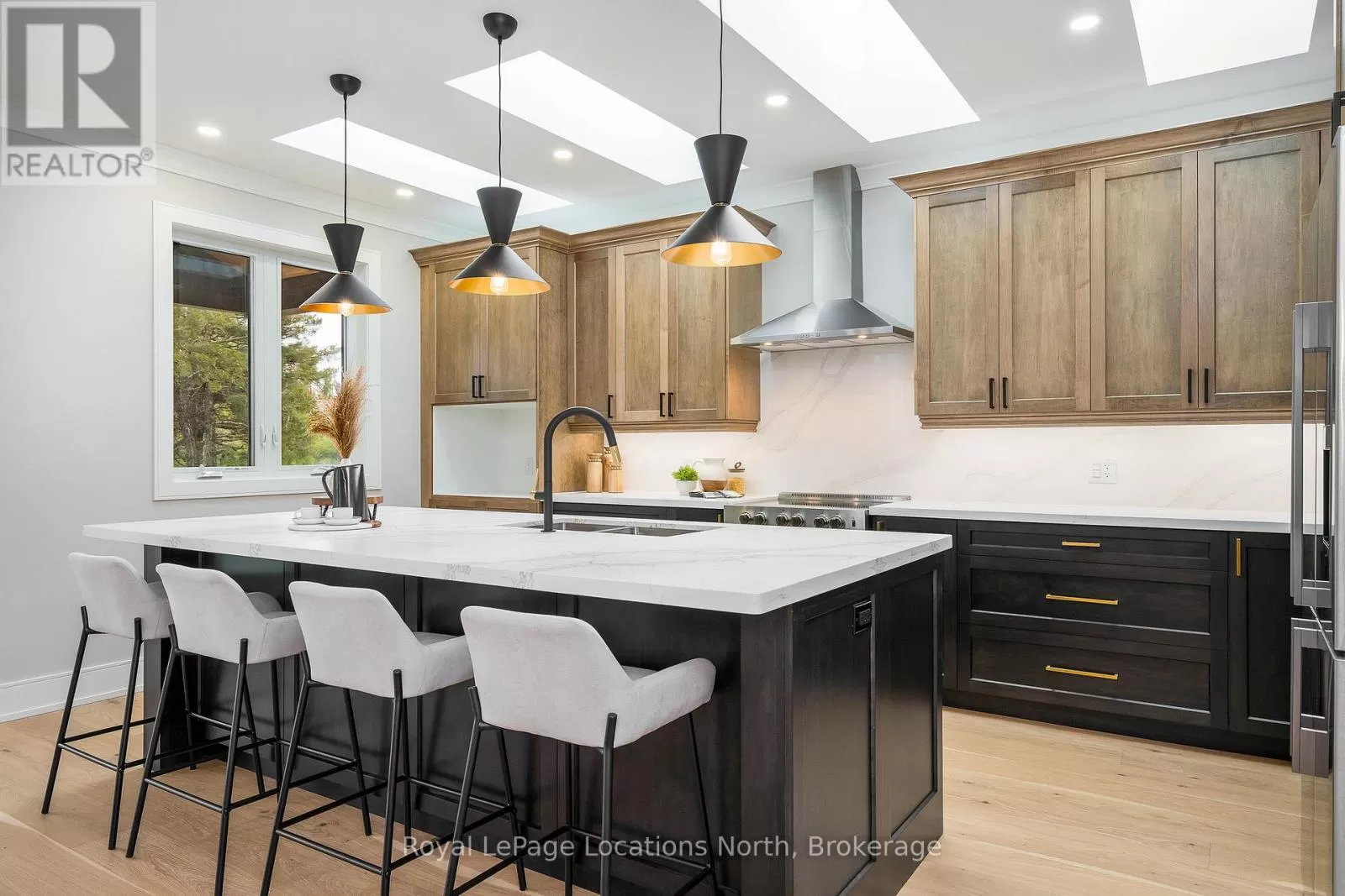 Cross Streets: Ridge Road. ** Directions: Hwy 26/Sykes Street North to Ridge Road to Hilton Lane. Experience the charm of a unique floor plan that makes this golf course bungalow both welcoming and exceptional. With over 2,200 square feet of thoughtfully designed living space, the home feels even more expansive thanks to its spacious front entrance and breathtaking great room. A stunning 14-foot-high stone feature wall anchors the open-concept living area, complemented by an elegant linear fireplace that adds warmth and drama. Many of the design details have been carefully curated by an interior designer to create a warm, earthy palette, featuring two-tone kitchen cabinetry, white oak flooring, and Benjamin Moore paint throughout. Stylish, modern lighting selections further elevate the home's custom aesthetic. The great room opens to a covered backyard retreat -- an ideal space to relax and take in the tranquil views of the manicured greens and mature trees of the Meaford Golf Course. Solid wood, three-panel interior doors -- extra tall and painted black -- are paired with upgraded gold-tone hardware, adding a refined touch throughout. The generous primary bedroom offers sliding door access to the backyard and golf course views. Two additional bedrooms -- both bright and spacious -- share a sleek four-piece bathroom. One of these rooms is perfectly suited for use as a home office or cozy den. All bathrooms feature high-end, contemporary finishes. Skylights in the kitchen bring in additional natural light, while pot lights throughout ensure a bright and welcoming atmosphere. A custom mudroom off the garage offers practical, organized storage. The exterior showcases a striking blend of wood and cultured stone, with a stamped concrete driveway leading to modern windowed garage doors. Comfort is top of mind with hydronic in-floor heating in both the garage and lower level. (id:27476)