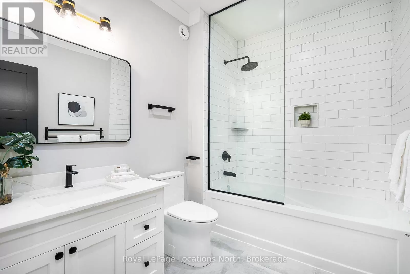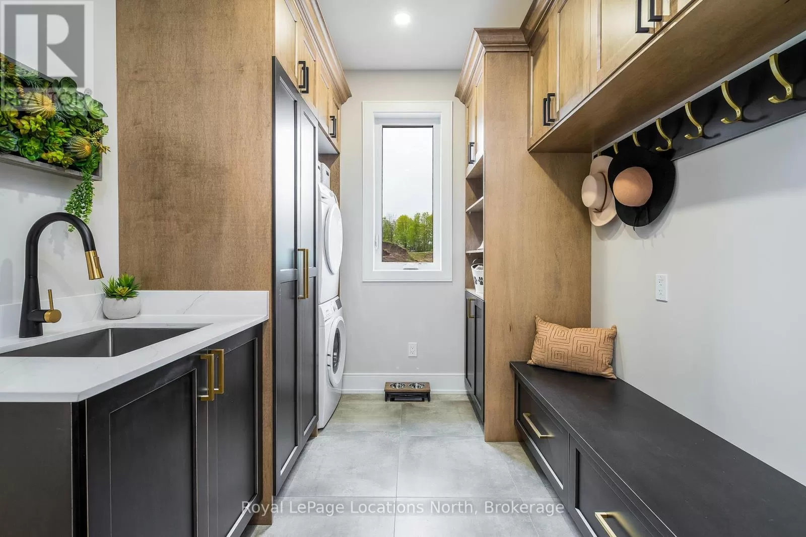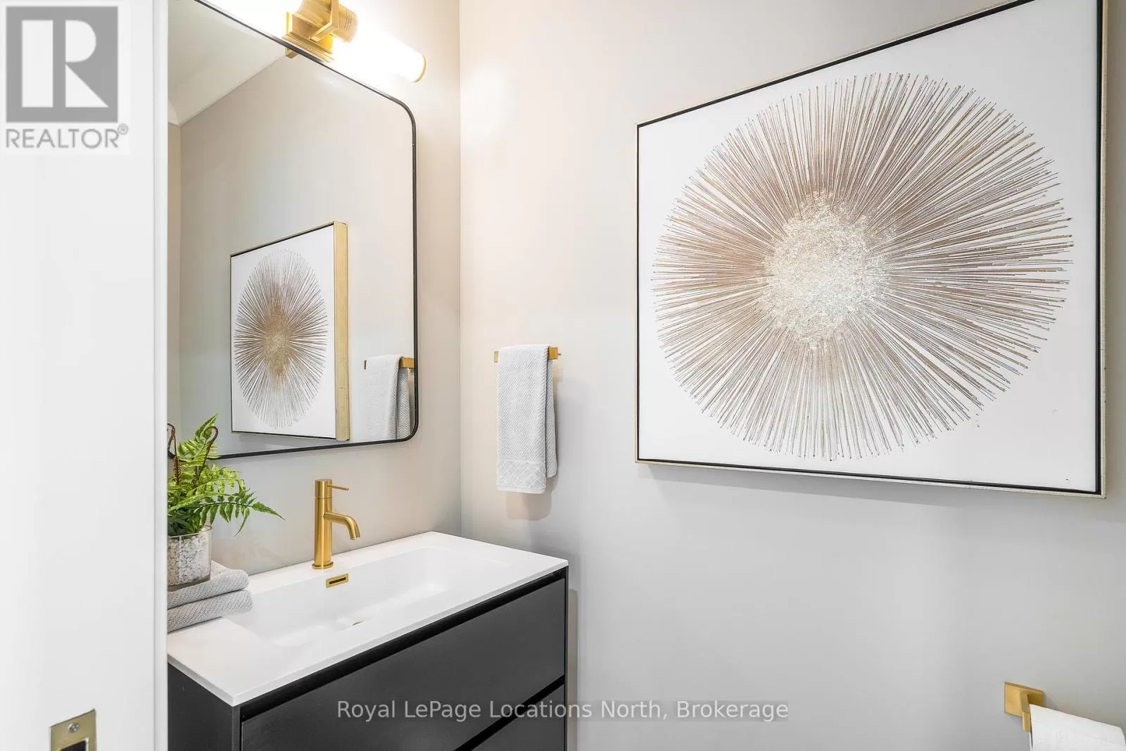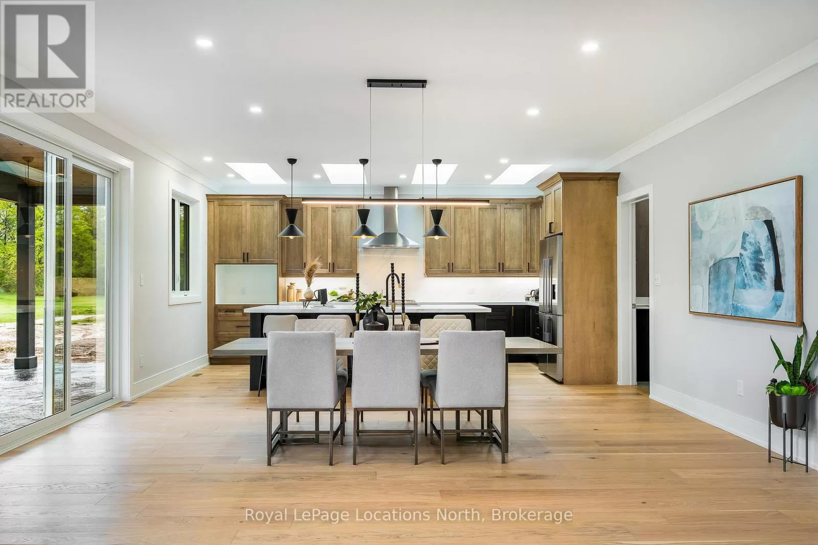 Cross Streets: Ridge Road. ** Directions: Hwy 26/Sykes Street North to Ridge Road to Hilton Lane. Experience the charm of a unique floor plan that makes this golf course bungalow both welcoming and exceptional. With over 2,200 square feet of thoughtfully designed living space, the home feels even more expansive thanks to its spacious front entrance and breathtaking great room. A stunning 14-foot-high stone feature wall anchors the open-concept living area, complemented by an elegant linear fireplace that adds warmth and drama. Many of the design details have been carefully curated by an interior designer to create a warm, earthy palette, featuring two-tone kitchen cabinetry, white oak flooring, and Benjamin Moore paint throughout. Stylish, modern lighting selections further elevate the home's custom aesthetic. The great room opens to a covered backyard retreat -- an ideal space to relax and take in the tranquil views of the manicured greens and mature trees of the Meaford Golf Course. Solid wood, three-panel interior doors -- extra tall and painted black -- are paired with upgraded gold-tone hardware, adding a refined touch throughout. The generous primary bedroom offers sliding door access to the backyard and golf course views. Two additional bedrooms -- both bright and spacious -- share a sleek four-piece bathroom. One of these rooms is perfectly suited for use as a home office or cozy den. All bathrooms feature high-end, contemporary finishes. Skylights in the kitchen bring in additional natural light, while pot lights throughout ensure a bright and welcoming atmosphere. A custom mudroom off the garage offers practical, organized storage. The exterior showcases a striking blend of wood and cultured stone, with a stamped concrete driveway leading to modern windowed garage doors. Comfort is top of mind with hydronic in-floor heating in both the garage and lower level. (id:27476)