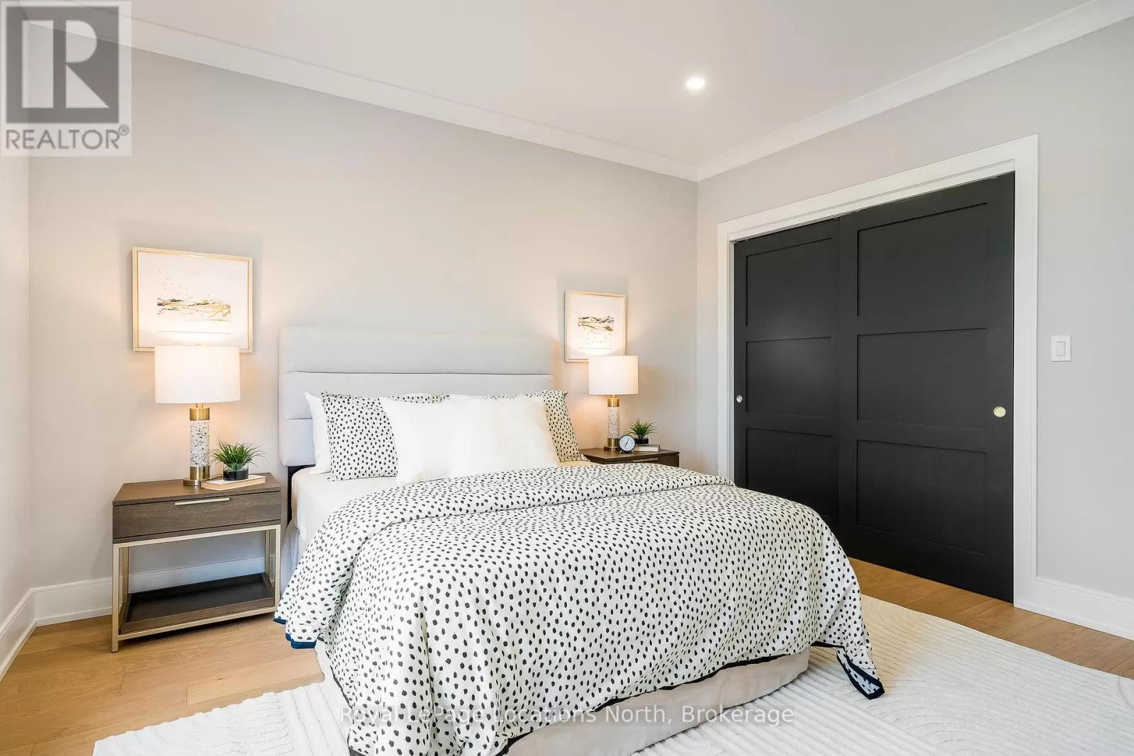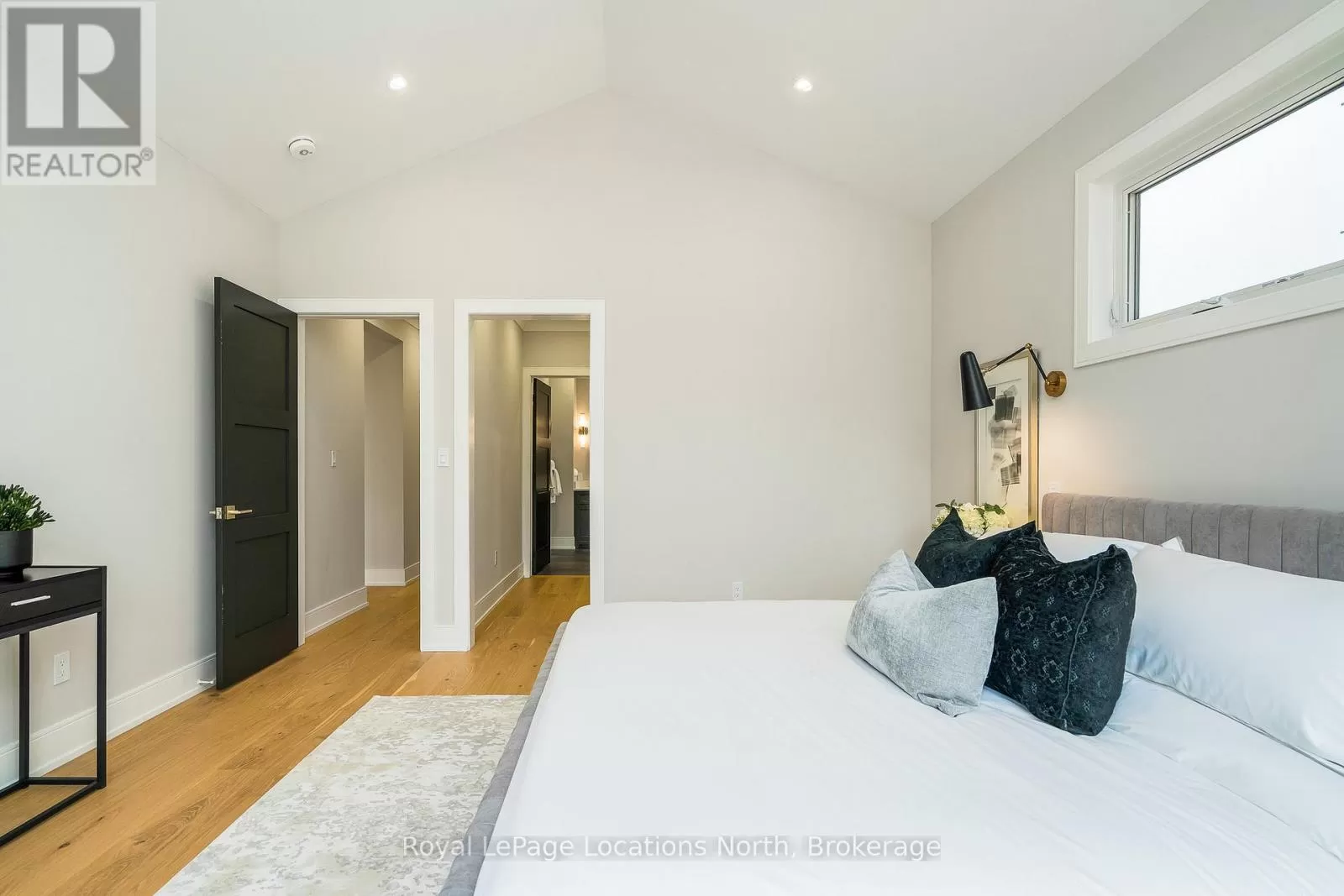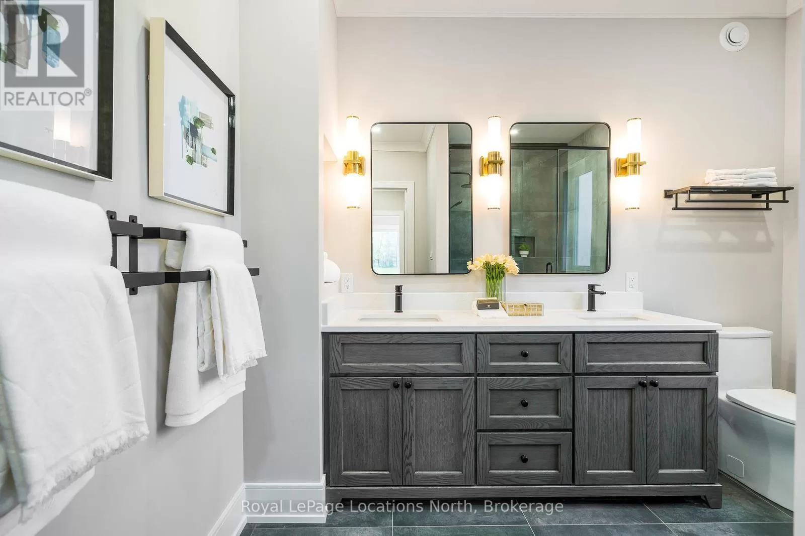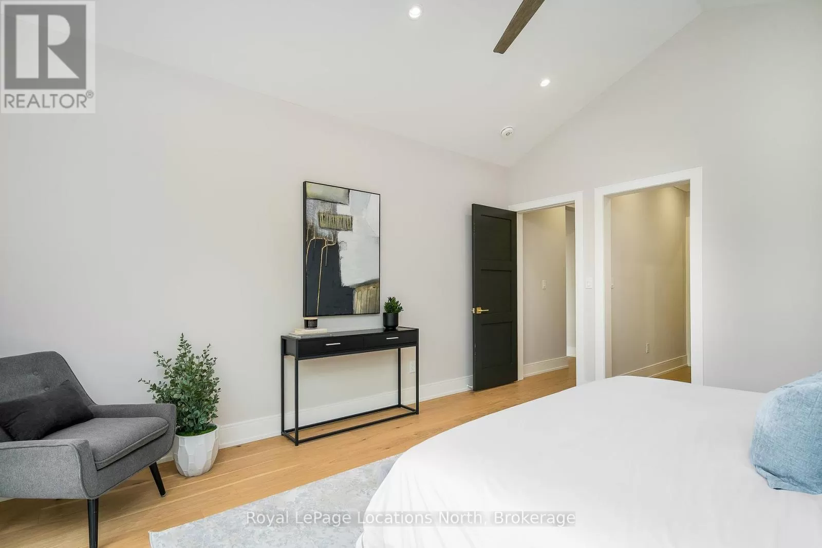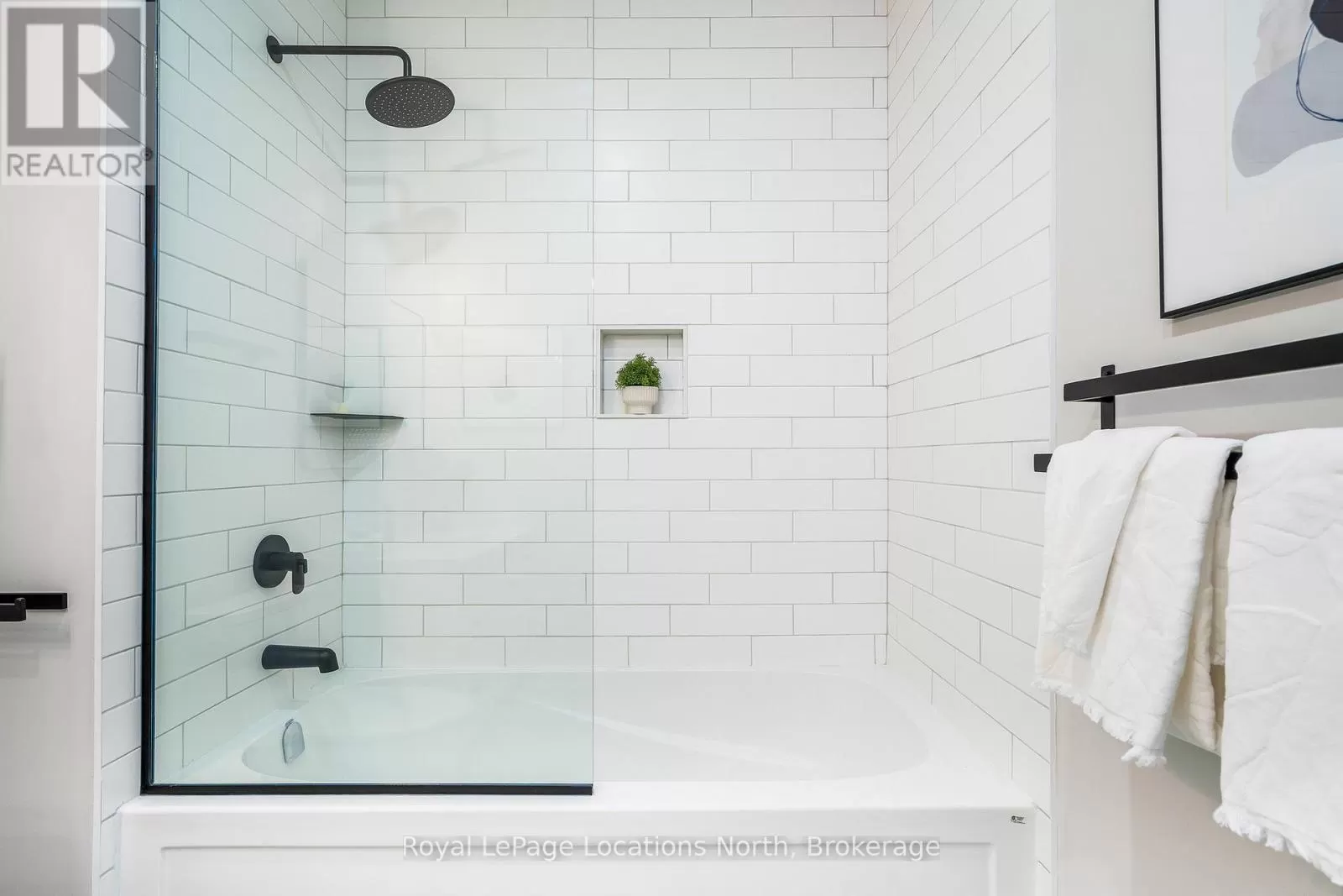 Cross Streets: Ridge Road. ** Directions: Hwy 26/Sykes Street North to Ridge Road to Hilton Lane. Experience the charm of a unique floor plan that makes this golf course bungalow both welcoming and exceptional. With over 2,200 square feet of thoughtfully designed living space, the home feels even more expansive thanks to its spacious front entrance and breathtaking great room. A stunning 14-foot-high stone feature wall anchors the open-concept living area, complemented by an elegant linear fireplace that adds warmth and drama. Many of the design details have been carefully curated by an interior designer to create a warm, earthy palette, featuring two-tone kitchen cabinetry, white oak flooring, and Benjamin Moore paint throughout. Stylish, modern lighting selections further elevate the home's custom aesthetic. The great room opens to a covered backyard retreat -- an ideal space to relax and take in the tranquil views of the manicured greens and mature trees of the Meaford Golf Course. Solid wood, three-panel interior doors -- extra tall and painted black -- are paired with upgraded gold-tone hardware, adding a refined touch throughout. The generous primary bedroom offers sliding door access to the backyard and golf course views. Two additional bedrooms -- both bright and spacious -- share a sleek four-piece bathroom. One of these rooms is perfectly suited for use as a home office or cozy den. All bathrooms feature high-end, contemporary finishes. Skylights in the kitchen bring in additional natural light, while pot lights throughout ensure a bright and welcoming atmosphere. A custom mudroom off the garage offers practical, organized storage. The exterior showcases a striking blend of wood and cultured stone, with a stamped concrete driveway leading to modern windowed garage doors. Comfort is top of mind with hydronic in-floor heating in both the garage and lower level. (id:27476)