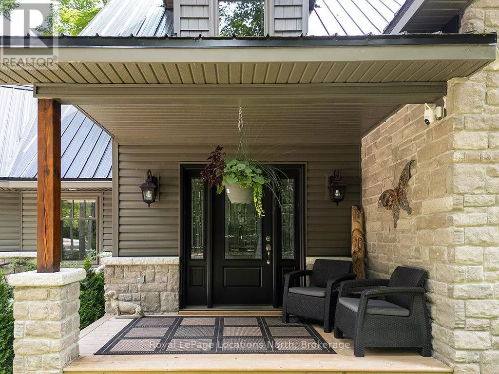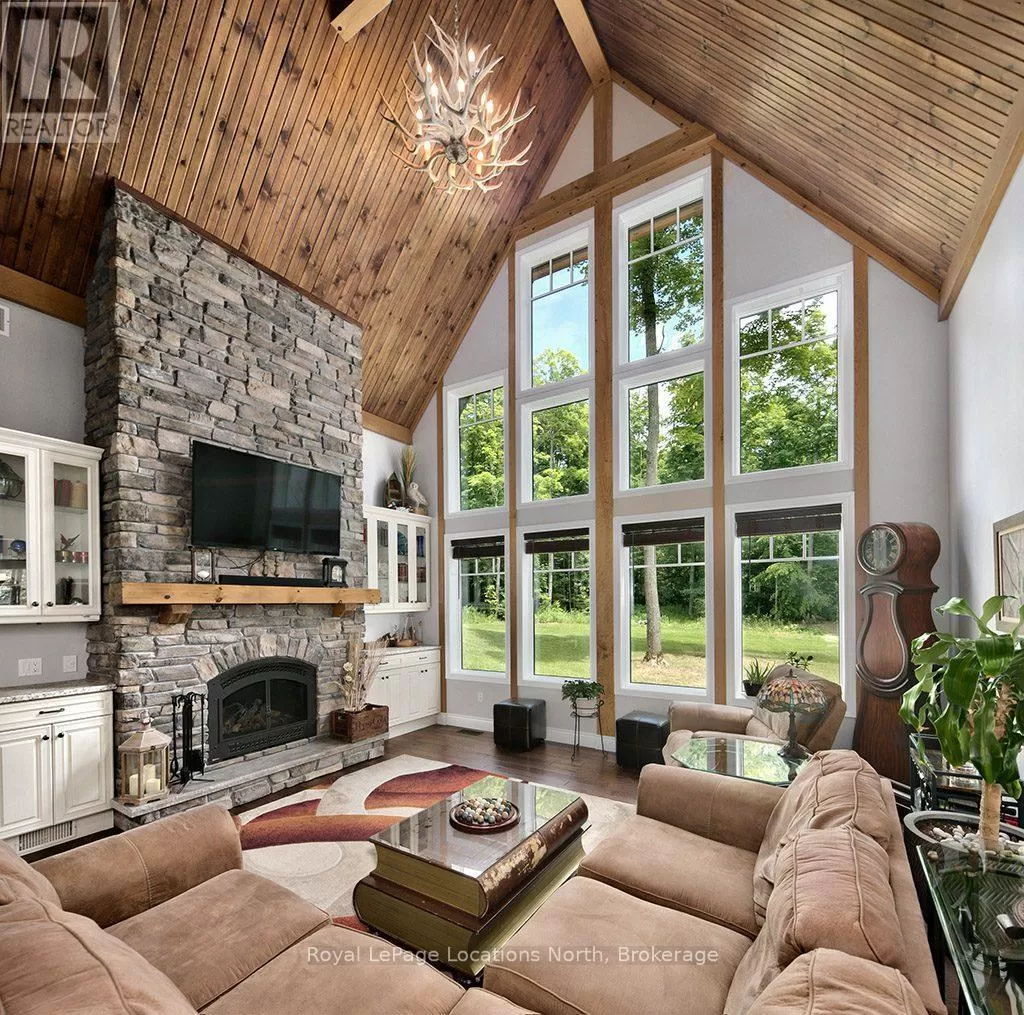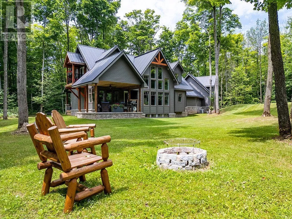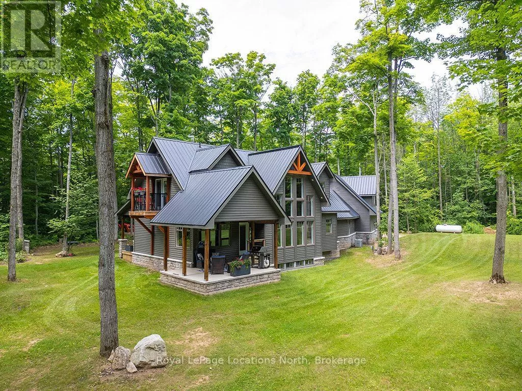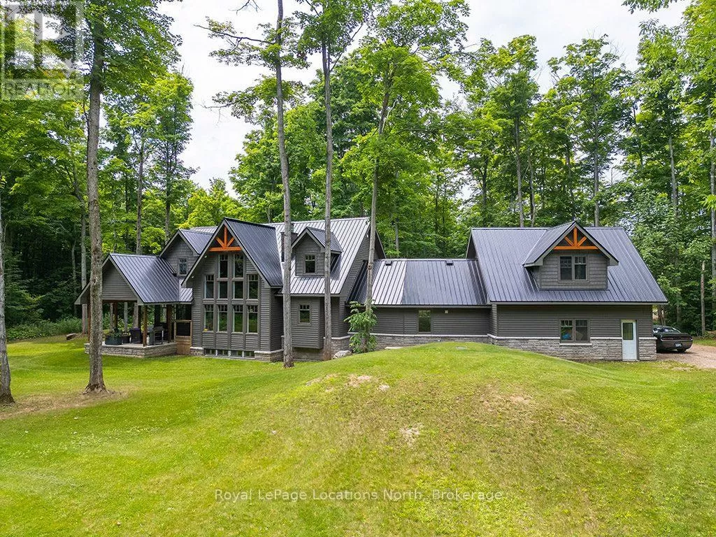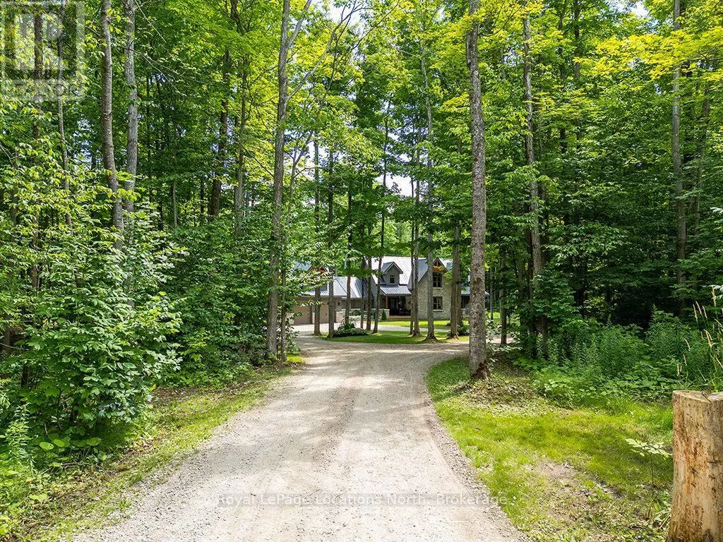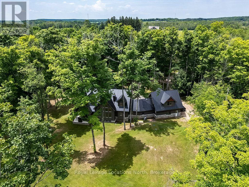 Follow Highway 26 west, turn left onto 12th Line. Private sanctuary on 25 acres of serene Meaford countryside, where mature trees and tranquility await. This custom-built retreat offers a blend of luxury and comfort, designed to embrace the beauty of its natural surroundings. A short drive to Downtown Meaford and Georgian Bay. Step inside to discover the heart of the home a great room with vaulted wood-covered ceilings, floor-to-ceiling windows framing views of majestic trees, and a striking stone surround fireplace. The open concept gourmet kitchen features granite counters, a 4ft range, built-in microwave, bar fridge in the island, and a convenient pot filler. Adjacent is the dining space with a walkout to the back deck, perfect for alfresco dining. The main floor also hosts a guest bed, den space, convenient laundry room and mudroom with access to the oversized garage. Throughout the main floor,3/4 inch special walnut plank flooring adds warmth and elegance. All bathrooms are beautifully appointed with granite counters and heated flooring beneath polished ceramic tiles. Upstairs, the upper level offers additional living space with a primary suite, guest bed, 3pc bath, and a versatile bonus room. The spacious primary suite features a covered balcony overlooking the lush grounds, WIC, and a luxurious 3pc ensuite complete with heated floors, heated towel rack and a freestanding tub. Additional features include a durable steel roof, a 10kw backup generator, and 1000sqft drive shed with 200 amp service offers plenty of storage for seasonal toys or use as a workshop! Above the garage, a loft area offers storage or potential studio. The lower level has potential for a huge rec space. Outside, the expansive and private exterior invites exploration and quiet contemplation, making this property an ideal weekend getaway or full-time residence. Just 8 mins from dtown Meaford's restaurants, shops, and Georgian Bay. Thornbury is a short 18-minute drive away. (id:27476)