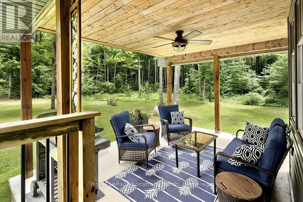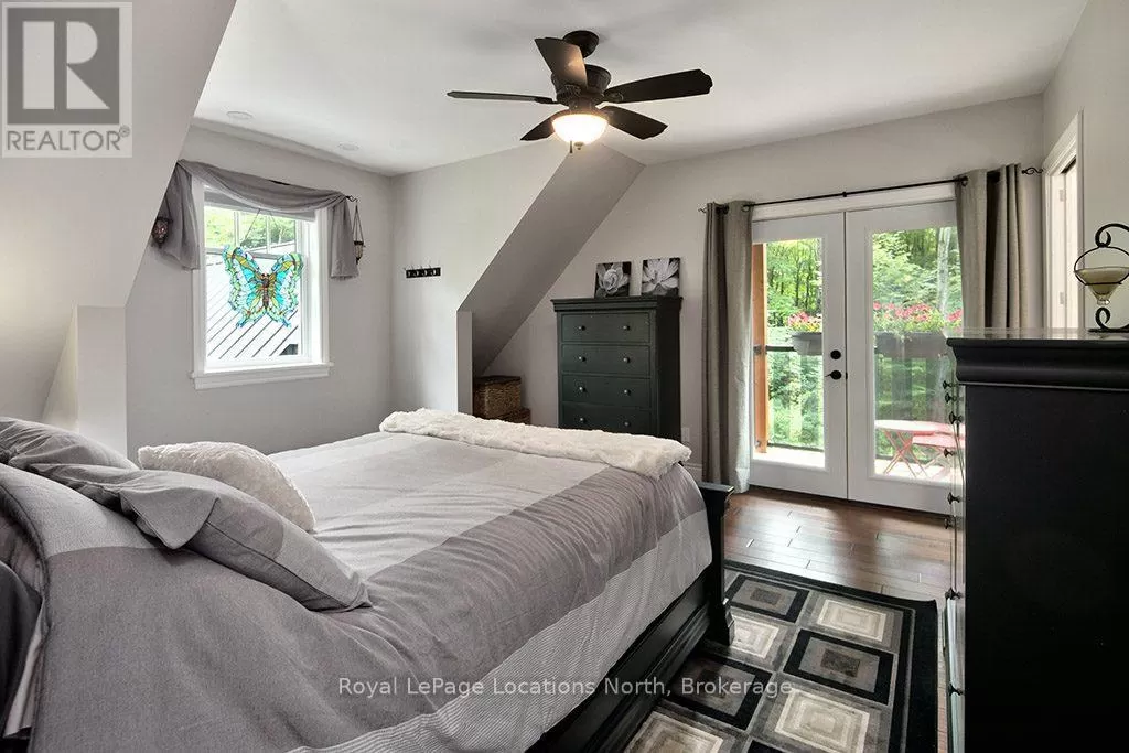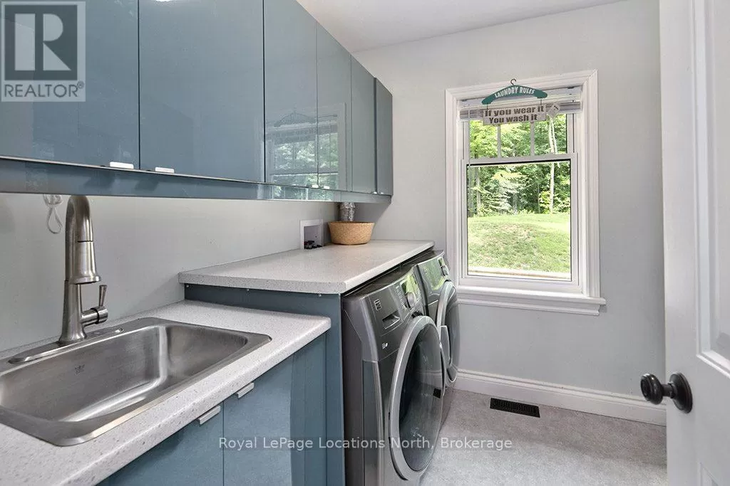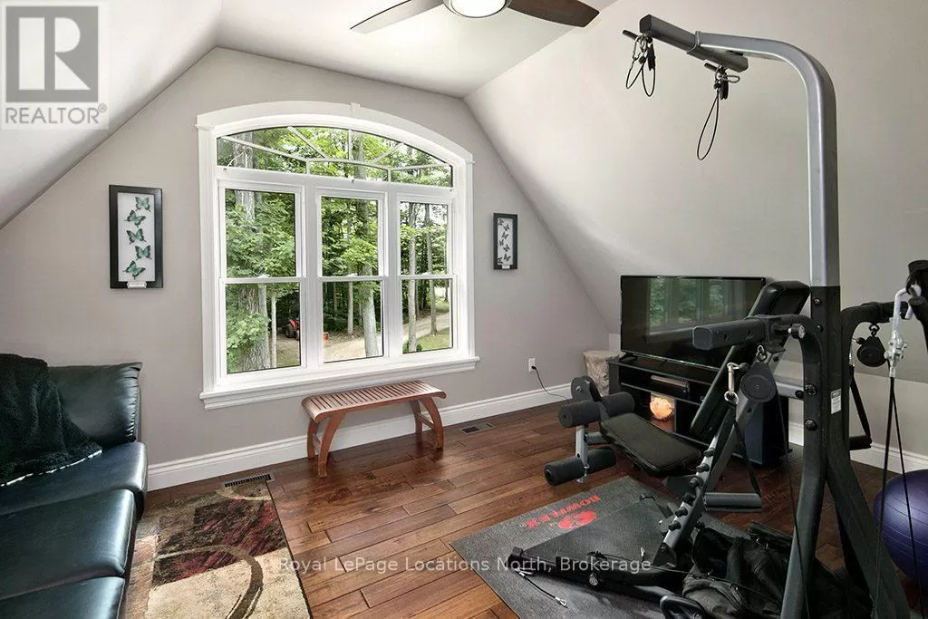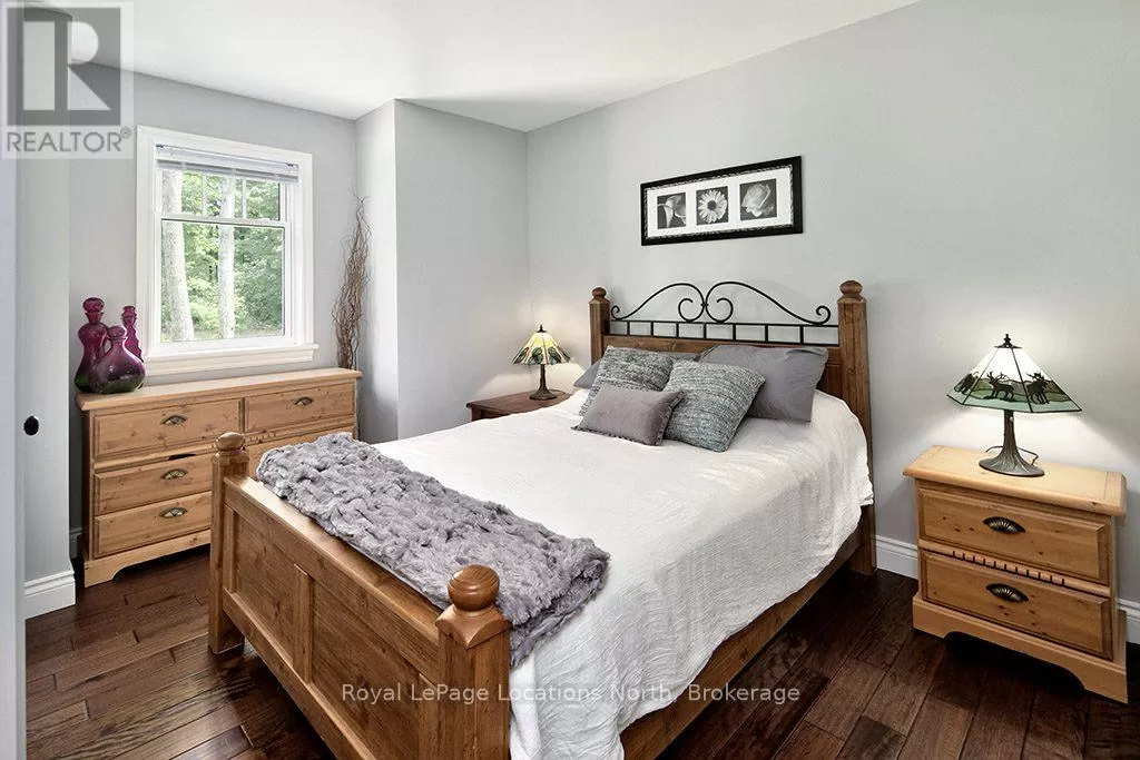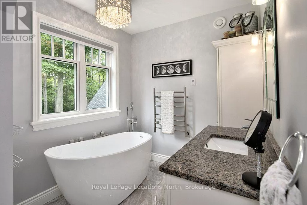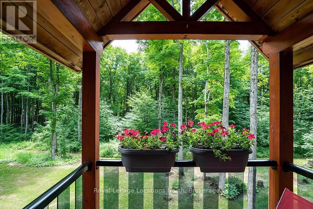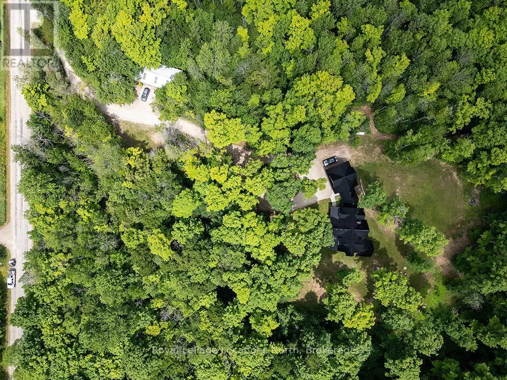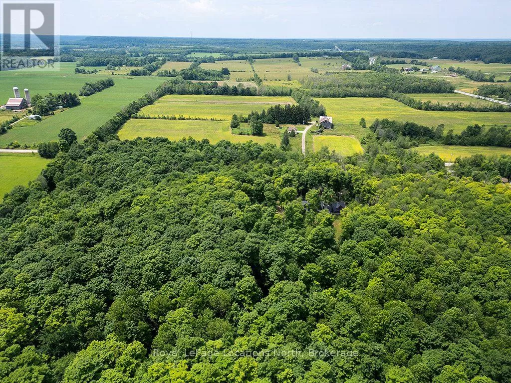 Follow Highway 26 west, turn left onto 12th Line. Private sanctuary on 25 acres of serene Meaford countryside, where mature trees and tranquility await. This custom-built retreat offers a blend of luxury and comfort, designed to embrace the beauty of its natural surroundings. A short drive to Downtown Meaford and Georgian Bay. Step inside to discover the heart of the home a great room with vaulted wood-covered ceilings, floor-to-ceiling windows framing views of majestic trees, and a striking stone surround fireplace. The open concept gourmet kitchen features granite counters, a 4ft range, built-in microwave, bar fridge in the island, and a convenient pot filler. Adjacent is the dining space with a walkout to the back deck, perfect for alfresco dining. The main floor also hosts a guest bed, den space, convenient laundry room and mudroom with access to the oversized garage. Throughout the main floor,3/4 inch special walnut plank flooring adds warmth and elegance. All bathrooms are beautifully appointed with granite counters and heated flooring beneath polished ceramic tiles. Upstairs, the upper level offers additional living space with a primary suite, guest bed, 3pc bath, and a versatile bonus room. The spacious primary suite features a covered balcony overlooking the lush grounds, WIC, and a luxurious 3pc ensuite complete with heated floors, heated towel rack and a freestanding tub. Additional features include a durable steel roof, a 10kw backup generator, and 1000sqft drive shed with 200 amp service offers plenty of storage for seasonal toys or use as a workshop! Above the garage, a loft area offers storage or potential studio. The lower level has potential for a huge rec space. Outside, the expansive and private exterior invites exploration and quiet contemplation, making this property an ideal weekend getaway or full-time residence. Just 8 mins from dtown Meaford's restaurants, shops, and Georgian Bay. Thornbury is a short 18-minute drive away. (id:27476)