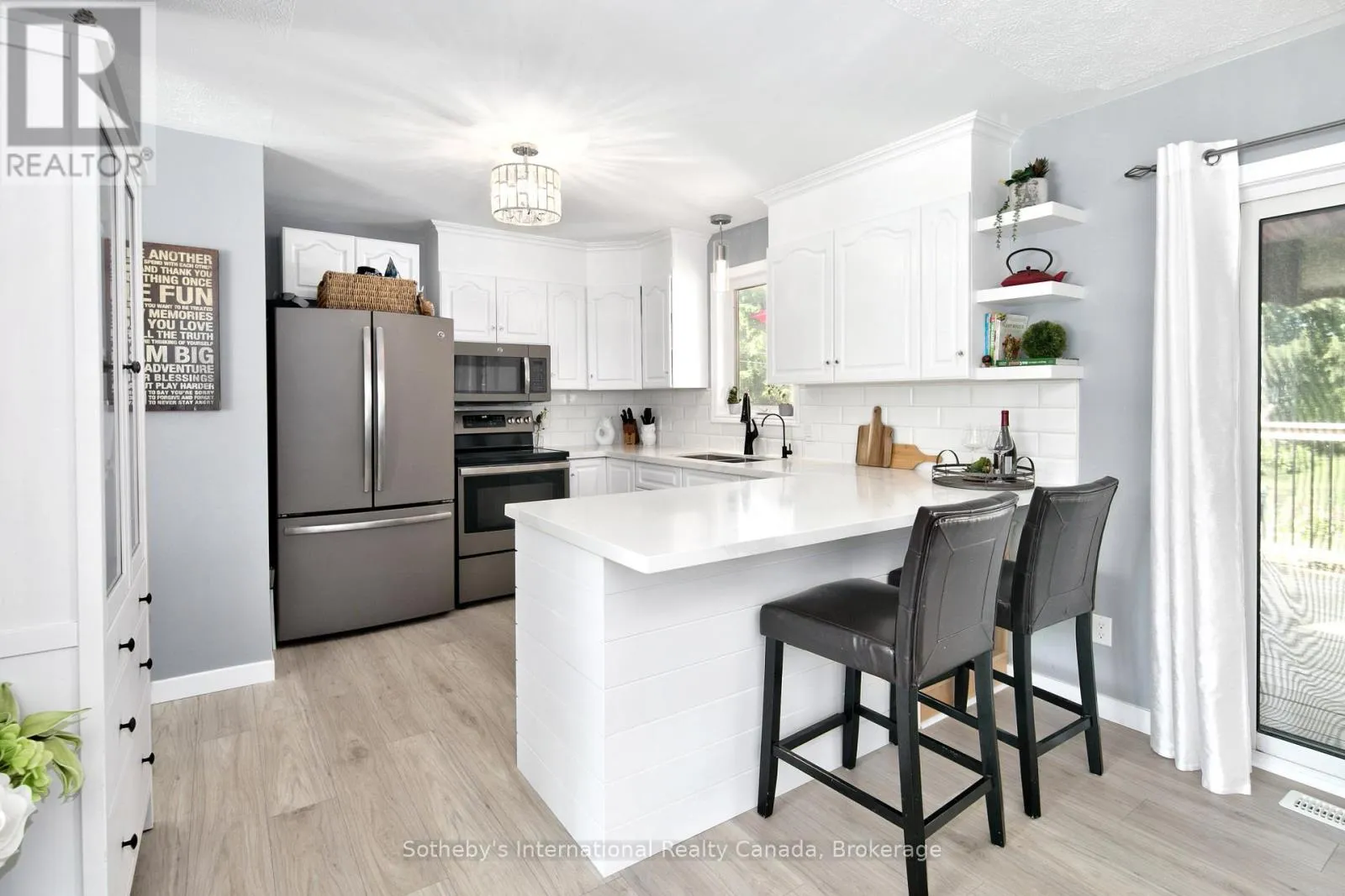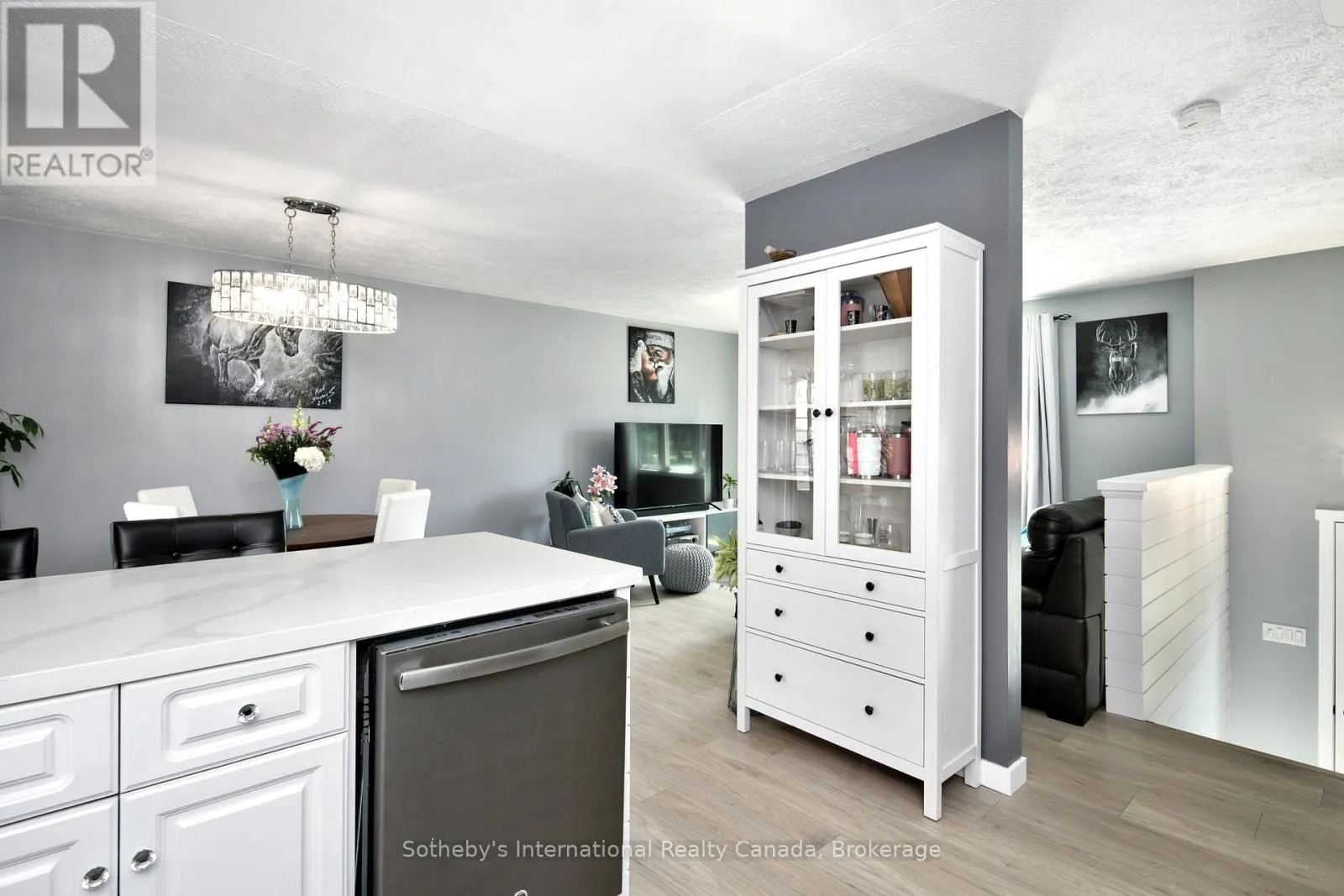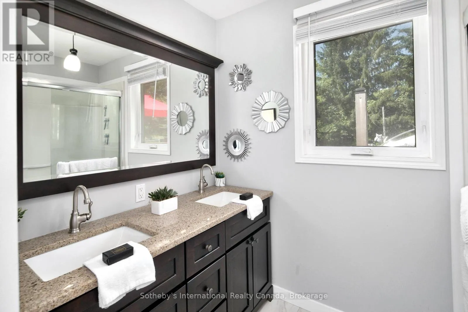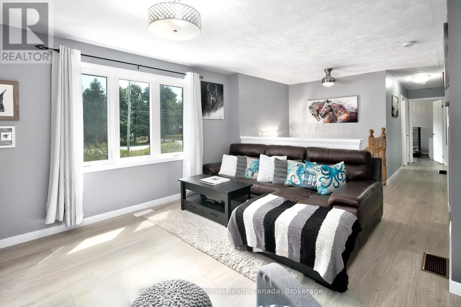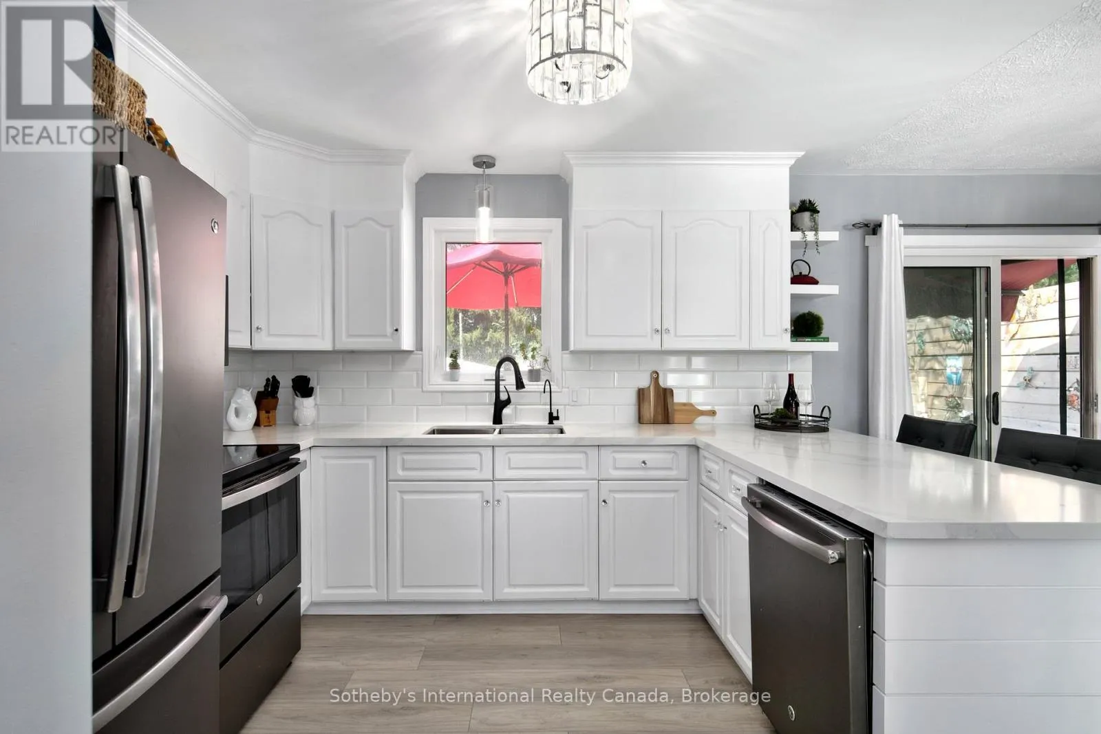 Cross Streets: Greenfield Drive. ** Directions: Cook Street to Miller continue on Grey Rd 12 and turn right on Greenfield Drive. Welcome to this charming raised bungalow nestled on a highly sought-after, quiet cul-de-sac. Situated on a generous 0.5+ acre lot, this home offers exceptional privacy surrounded by mature trees your own private retreat just minutes from town. Step outside onto the expansive deck, perfect for entertaining or simply enjoying the serene, tree-lined setting. Step inside to discover a beautiful abundance of light, and an open interior featuring thoughtfully renovated rooms. The main floor boasts a spacious primary bedroom, two additional bedrooms, an open concept kitchen highlighted with quartz counter tops and a stylish shiplap feature wall that adds warmth and character. The lower level offers even more living space with an additional bedroom, a large rec room, an exercise room, and the potential for an in-law suite ideal for multigenerational living or guests. This is a rare opportunity to own a move-in ready home in a tranquil, family-friendly location with plenty of room to grow. (id:27476)