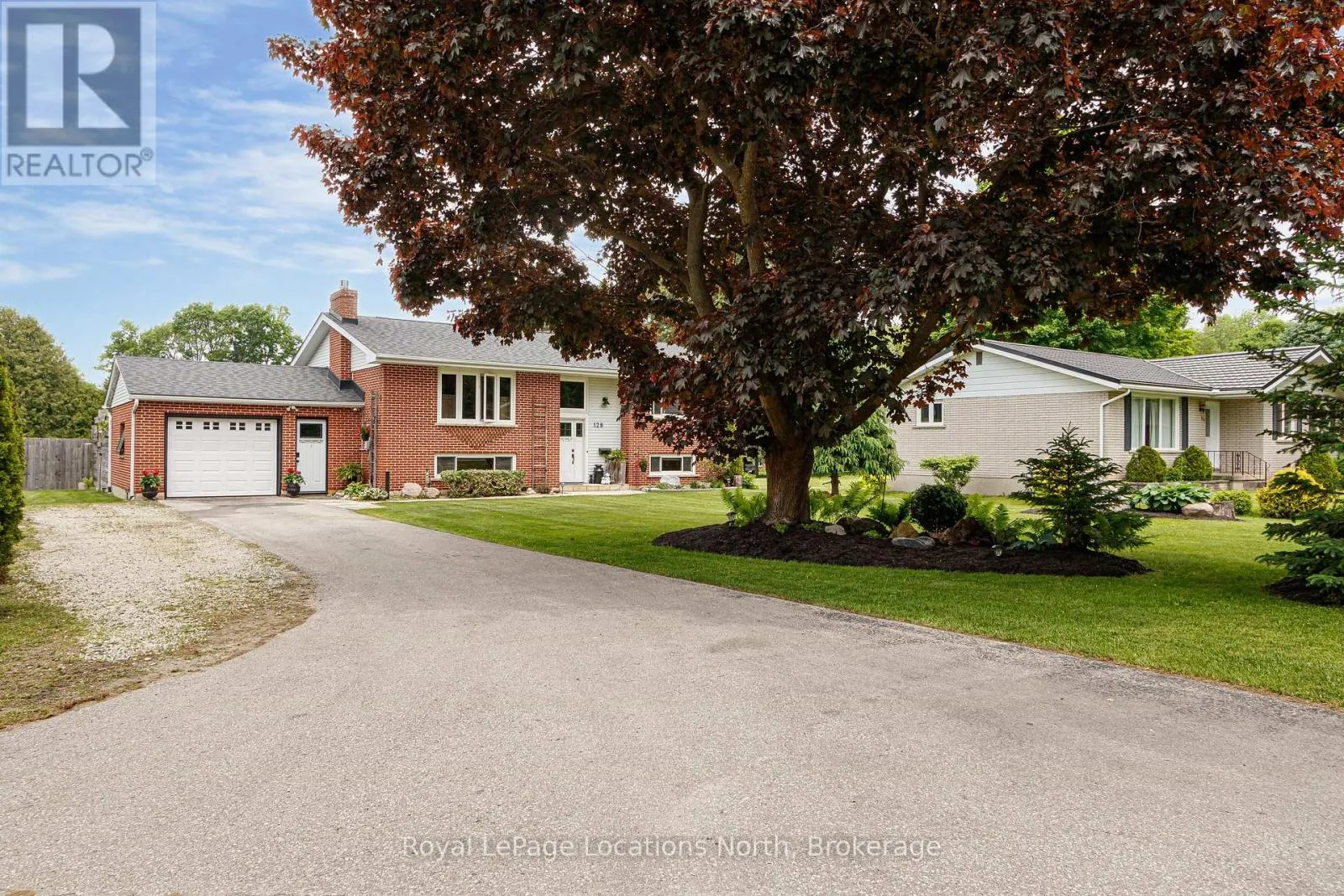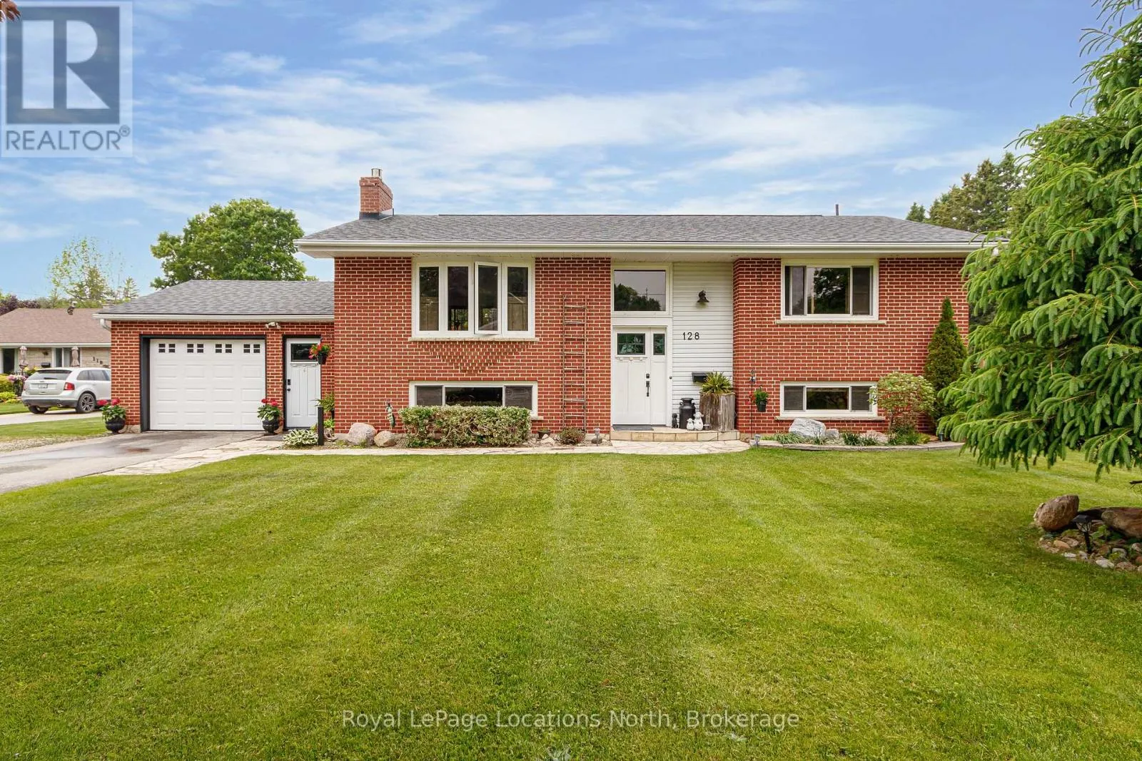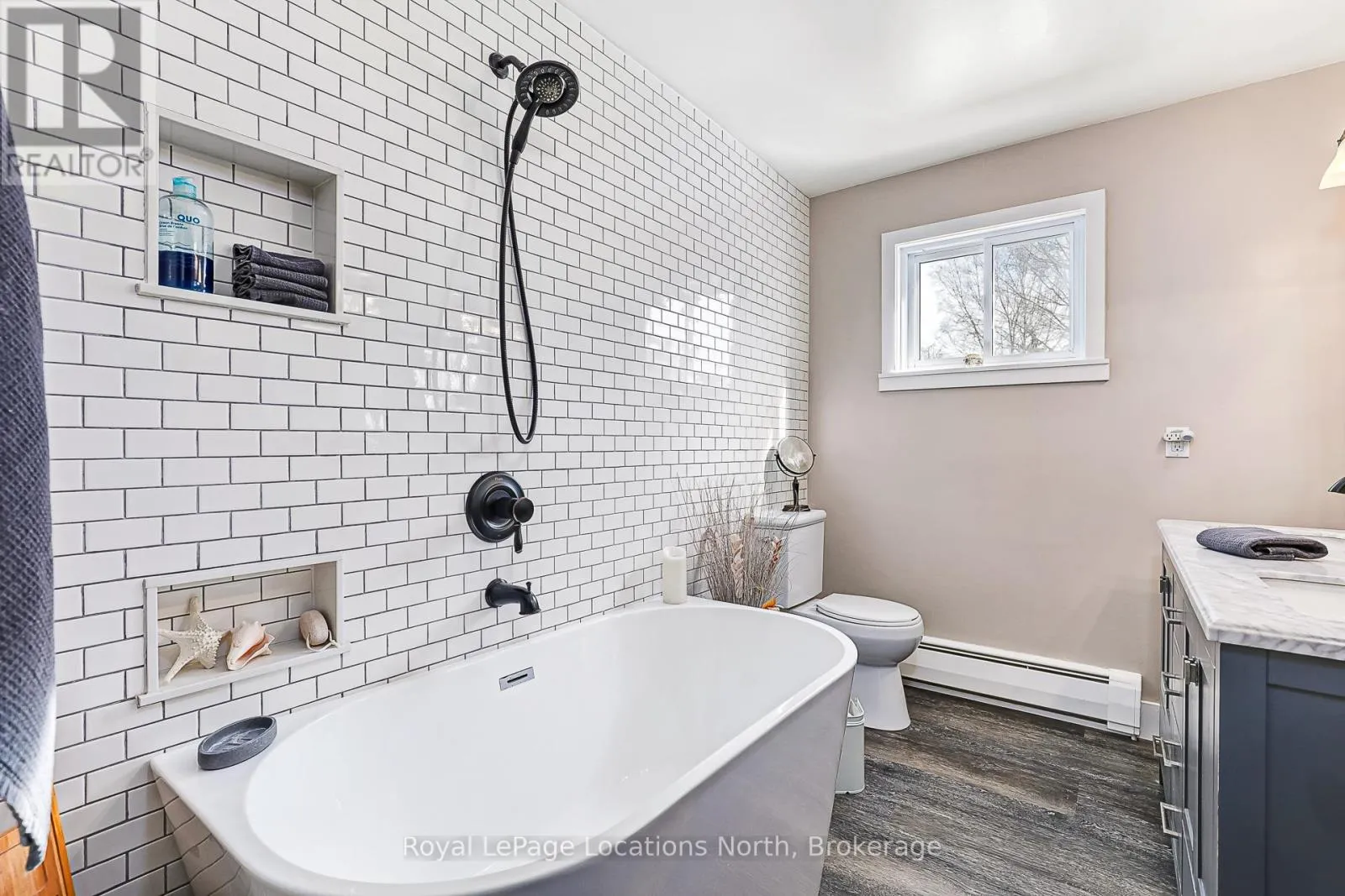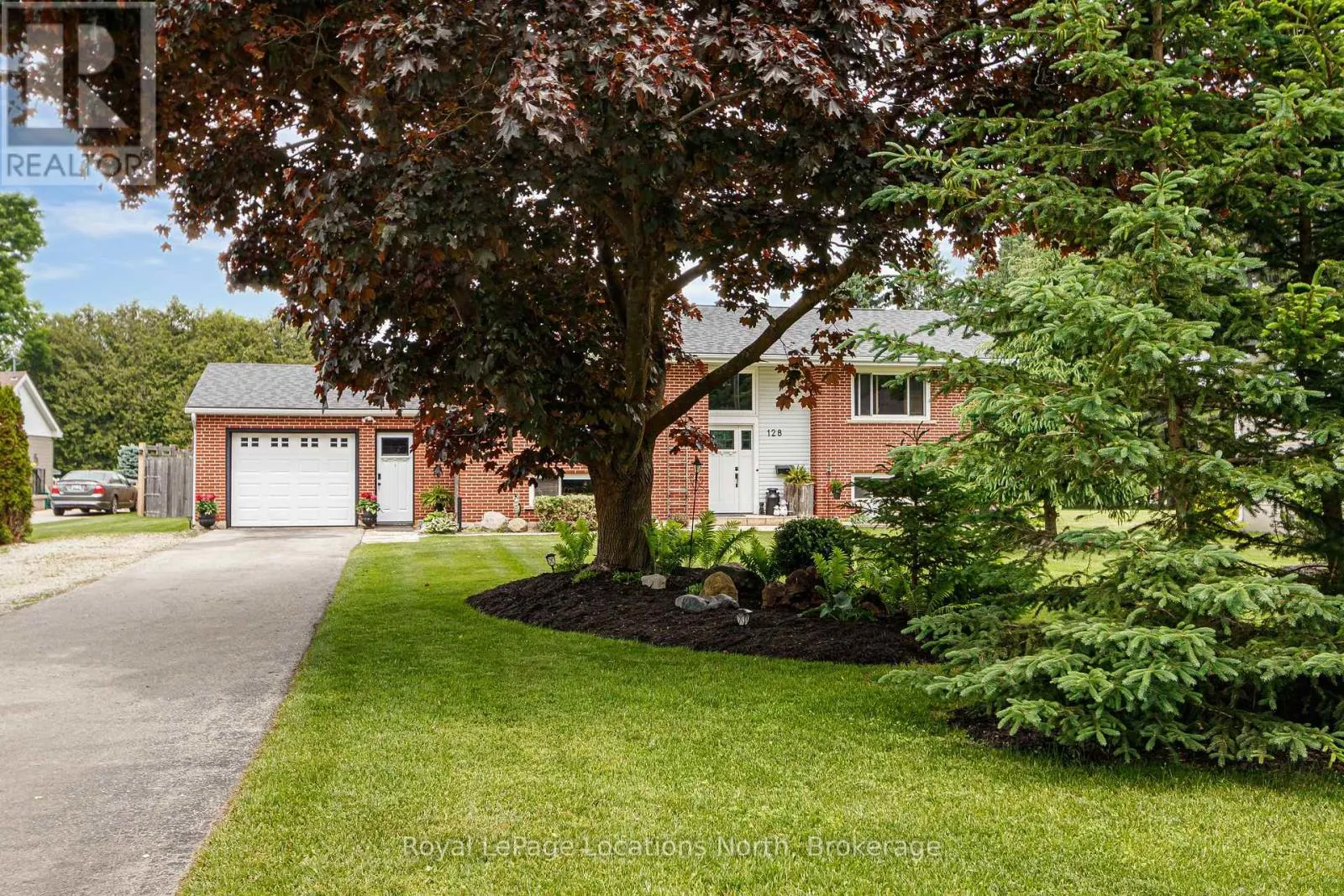Cross Streets: Highway 26 and St Vincent St. ** Directions: Highway 26 to St Vincent Street. Right on Montgomery. #128 see sign. Welcome to this fully renovated gem on one of Meaford's most sought-after streets Montgomery Street, affectionately known as Teachers Row. Homes here rarely come to market, and its easy to see why. This charming 3-bed, 3-bath solid brick home sits on over half an acre, offering in-town convenience, timeless style, and relaxed living just a short stroll to Georgian Bays sandy shores and the local school. Bathed in natural light from sunrise to sunset, the home is perfectly positioned to enjoy both morning rays and evening views from the front and back decks. Curb appeal shines with a paved driveway, natural stone walkway, and heated, partially insulated garage with inside access via the lower-level mudroom. Inside, the open-concept kitchen and dining area impresses with a custom handcrafted island, solid wood cabinetry, and Maytag True Fingerprint-Resistant appliances. Step through the walkout to your fully fenced backyard, ideal for entertaining or taking in the seasonal Bay views. The main floor features a spacious primary bedroom with LG Laundry Tower, a generous second bedroom, and a luxurious 5-piece bath with double sinks and soaker tub. The lower level includes a private third bedroom with 3-piece ensuite (in-floor heat, rainhead shower, custom vanity), a second kitchenette, cozy living area with electric fireplace, and separate entrance ideal for guests or income potential. A bonus 380 sq ft family room features a gas fireplace and its own 3-piece bath with in-floor heating and rainhead shower, perfect for movie nights or playtime. Outside, enjoy stone landscaping, a sand pad with drainage for pool or firepit, 30AMP RV hookup, and generator rough-in all ready for year-round enjoyment. This is Meaford living at its best. (id:27476)