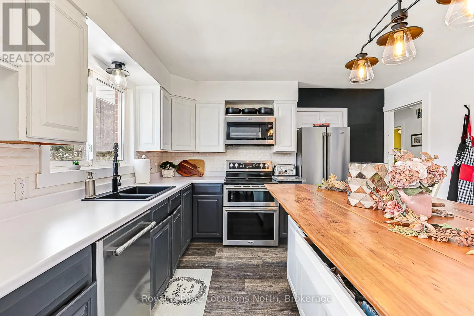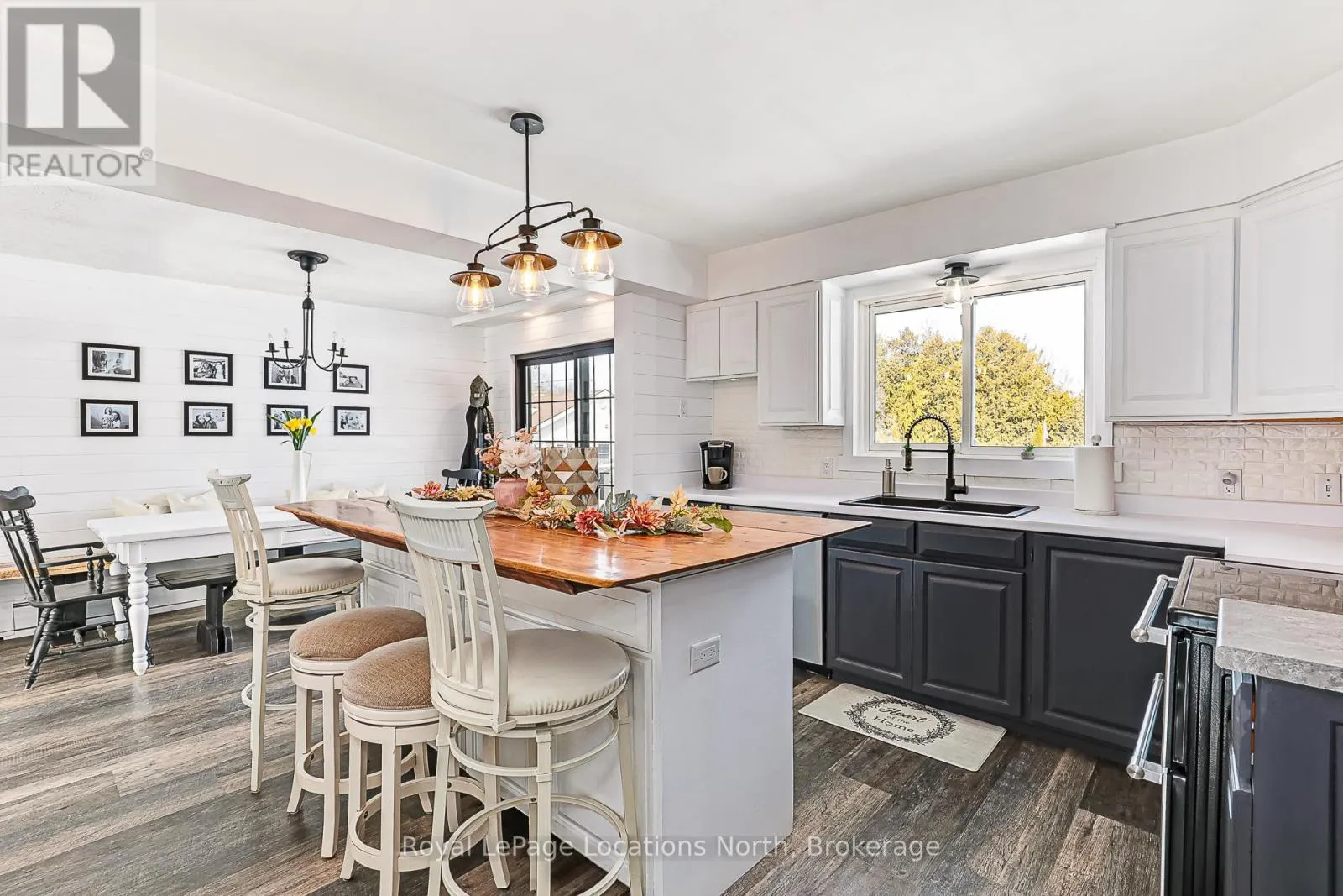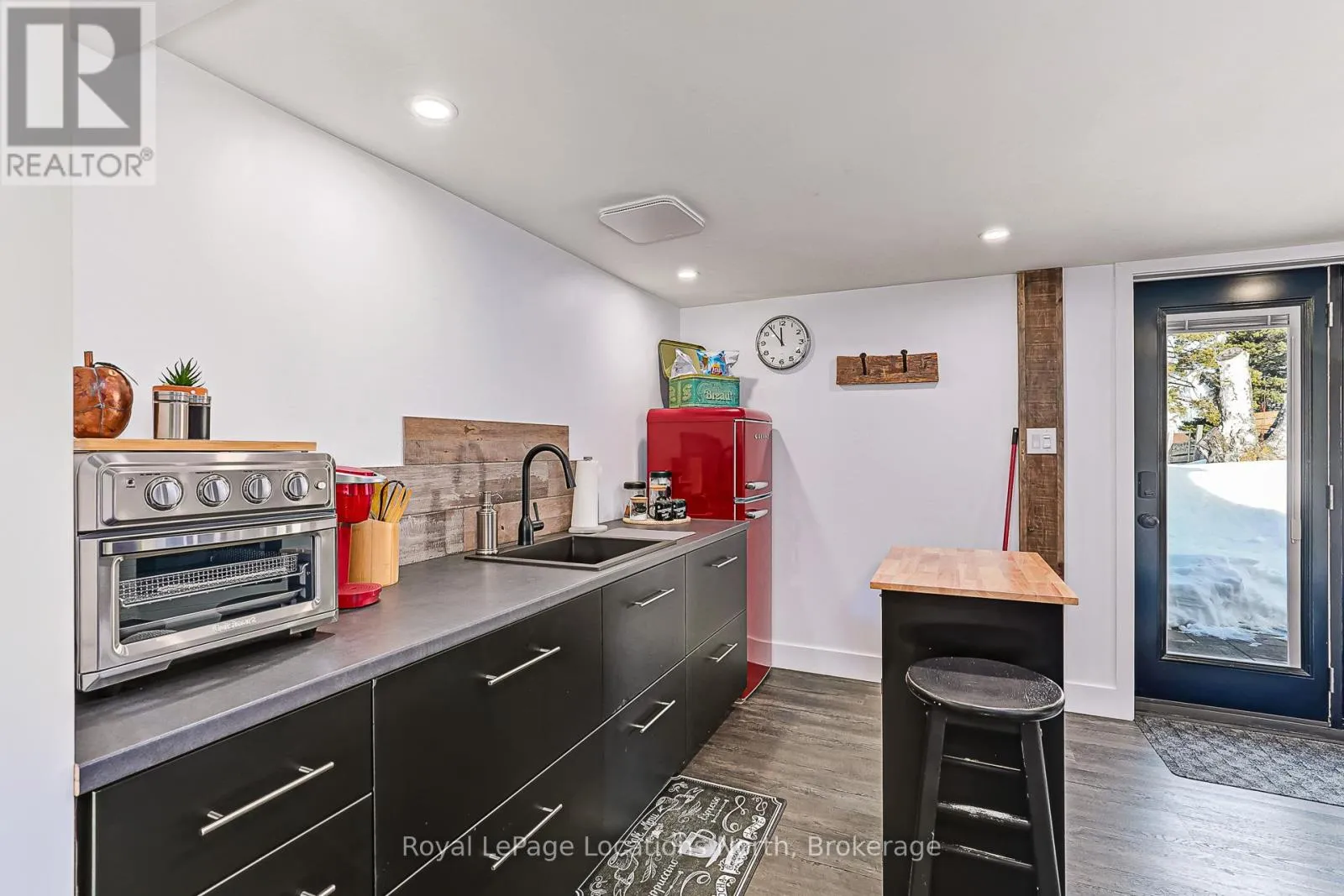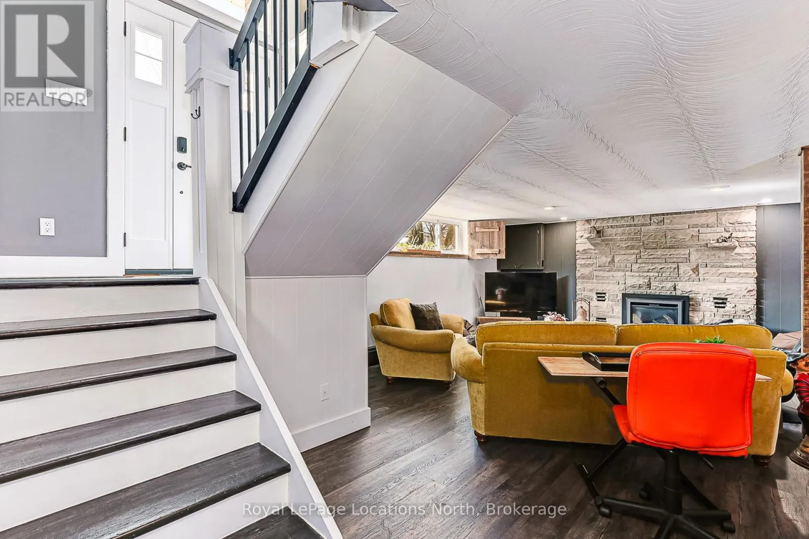Cross Streets: Highway 26 and St Vincent St. ** Directions: Highway 26 to St Vincent Street. Right on Montgomery. #128 see sign. Welcome to this fully renovated gem on one of Meaford's most sought-after streets Montgomery Street, affectionately known as Teachers Row. Homes here rarely come to market, and its easy to see why. This charming 3-bed, 3-bath solid brick home sits on over half an acre, offering in-town convenience, timeless style, and relaxed living just a short stroll to Georgian Bays sandy shores and the local school. Bathed in natural light from sunrise to sunset, the home is perfectly positioned to enjoy both morning rays and evening views from the front and back decks. Curb appeal shines with a paved driveway, natural stone walkway, and heated, partially insulated garage with inside access via the lower-level mudroom. Inside, the open-concept kitchen and dining area impresses with a custom handcrafted island, solid wood cabinetry, and Maytag True Fingerprint-Resistant appliances. Step through the walkout to your fully fenced backyard, ideal for entertaining or taking in the seasonal Bay views. The main floor features a spacious primary bedroom with LG Laundry Tower, a generous second bedroom, and a luxurious 5-piece bath with double sinks and soaker tub. The lower level includes a private third bedroom with 3-piece ensuite (in-floor heat, rainhead shower, custom vanity), a second kitchenette, cozy living area with electric fireplace, and separate entrance ideal for guests or income potential. A bonus 380 sq ft family room features a gas fireplace and its own 3-piece bath with in-floor heating and rainhead shower, perfect for movie nights or playtime. Outside, enjoy stone landscaping, a sand pad with drainage for pool or firepit, 30AMP RV hookup, and generator rough-in all ready for year-round enjoyment. This is Meaford living at its best. (id:27476)