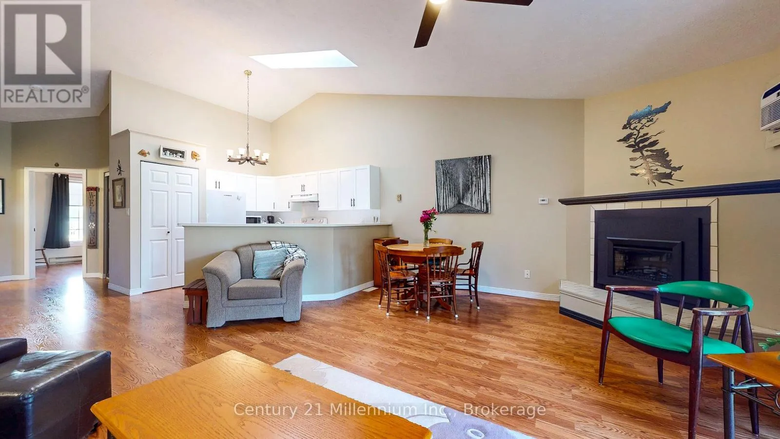 Cross Streets: Victoria St and William St. ** Directions: Sykes St to William St right on Victoria. Exceptional Value in the lovely community of Meaford! This charming bungalow offers a perfect blend of comfort and convenience in a year-round recreational paradise. The open-concept main floor boasts a spacious great room, dining area, and kitchen, all seamlessly flowing together. The soaring cathedral ceilings, patio doors and skylight in the great room create an airy, light-filled space, enhanced by a stylish new electric built-in fireplace. Step outside to a large, private deck, shaded by a mature maple tree ideal for relaxing or barbequing (hooked up to a gas line) on those warm summer days. The main floor also features a serene primary bedroom and a modern 4-piece bathroom. The lower level is designed for relaxation and functionality, with a cozy family room, furnace room with ample storage, a generously sized second bedroom with a 3-piece ensuite, and a convenient laundry area. This property is part of a private, tranquil 20-unit community, offering a large clubhouse perfect for family gatherings, along with plenty of visitor parking. You'll love the proximity to Georgian Bay, the Meaford Arts and Cultural Centre, and a wealth of local amenities including downtown shops, restaurants, a golf course, curling club, hiking trails, and ski hills just a short drive away. With everything you need right at your doorstep, this home is the perfect place to enjoy all that Meaford has to offer. Flexible closing. Total square feet of living space 1493 SQFT. Furnishings could be included if desired. (id:27476)