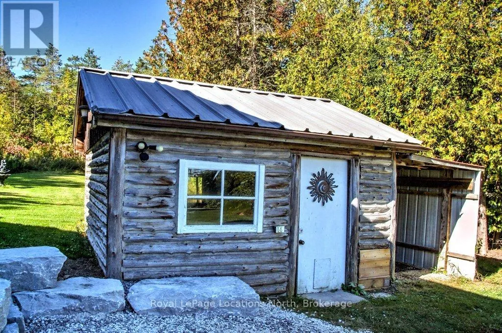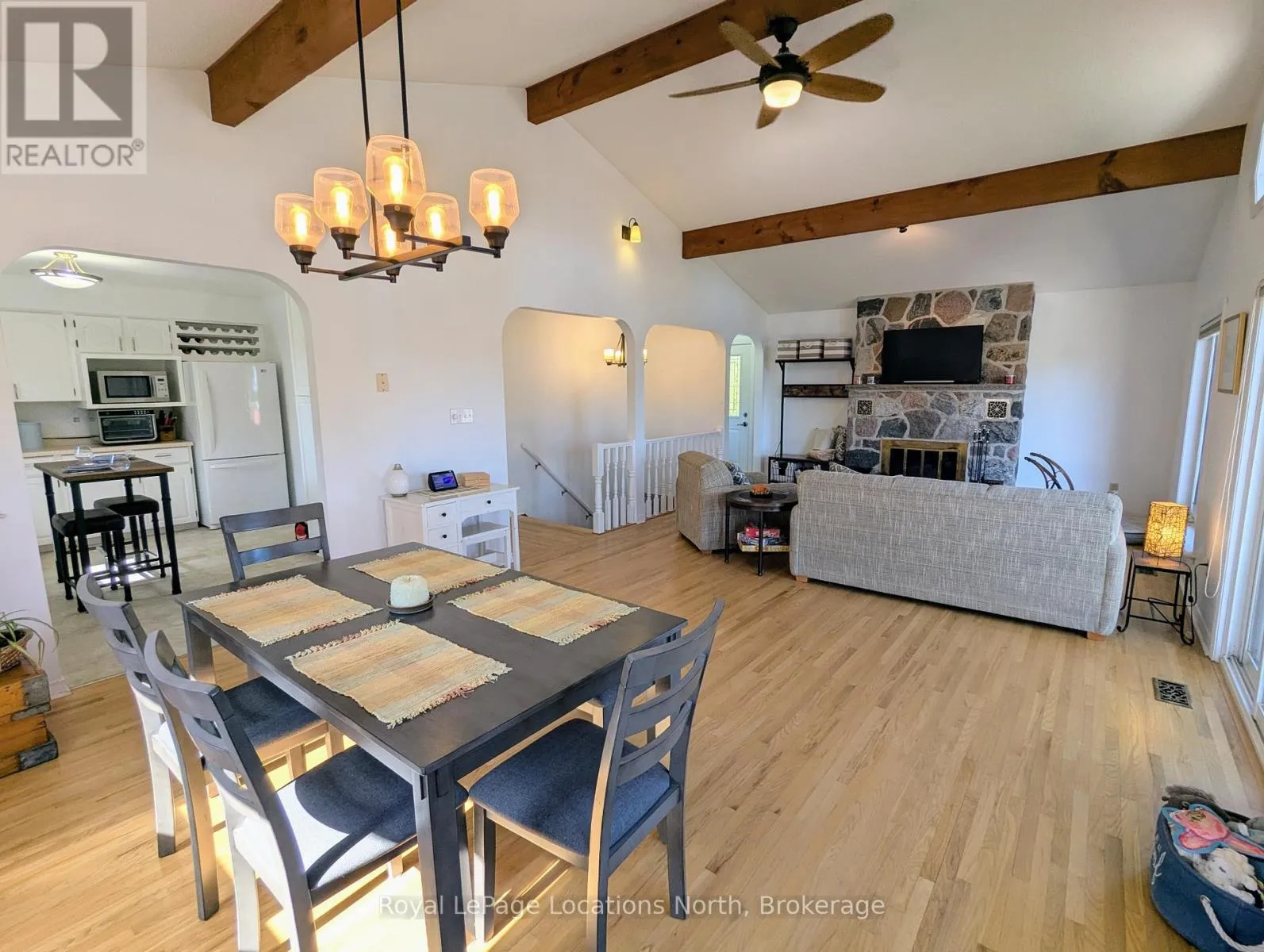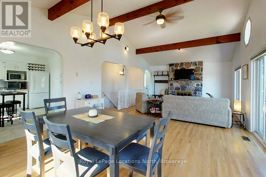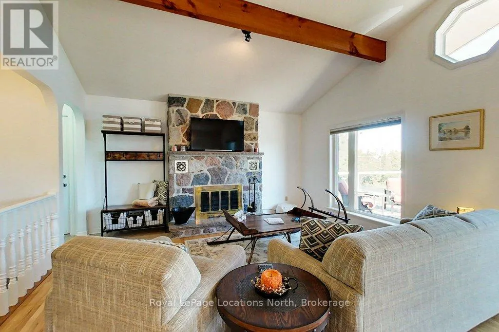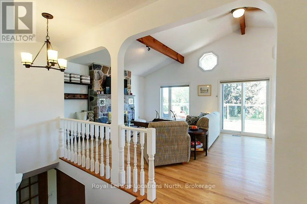 Cross Streets: Sideroad 22 and Lakeshore Rd N. ** Directions: Hwy 26 west of Meaford. North on 7th Line. East on Sideroad 22. South on Lakeshore Rd N to sign. Poised on a gently sloping lot, this captivating chalet style, four-bedroom, two-bathroom home is filled with natural light and partial views of Georgian Bay and water access across the street. Some of the most attractive highlights of this home include the cathedral ceiling in the main living area, the floor to ceiling stone fireplace and the walk out to the generous sized deck. The main floor boasts hardwood floors, a renovated semi-ensuite bathroom, walk out to the back deck and two great sized bedrooms. The open concept living area is a joy to spend time in whether it's cooking on the gas stove in the kitchen, entertaining or reading a book by the fire. On the lower level you will be pleasantly surprised with the walk out family room with gas fireplace and full window wall, two additional bedrooms, a large and bright laundry/storage room and a 3-piece bathroom. Step outside to the large yard space at the rear of the house, original cabin which would make a terrific studio or play space if you opted not to use it as a shed. New furnace 2024. New exterior stone retaining wall and stone steps 2025. New water heater 2023. Living area furniture negotiable. The location of this home positions you on the edge of town, near all amenities, shops and restaurants in Meaford while providing you the cottage feel with Georgian Bay right across the street. Grab a picnic and stroll down to St Vincent Park on the shore. (id:27476)
