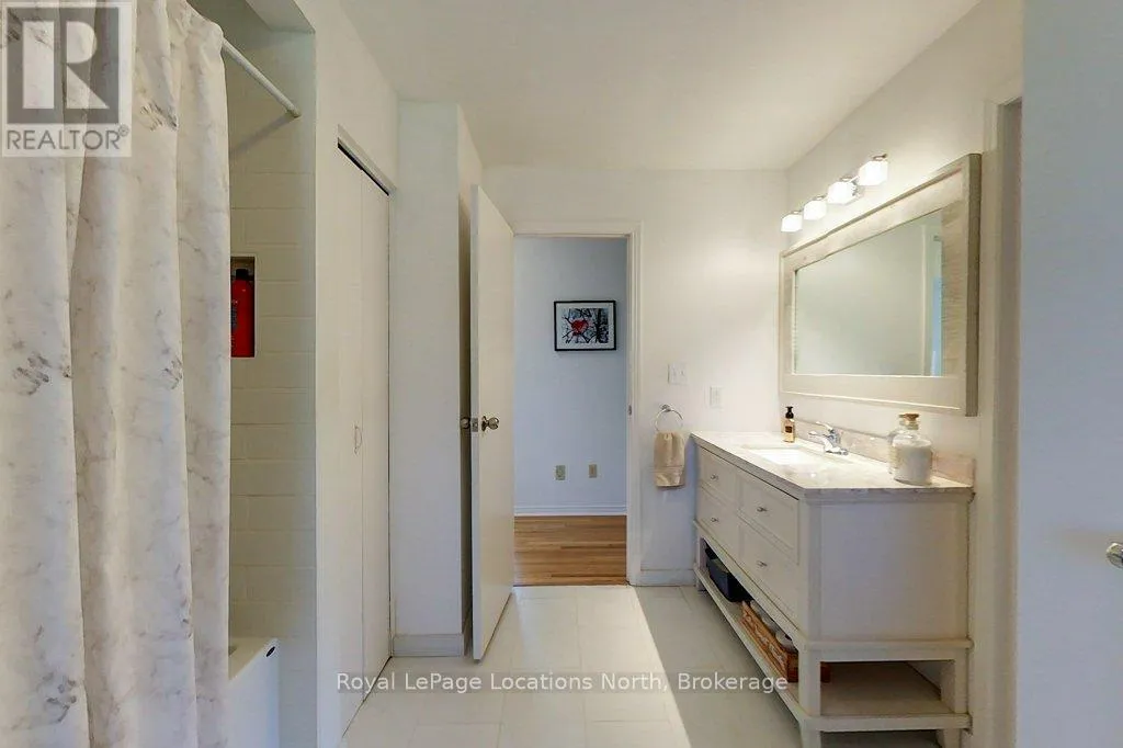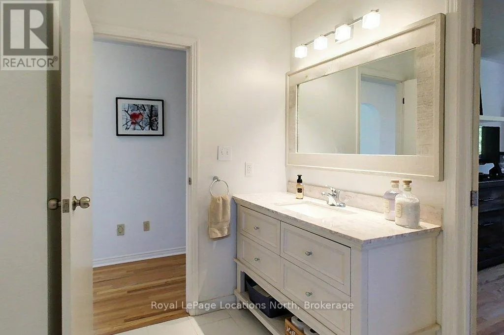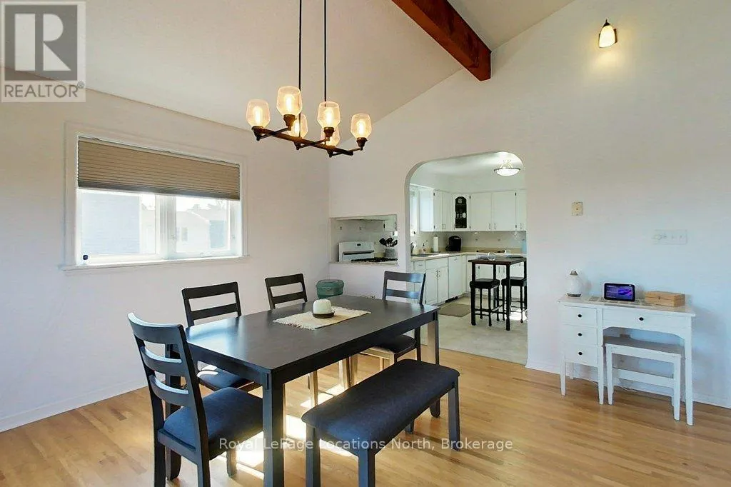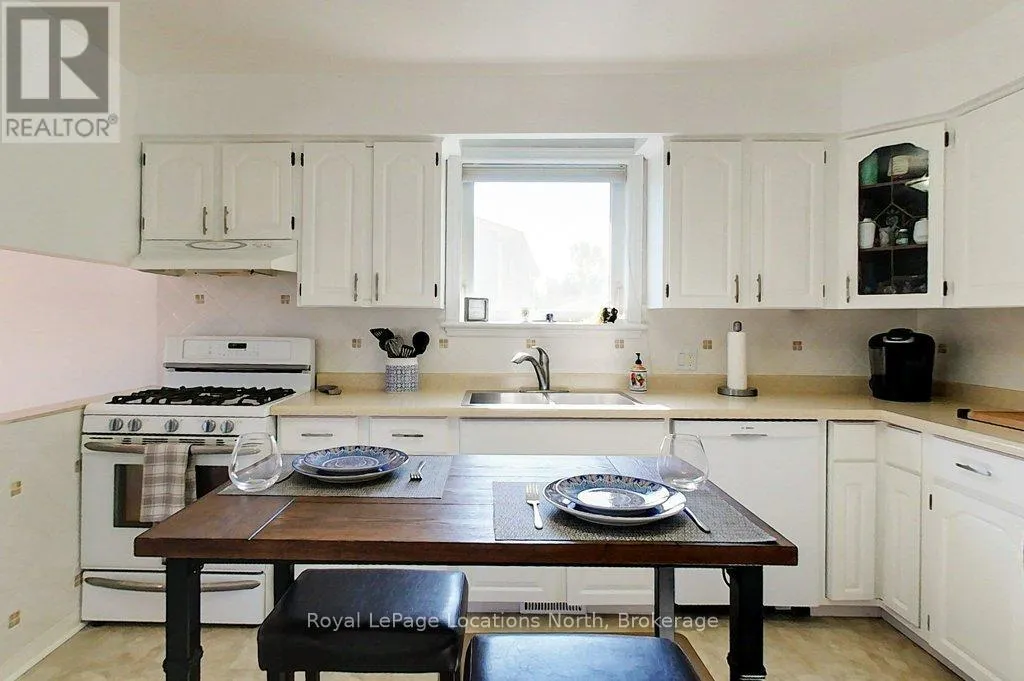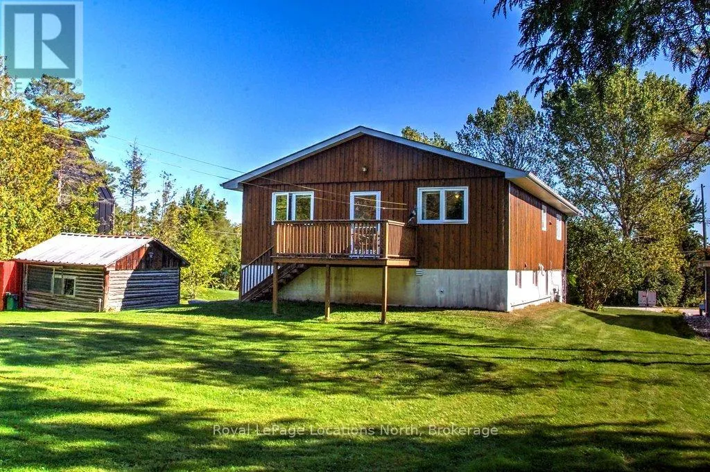 Cross Streets: Sideroad 22 and Lakeshore Rd N. ** Directions: Hwy 26 west of Meaford. North on 7th Line. East on Sideroad 22. South on Lakeshore Rd N to sign. Poised on a gently sloping lot, this captivating chalet style, four-bedroom, two-bathroom home is filled with natural light and partial views of Georgian Bay and water access across the street. Some of the most attractive highlights of this home include the cathedral ceiling in the main living area, the floor to ceiling stone fireplace and the walk out to the generous sized deck. The main floor boasts hardwood floors, a renovated semi-ensuite bathroom, walk out to the back deck and two great sized bedrooms. The open concept living area is a joy to spend time in whether it's cooking on the gas stove in the kitchen, entertaining or reading a book by the fire. On the lower level you will be pleasantly surprised with the walk out family room with gas fireplace and full window wall, two additional bedrooms, a large and bright laundry/storage room and a 3-piece bathroom. Step outside to the large yard space at the rear of the house, original cabin which would make a terrific studio or play space if you opted not to use it as a shed. New furnace 2024. New exterior stone retaining wall and stone steps 2025. New water heater 2023. Living area furniture negotiable. The location of this home positions you on the edge of town, near all amenities, shops and restaurants in Meaford while providing you the cottage feel with Georgian Bay right across the street. Grab a picnic and stroll down to St Vincent Park on the shore. (id:27476)