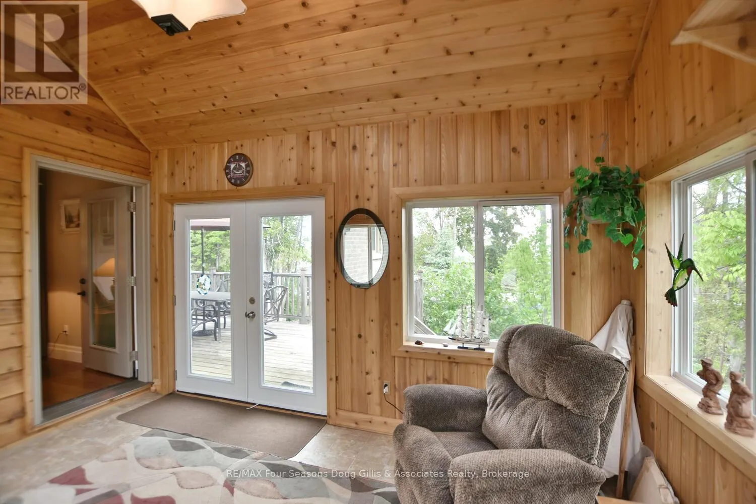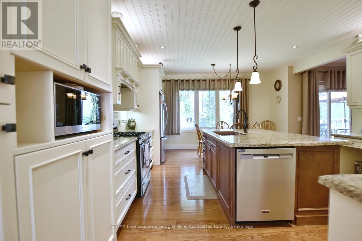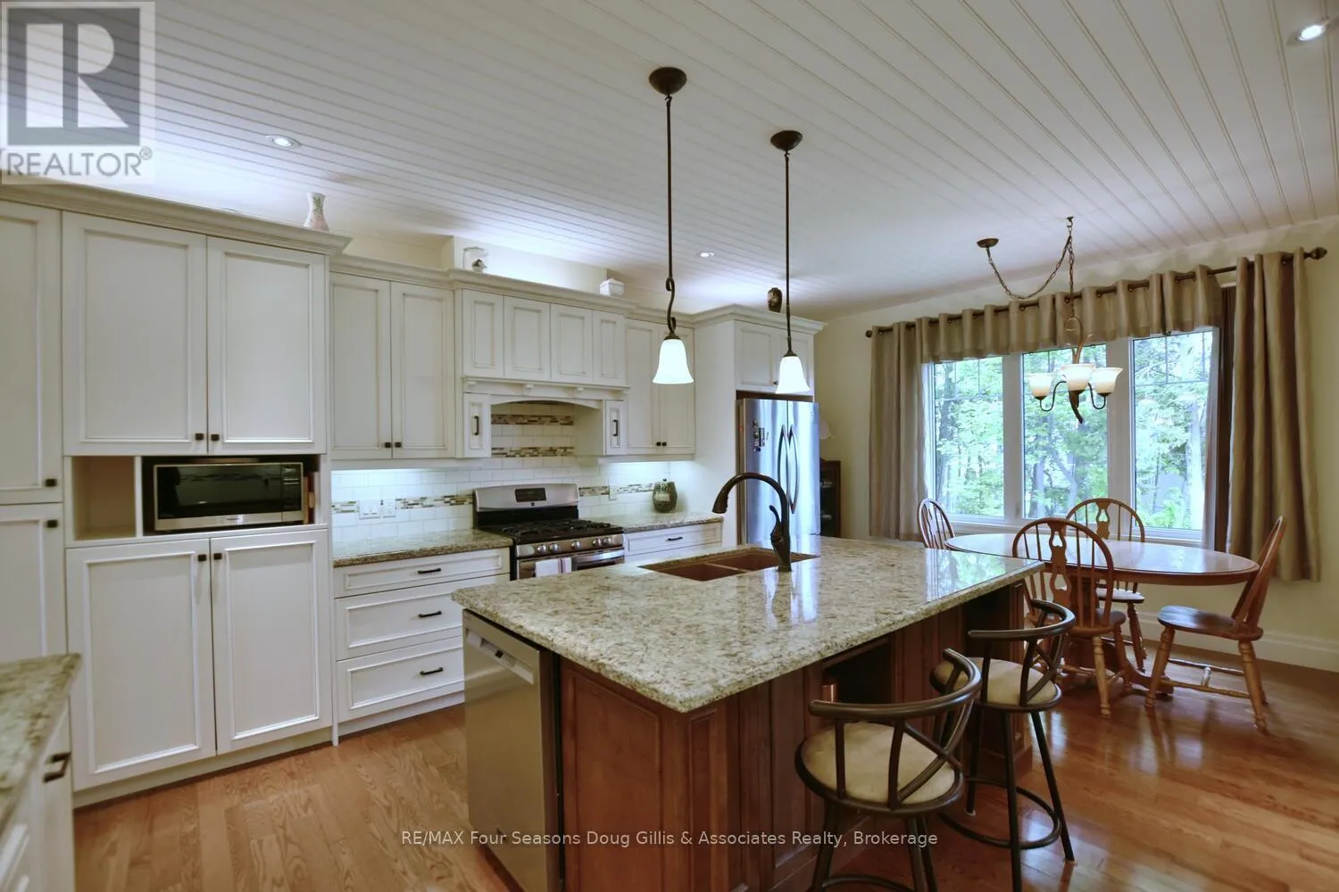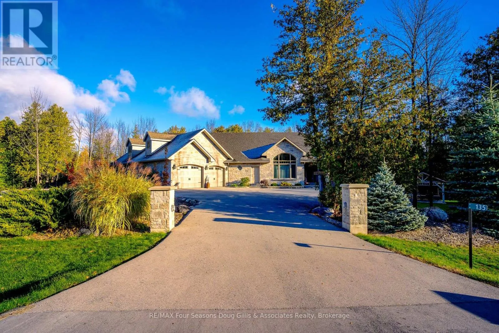 Cross Streets: Algonquin Drive and Lakeshore Rd. ** Directions: Head west on HWY 26 through Meaford, Turn right on Ford Ave, Left on Lakeshore Rd, Left on Algonquin Drive and a right on Algonquin Drive. House is on the right. This stunning 4,588 sqft custom-built home is perfectly situated on a quiet 0.89-acre(+/-) cul-de-sac in one of Meaford's most desirable neighborhoods. Designed for comfort, style, and functionality, this 5-bedroom, 3.5-bath residence combines timeless curb appeal with thoughtful interior details. The exterior features professional landscaping, split rail fencing, dual stone-pillared driveways, and a striking stone & brick façade with steep rooflines and large windows. Inside, the main floor offers 9' ceilings, wide hallways, oak hardwood and ceramic flooring, and vaulted ceilings with tongue-and-groove paneling in the open-concept living, dining, and kitchen areas. A gas fireplace with custom oak built-ins provides a cozy focal point. The chef's kitchen includes custom off-white cabinetry, granite countertops, dual stone sinks, a central island, tiled backsplash, and stainless-trim appliances, including a gas range, hood, fridge with ice-maker, and dishwasher. A cedar-lined 3-season sunroom adds charm and versatility, while the living room opens to a deck with panoramic Georgian Bay views. The lower level features a spacious rec room with walk-out access, providing flexible space for entertaining, recreation, or family living. Both garages are oversized, insulated, and drywalled - one with heated floors, the other with a unit heater - offering room for up to 4 vehicles, a workshop, or additional storage. The yard is fully equipped for outdoor living, including a vegetable garden and garden shelter. Additional features include main-floor laundry with front-load washer/dryer, natural gas furnace, central air, HRV system, dual hot water heaters, central vacuum, municipal water, and an Eco-Flow septic system serviced annually. Built by the owner to an exceptionally high standard with quality materials and craftsmanship, this home is ideal for families, investors, or anyone seeking upscale, peaceful living just minutes from Meaford's waterfront, golf, and amenities. (id:27476)