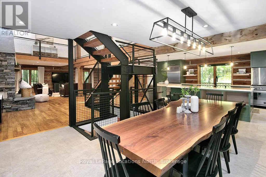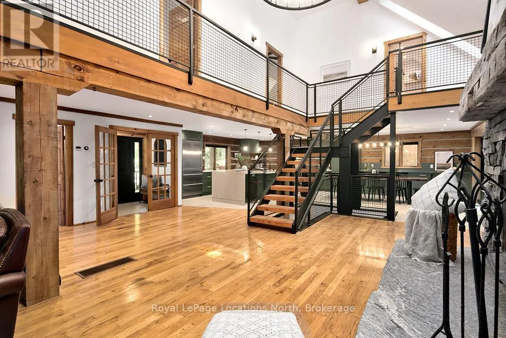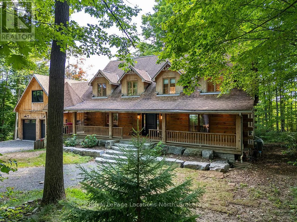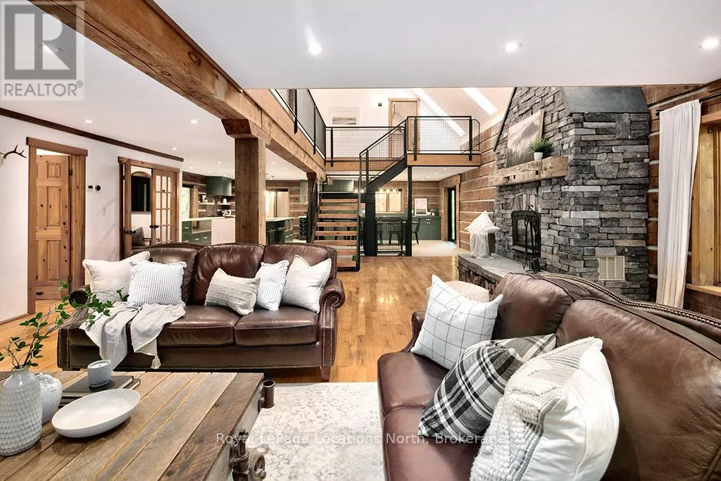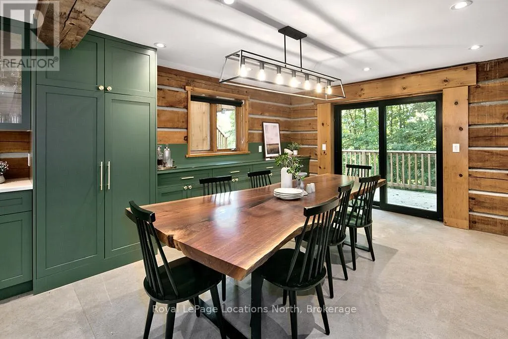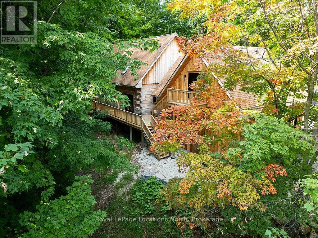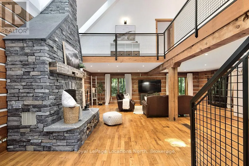 Cross Streets: 22nd Sdrd & 11th Line. ** Directions: Hwy 26 to 7th Line North to 22nd Sdrd West To Sign. Where Rustic Beauty Meets Modern Luxury! Nestled on a quiet road and surrounded by mature trees, this fully renovated custom log home is a rare blend of rustic charm and modern luxury. Set on 1.4 acres, surrounded by forest with a southwest-facing backyard - perfect for veggie gardens and soaking in afternoon sun as it dances across the property. Steps from the Tom Thomson Trail - ideal for a peaceful evening unwind and just a 5-minute drive to the pristine waterfront at St. Vincent Park on Georgian Bay. Enjoy a true country setting, only 10 minutes to downtown Meaford and a short drive to Owen Sound for city conveniences. Every detail in this home has been thoughtfully considered. At the heart is a stunning designer kitchen in a warm earthy green, featuring top-tier appliances, smart tech, and custom cabinetry that flows seamlessly into the expansive dining room. Clever additions like integrated outlets, a charging cupboard tucked into the hidden pantry, and a second oven in the oversized island make this space both functional and beautiful. The dining room opens onto the back deck, perfect for entertaining. The living room impresses with cathedral ceilings, a dramatic statement light, and a floor-to-ceiling wood-burning stone fireplace - ideal for cozy après-ski evenings. Upstairs, the spacious primary bedroom offers a spa-like 3-piece ensuite with heated floors and custom cabinetry. Two additional bedrooms share a stylish 4-piece bath, with original hardwood floors flowing throughout the upper level. A striking metal staircase leads to the lower level - perfect for entertaining with a custom wet bar, pool table, surround sound wiring, and a sleek bathroom with heated tile floors. A fourth bedroom or home office adds flexibility. The oversized 2-car garage features heated floors, custom cabinetry, extra-tall ceilings, and a bonus second floor for a studio, gym, or storage. This is more than a home - its a lifestyle, where nature & luxury exist in perfect harmony. (id:27476)