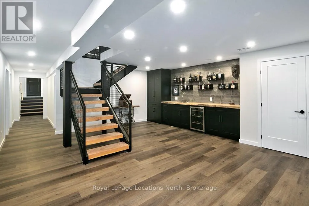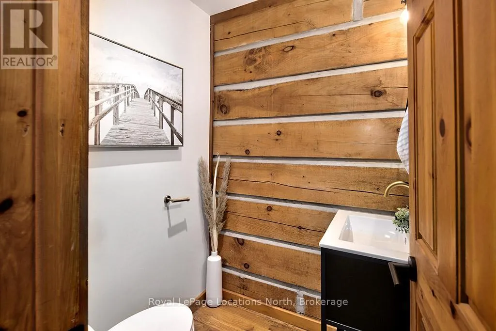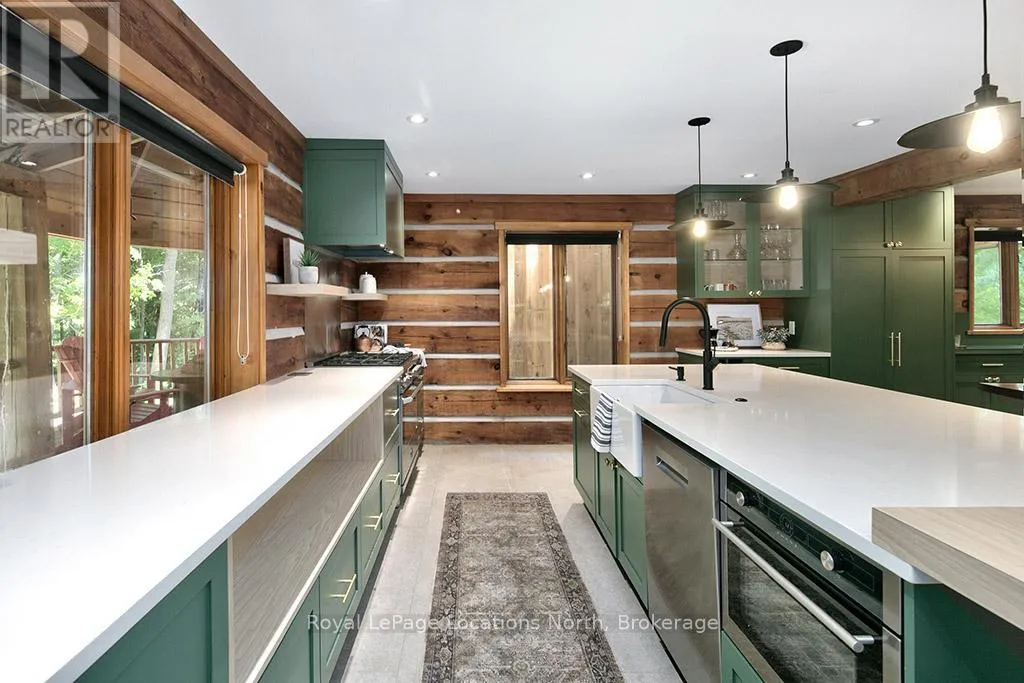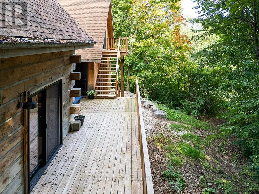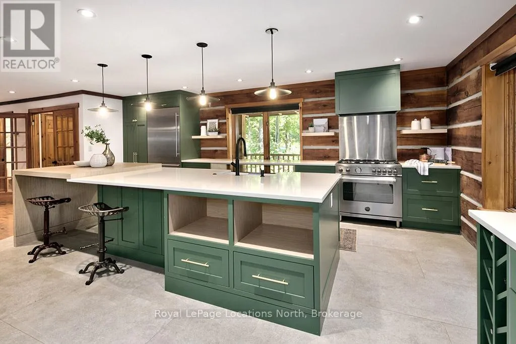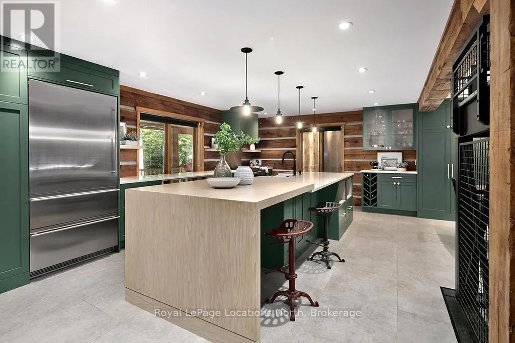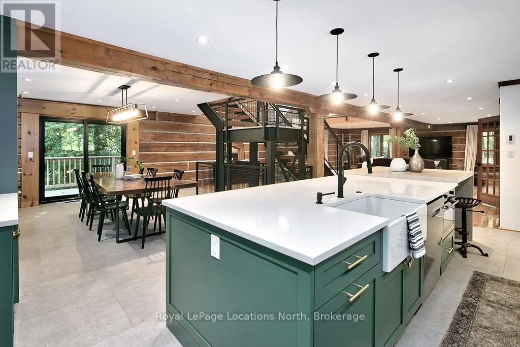 Cross Streets: 22nd Sdrd & 11th Line. ** Directions: Hwy 26 to 7th Line North to 22nd Sdrd West To Sign. Where Rustic Beauty Meets Modern Luxury! Nestled on a quiet road and surrounded by mature trees, this fully renovated custom log home is a rare blend of rustic charm and modern luxury. Set on 1.4 acres, surrounded by forest with a southwest-facing backyard - perfect for veggie gardens and soaking in afternoon sun as it dances across the property. Steps from the Tom Thomson Trail - ideal for a peaceful evening unwind and just a 5-minute drive to the pristine waterfront at St. Vincent Park on Georgian Bay. Enjoy a true country setting, only 10 minutes to downtown Meaford and a short drive to Owen Sound for city conveniences. Every detail in this home has been thoughtfully considered. At the heart is a stunning designer kitchen in a warm earthy green, featuring top-tier appliances, smart tech, and custom cabinetry that flows seamlessly into the expansive dining room. Clever additions like integrated outlets, a charging cupboard tucked into the hidden pantry, and a second oven in the oversized island make this space both functional and beautiful. The dining room opens onto the back deck, perfect for entertaining. The living room impresses with cathedral ceilings, a dramatic statement light, and a floor-to-ceiling wood-burning stone fireplace - ideal for cozy après-ski evenings. Upstairs, the spacious primary bedroom offers a spa-like 3-piece ensuite with heated floors and custom cabinetry. Two additional bedrooms share a stylish 4-piece bath, with original hardwood floors flowing throughout the upper level. A striking metal staircase leads to the lower level - perfect for entertaining with a custom wet bar, pool table, surround sound wiring, and a sleek bathroom with heated tile floors. A fourth bedroom or home office adds flexibility. The oversized 2-car garage features heated floors, custom cabinetry, extra-tall ceilings, and a bonus second floor for a studio, gym, or storage. This is more than a home - its a lifestyle, where nature & luxury exist in perfect harmony. (id:27476)