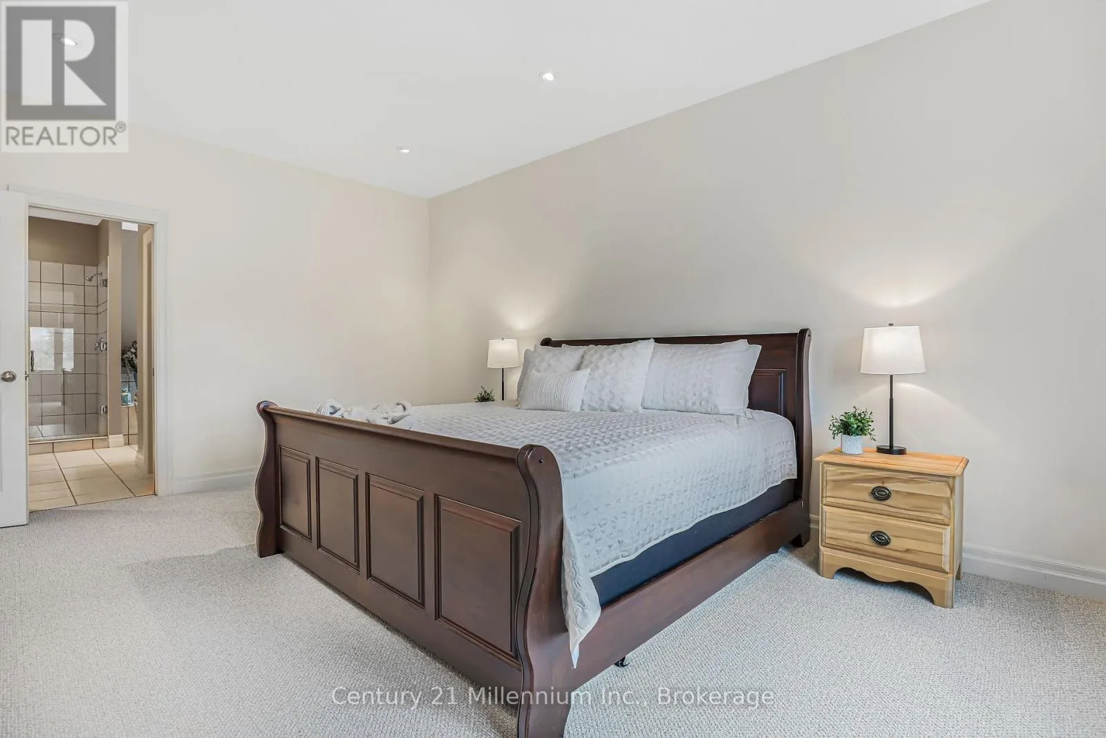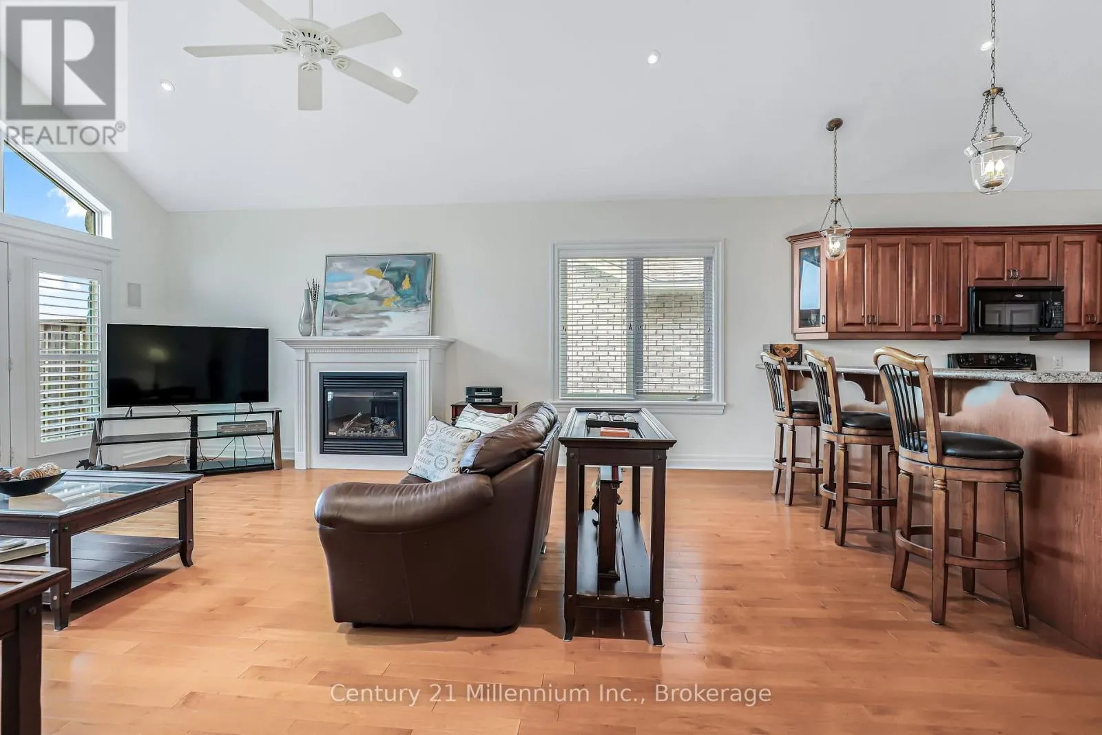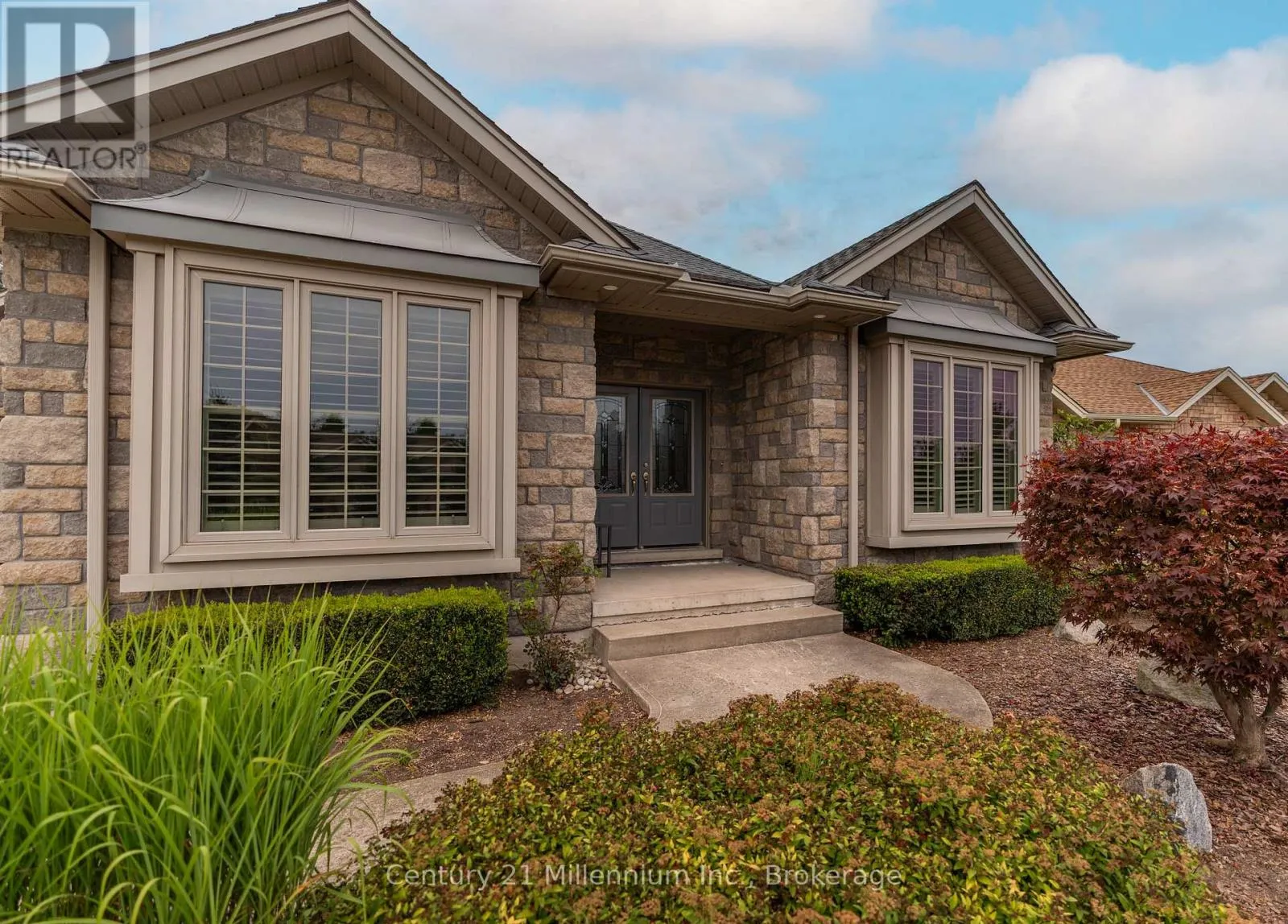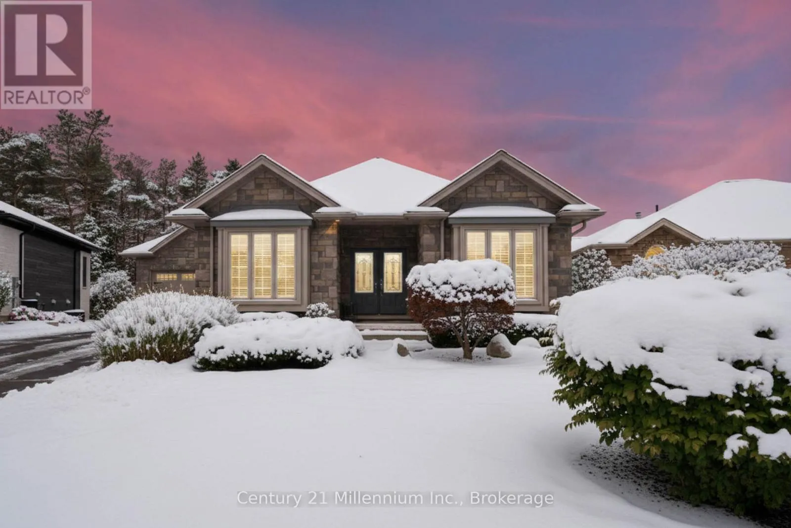 Cross Streets: Pearson St, Ridge Rd. ** Directions: Take Hwy 26 to Ridge rd, follow to Glen Abbey Ct. Backing directly onto the 11th hole of the Meaford Golf & Country Club, this all-stone bungalow offers sweeping views of the fairway and tranquil pond and unlike alot of other homes for sale on the course, this one is freehold with no monthly condo fees. Built in 2006 by respected builder Tom Clancy, its one of the best values in the area for golf course living. Nestled on a quiet cul-de-sac among other prestigious homes, you're just minutes to the marina and a short drive to Blue Mountain. The full stone exterior, symmetrical gabled rooflines, twin bay windows, and impressive front entry create timeless curb appeal. A concrete driveway leads to the oversized double garage, with plenty of parking for guests. Inside, natural light floods the space, highlighting the upscale finishes and craftsmanship. Hardwood floors run throughout the main level, while soaring ceilings create an airy, grand feel. The formal dining room features a tiered tray ceiling with pot lights, and the kitchen boasts rich wood cabinetry, a breakfast bar, and an open flow into the spacious living room with a gas fireplace and a wall of windows framing the golf course view. Step onto the elevated deck with glass railings and soak in the peaceful vista of the pond and manicured greens. The primary suite is generously sized with spectacular backyard views, a walk-in closet, and a spa-like ensuite with tiled glass shower, double vanity, and jacuzzi tub. A second bedroom or office, main floor laundry, add convenience. The finished lower level includes a rec room with walkout to the backyard, a third bedroom, 3-pc bath, and plenty of room to expand. If you've been dreaming of golf course living without the condo fees, this rare freehold property combines beauty, value, and an unbeatable lifestyle. (id:27476)