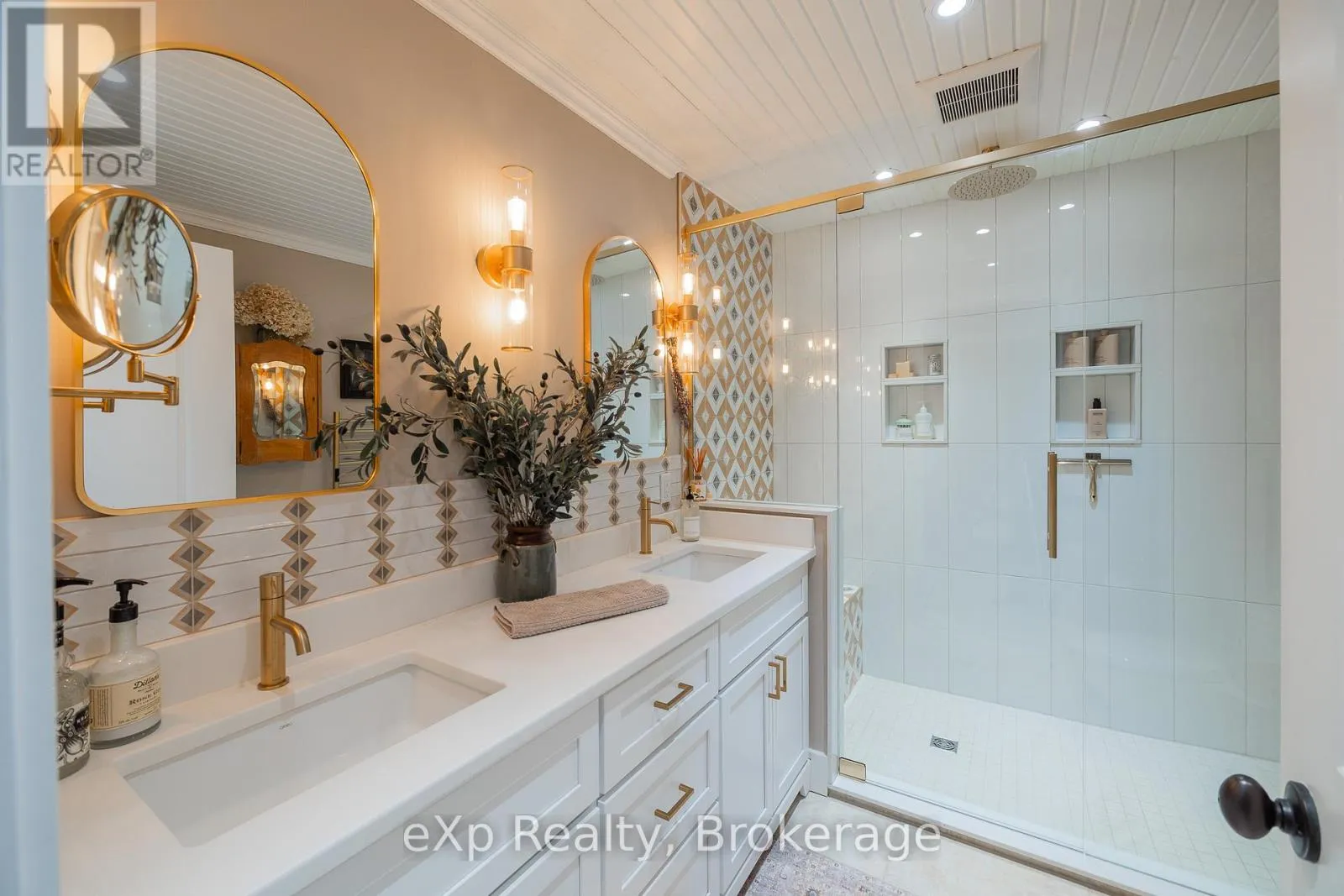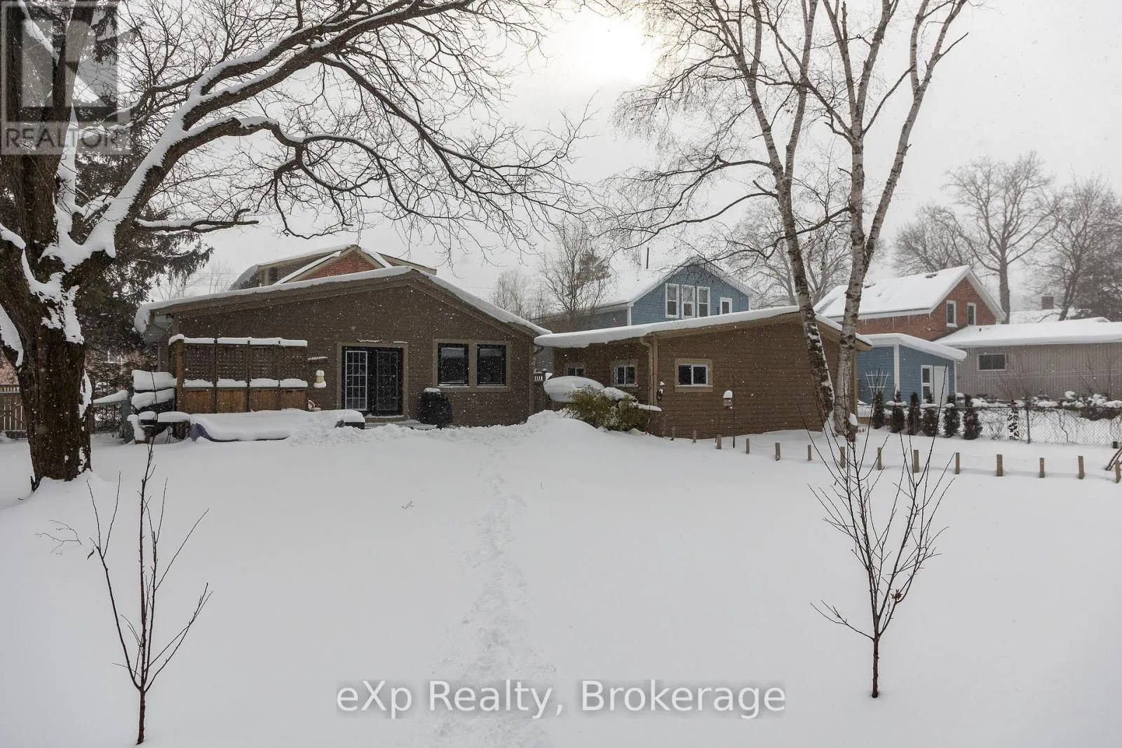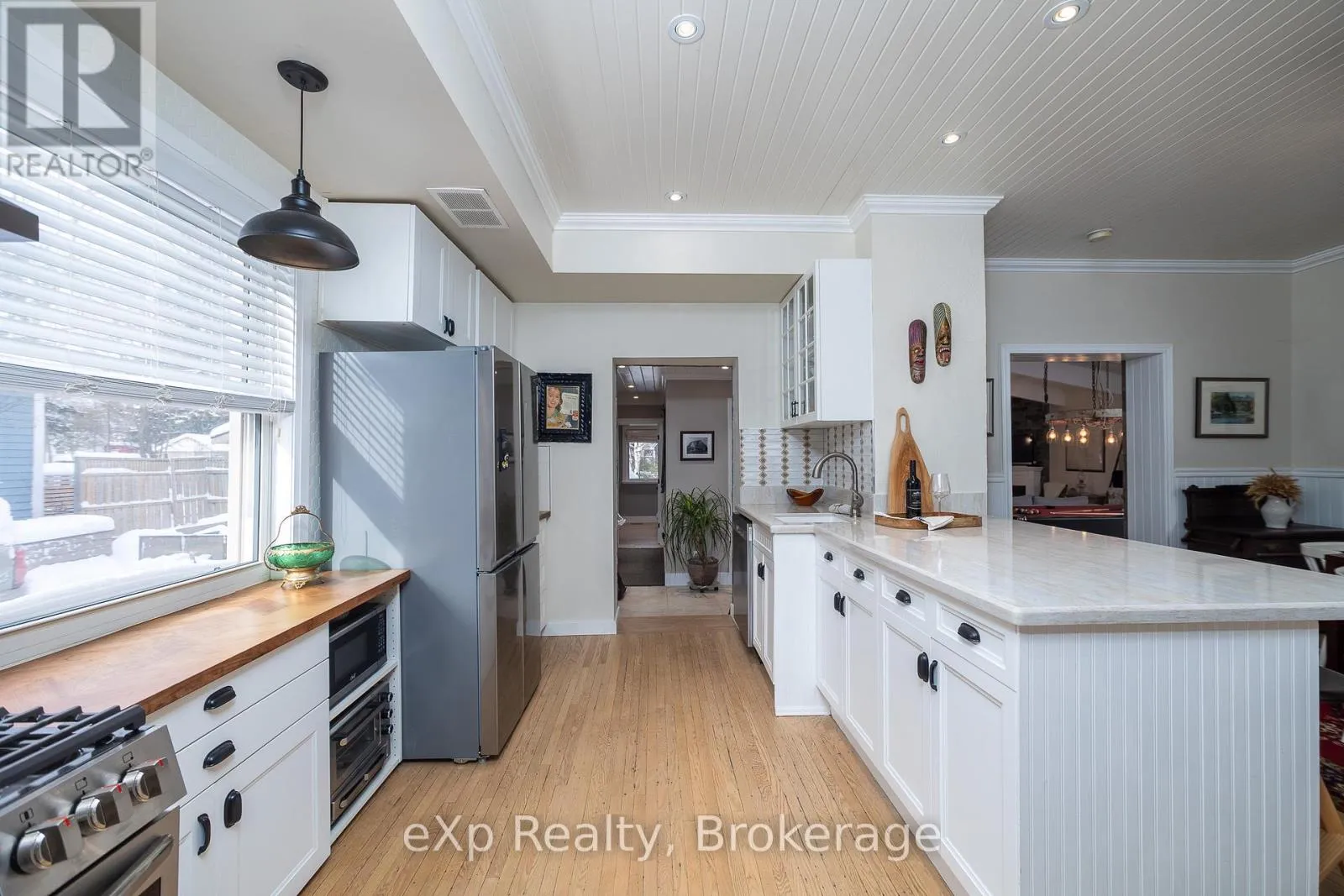 Cross Streets: Between Thompson Street and Cook Street. ** Directions: In Meaford, turn west onto Nelson St W from Hwy 26/Sykes St N. Property is on the north side. This charming red brick centennial home is perfectly positioned in the heart of Meaford, offering an exceptional walkable lifestyle just steps to local shops, restaurants, Meaford Hall, the library, parks, the harbour, Georgian Bay, the community centre, and the hospital. Inside, an open-concept feel allows for easy entertaining, highlighted by a stunning great room with vaulted ceilings and a cozy gas fireplace. The recently updated kitchen features quartz countertops and brand-new stainless steel appliances from December 2025, seamlessly connecting to the main living spaces. Thoughtfully designed for flexibility and convenience, the home offers main-floor living with the option for a primary bedroom on either the main or second floor, featuring custom built-ins added in 2024 in the main-floor primary bedroom, a main-floor laundry upgrade completed in 2024, and beautifully updated designer-style bathrooms on both levels. Rich in character, the home showcases pieces of Meaford history with Knight's hardwood flooring throughout the main floor and original theatre seating from the historic Meaford Hall. Outside, enjoy morning coffee on the covered front verandah or relax in the private hot tub within the fully fenced backyard. A rare double-wide lot provides a detached garage, ample parking, and a large custom-finished concrete driveway extending to a back patio surrounded by perennial gardens, a large vegetable garden, mature trees, fire-pit and a charming bunkie getaway. Numerous recent improvements, including custom milled Muskoka wood siding completed in November 2025 and many windows and doors replaced within the last 10 years, make this a truly special offering where classic craftsmanship is paired with today's comforts. (id:27476)