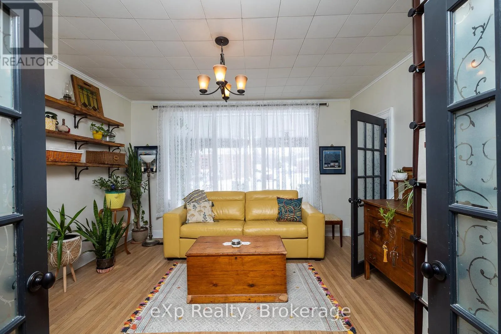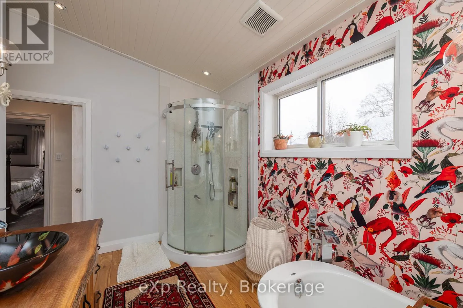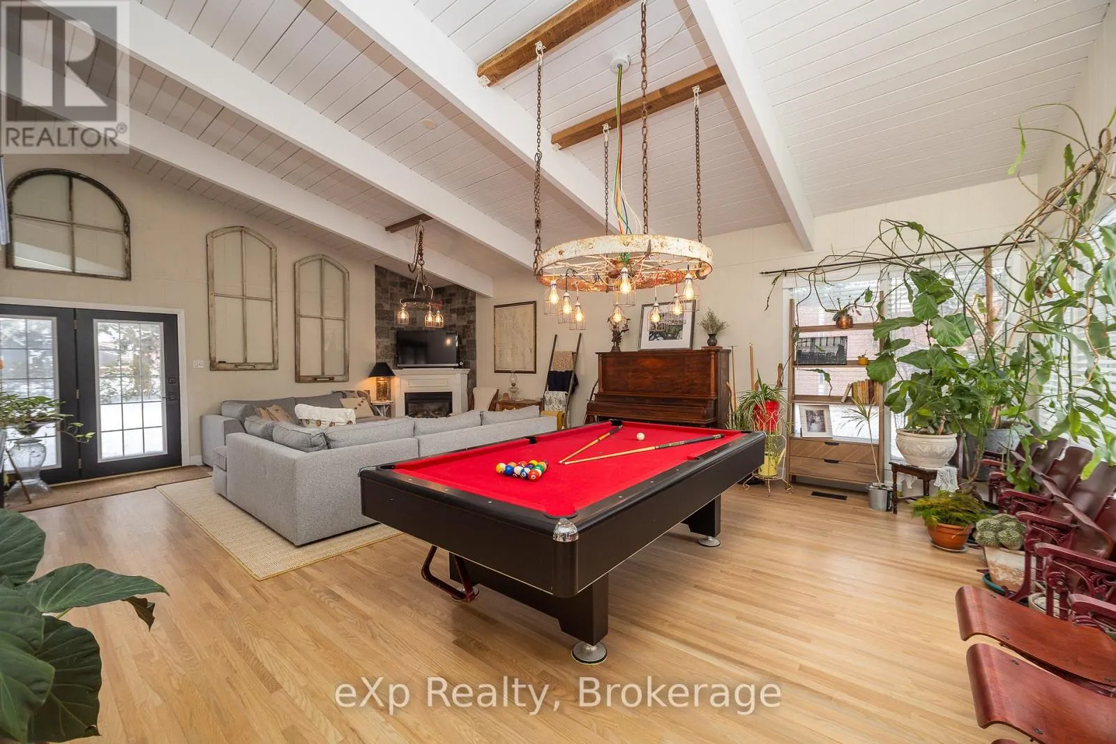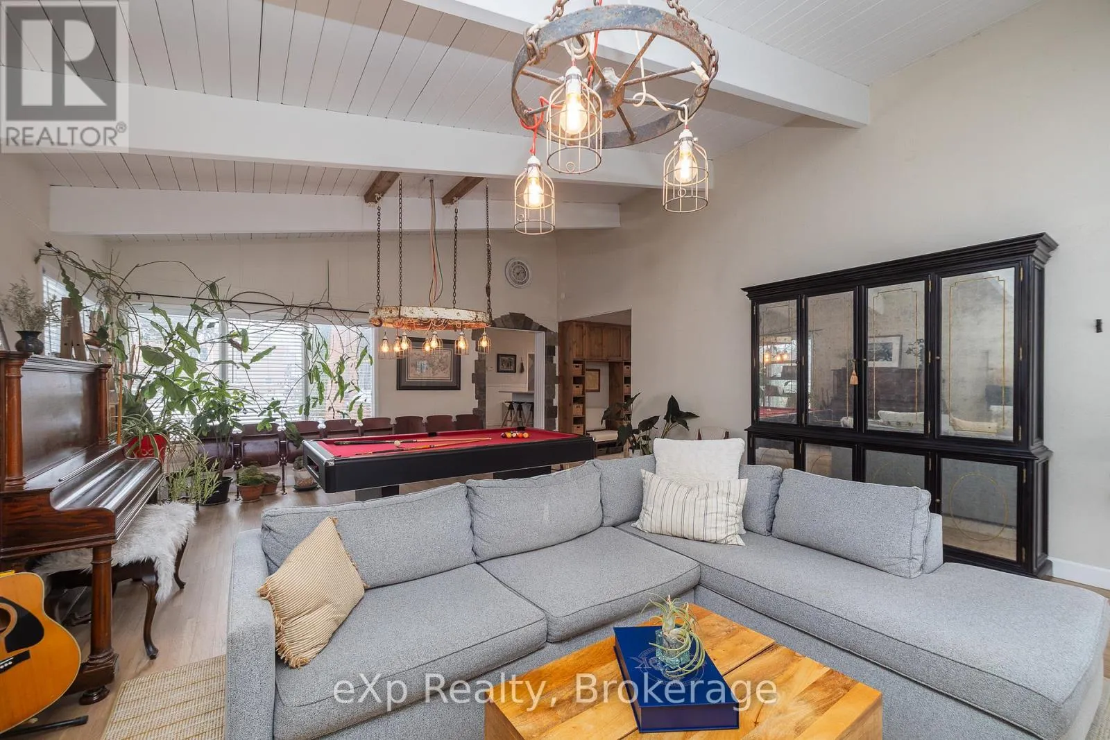 Cross Streets: Between Thompson Street and Cook Street. ** Directions: In Meaford, turn west onto Nelson St W from Hwy 26/Sykes St N. Property is on the north side. This charming red brick centennial home is perfectly positioned in the heart of Meaford, offering an exceptional walkable lifestyle just steps to local shops, restaurants, Meaford Hall, the library, parks, the harbour, Georgian Bay, the community centre, and the hospital. Inside, an open-concept feel allows for easy entertaining, highlighted by a stunning great room with vaulted ceilings and a cozy gas fireplace. The recently updated kitchen features quartz countertops and brand-new stainless steel appliances from December 2025, seamlessly connecting to the main living spaces. Thoughtfully designed for flexibility and convenience, the home offers main-floor living with the option for a primary bedroom on either the main or second floor, featuring custom built-ins added in 2024 in the main-floor primary bedroom, a main-floor laundry upgrade completed in 2024, and beautifully updated designer-style bathrooms on both levels. Rich in character, the home showcases pieces of Meaford history with Knight's hardwood flooring throughout the main floor and original theatre seating from the historic Meaford Hall. Outside, enjoy morning coffee on the covered front verandah or relax in the private hot tub within the fully fenced backyard. A rare double-wide lot provides a detached garage, ample parking, and a large custom-finished concrete driveway extending to a back patio surrounded by perennial gardens, a large vegetable garden, mature trees, fire-pit and a charming bunkie getaway. Numerous recent improvements, including custom milled Muskoka wood siding completed in November 2025 and many windows and doors replaced within the last 10 years, make this a truly special offering where classic craftsmanship is paired with today's comforts. (id:27476)